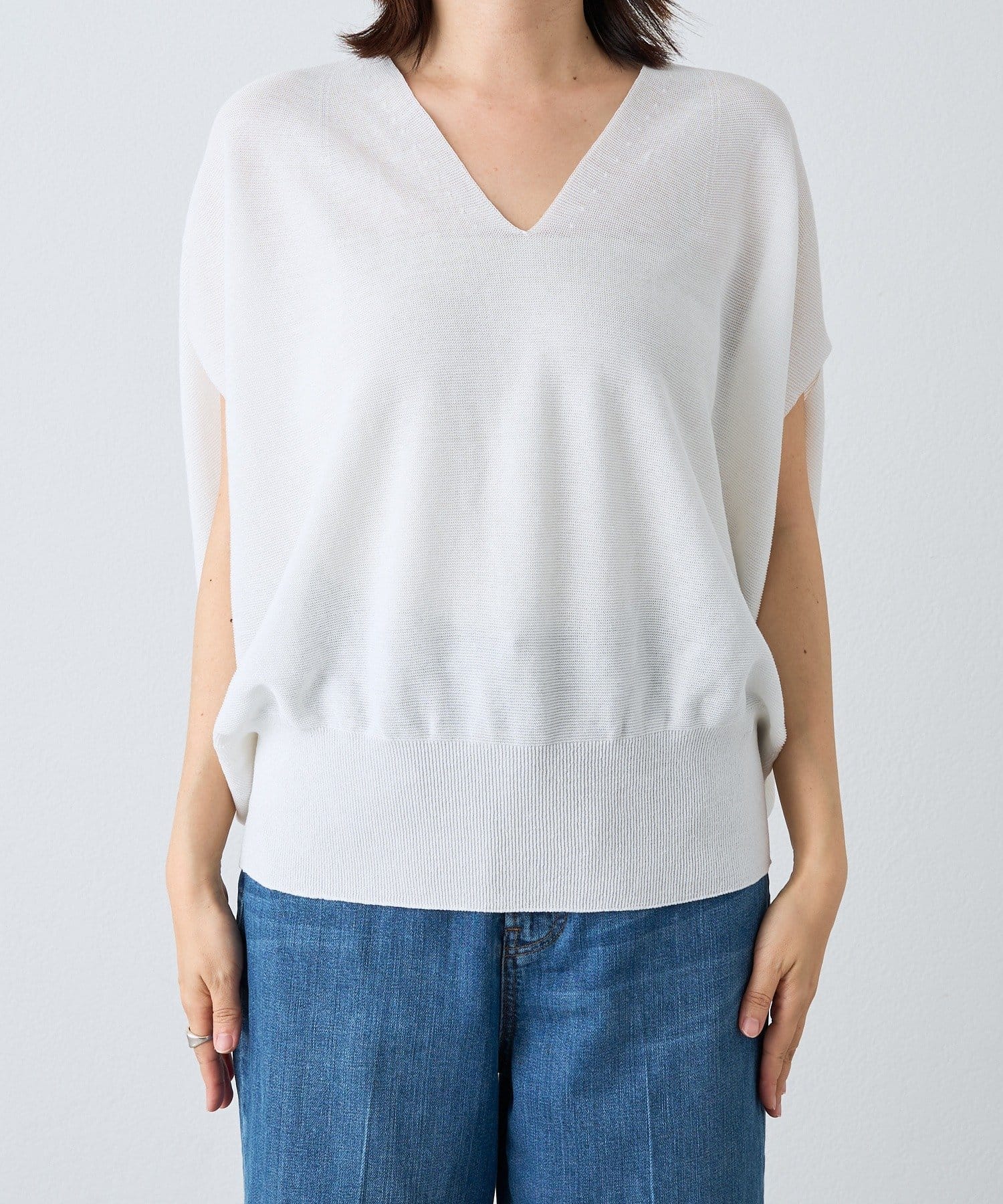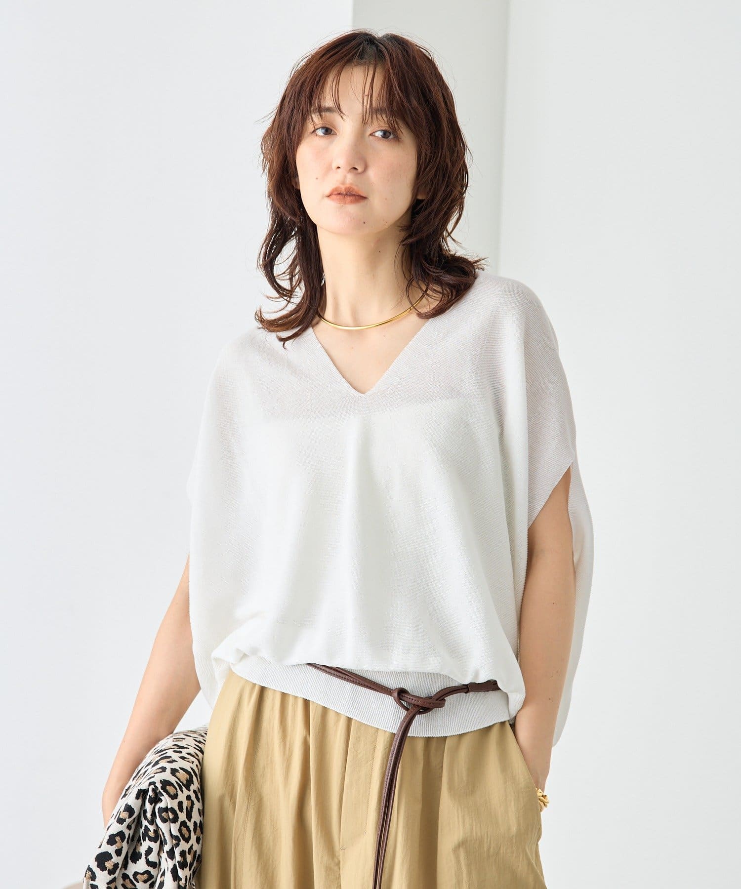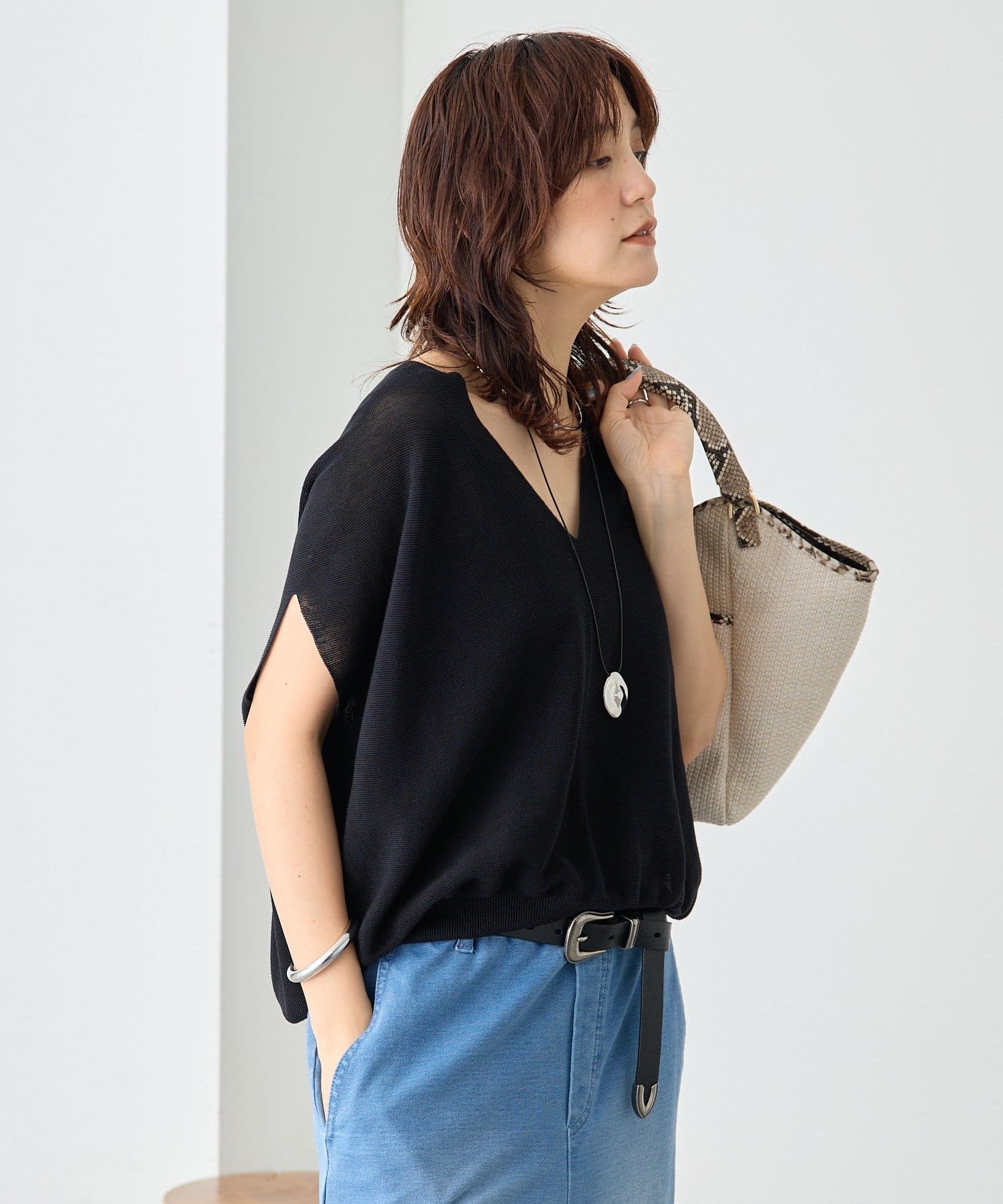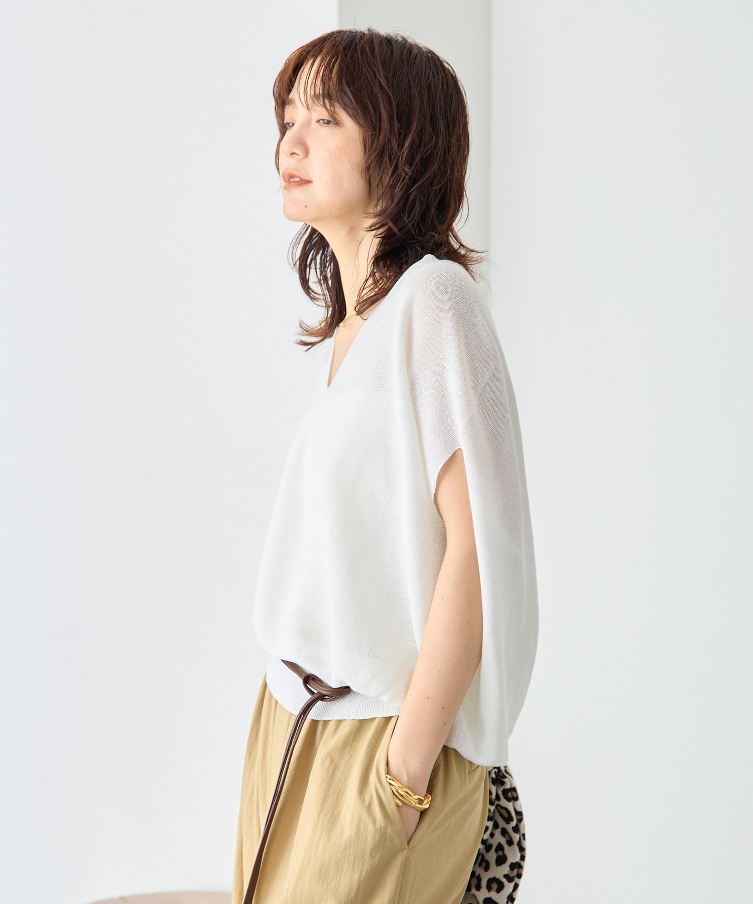 ジャケットやブルゾンの下に着用いただいても、夏に一枚で着ていただいてもおすすめなサマーニットです。