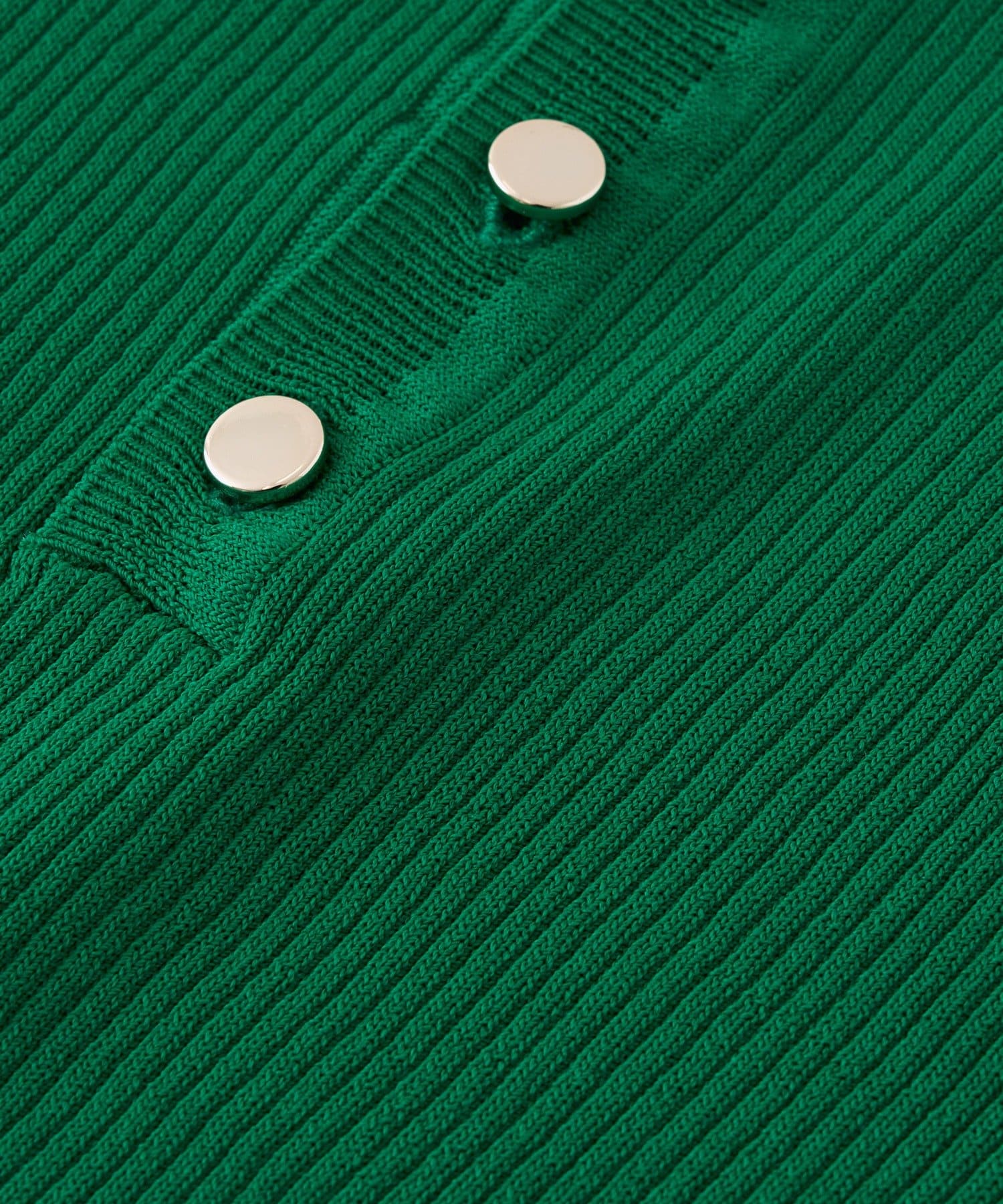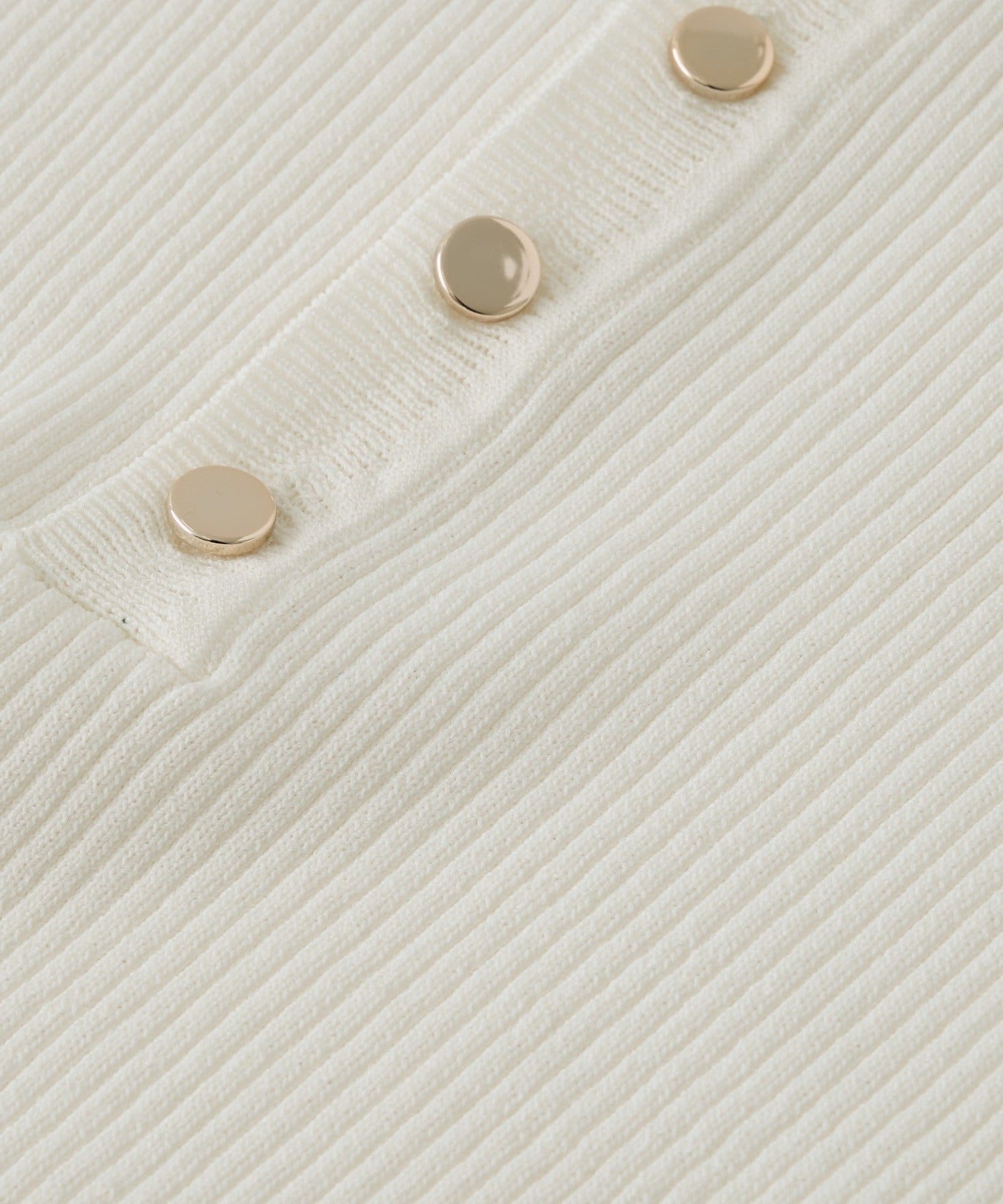 • 肘が隠れる五分袖と、バックスタイルのメタルボタンがポイント