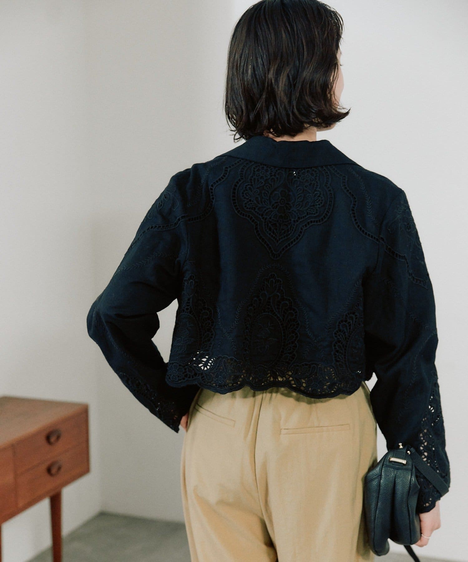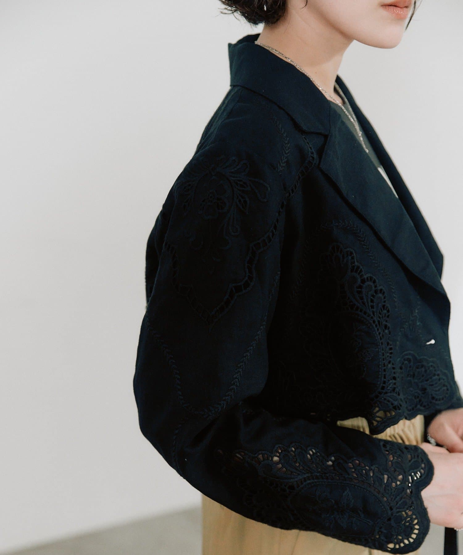 • 総柄のカットワーク刺繍を施した存在感抜群のショートジャケット