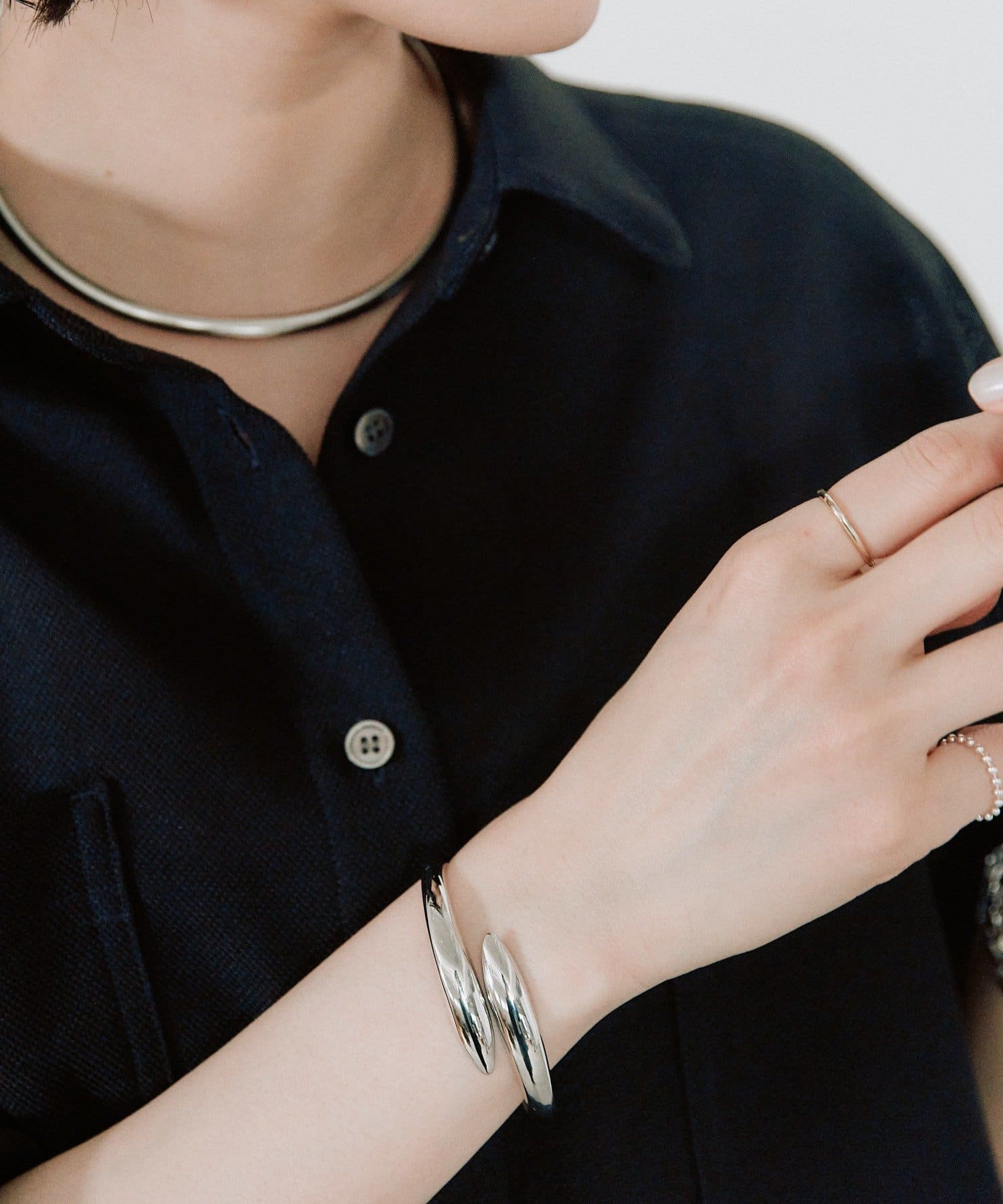 ・シャープな先端が重なり合う、構築的でモダンなシルエットのバングルです。