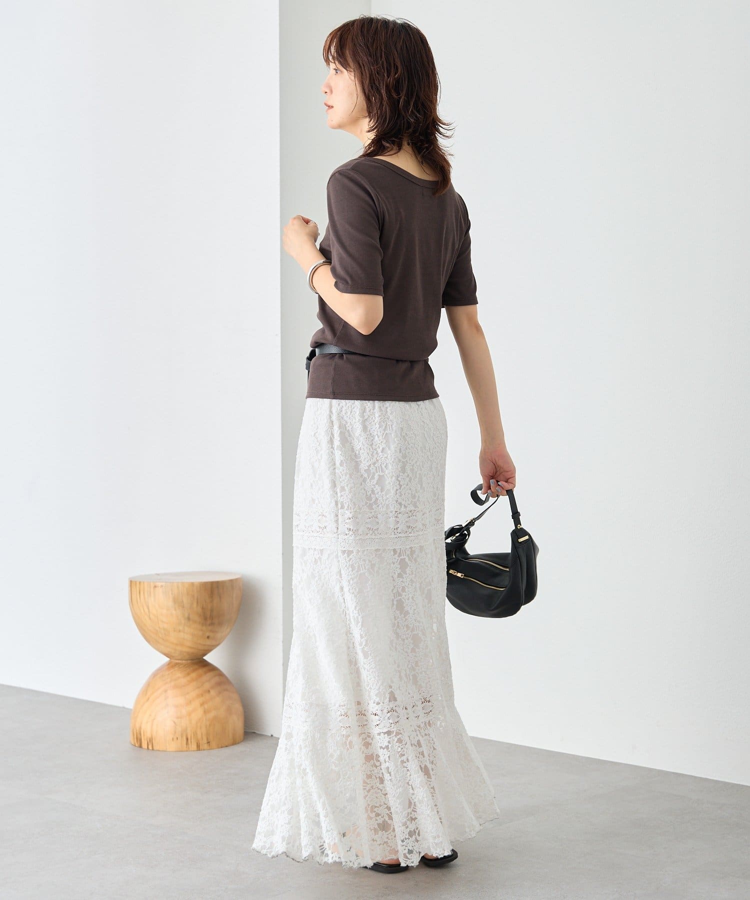 ・同素材のレースサンカクストール(RDZ1061516A0001)をウエストまわりにあしらったトレンドライクな着こなしもおすすめです。