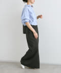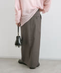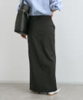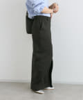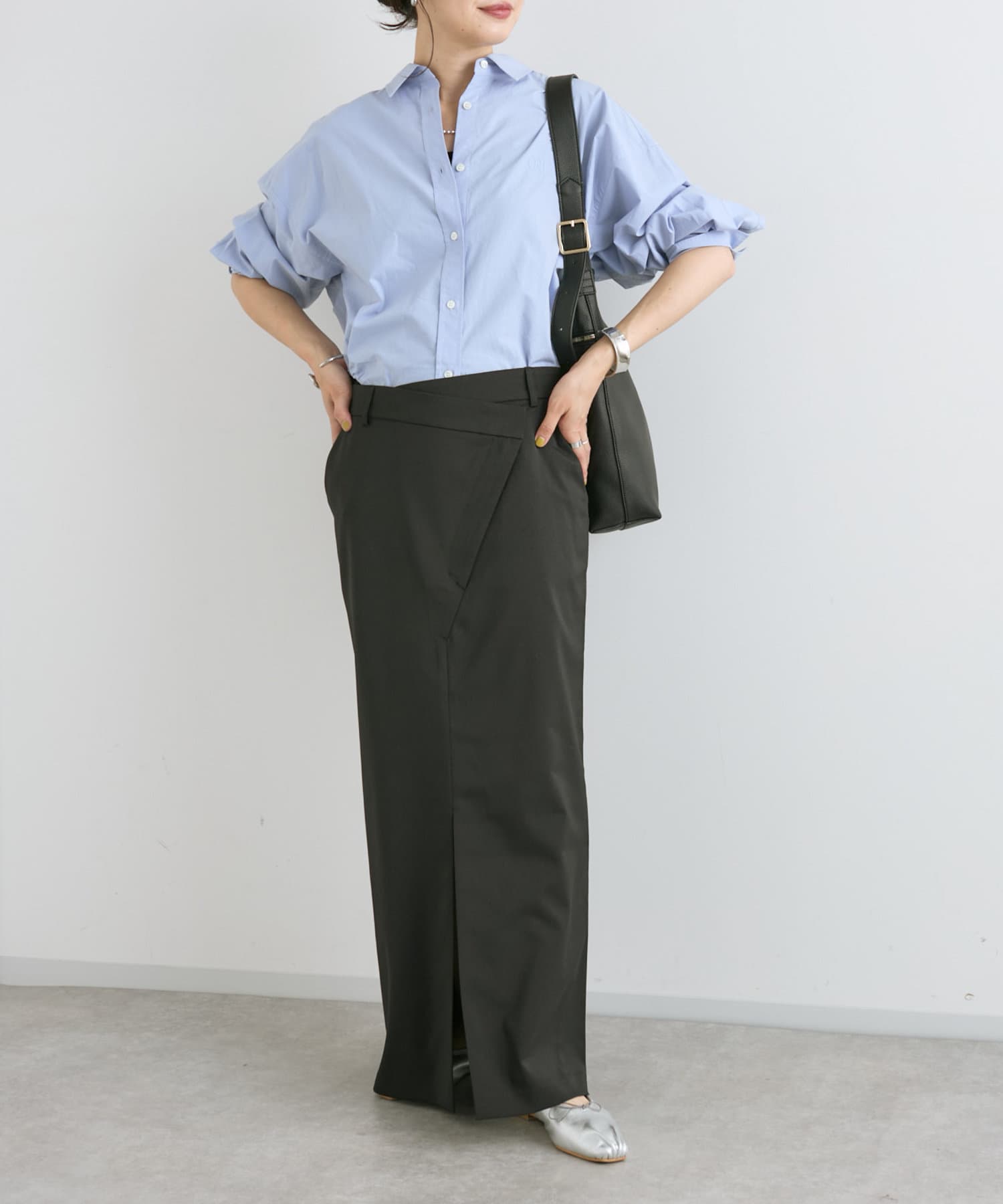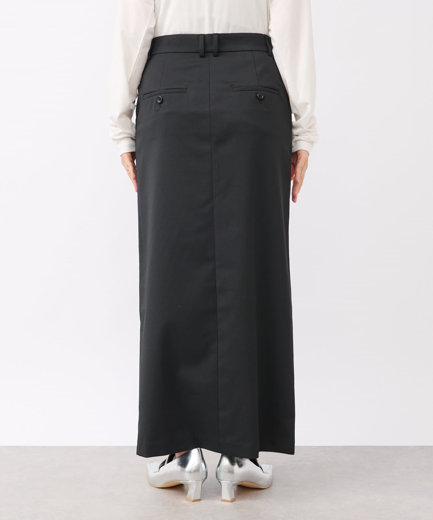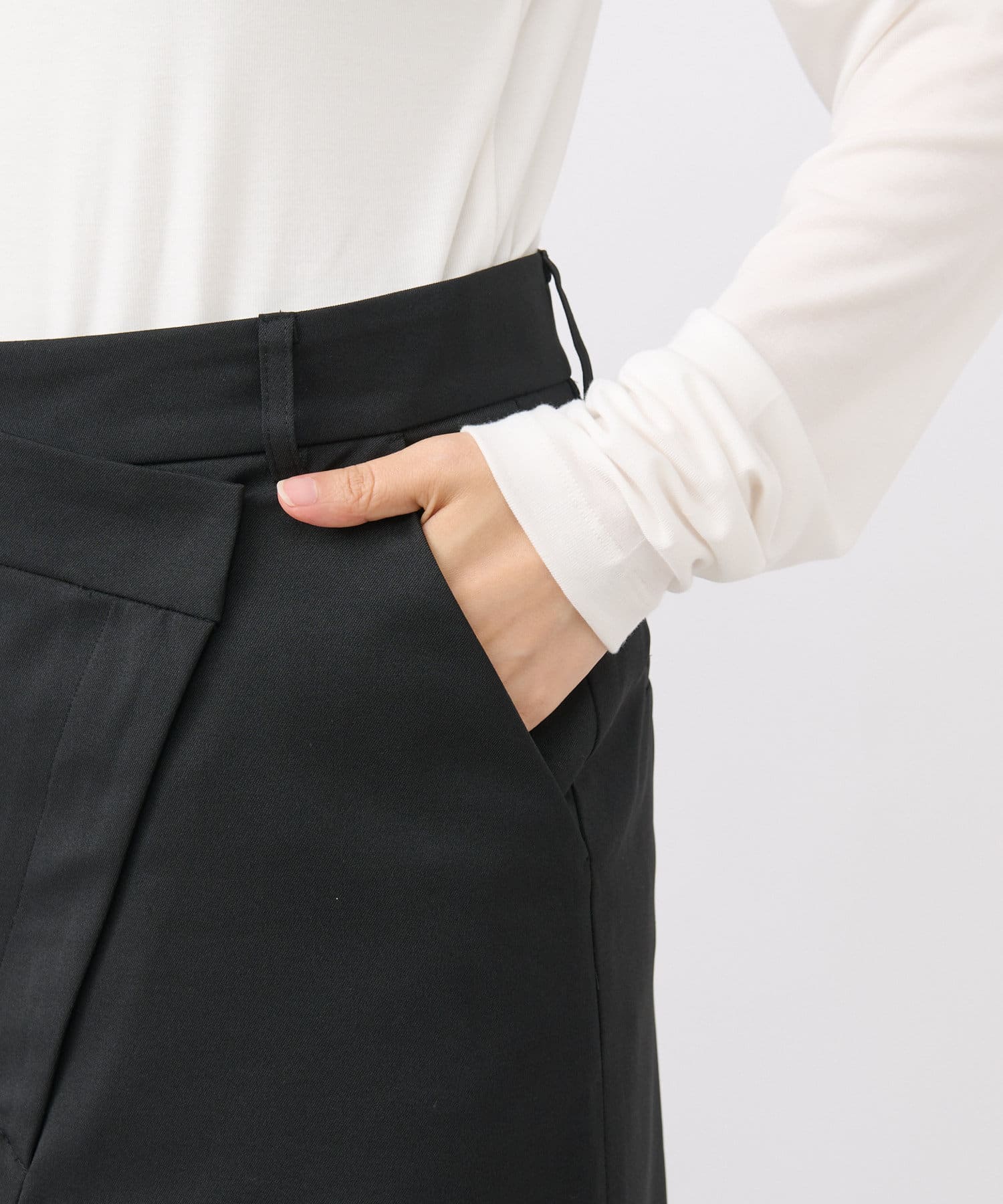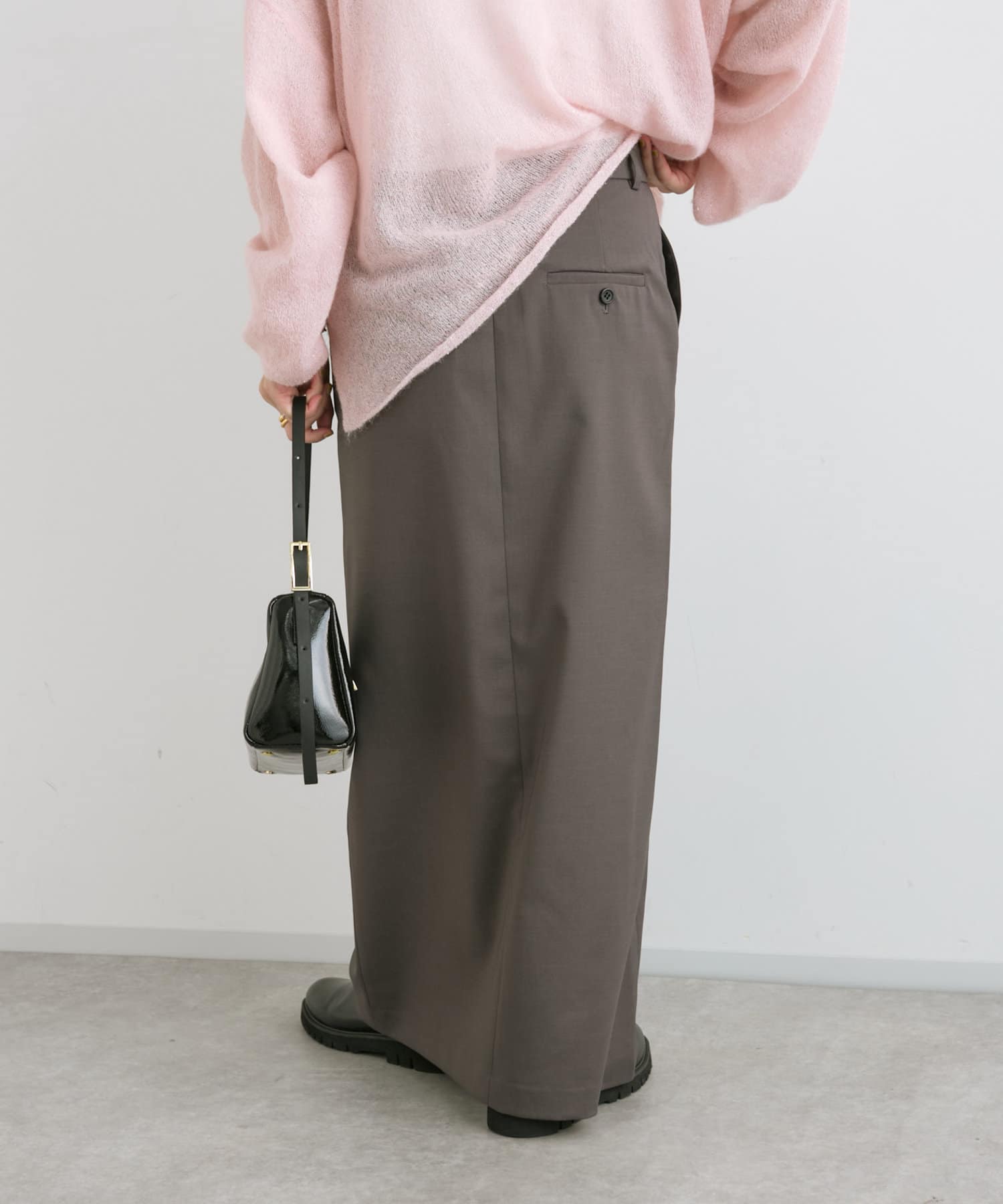 腰位置で履く着こなしやマーベルト、ベルトループの付け方、ボタン付きの後ポケットなどスラックスをスカートに仕立て直したようなデザインがポイント。