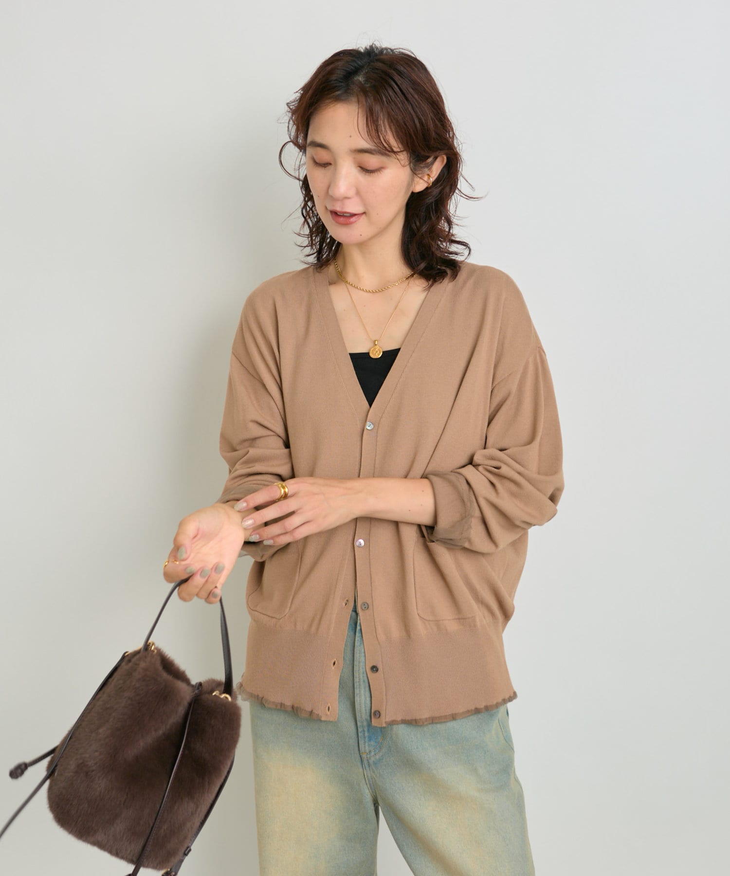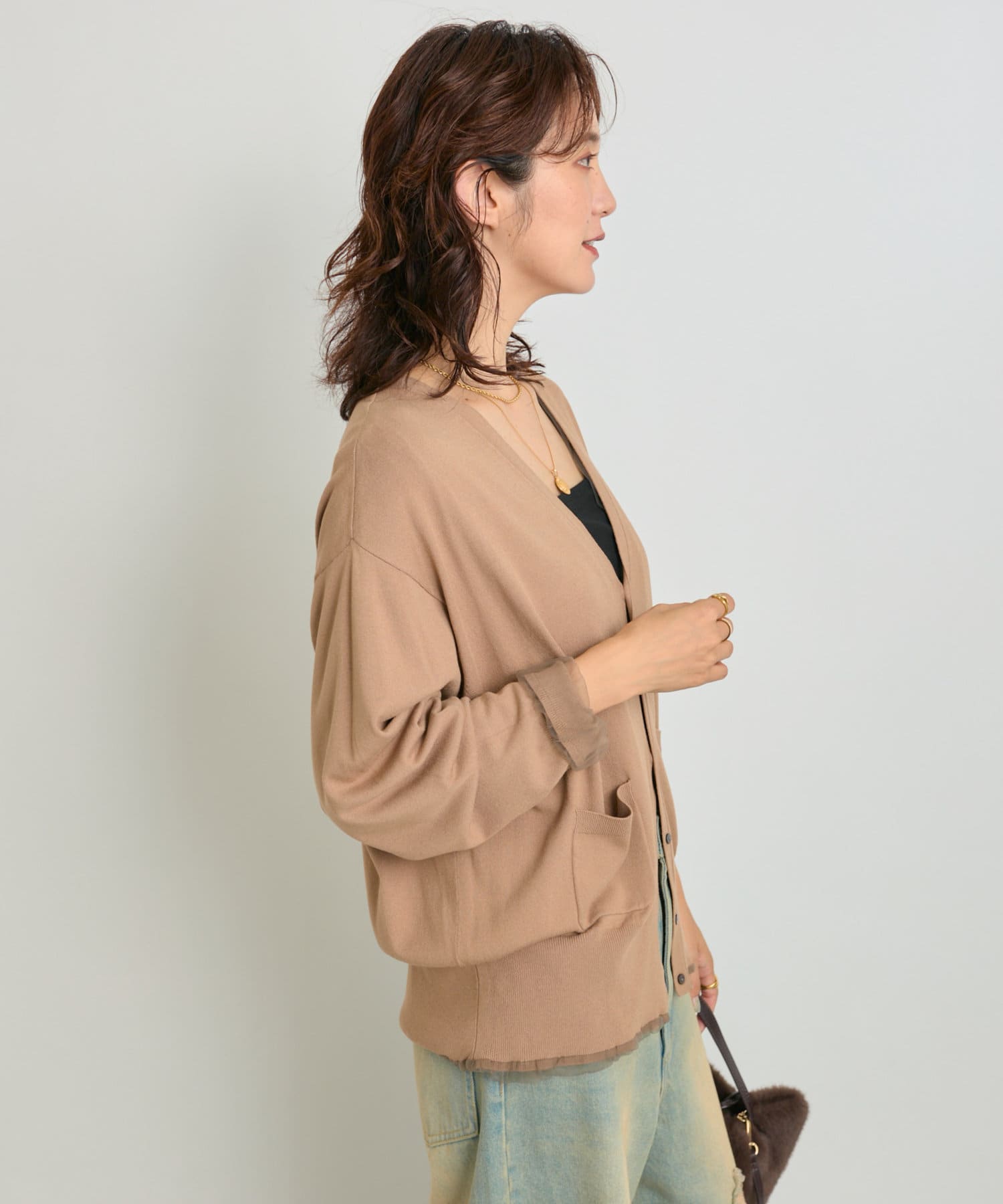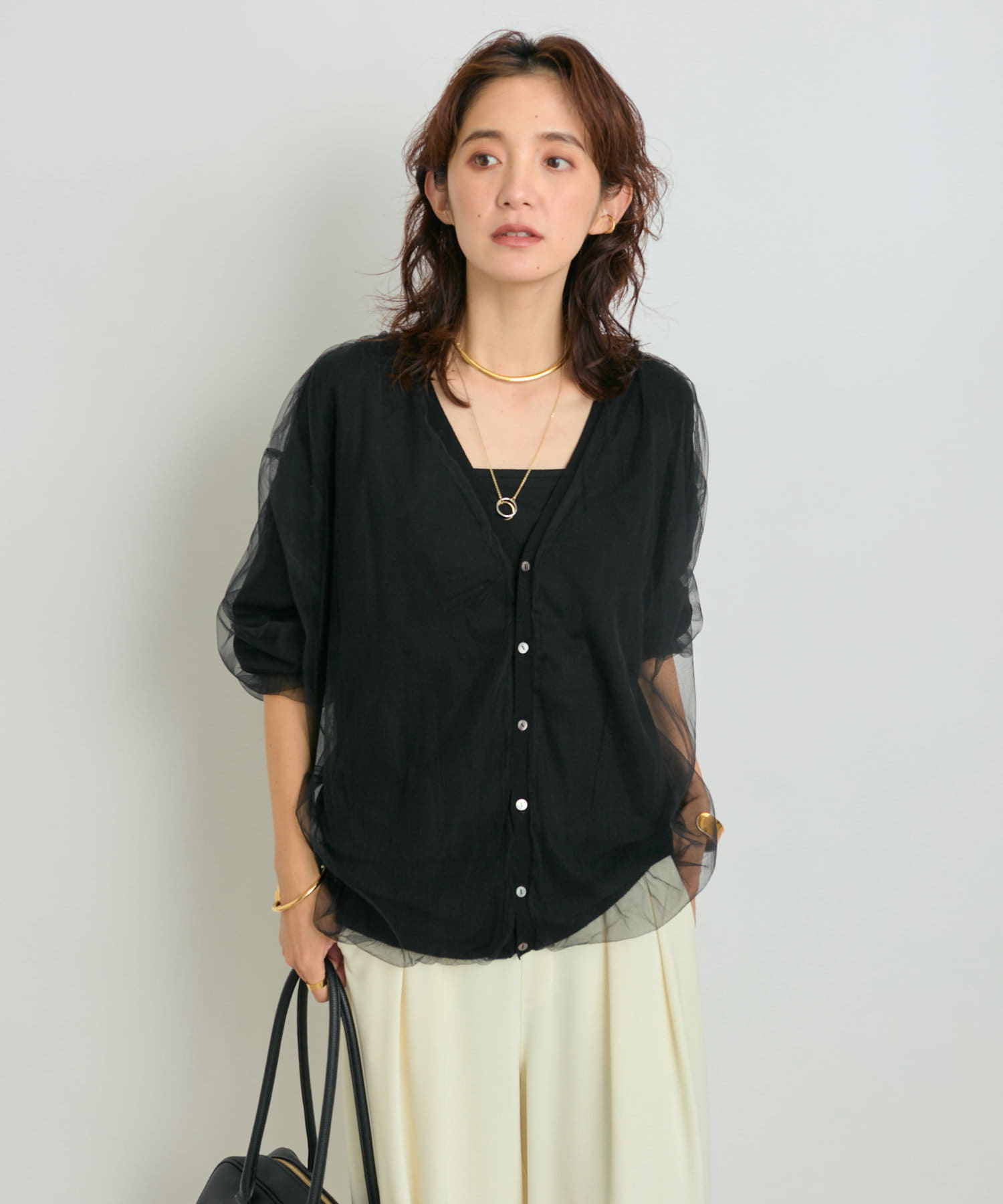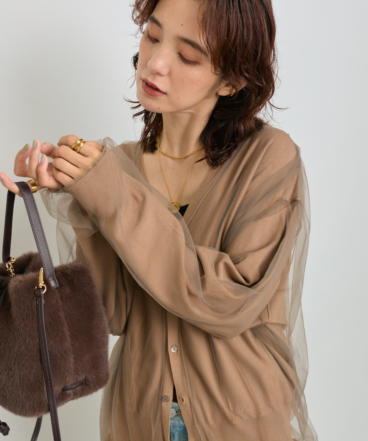 チュール側で着て頂くと、華やかで気映えする1枚に、ニット側だと袖口と裾から覗くチュールがさりげなく可愛いシンプルなカーデガンとして着用いただけます。