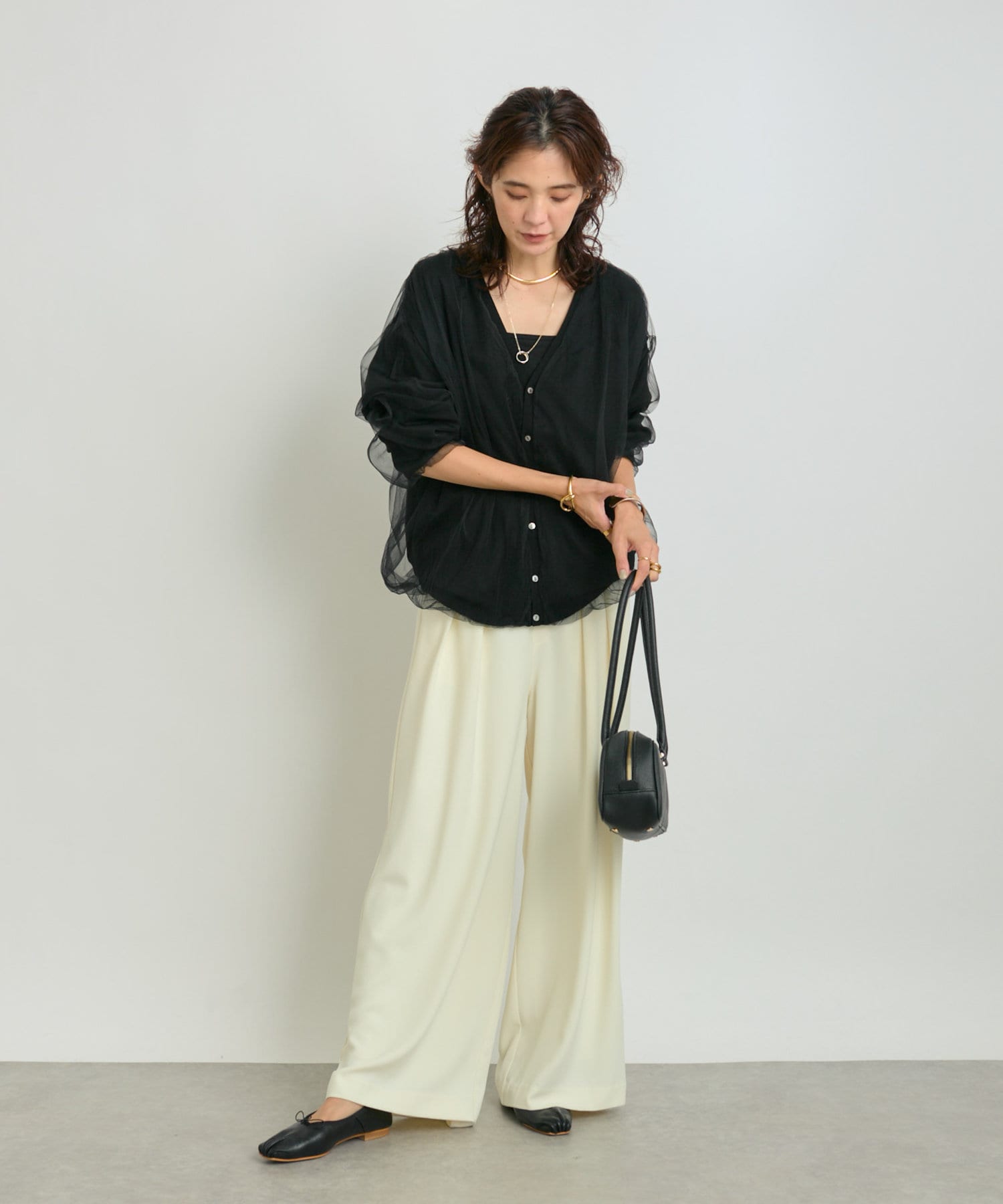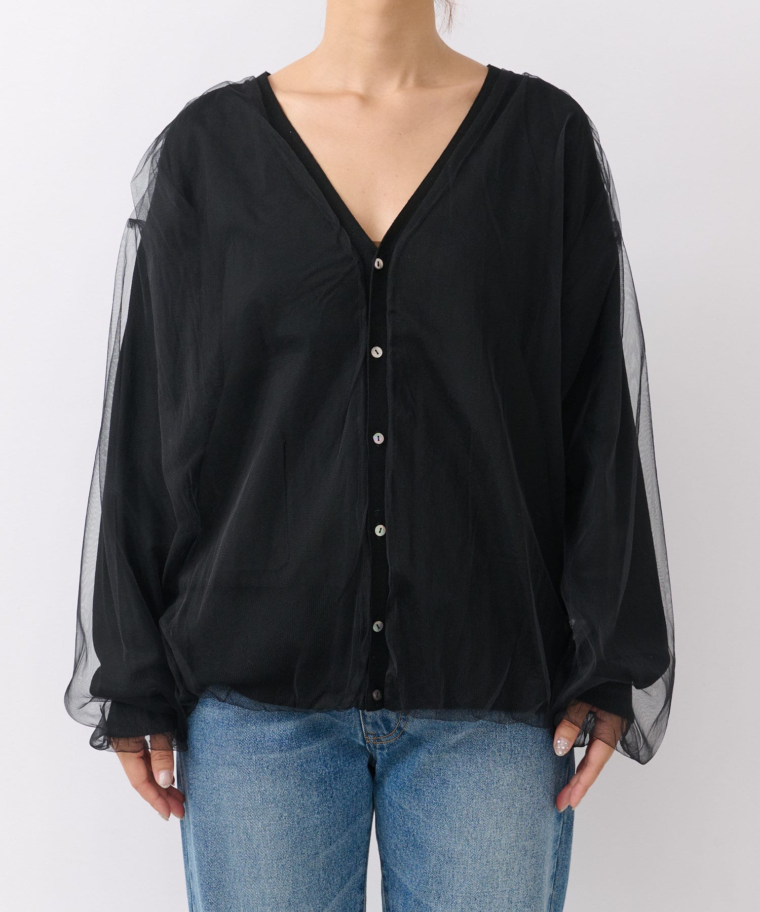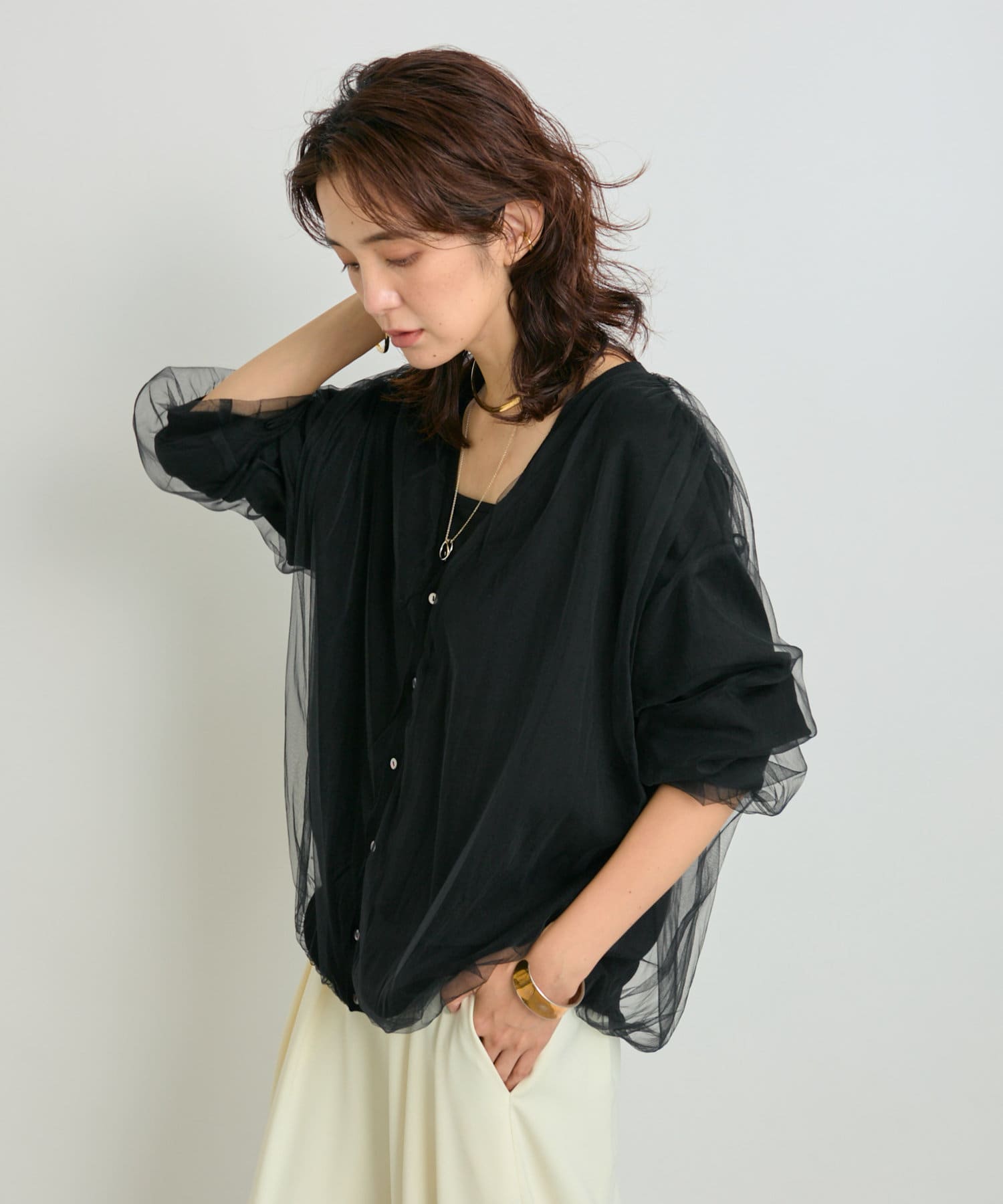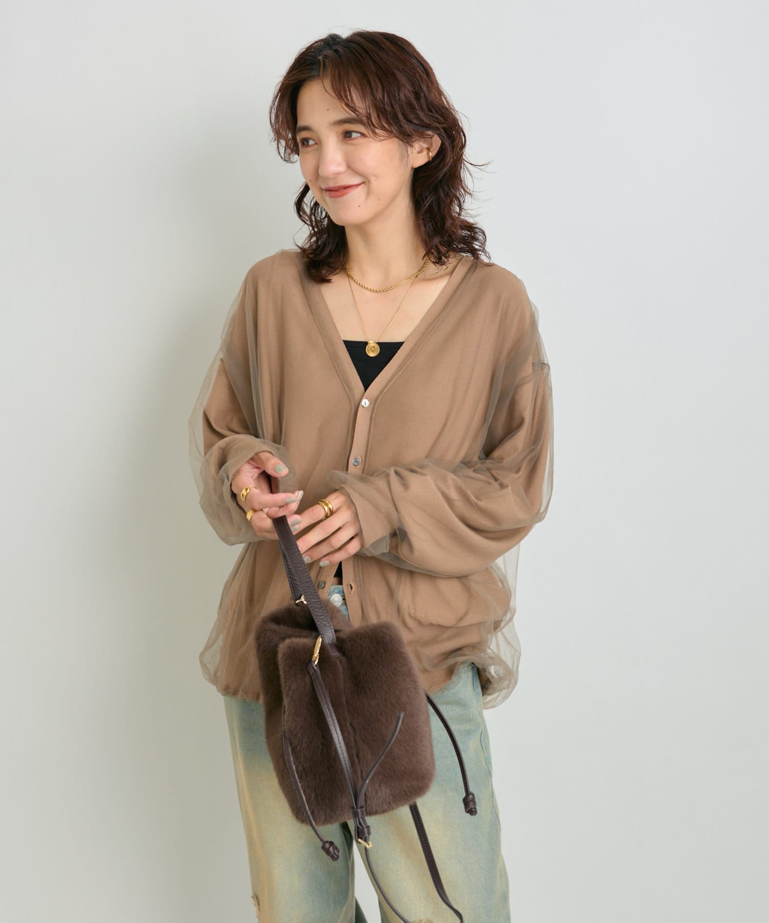 チュール側で着て頂くと、華やかで気映えする1枚に、ニット側だと袖口と裾から覗くチュールがさりげなく可愛いシンプルなカーデガンとして着用いただけます。