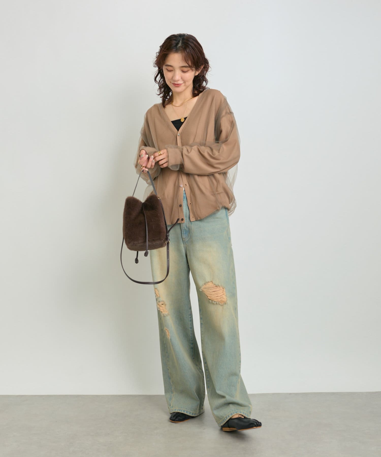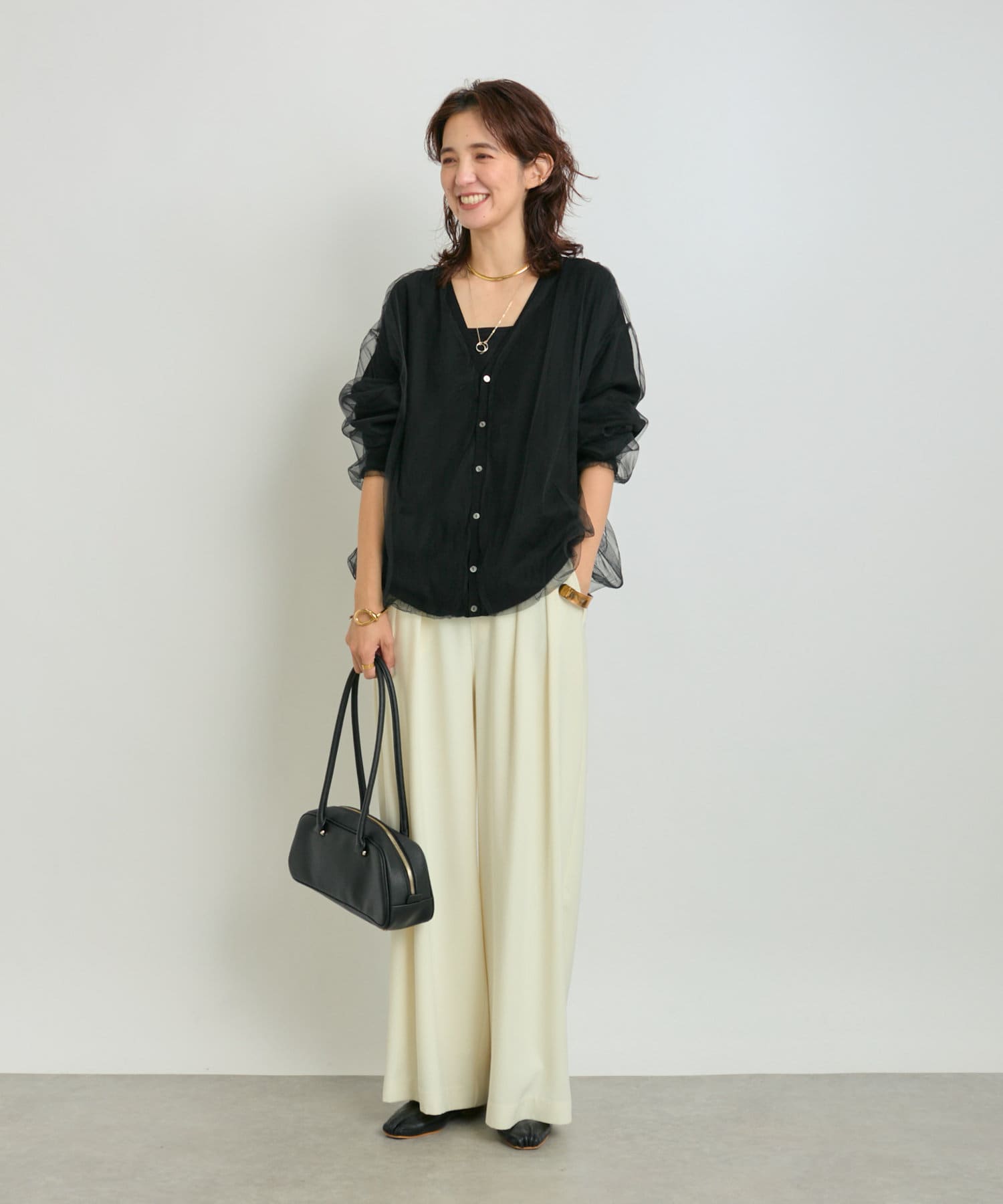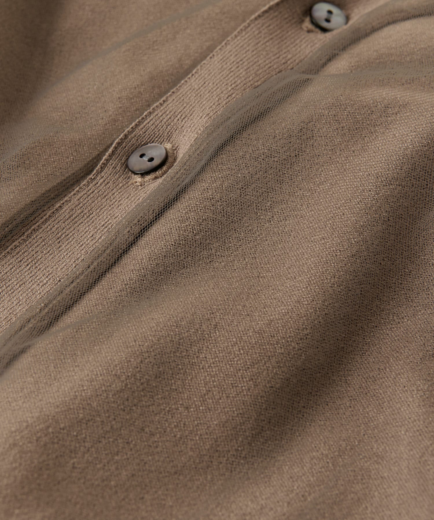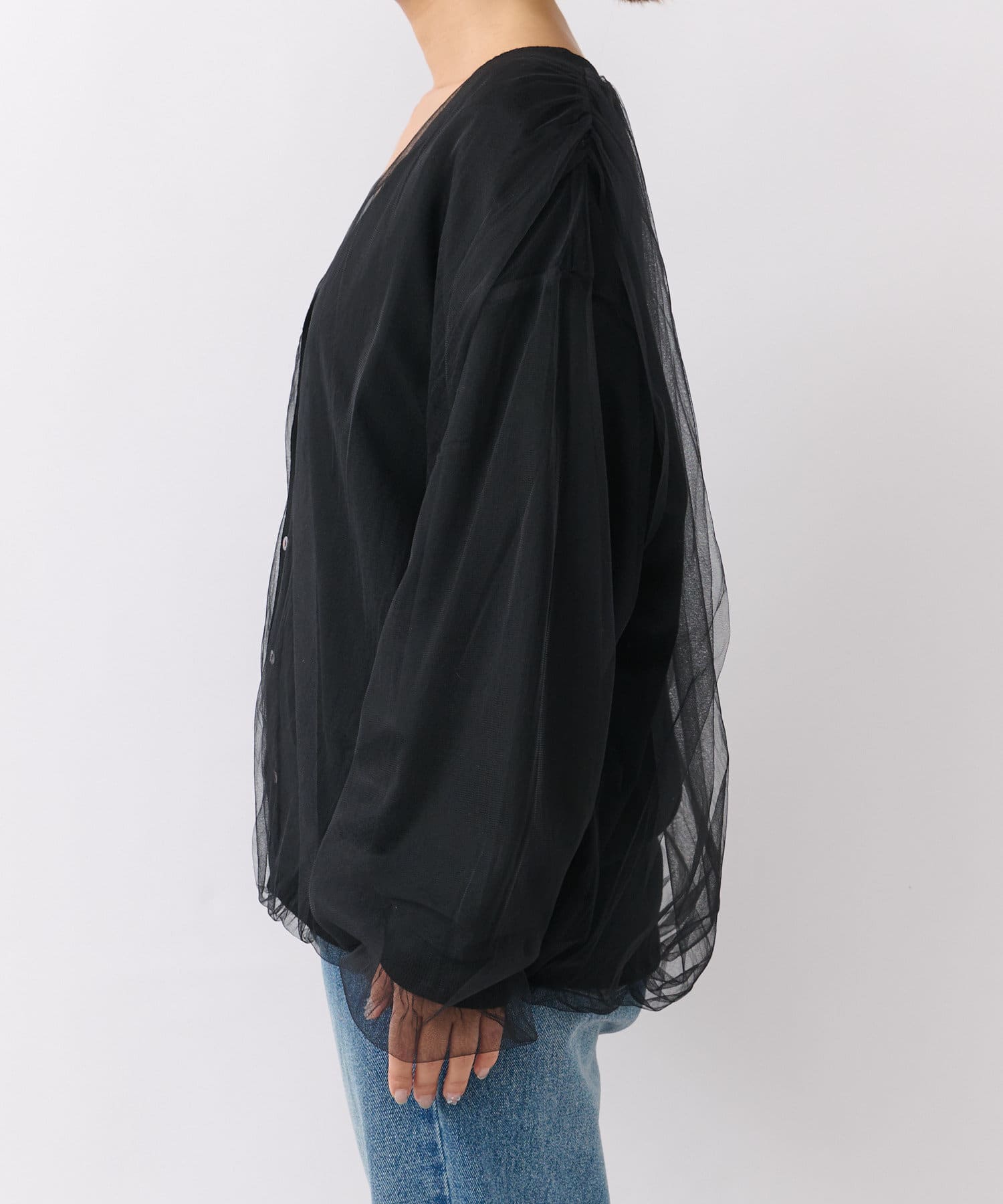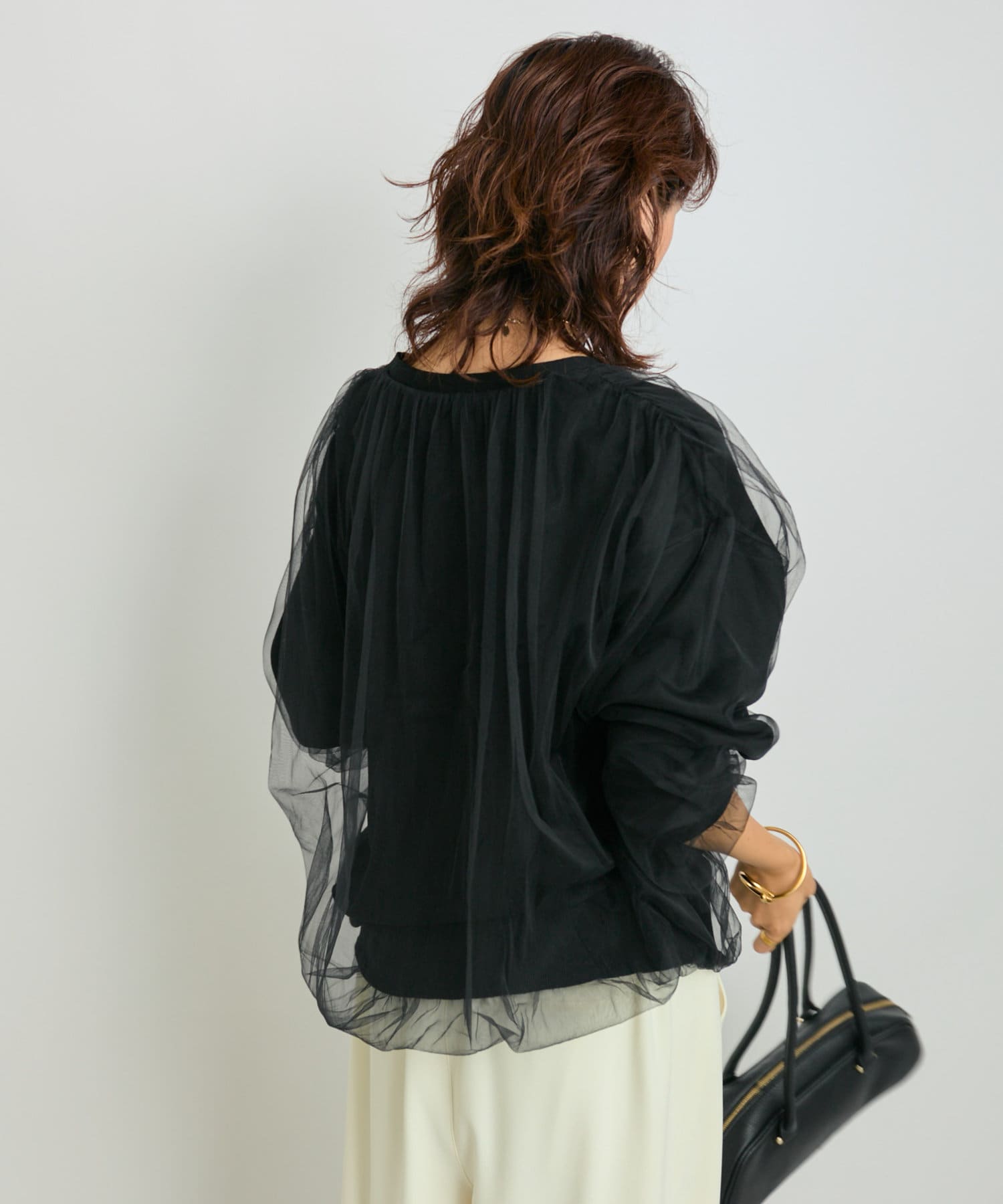 チュール側で着て頂くと、華やかで気映えする1枚に、ニット側だと袖口と裾から覗くチュールがさりげなく可愛いシンプルなカーデガンとして着用いただけます。