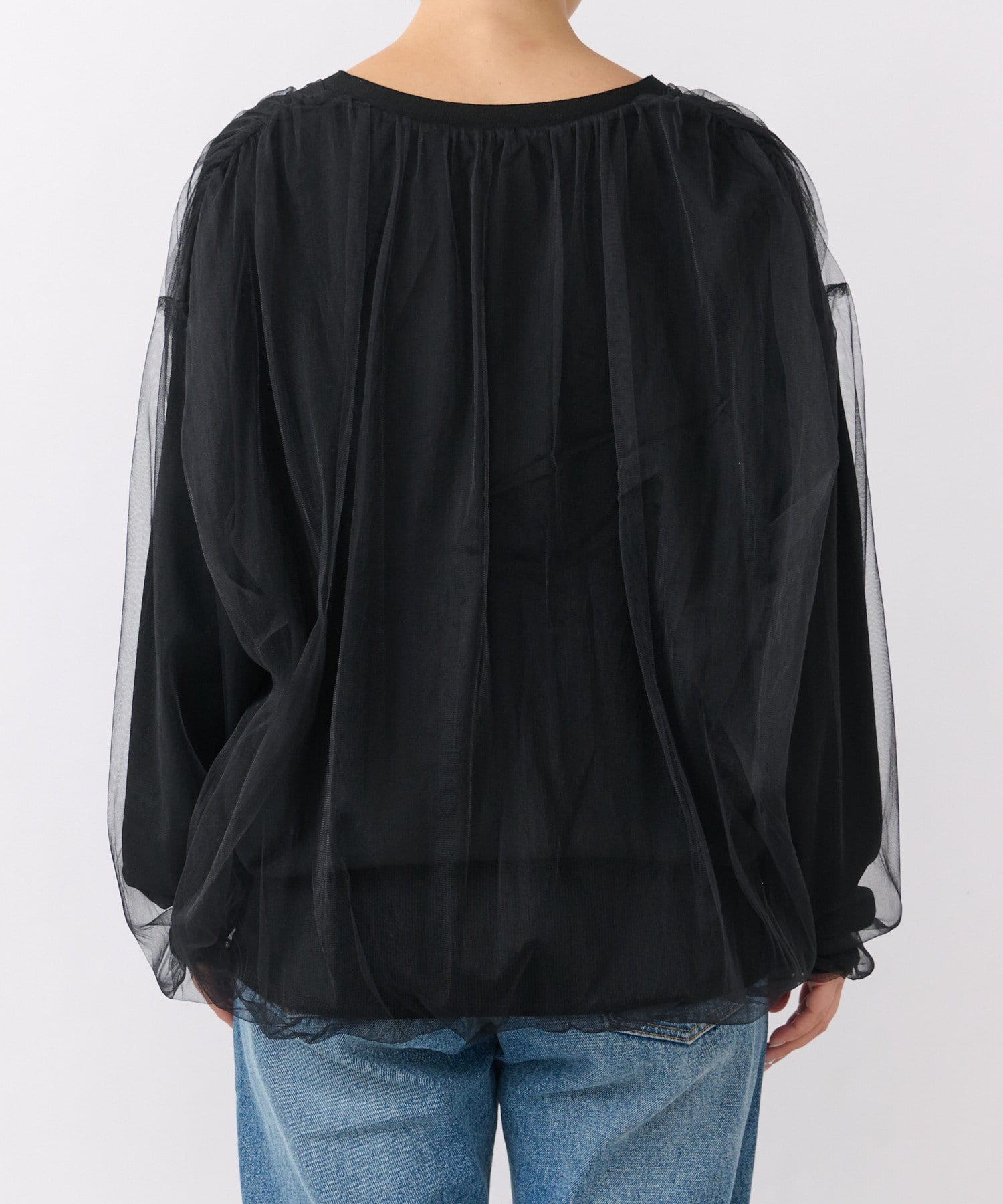 チュール面を裏にした時に着ぶくれせず、ちくちくしないよう柔らかいチュールを使用。ニットも肌触りが良くすっきりした風合いに仕上げているので着心地も軽やか。