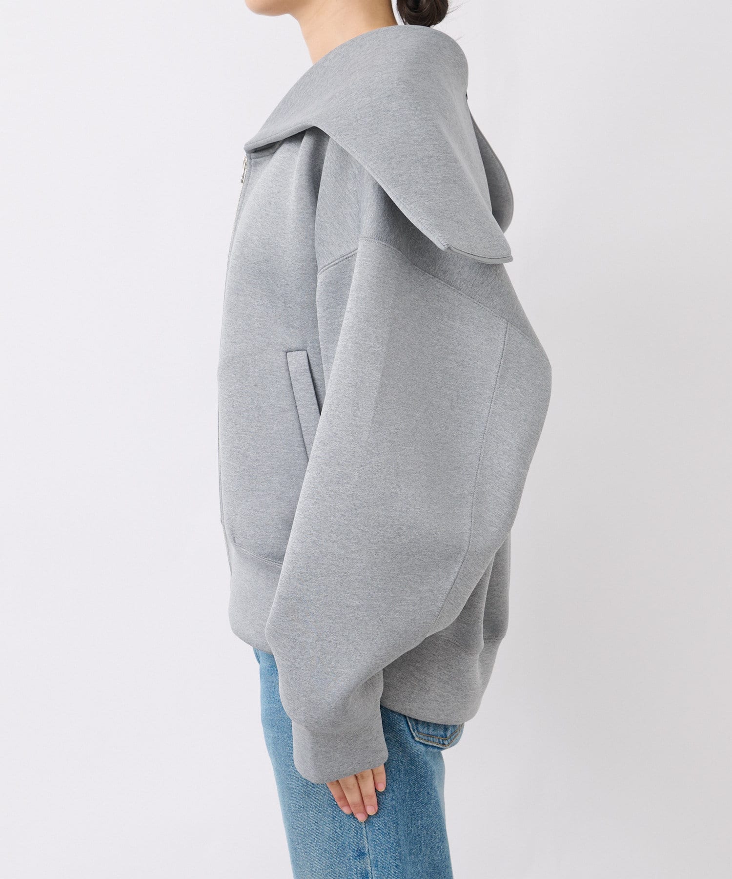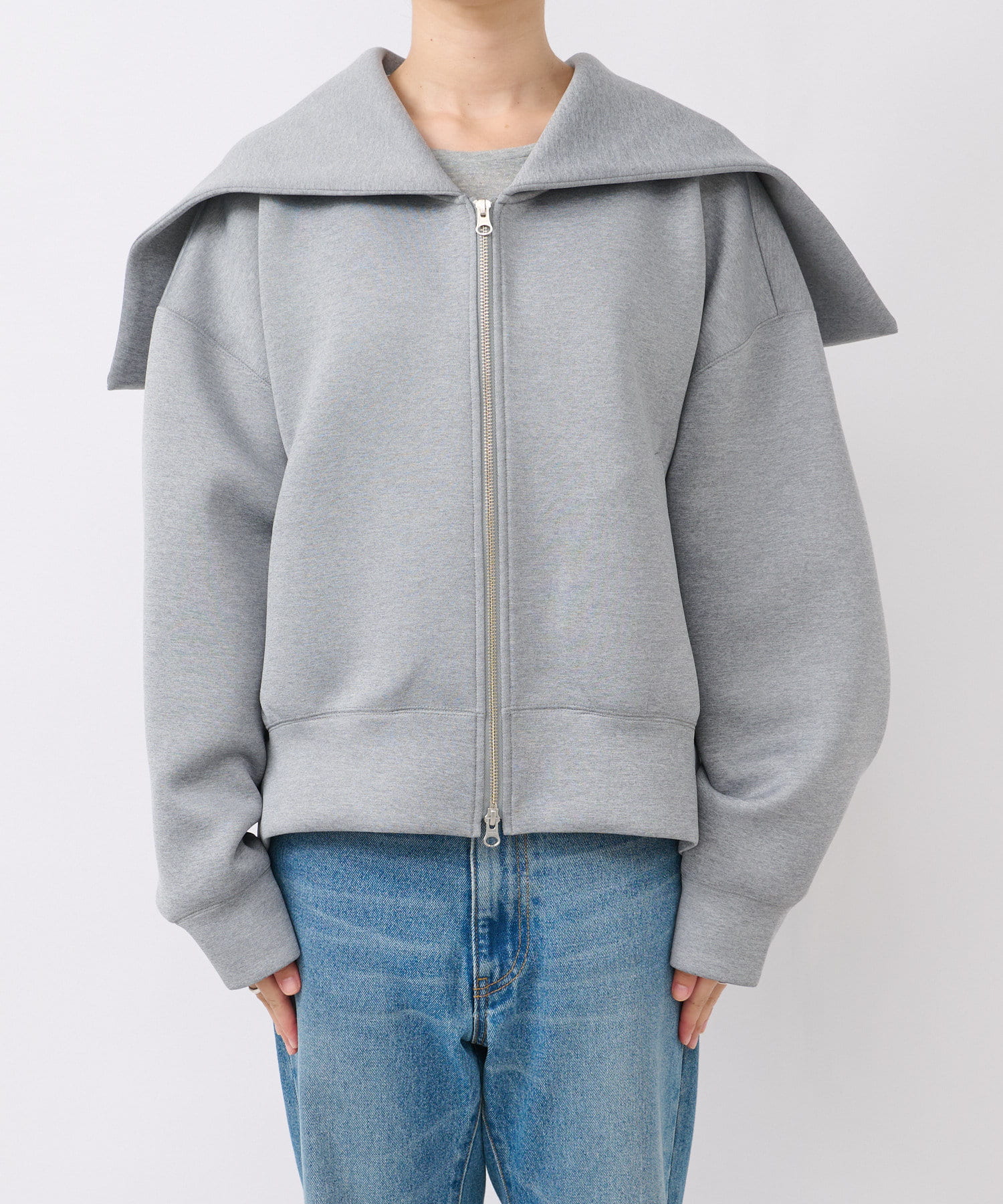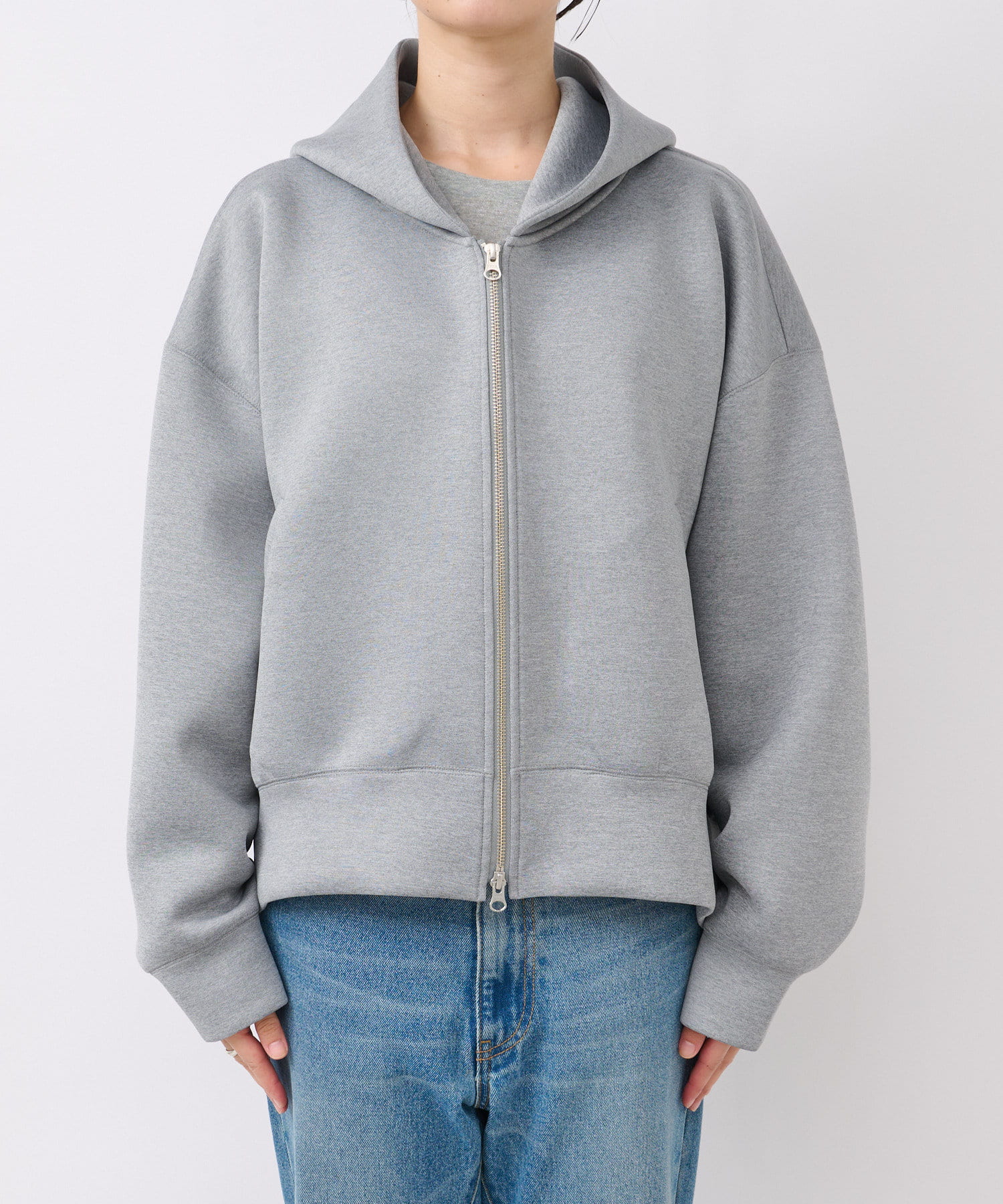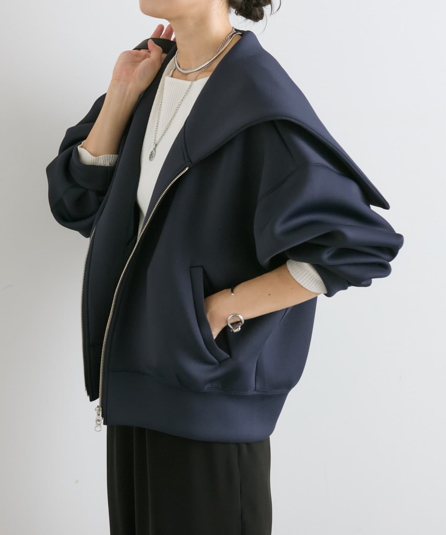 前あきはダブルジップなので、裾側を大胆に開けて頂くと抜け感が出て素敵です。