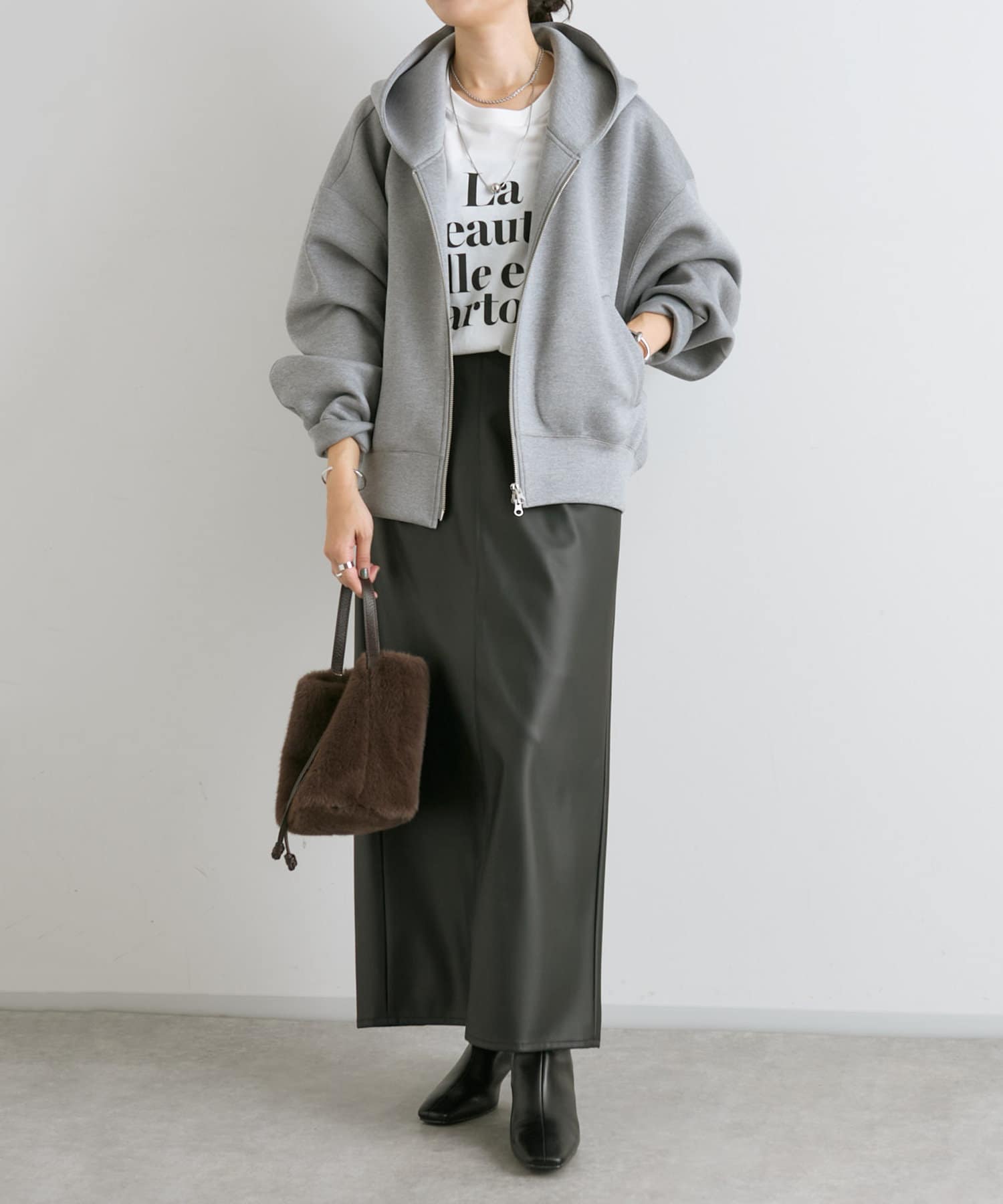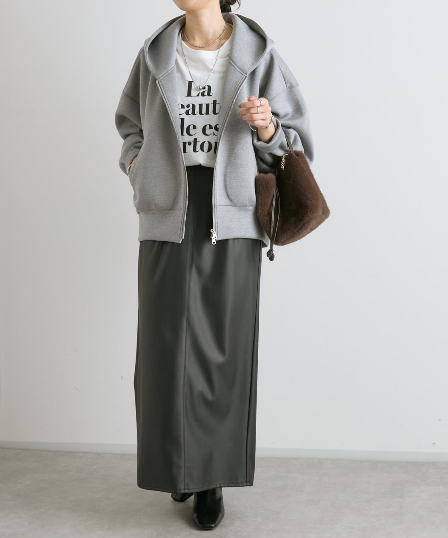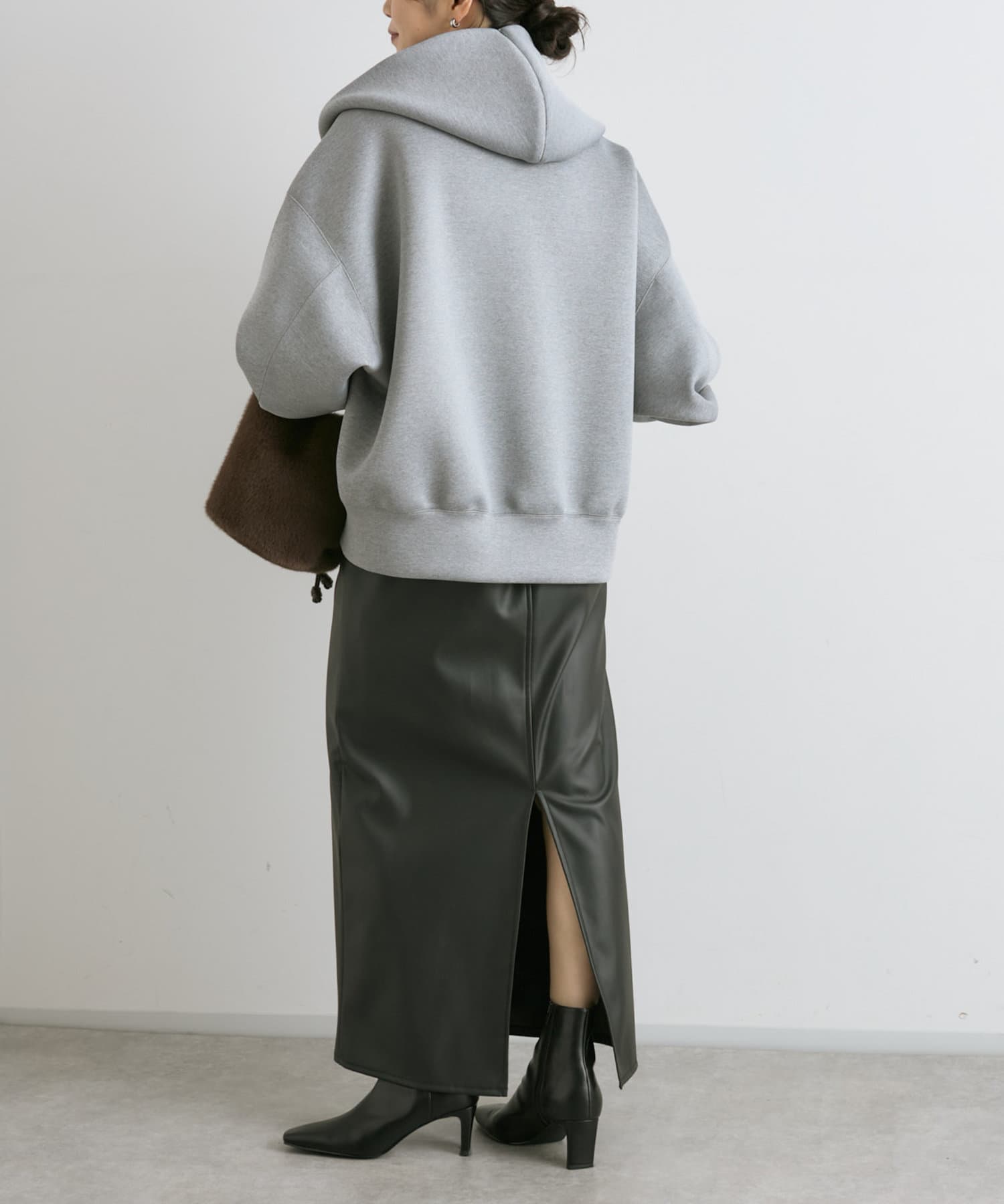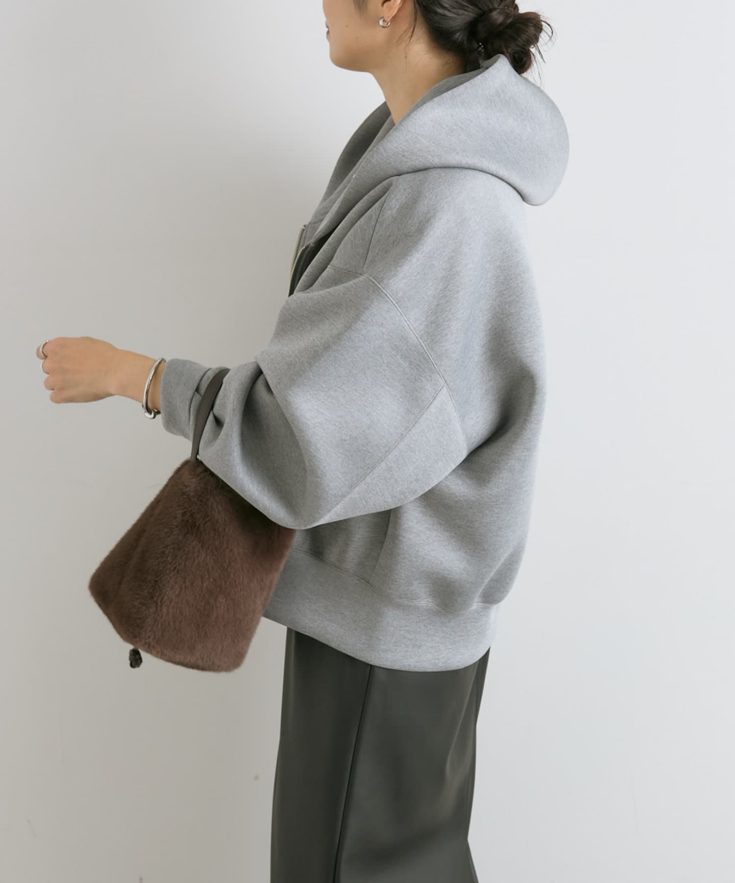 前あきはダブルジップなので、裾側を大胆に開けて頂くと抜け感が出て素敵です。