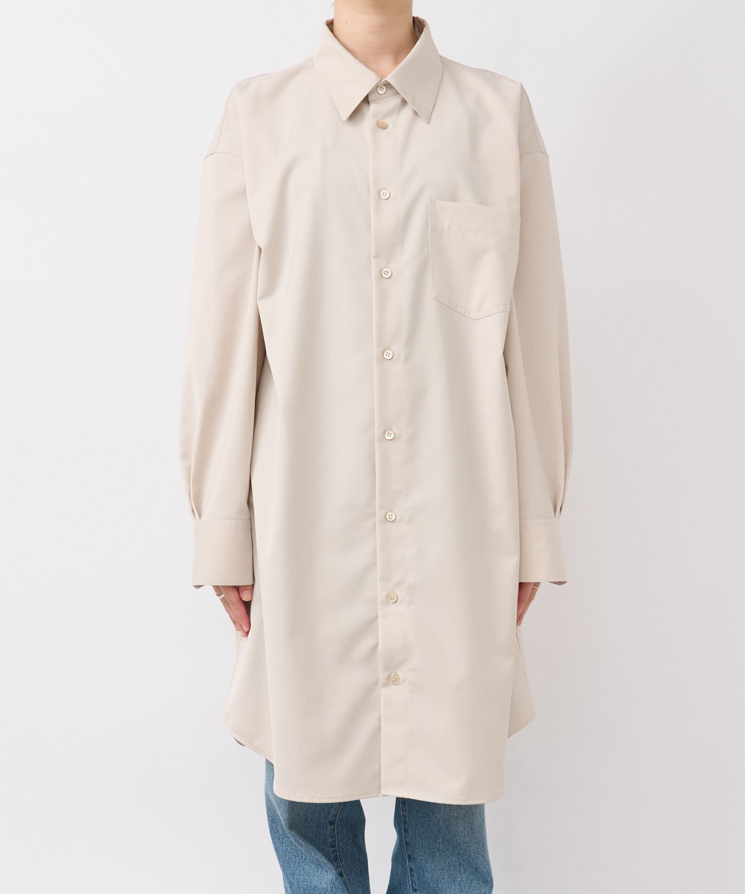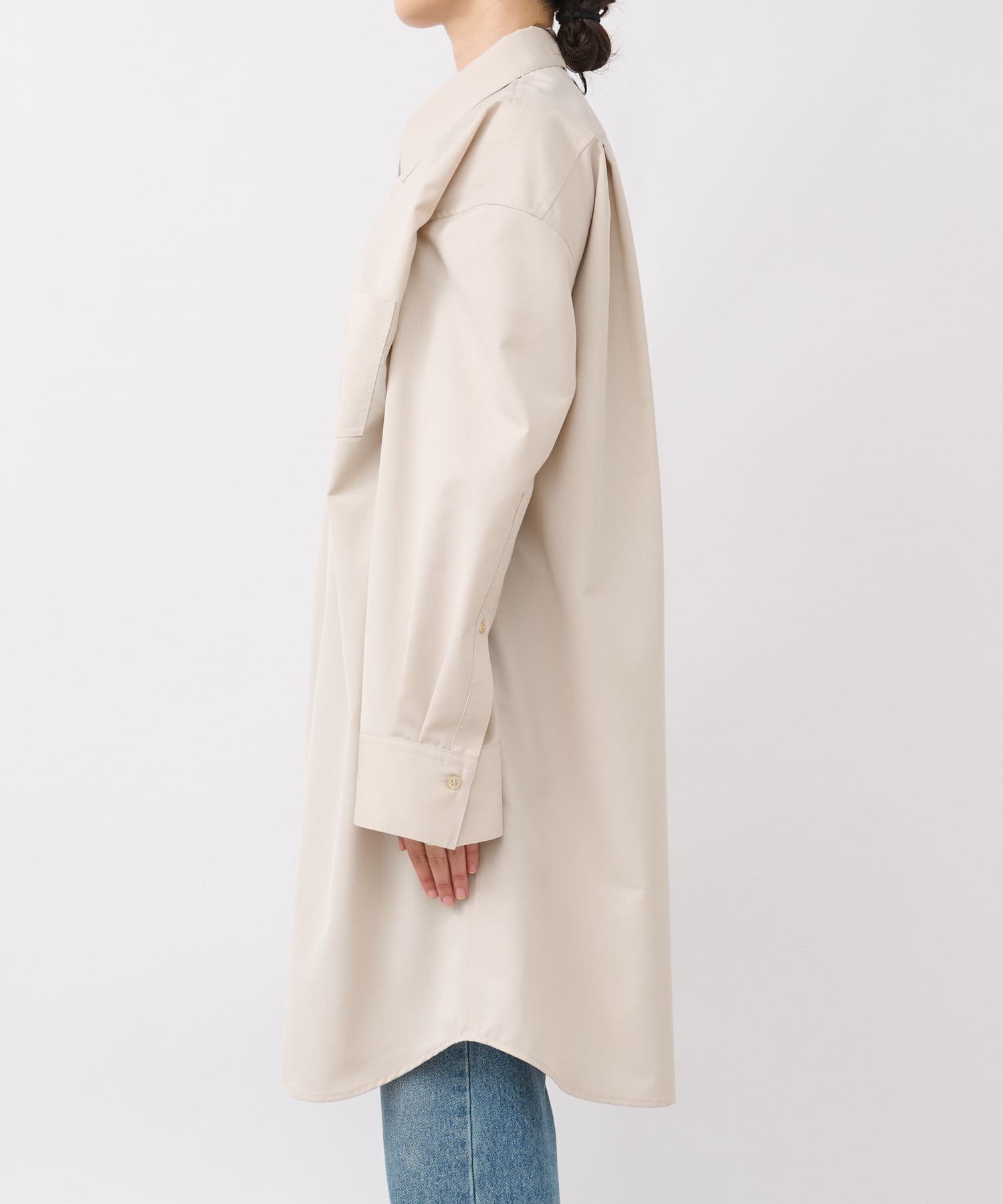 デザインはシンプルなひざ丈のロングシャツですが、フロント胸のあたりに共布のテープがついているので、