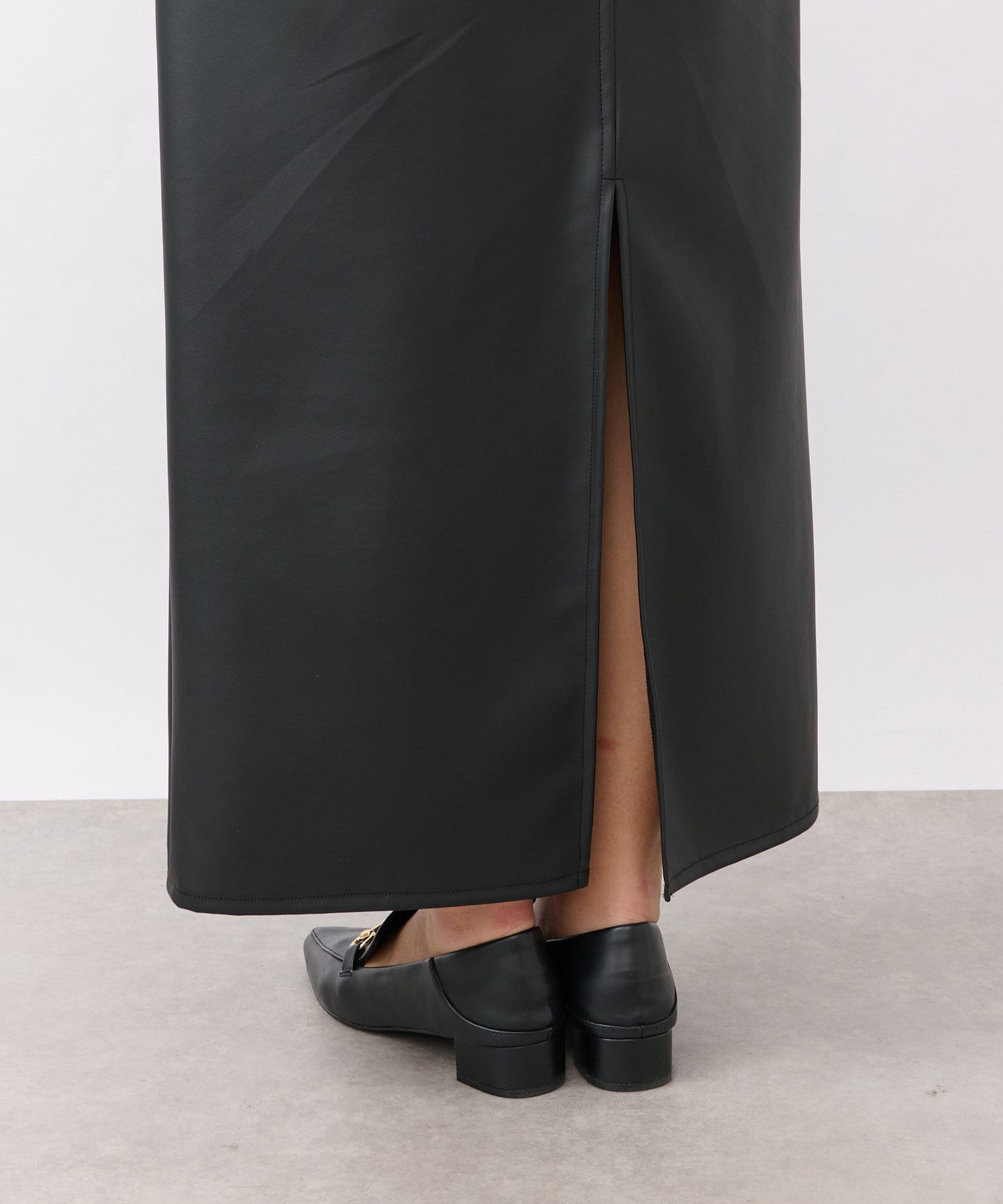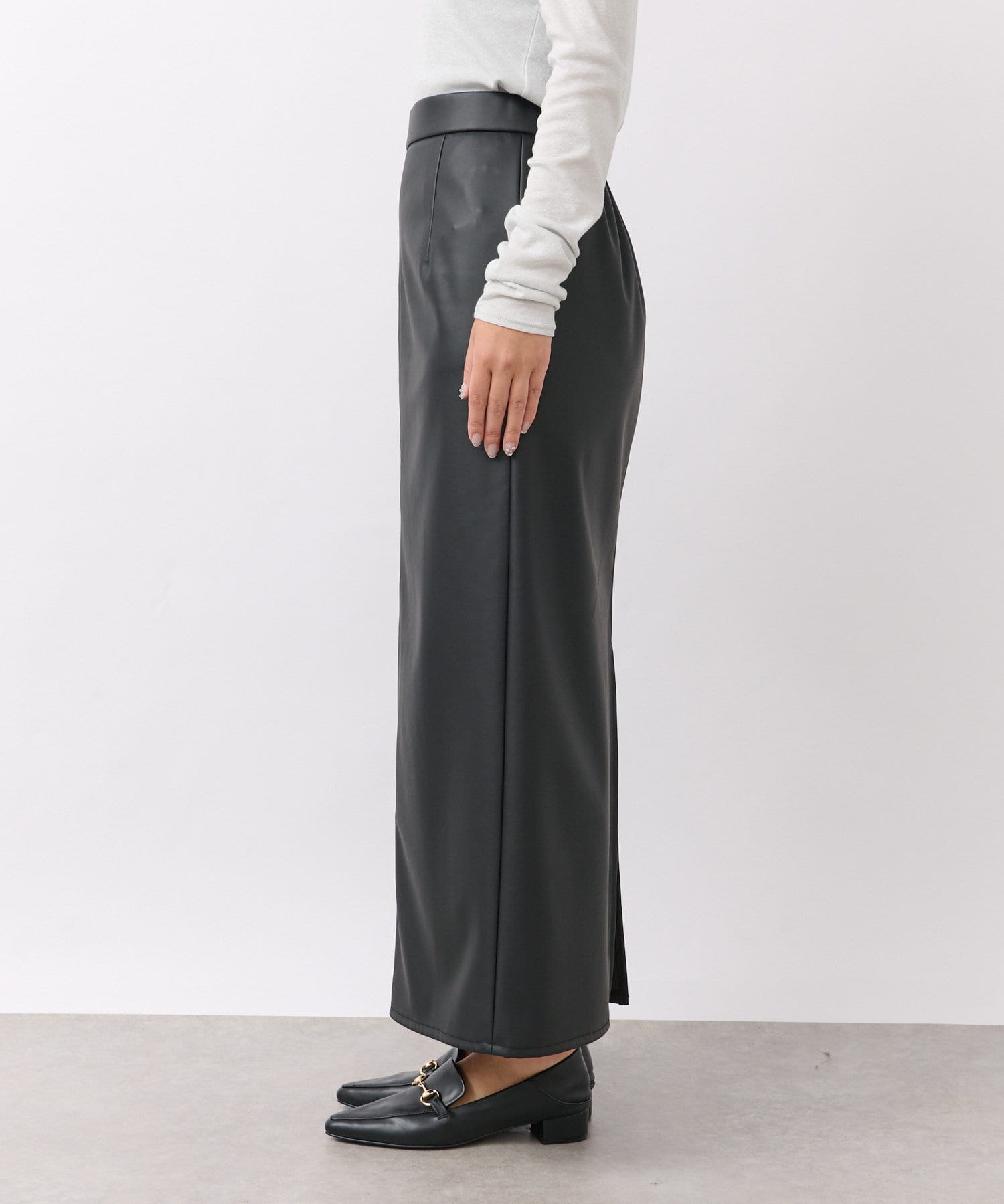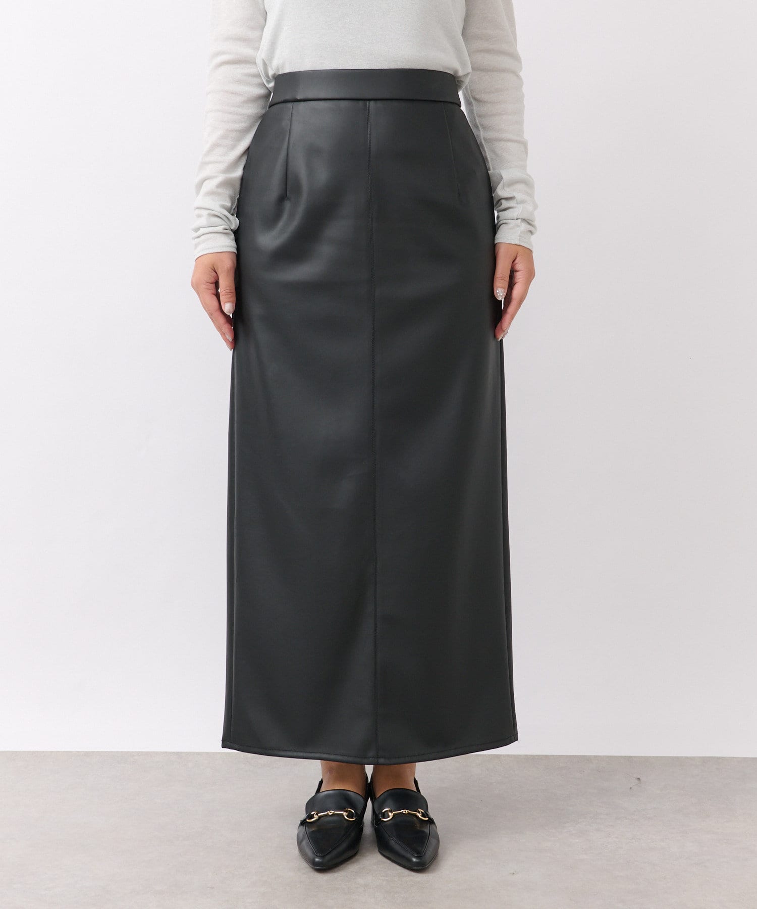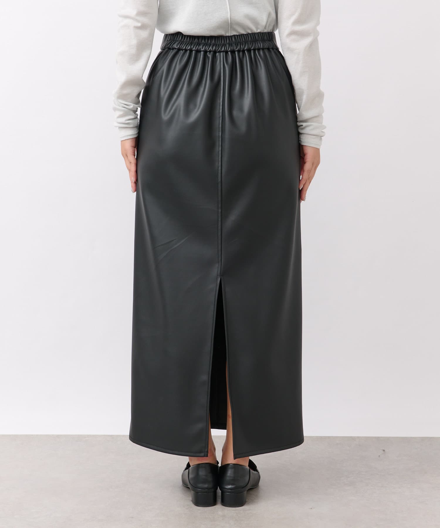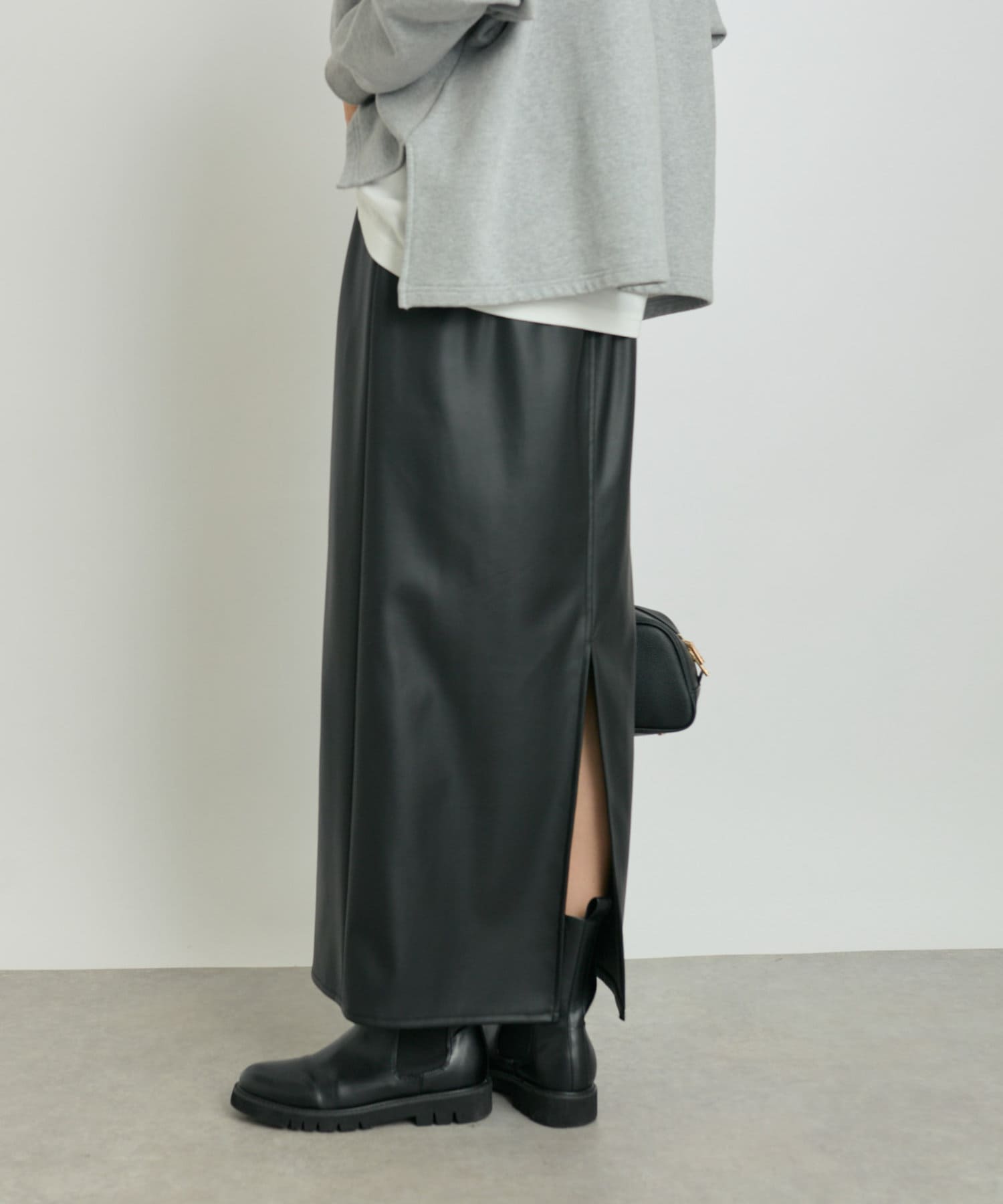 クールでモードな雰囲気のレザーライクスカート。