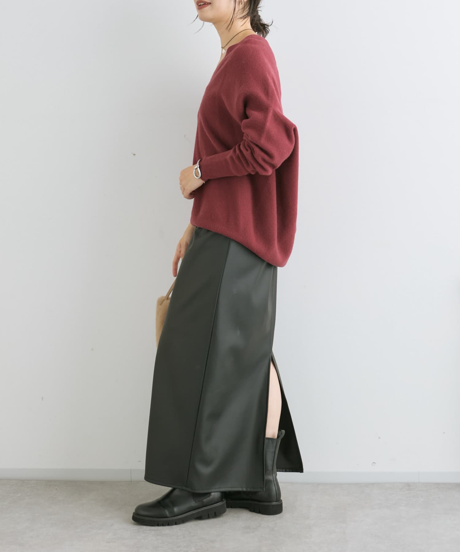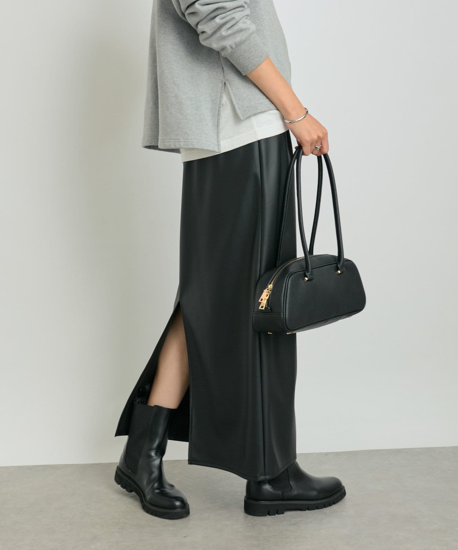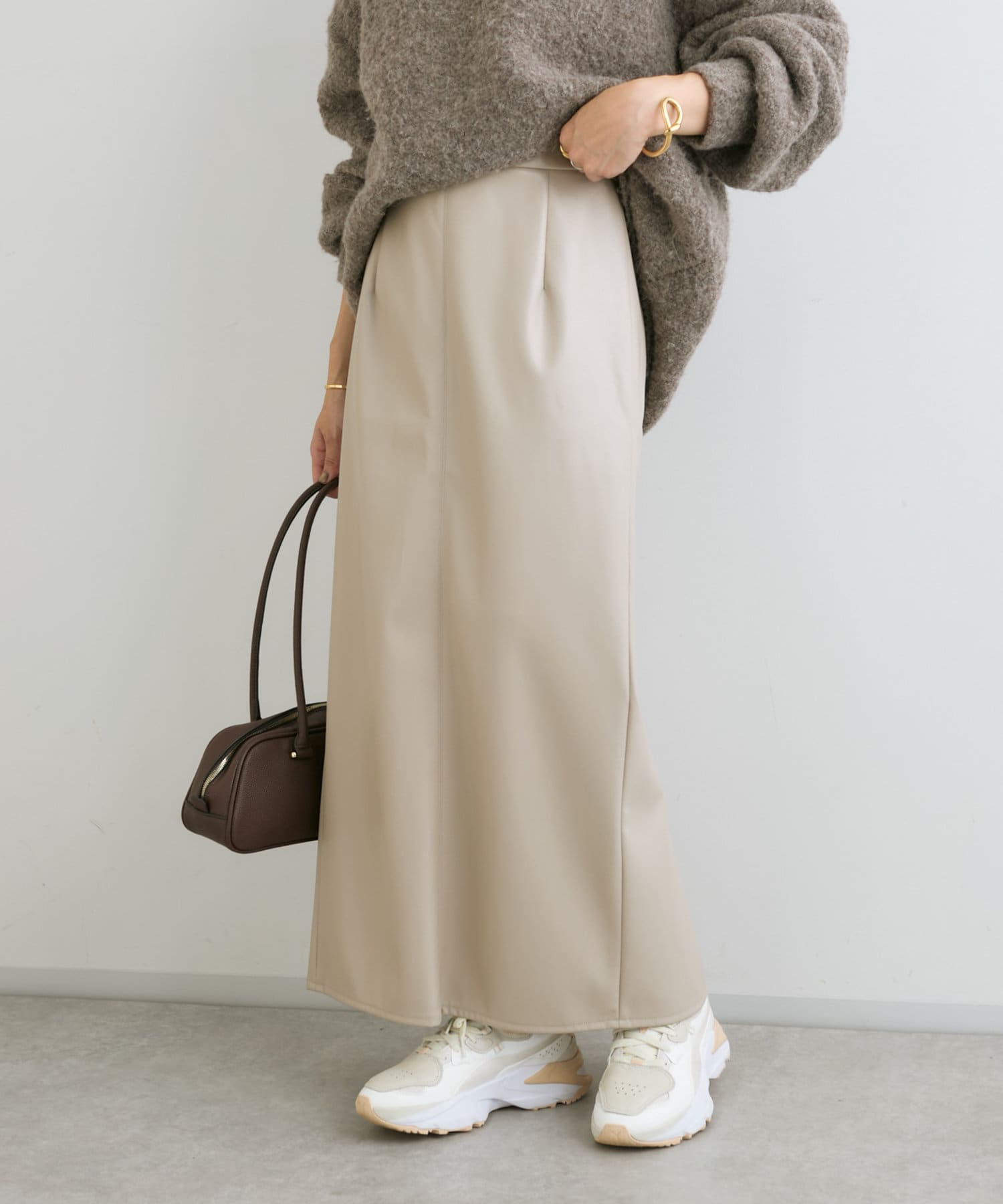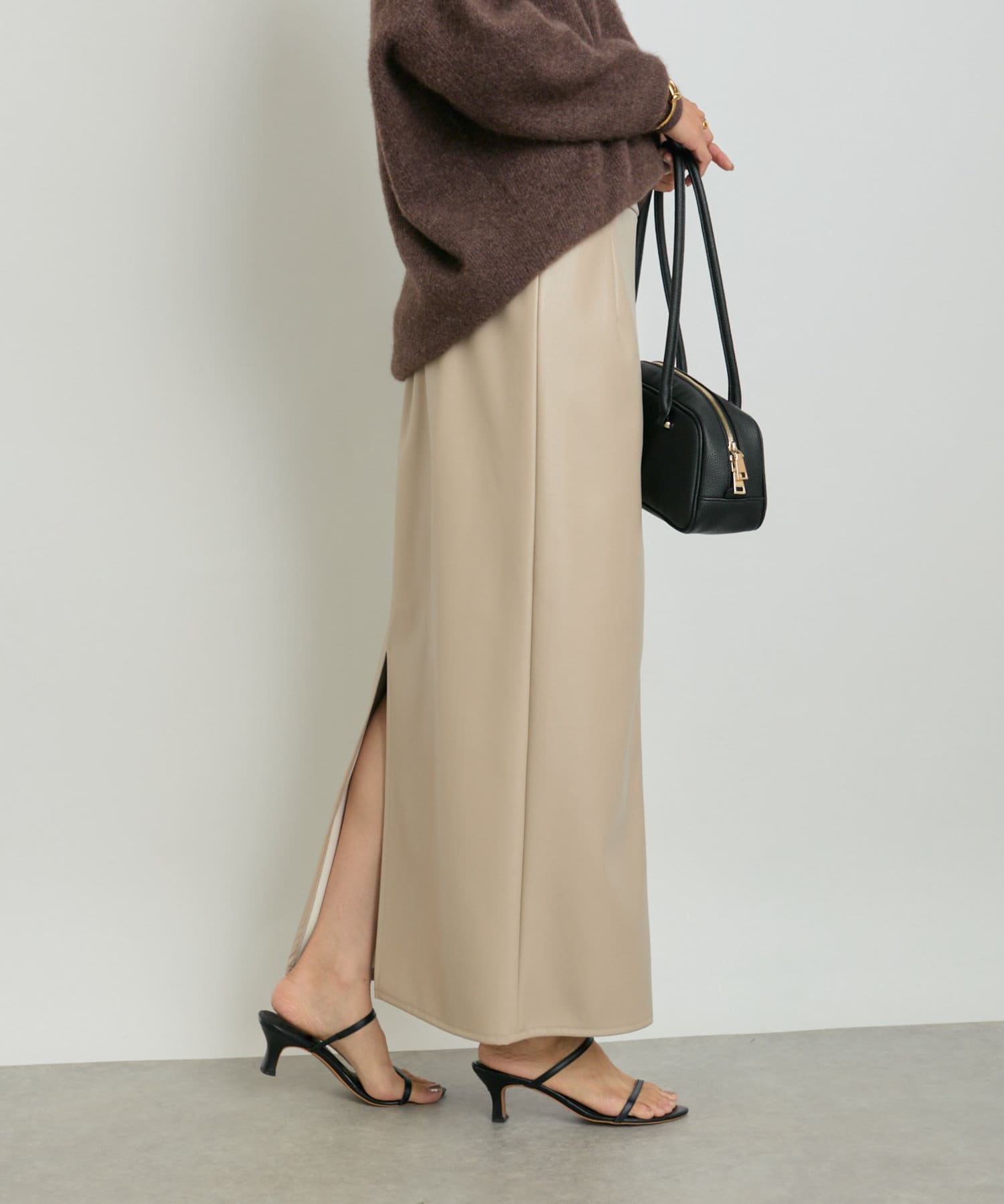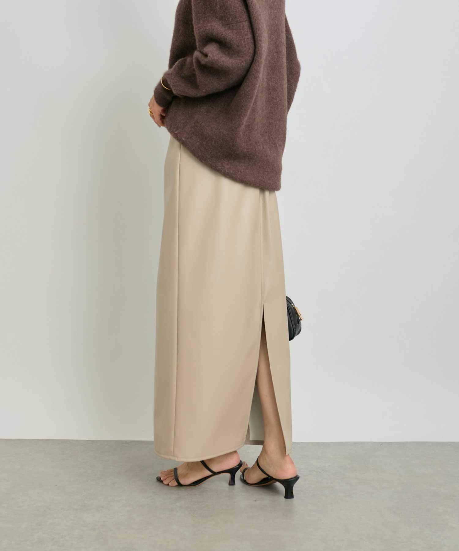 クールでモードな雰囲気のレザーライクスカート。