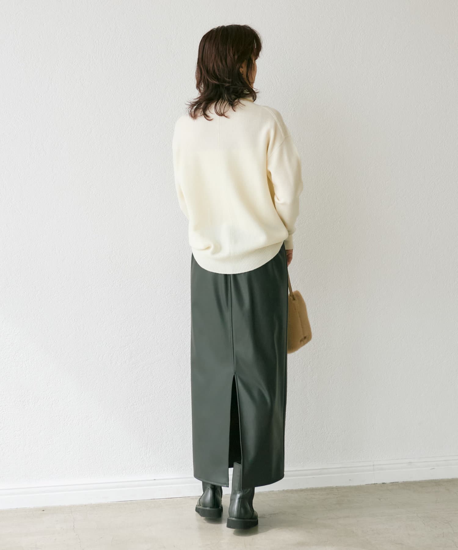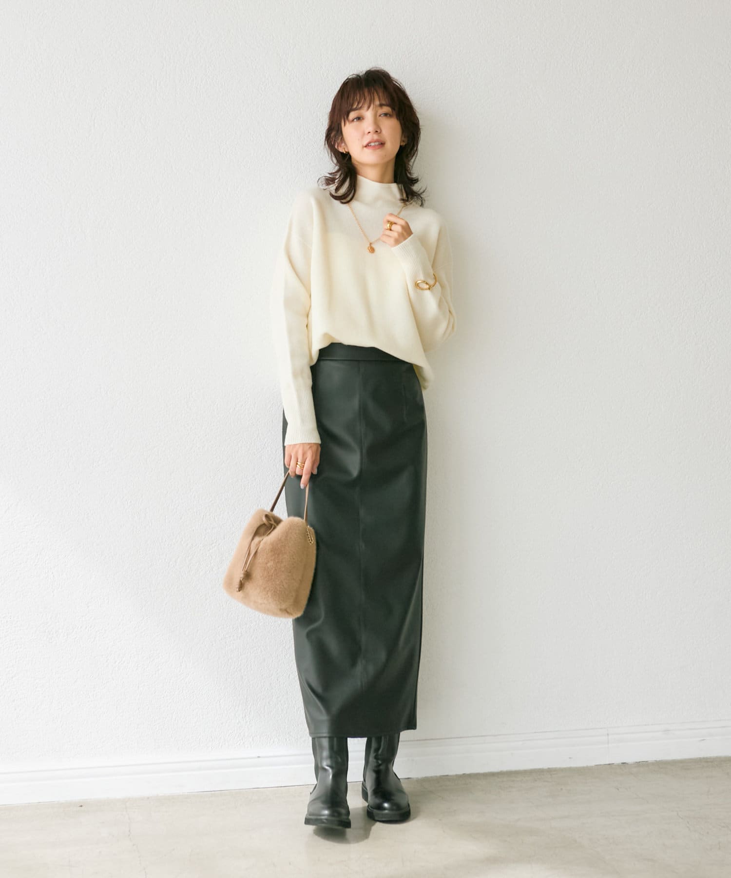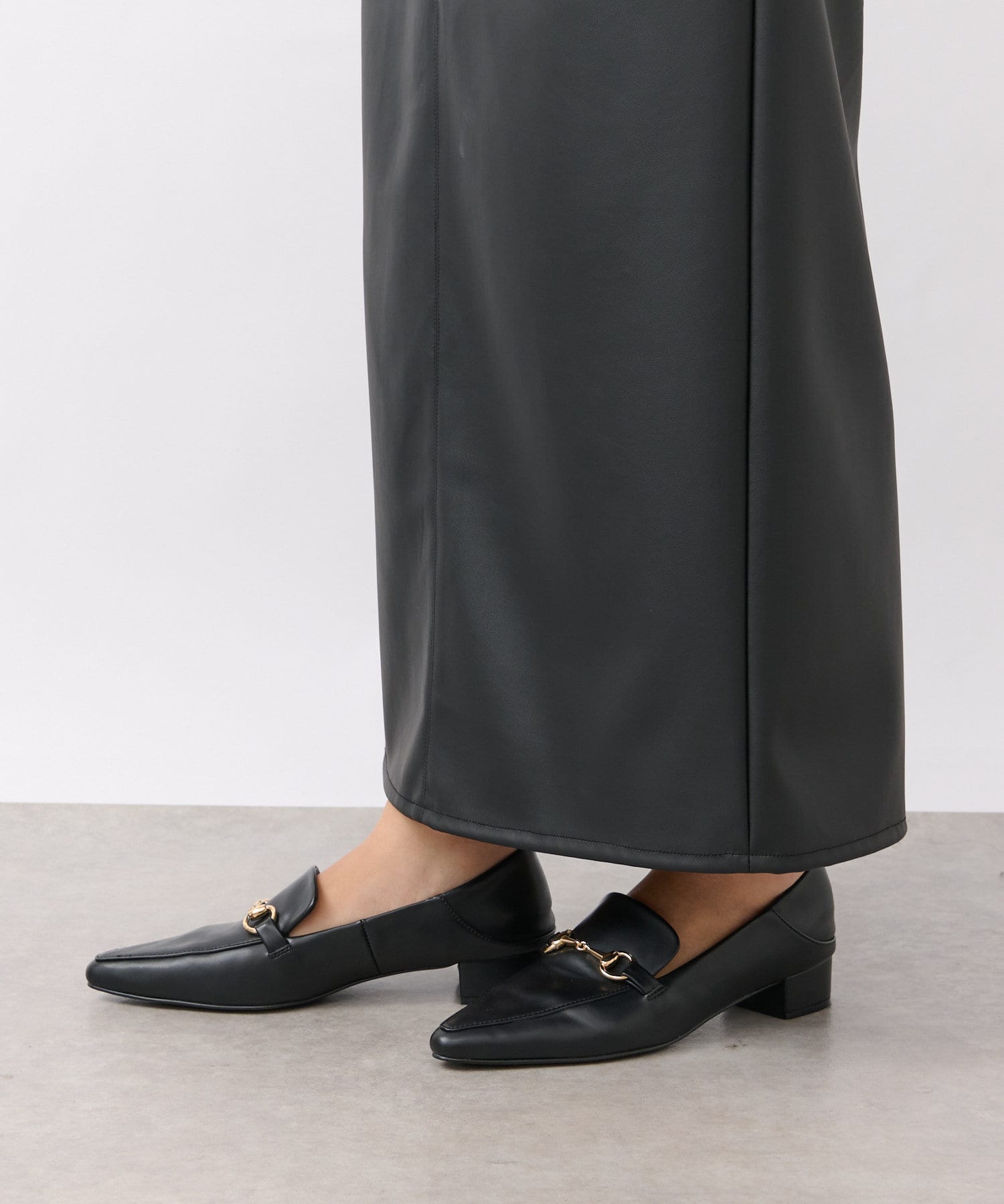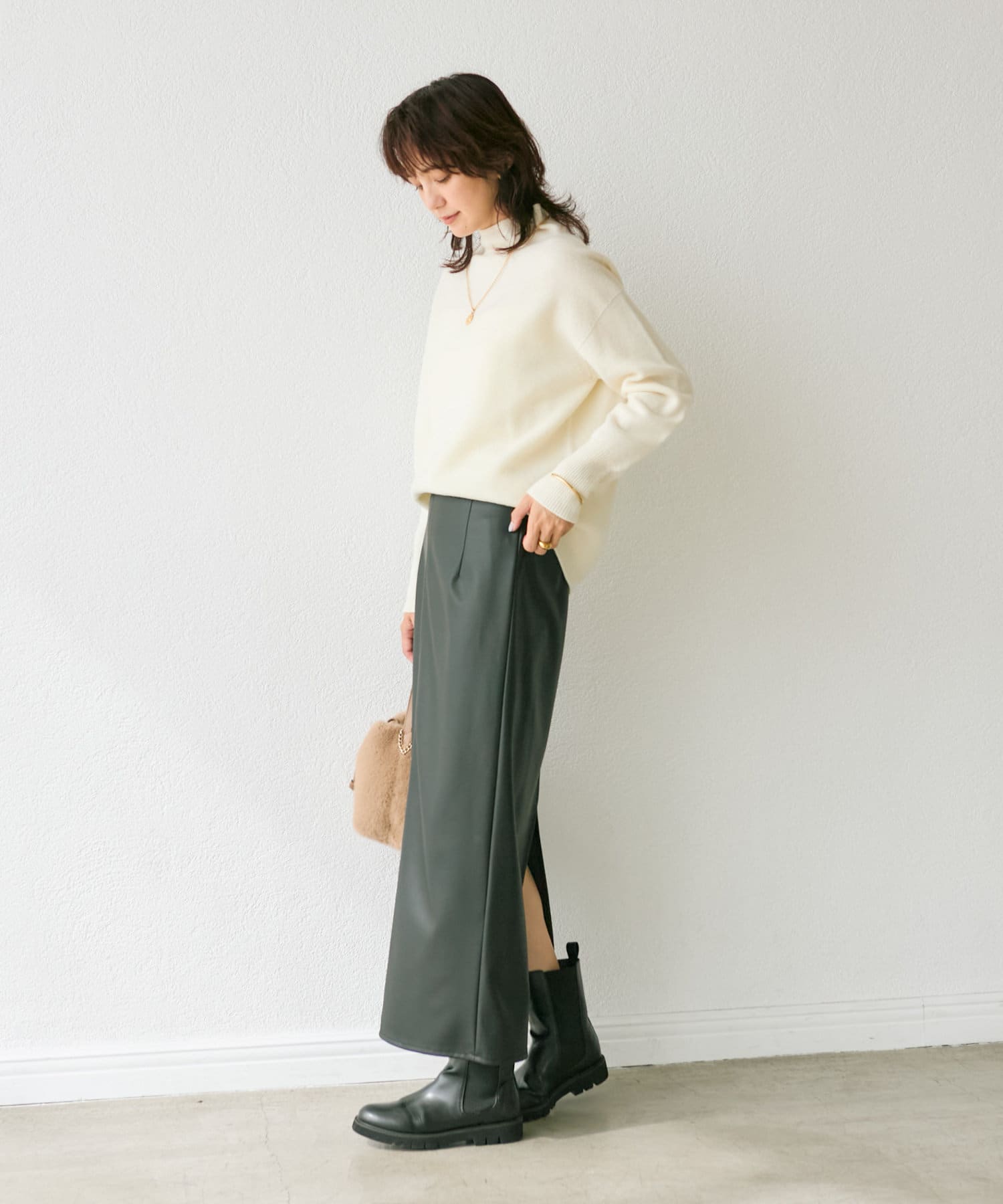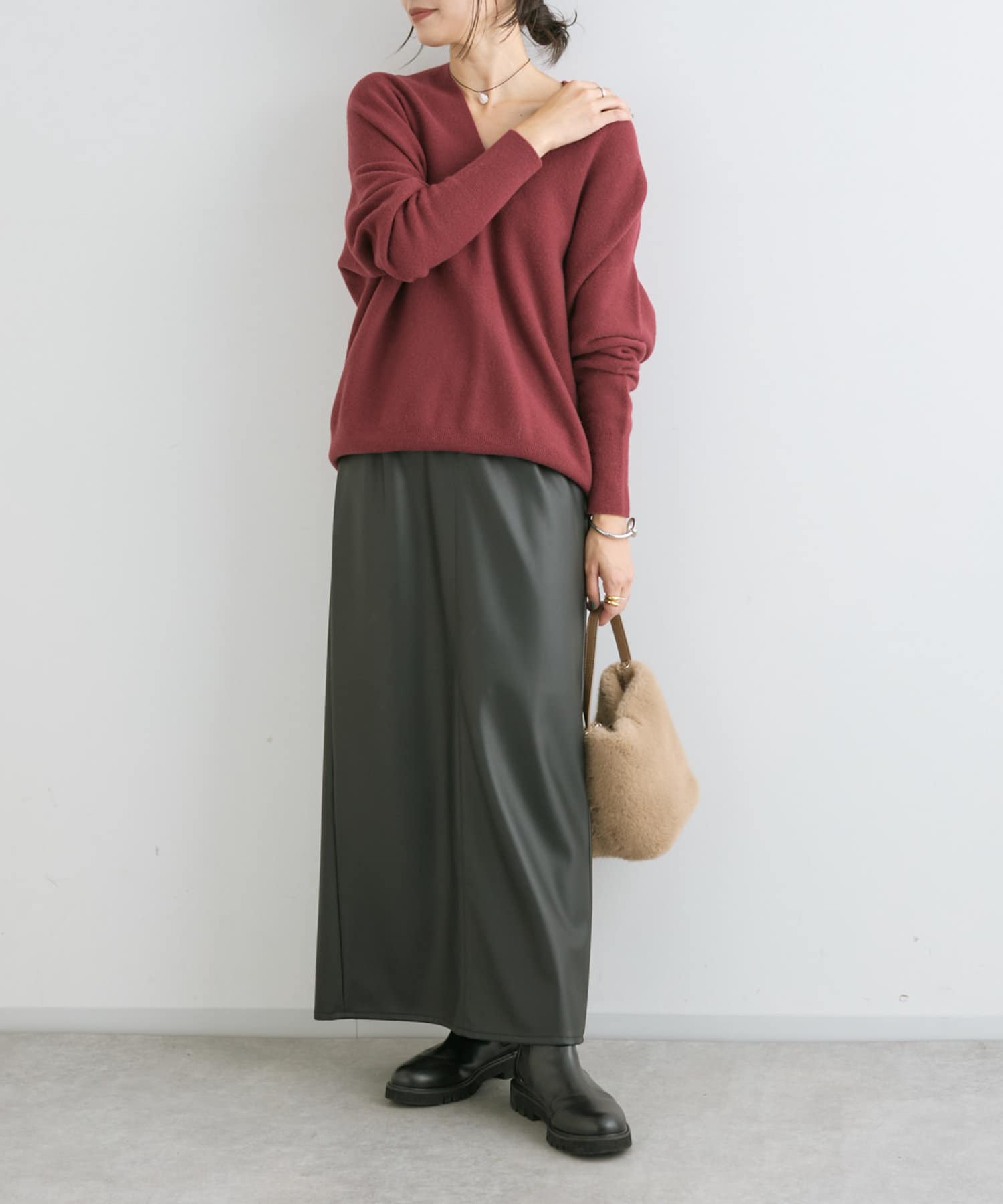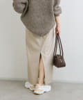 クールでモードな雰囲気のレザーライクスカート。