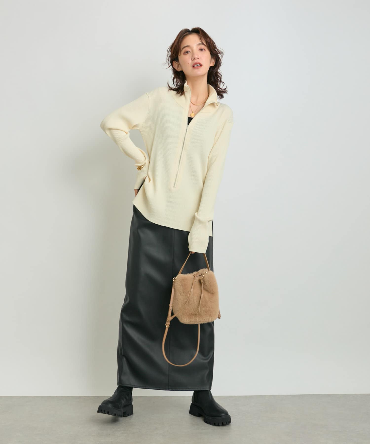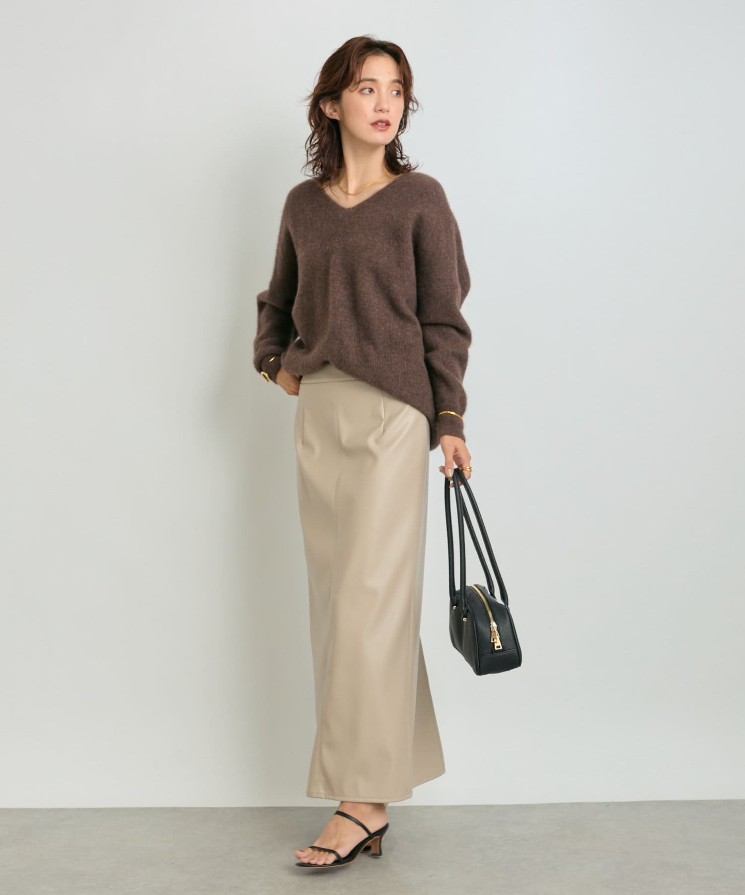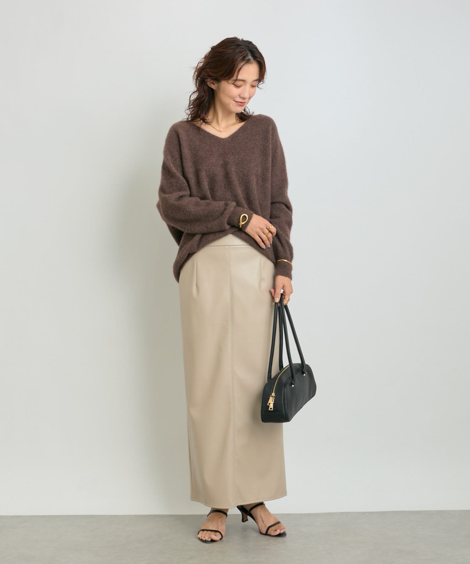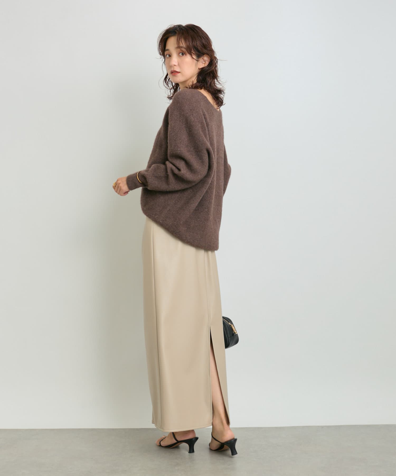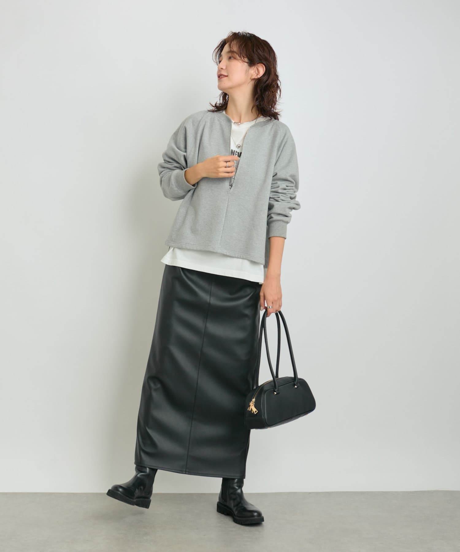 クールでモードな雰囲気のレザーライクスカート。