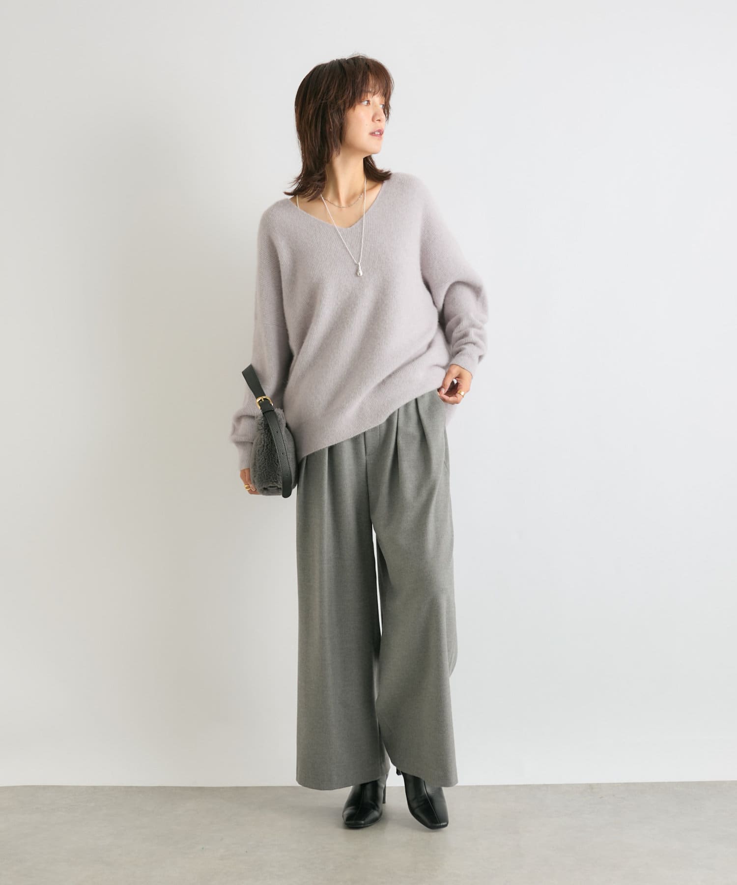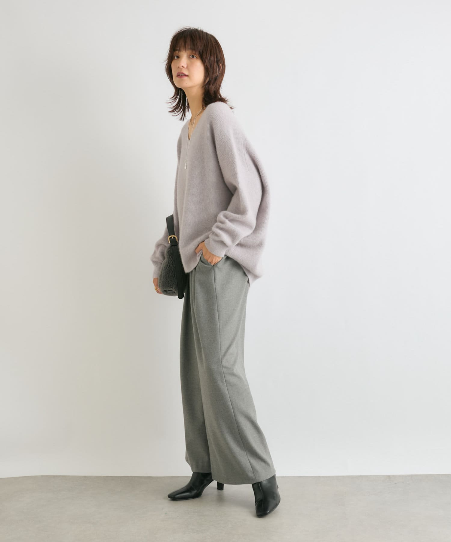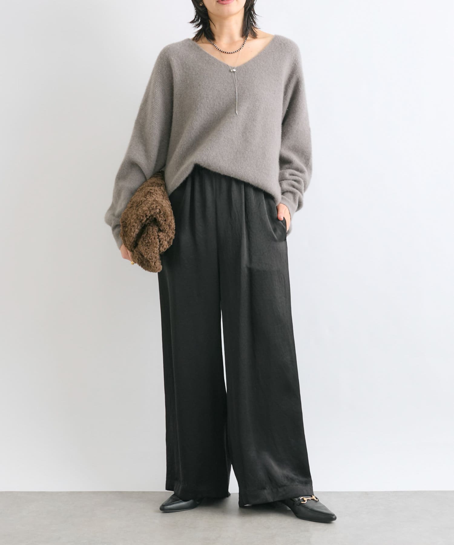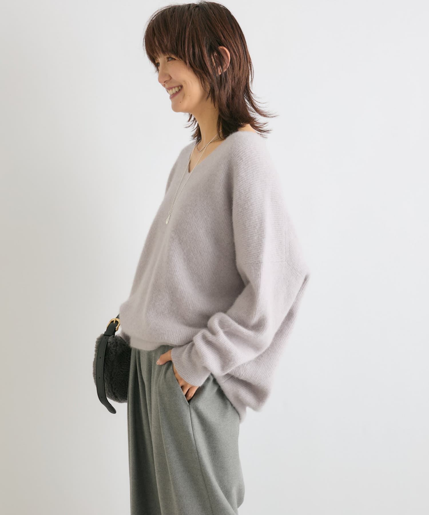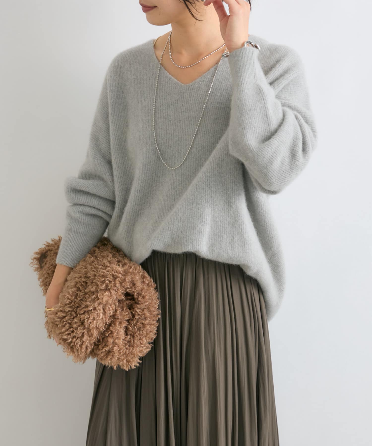 【抜け感シルエット】ヘアリーウール片畦Vネックニット