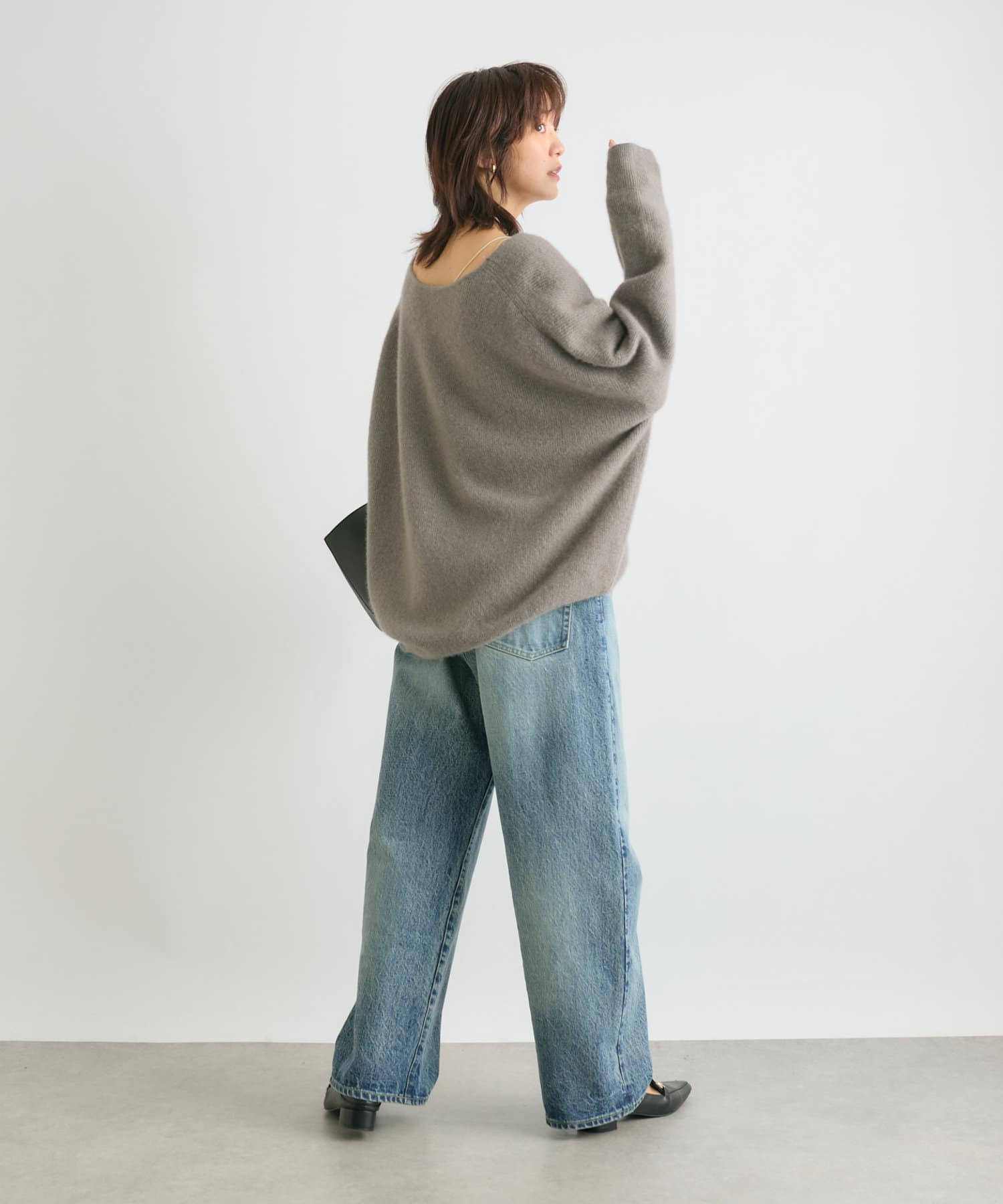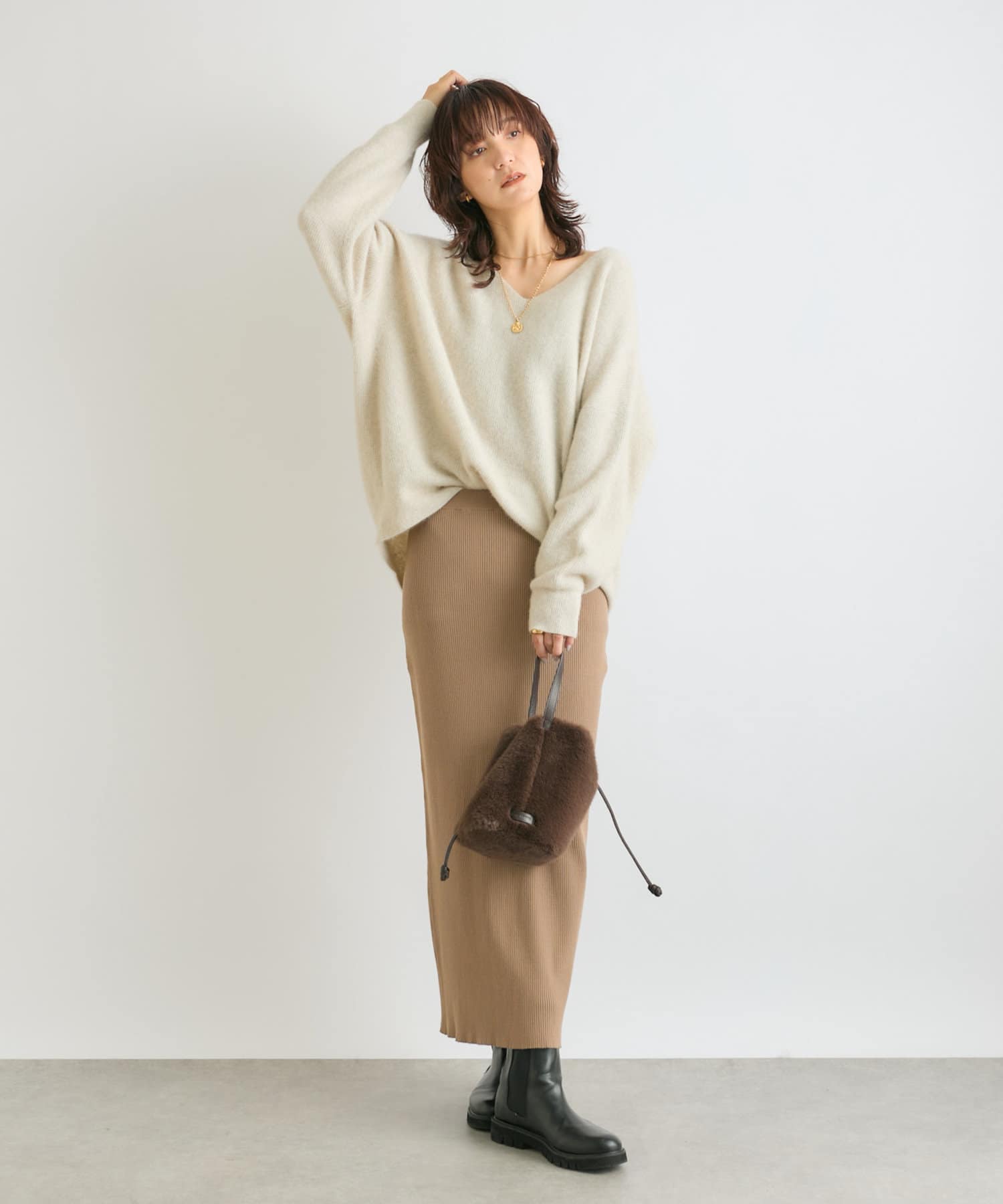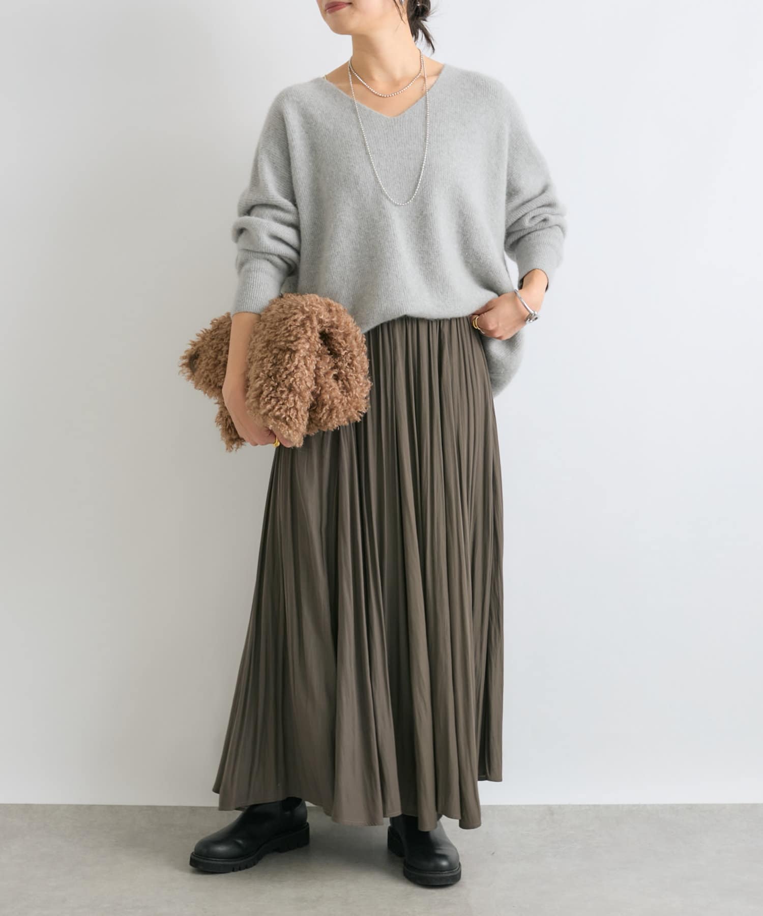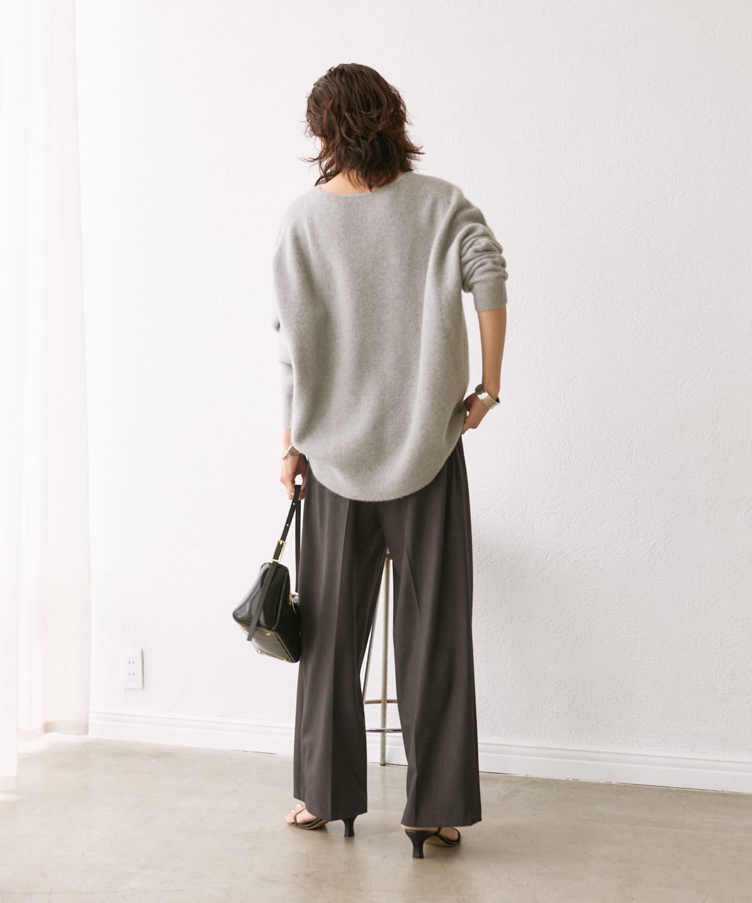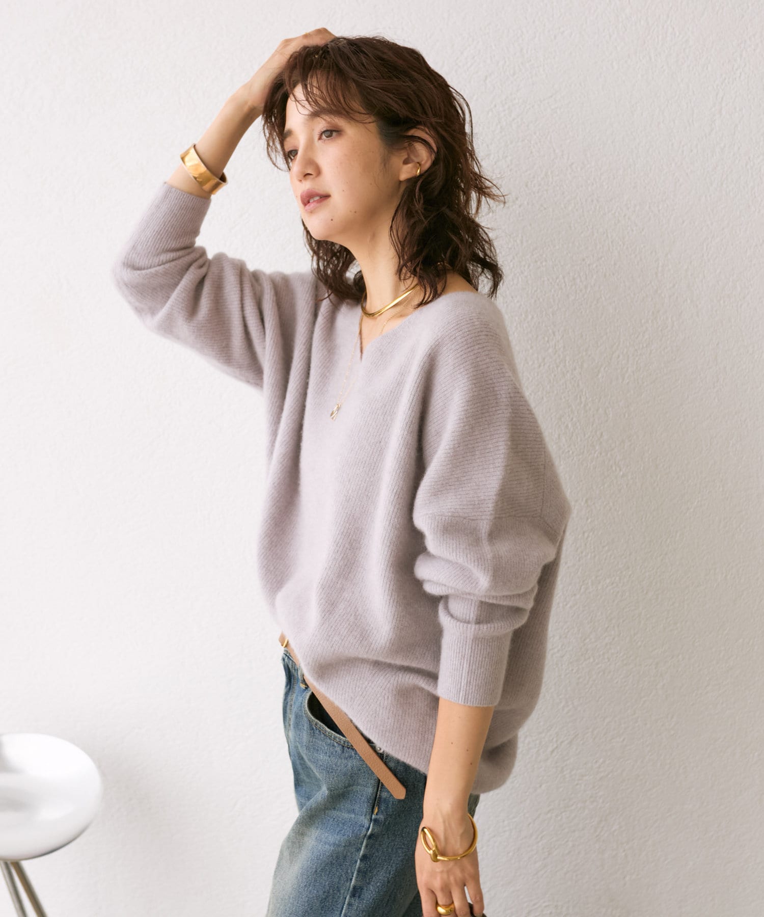 ※敏感肌の方は、ニットが直接肌に触れることでチクチク感じる場合がございますので、その場合はインナーにカットソーなどを合わせていただくことをおすすめいたします。