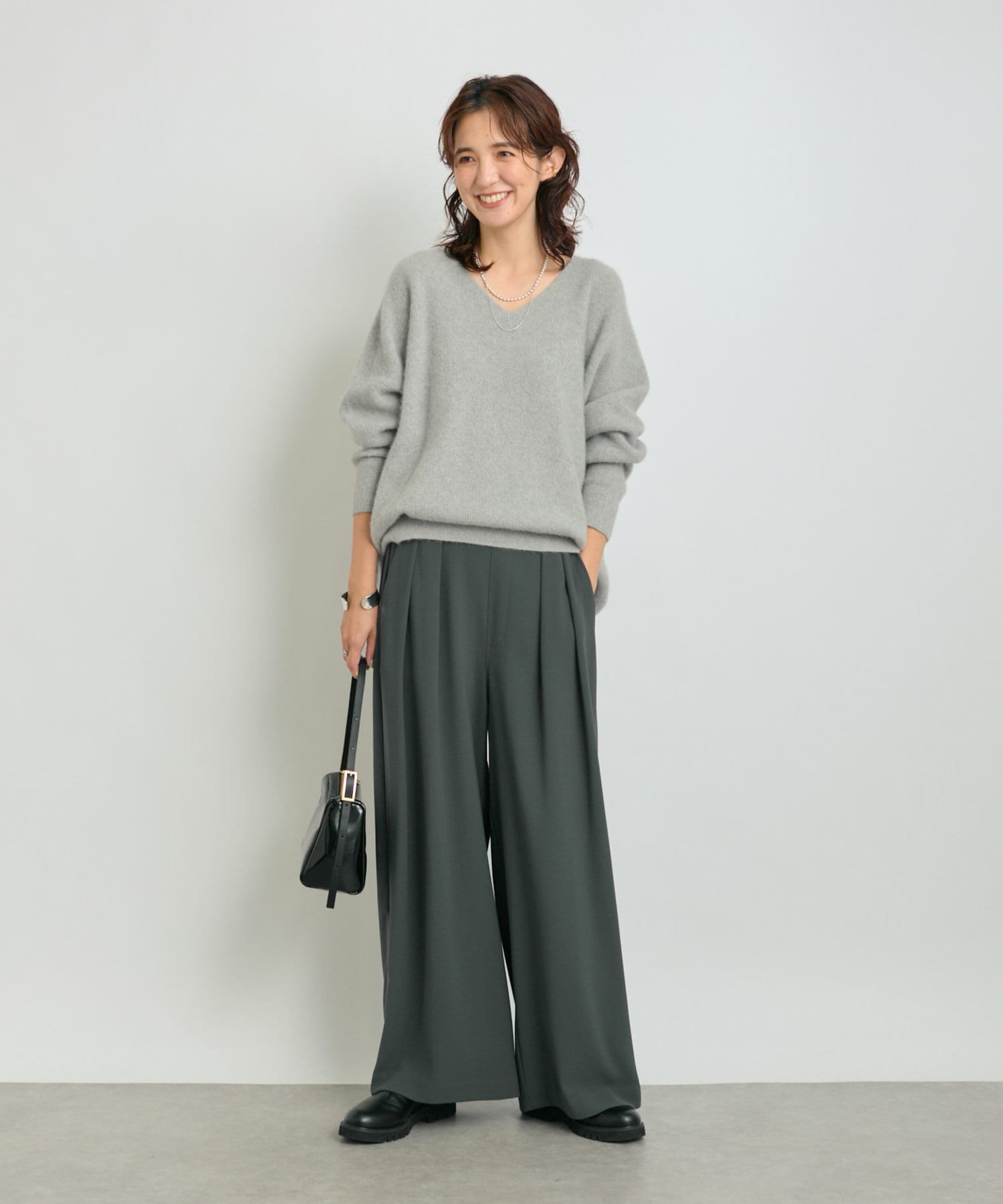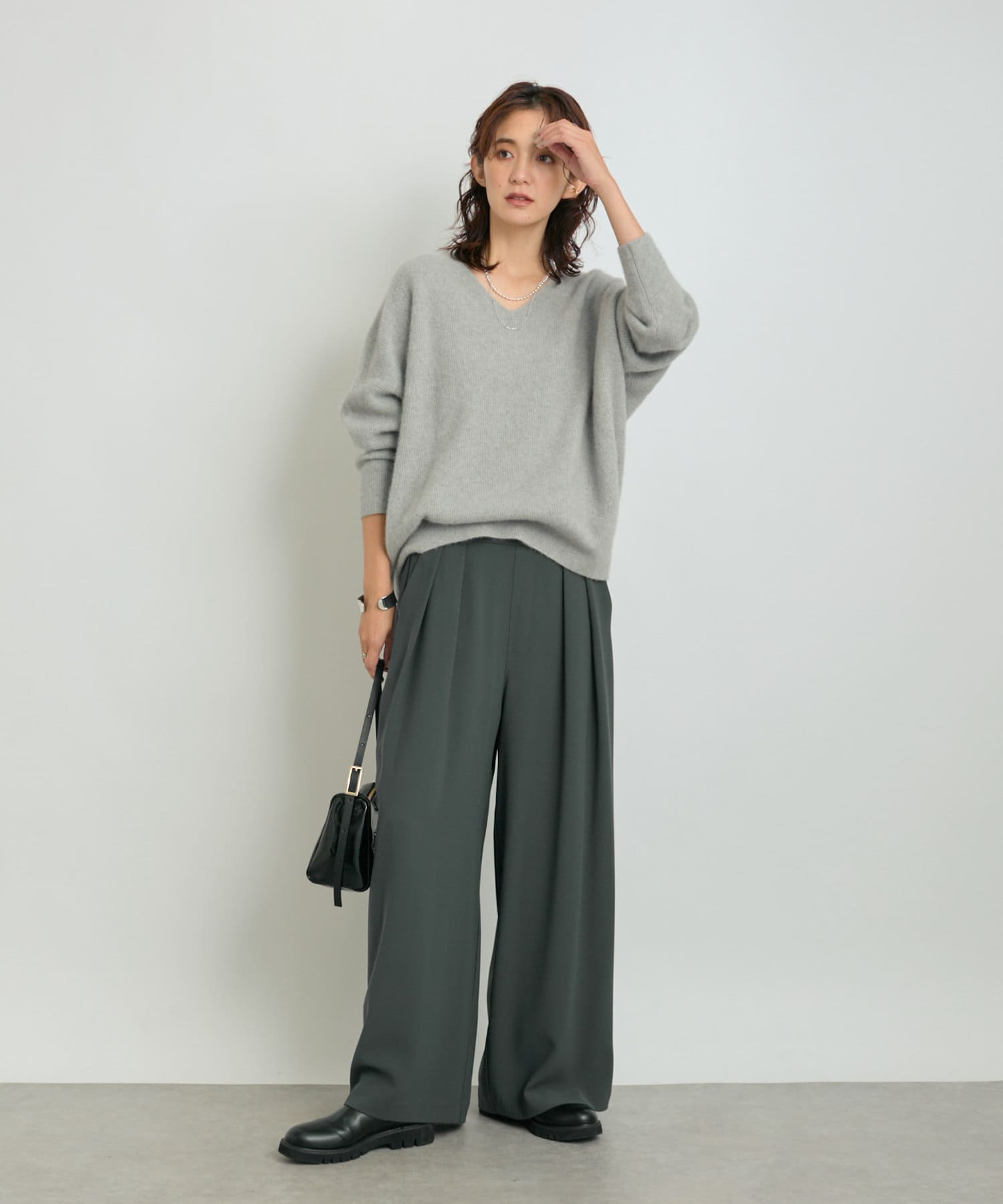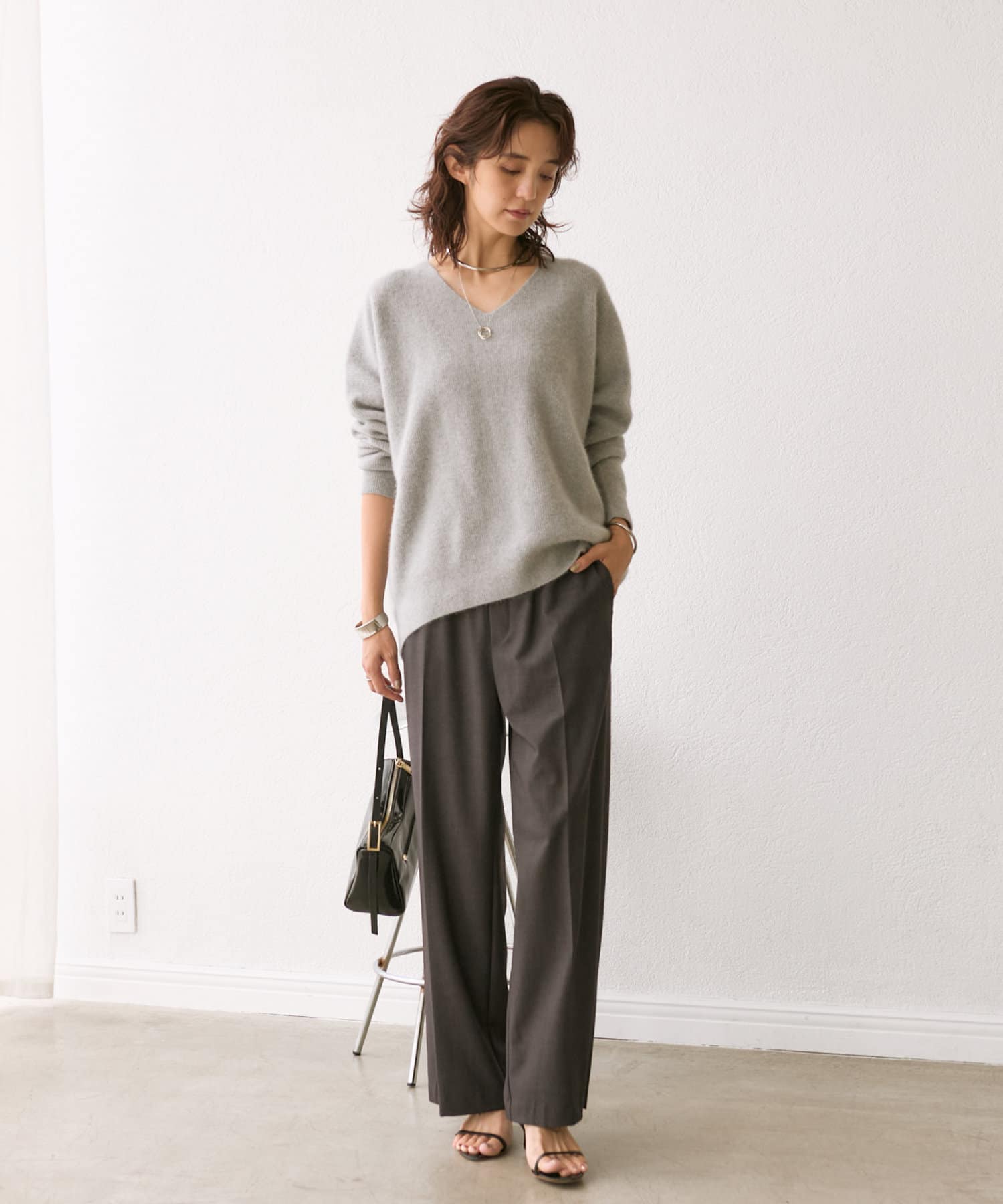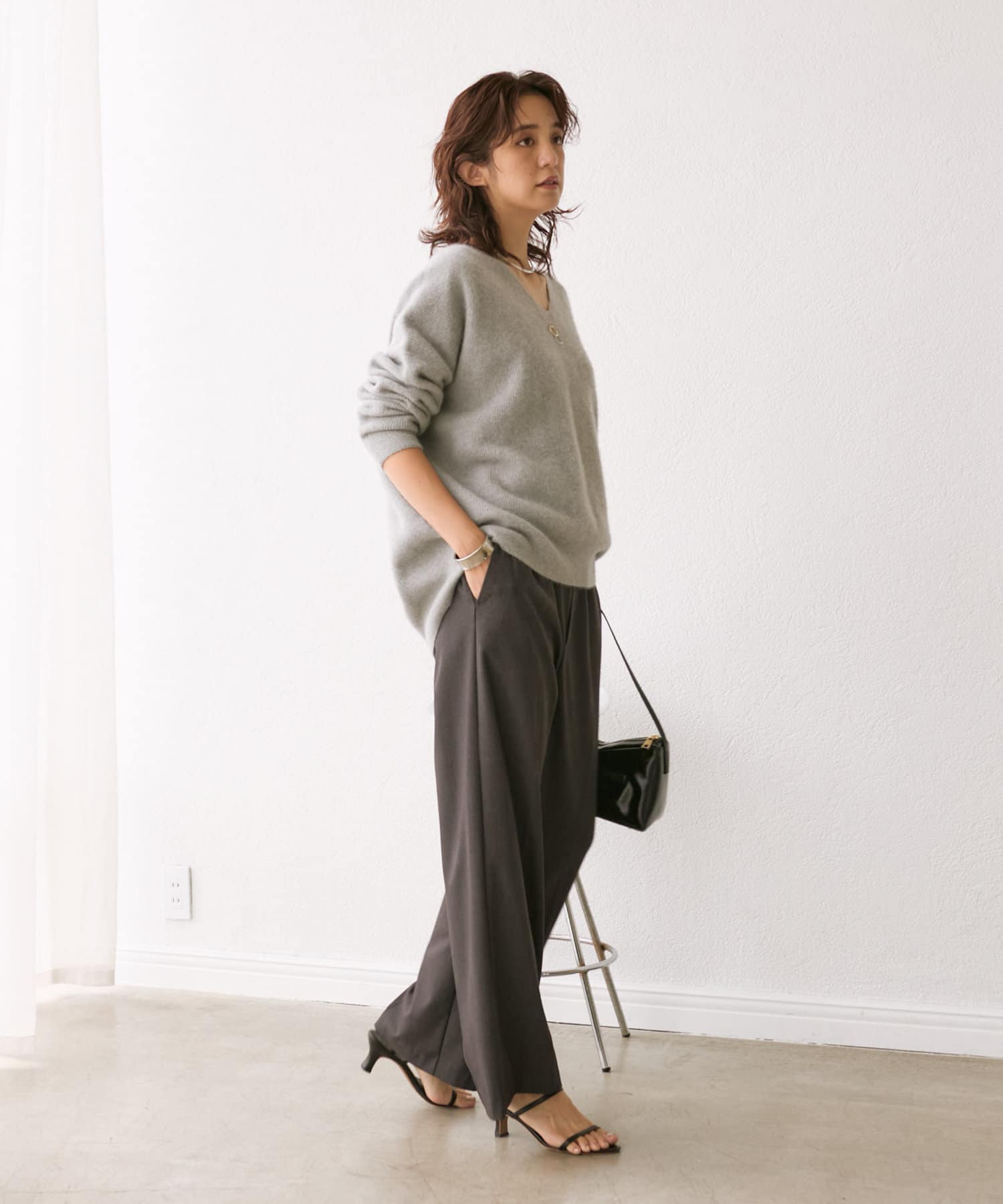 首元はすっきりとしたVネックで、着こなしに抜け感をプラス。