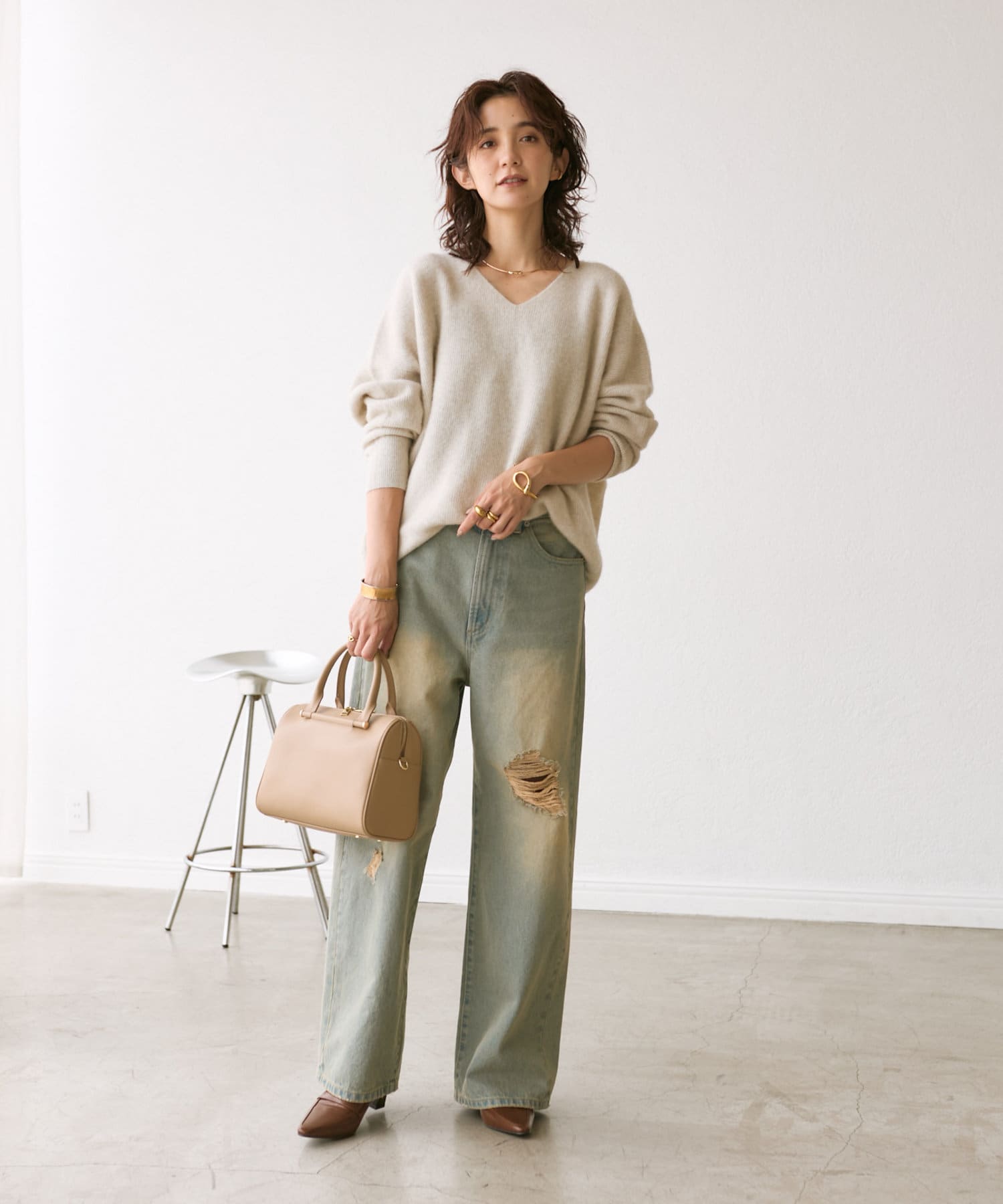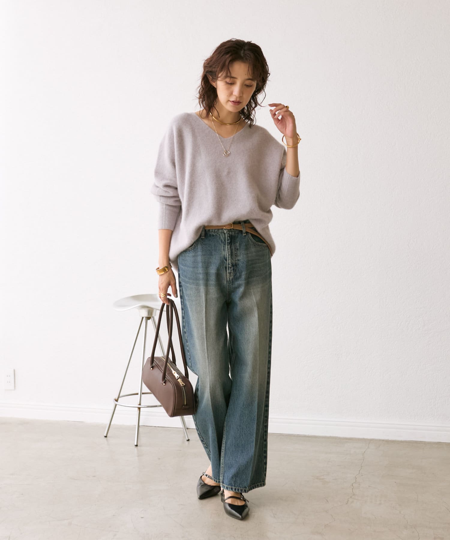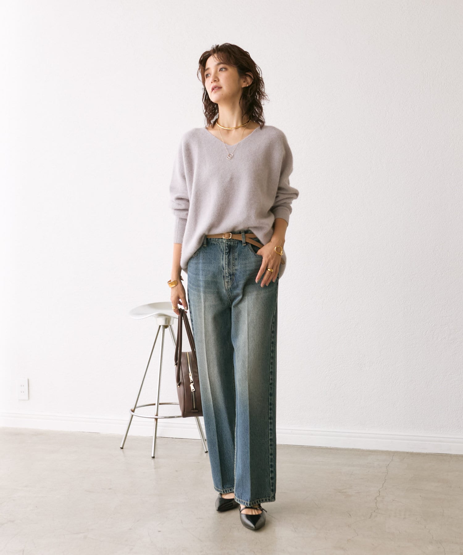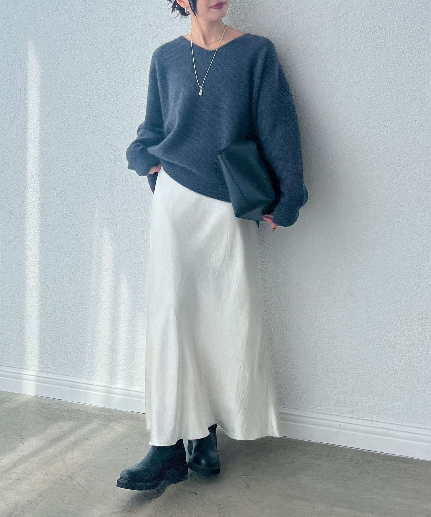 首元はすっきりとしたVネックで、着こなしに抜け感をプラス。
