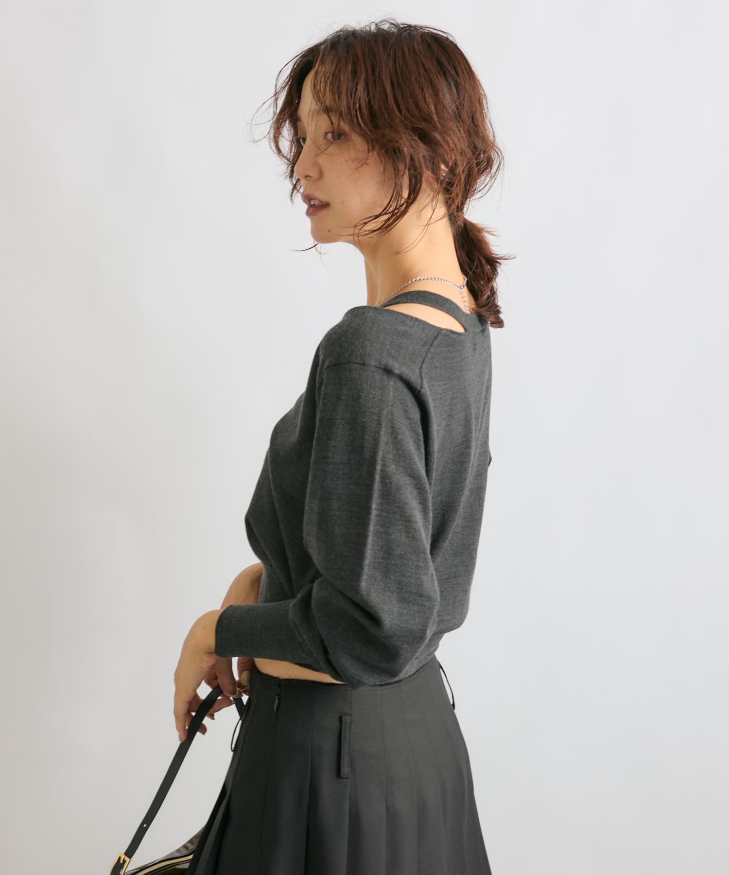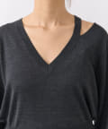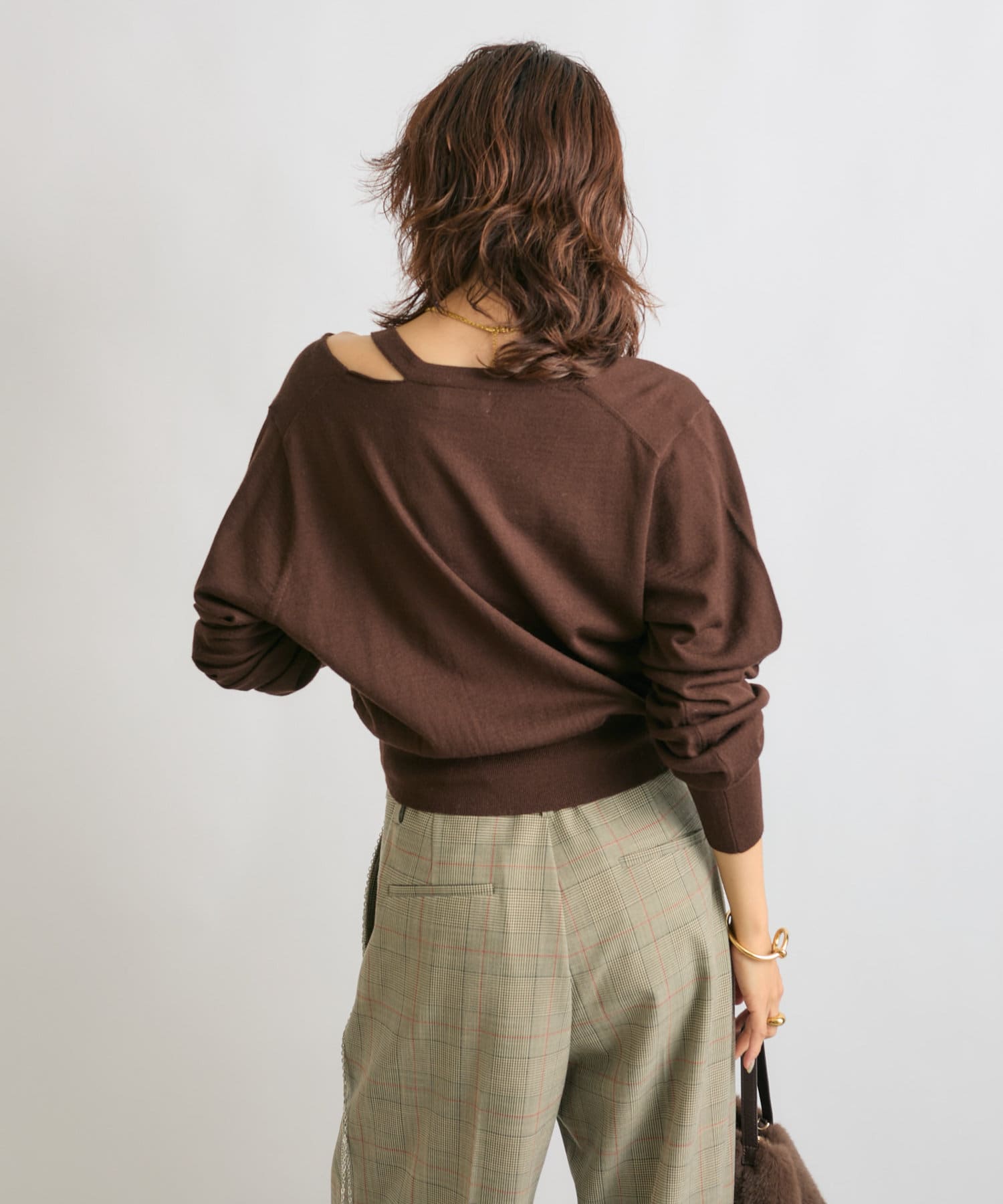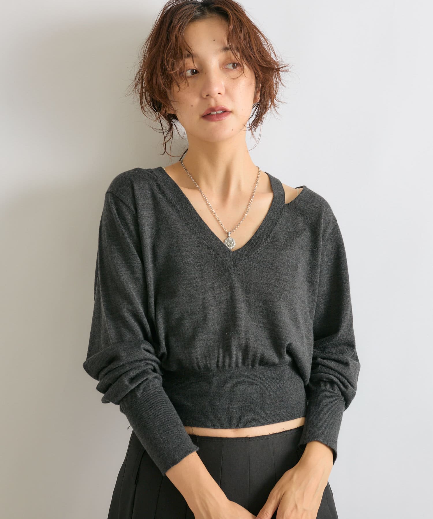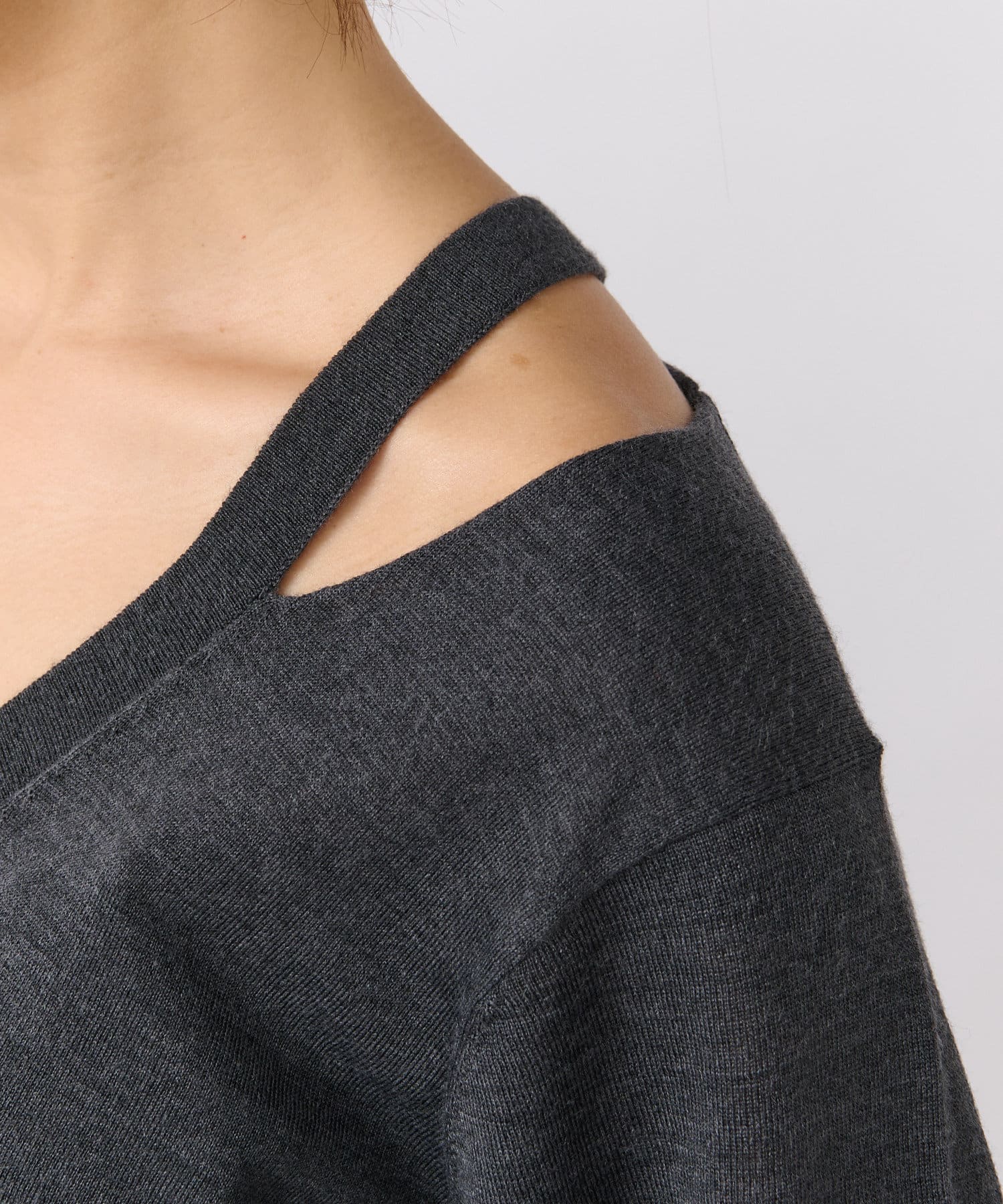左肩のカットオフディテールがポイントで、ネックライン、デコルテを綺麗に見せてくれます。