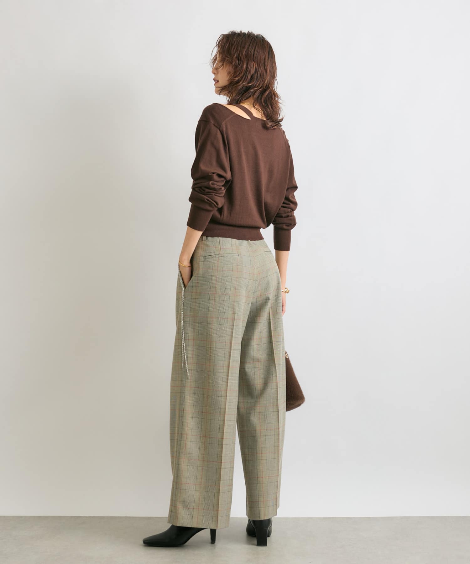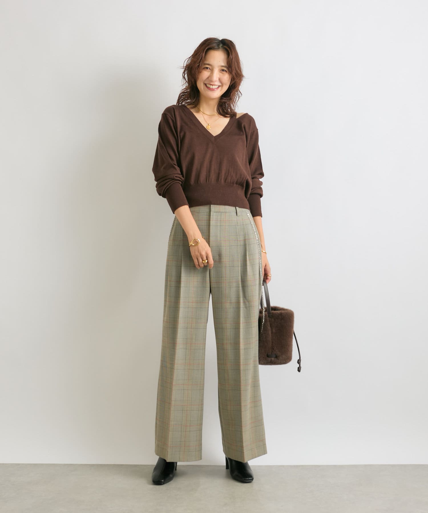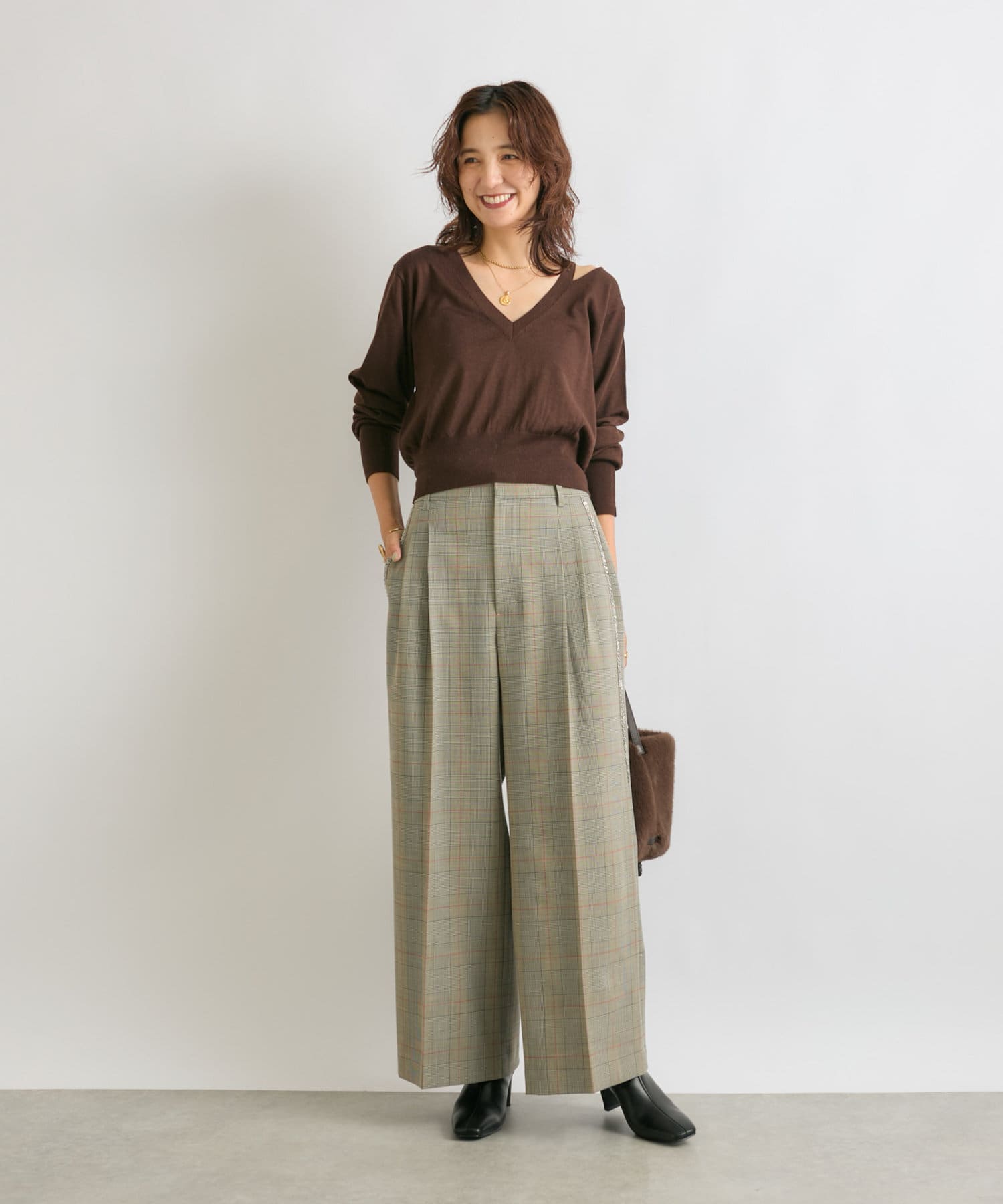 ワイドパンツや、プリーツスカートなどのボリュームのあるシルエットのボトムと合わせていただくのがバランスよくおすすめです。