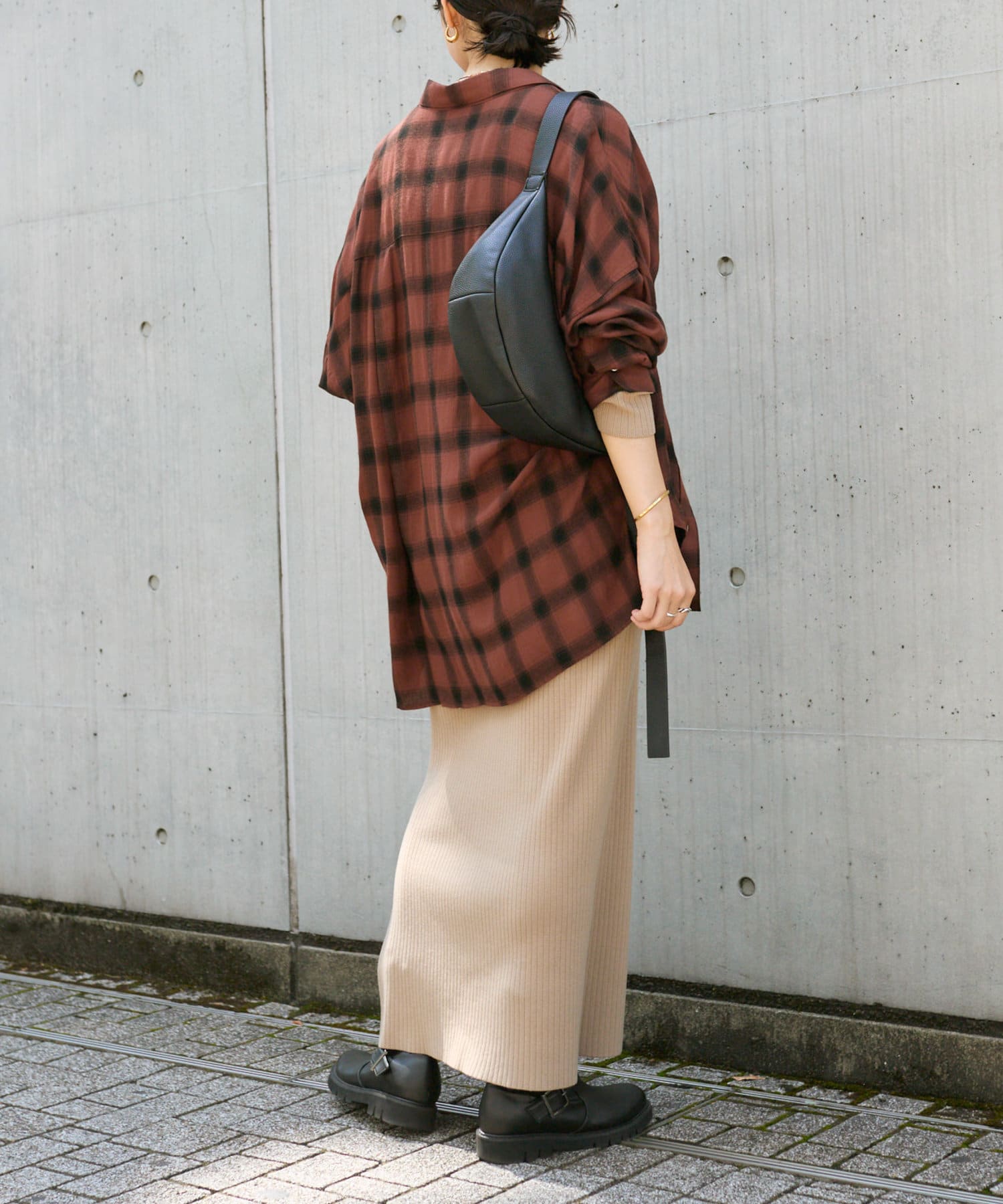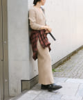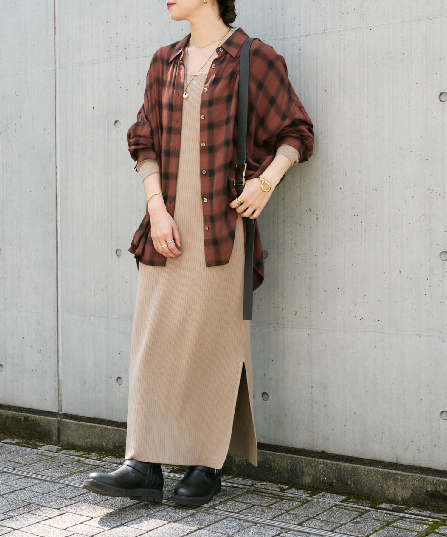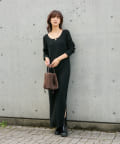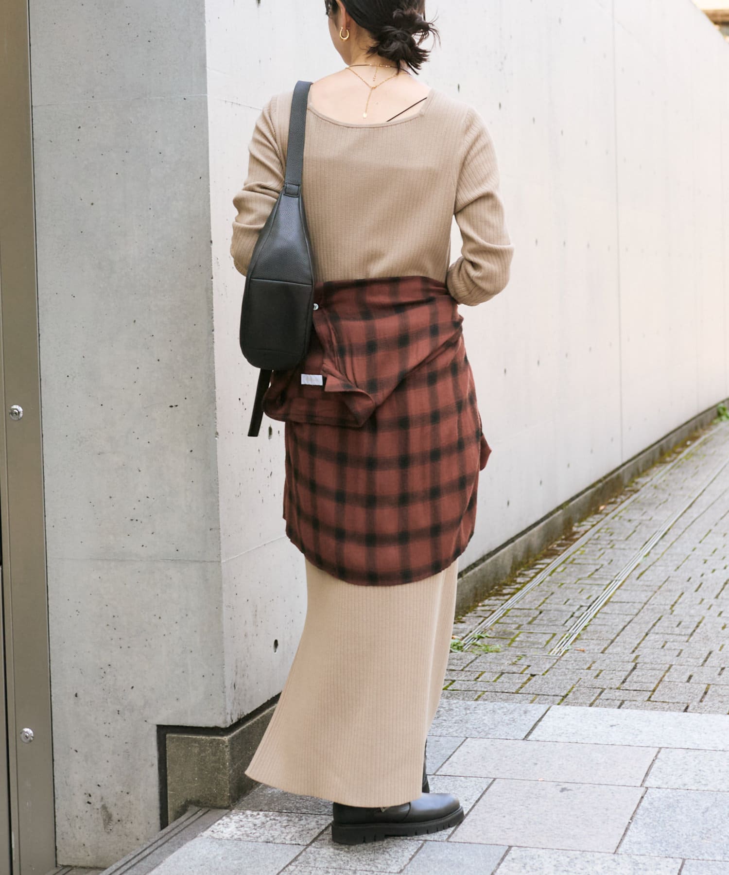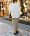 横に抜けた浅めのスクエアネックは衿開きの大きいニットとのレイヤードにも使いやすく、シャープな雰囲気を出せるのでおすすめです。