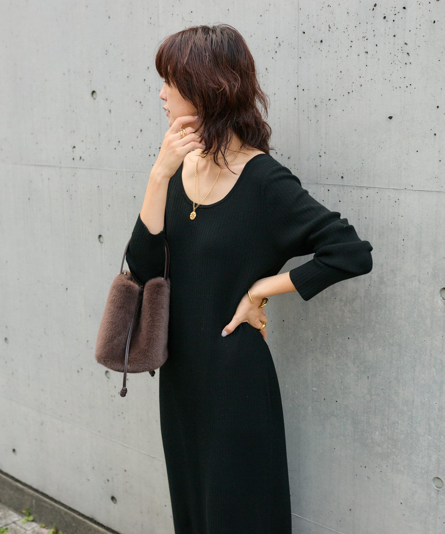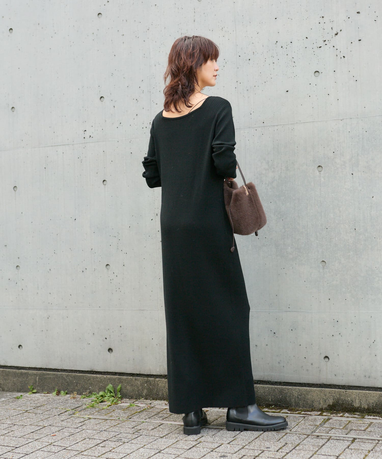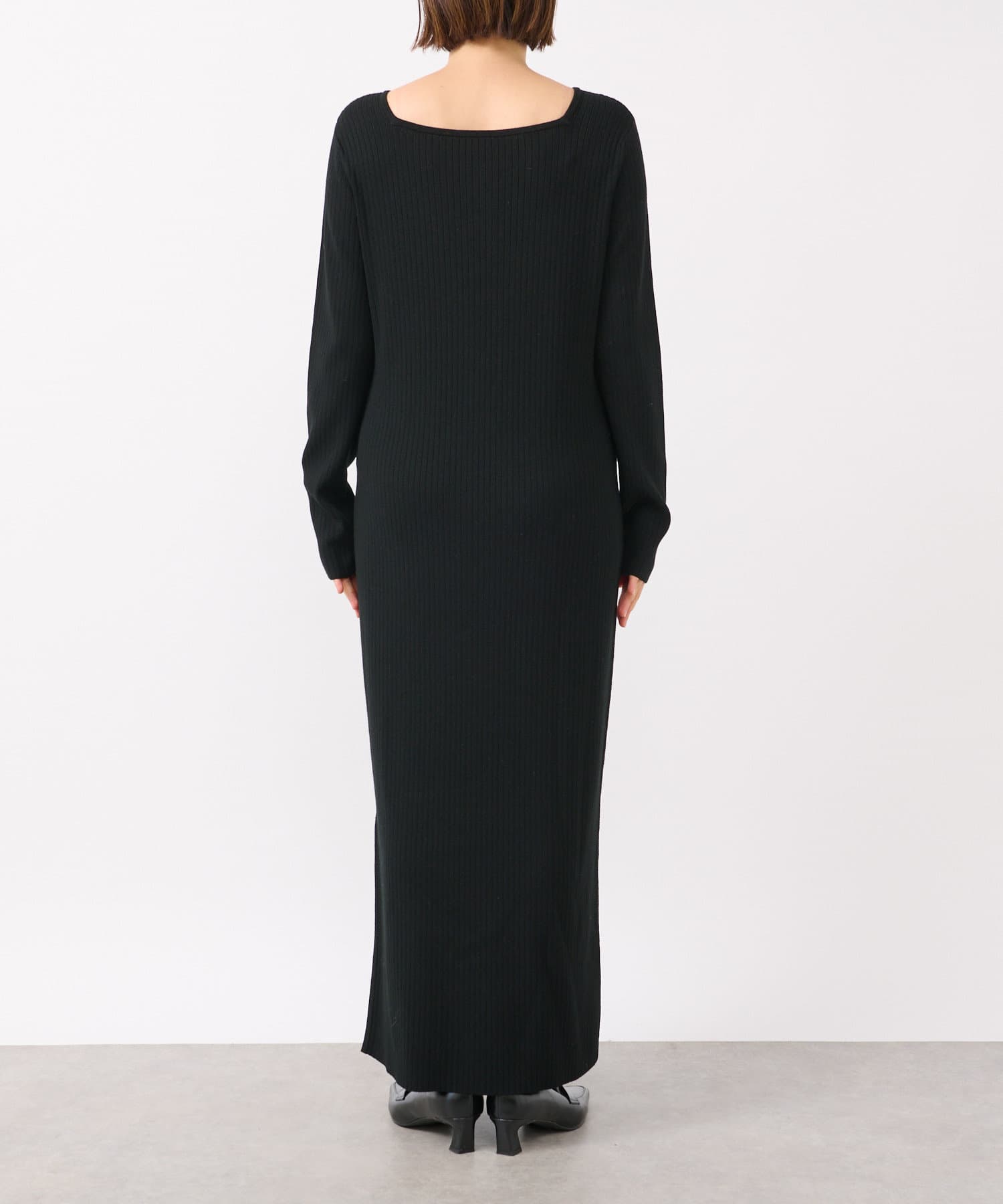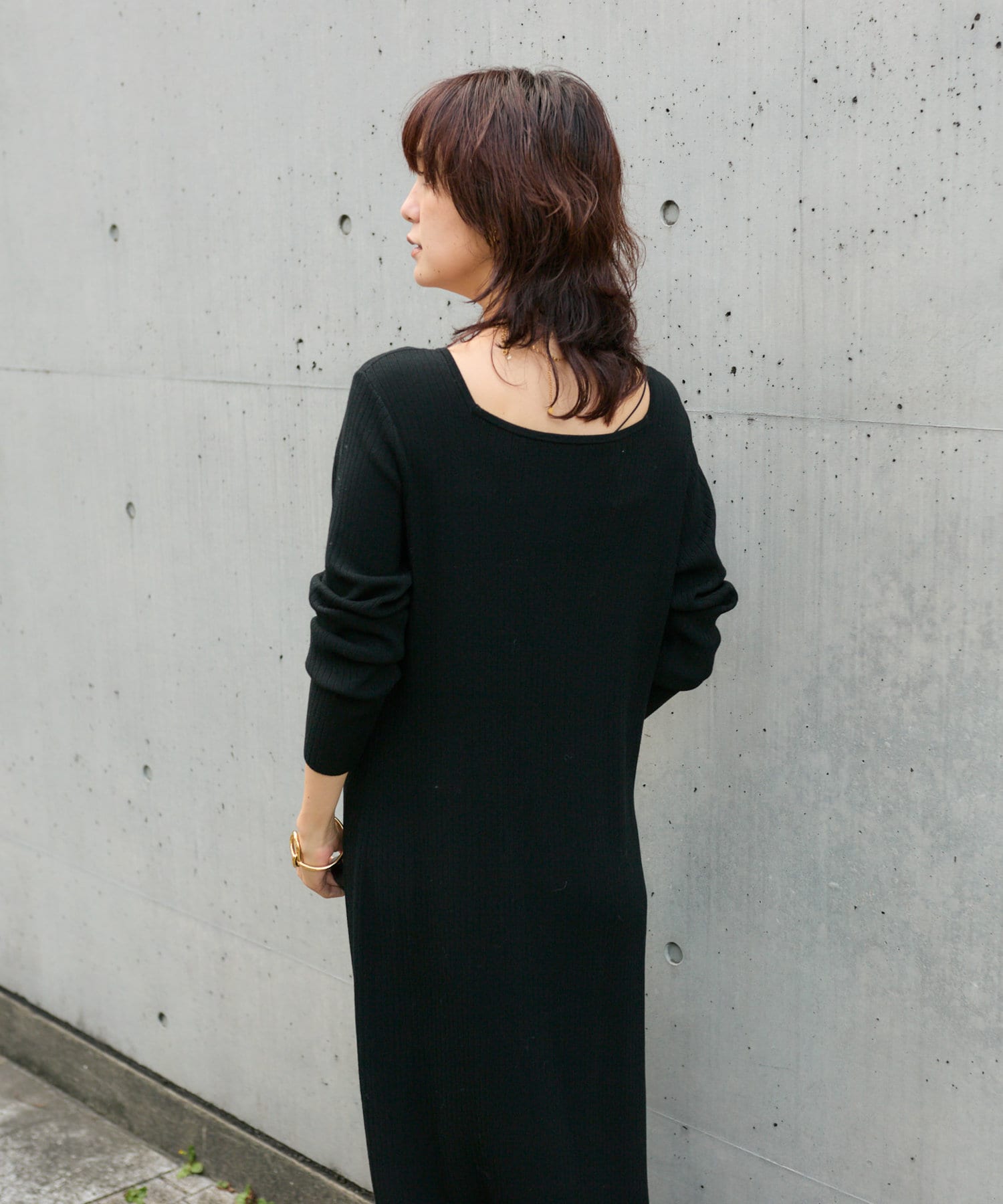 ラウンドネックとスクエアネックの前後2WAYで着用できるシンプルなリブニットワンピ。