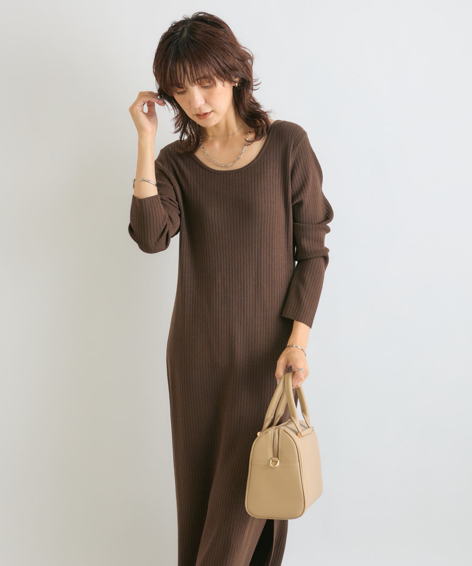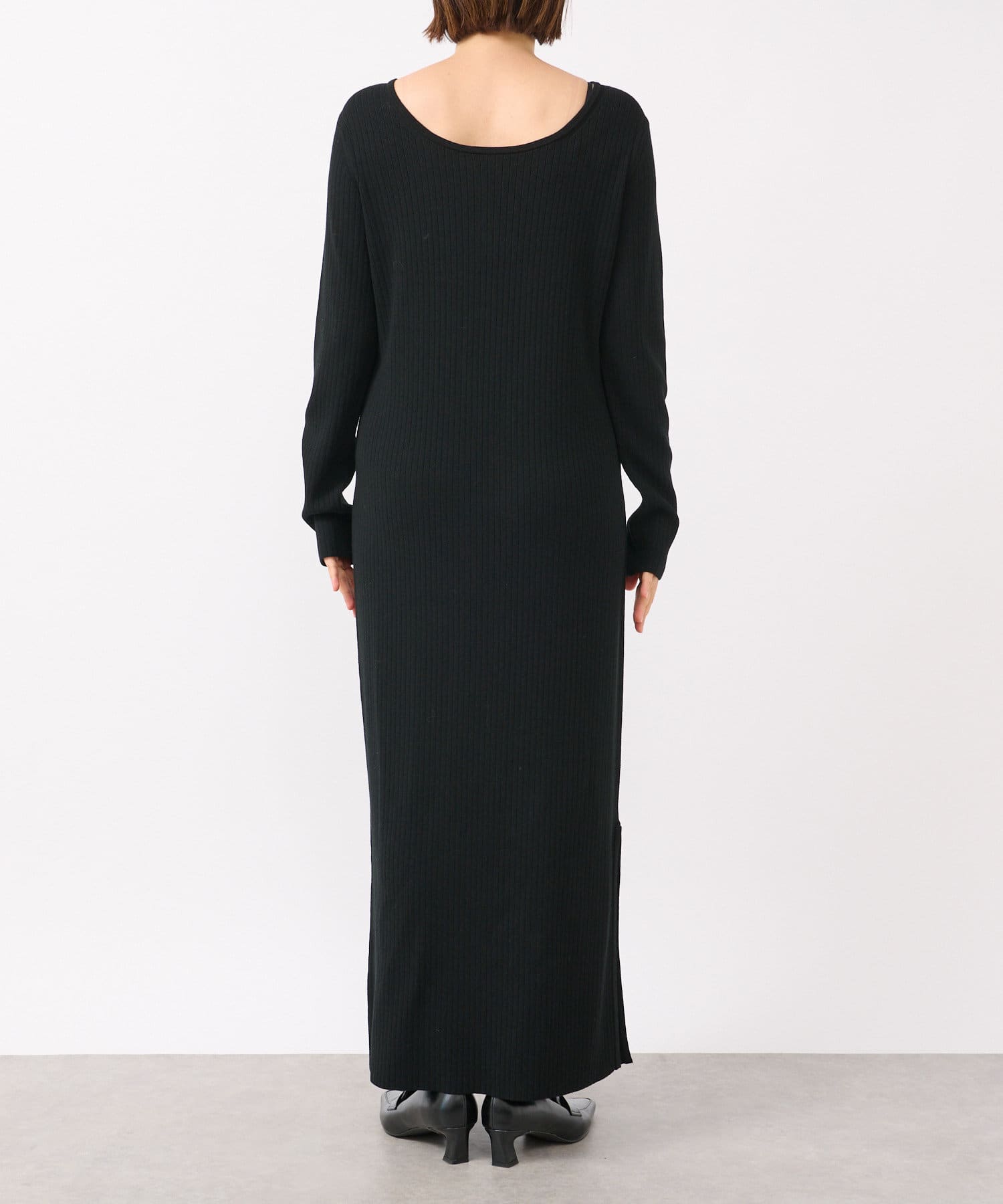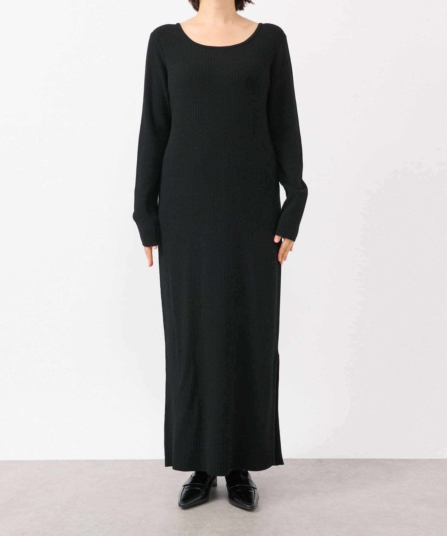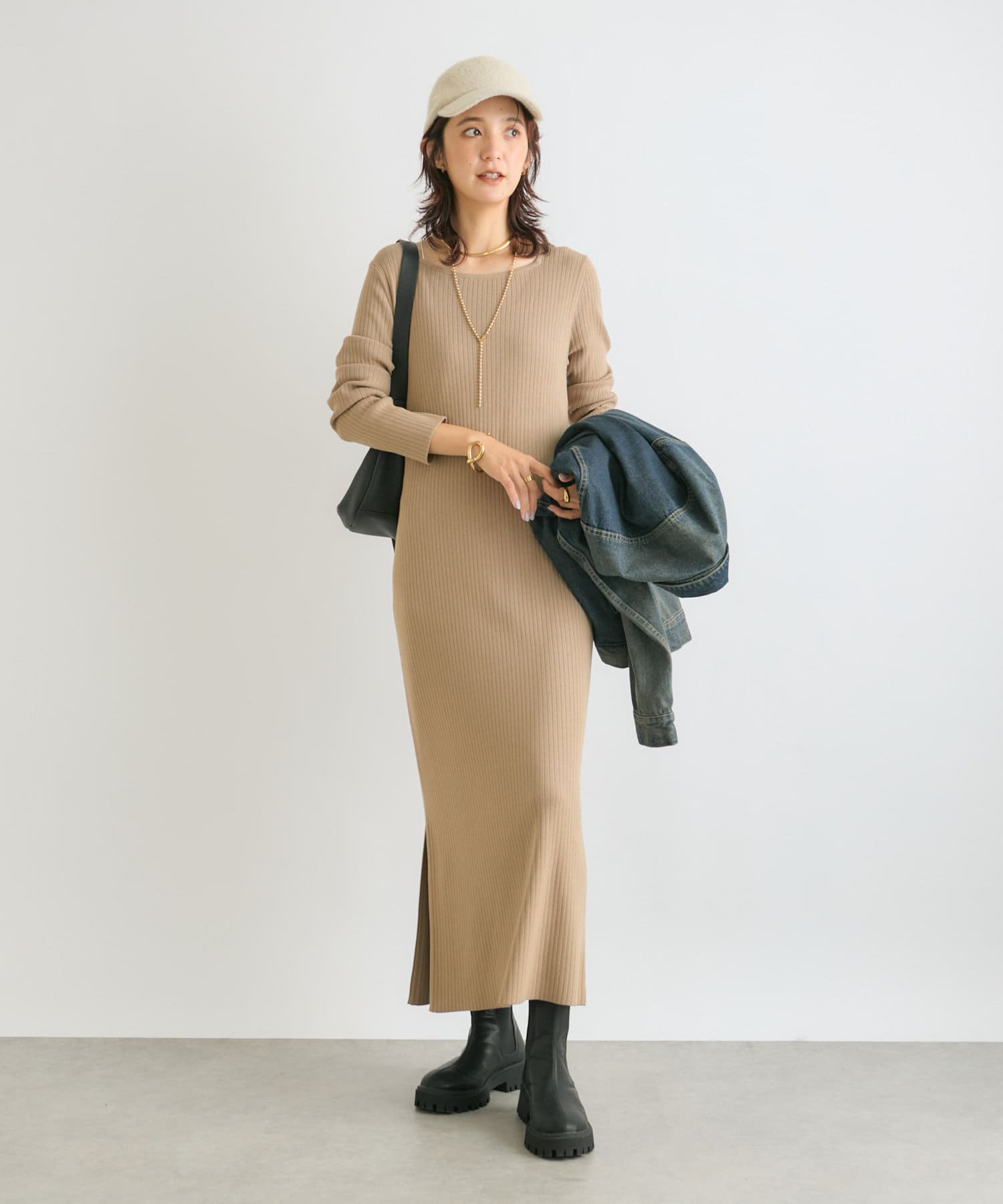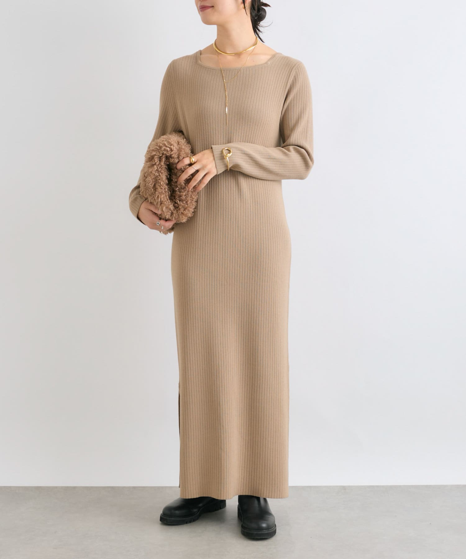 ラウンドネックとスクエアネックの前後2WAYで着用できるシンプルなリブニットワンピ。