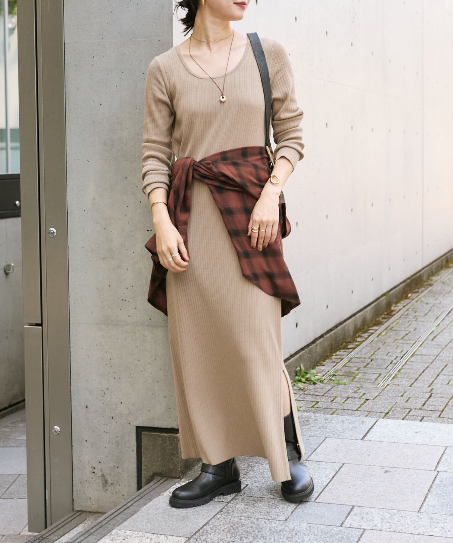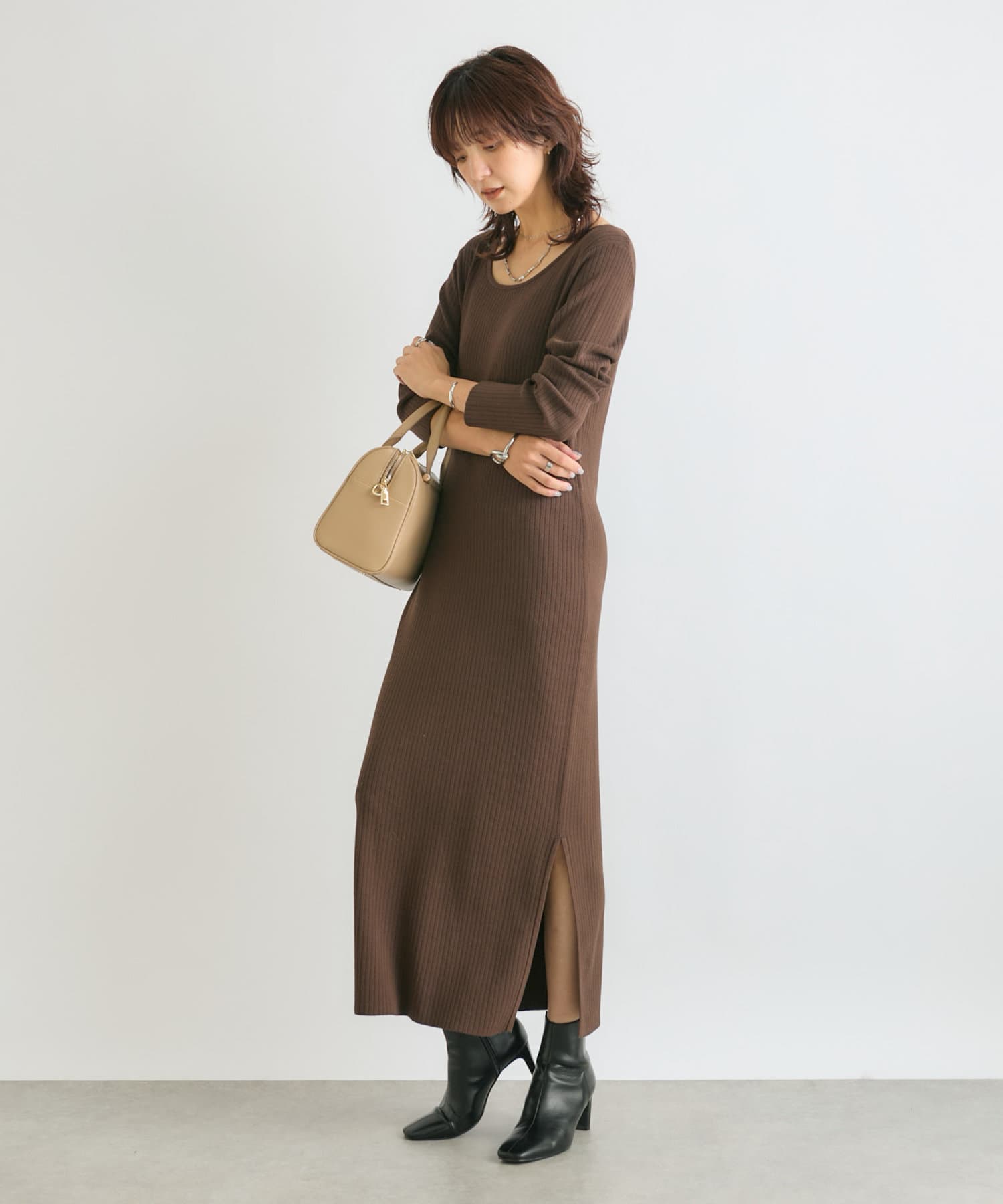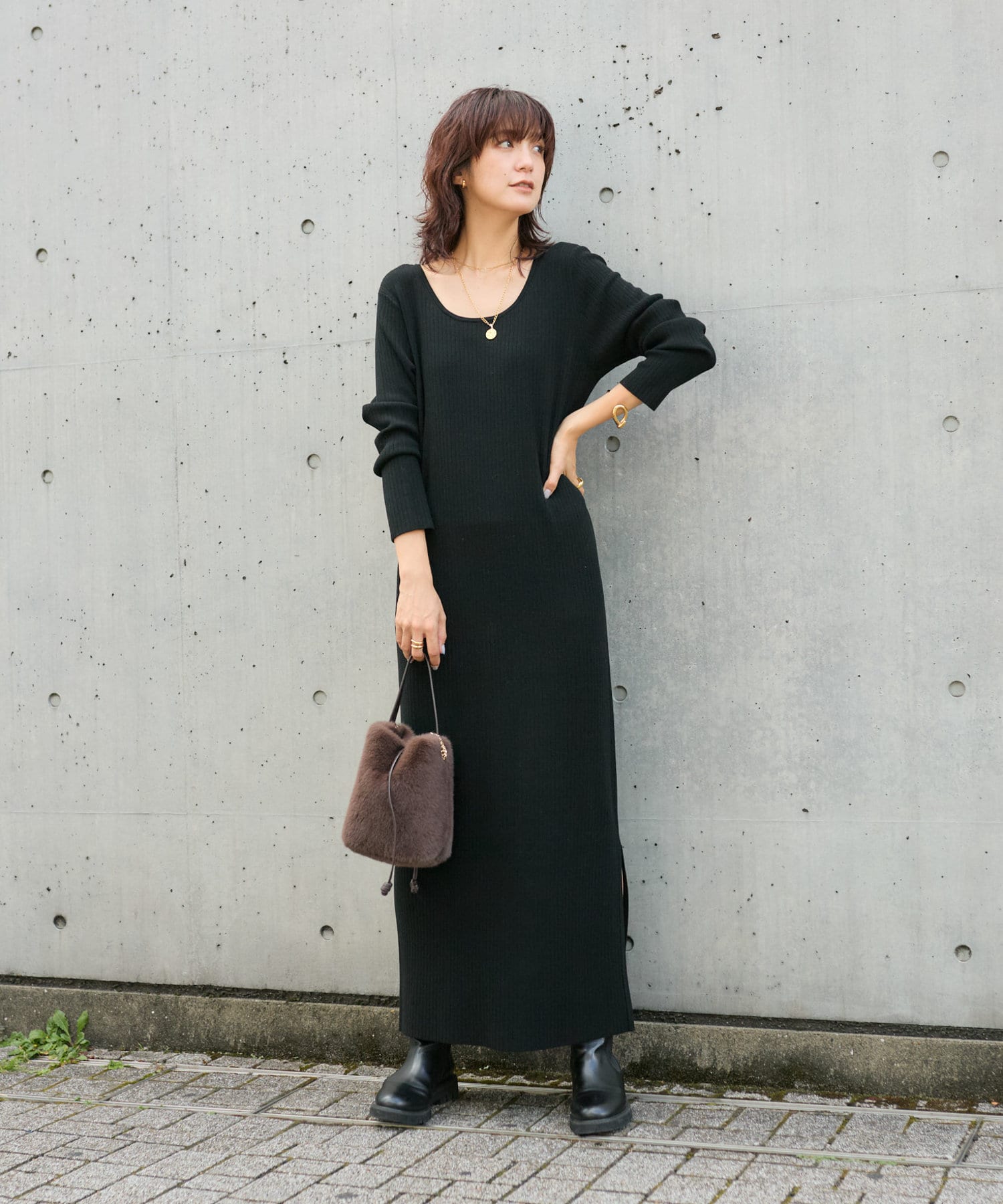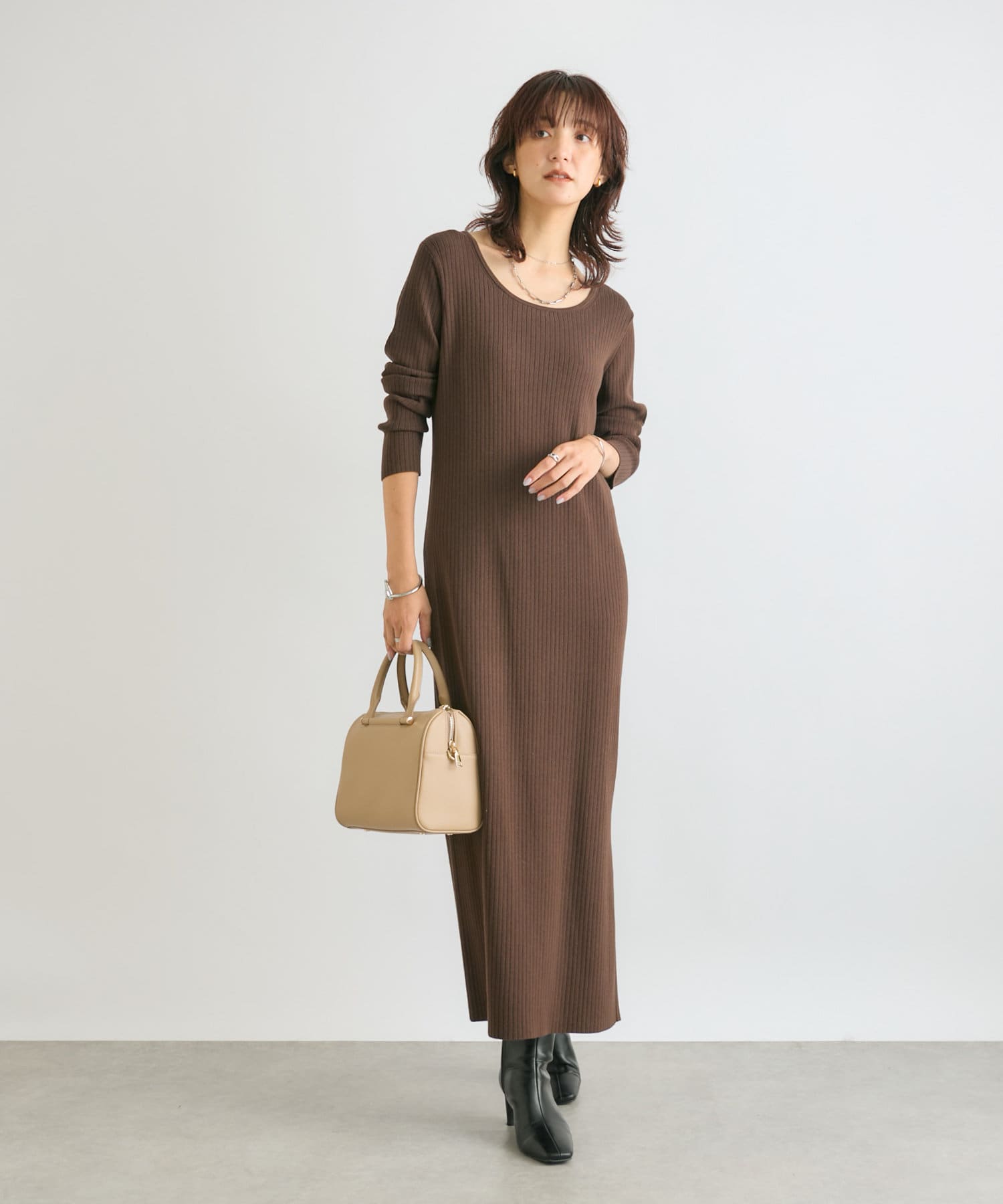ラウンドネックとスクエアネックの前後2WAYで着用できるシンプルなリブニットワンピ。