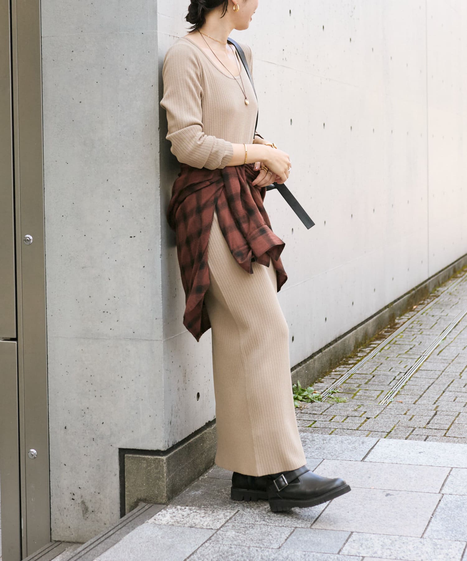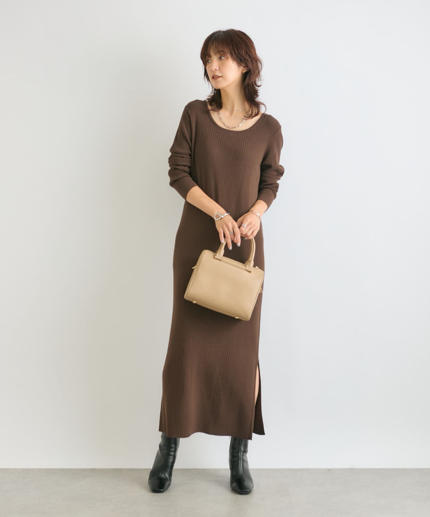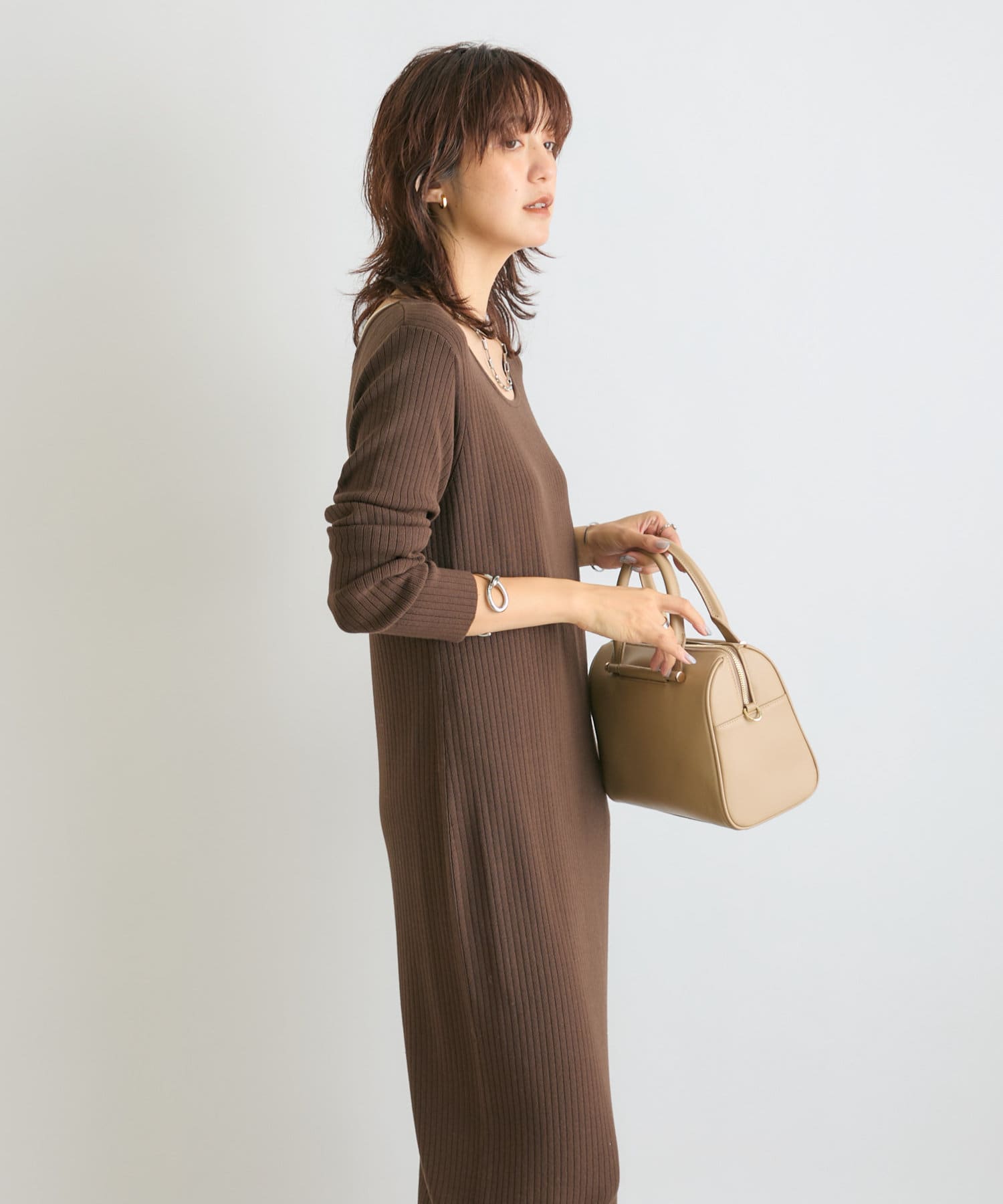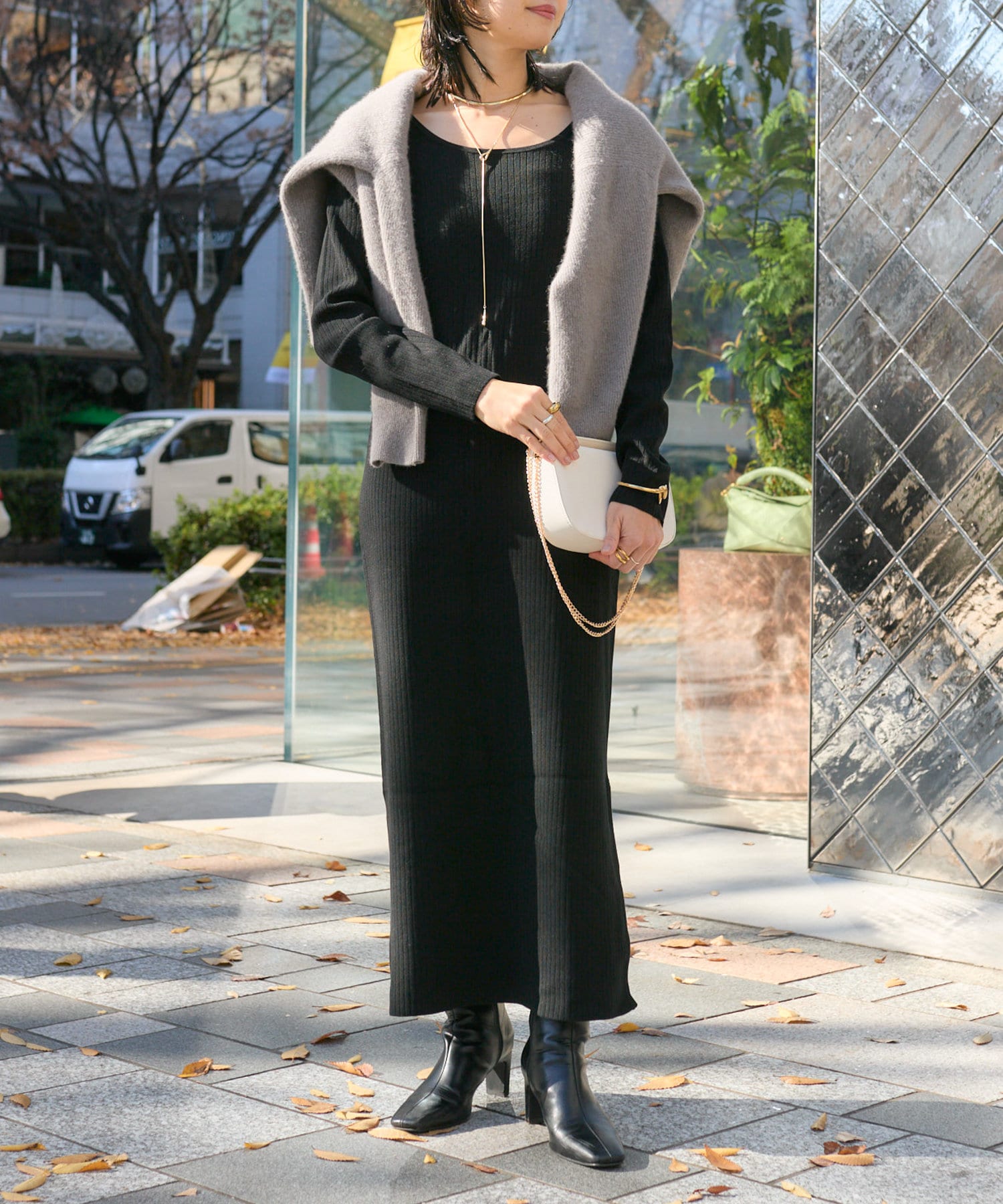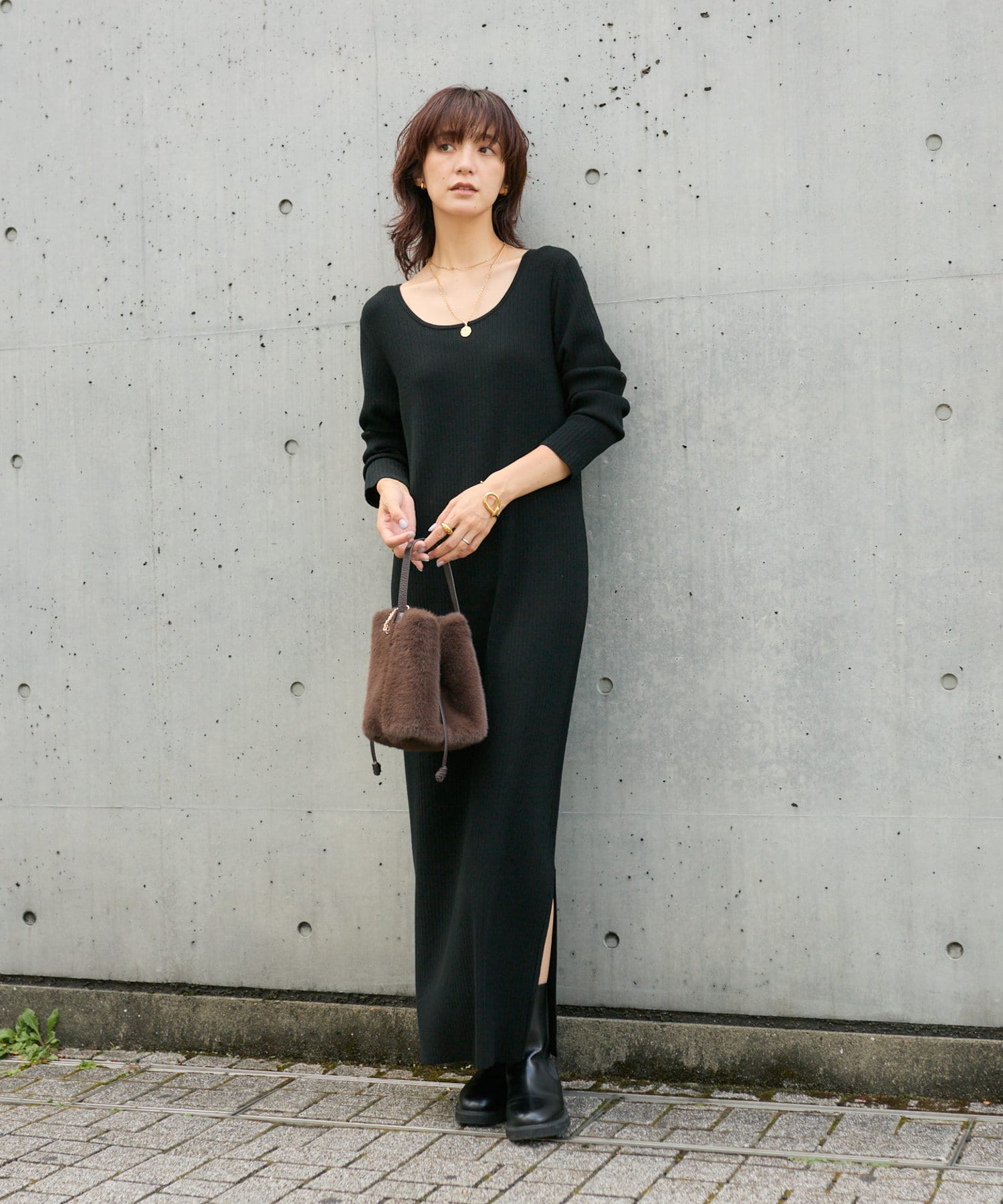 ラウンドネックとスクエアネックの前後2WAYで着用できるシンプルなリブニットワンピ。