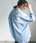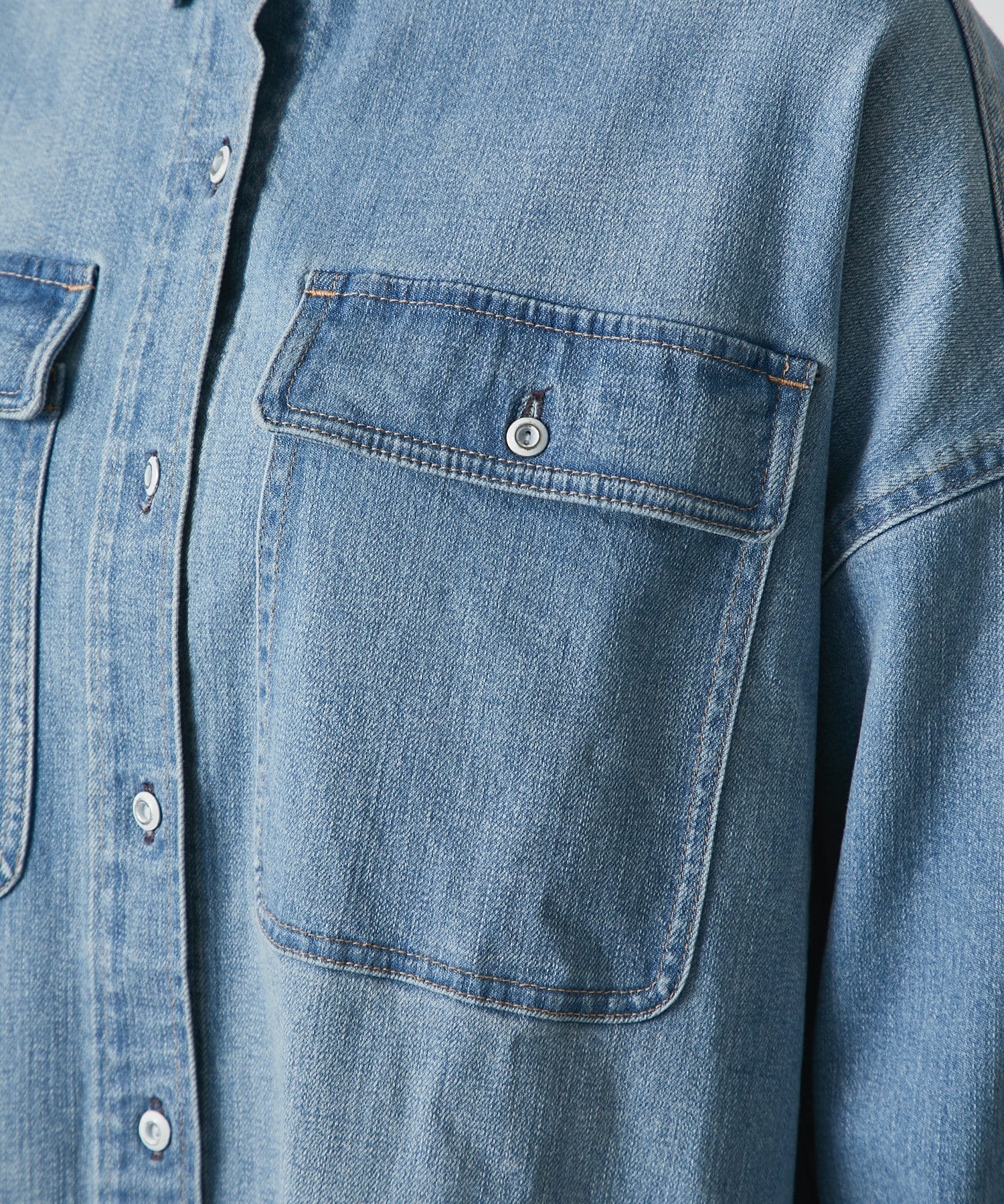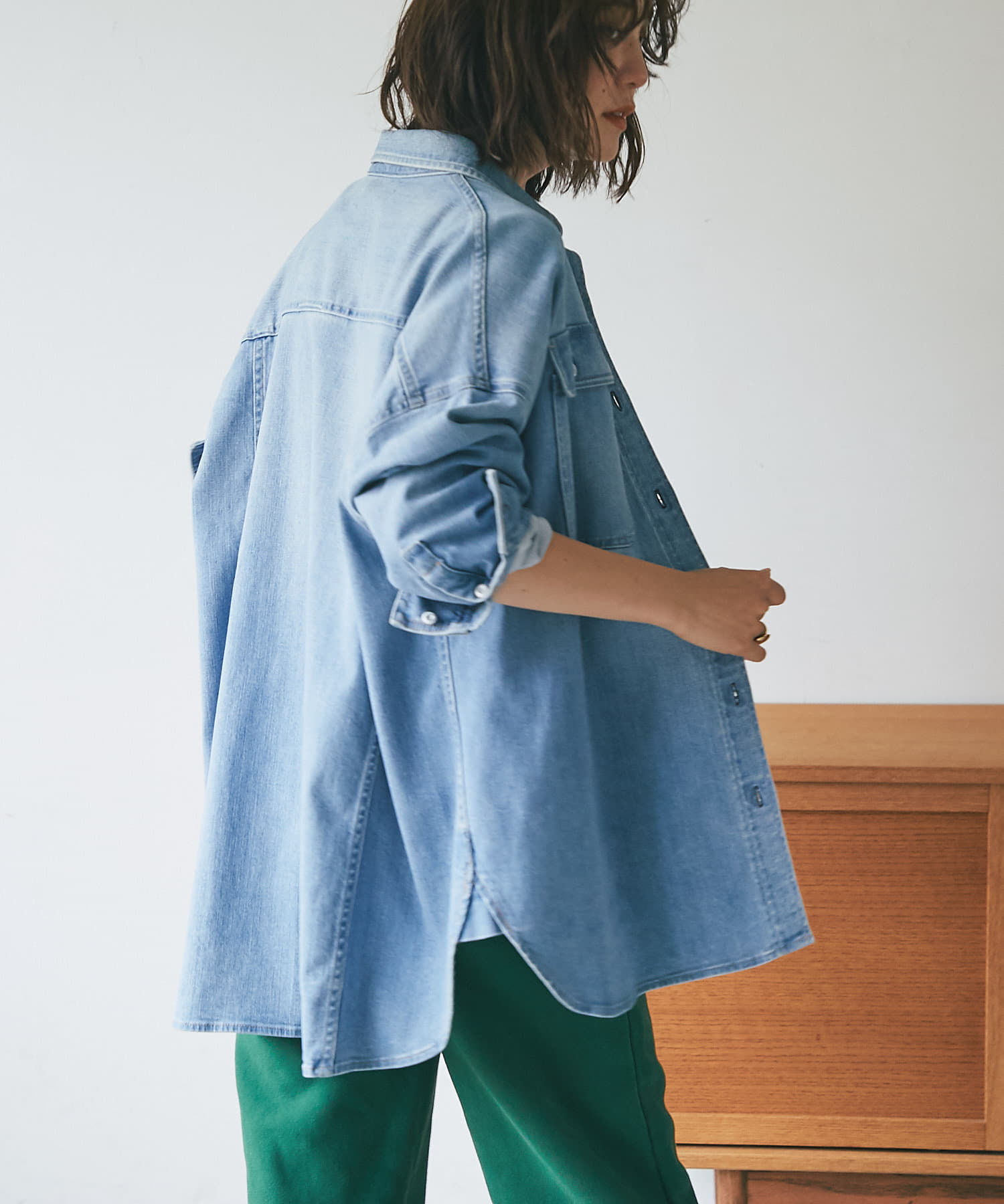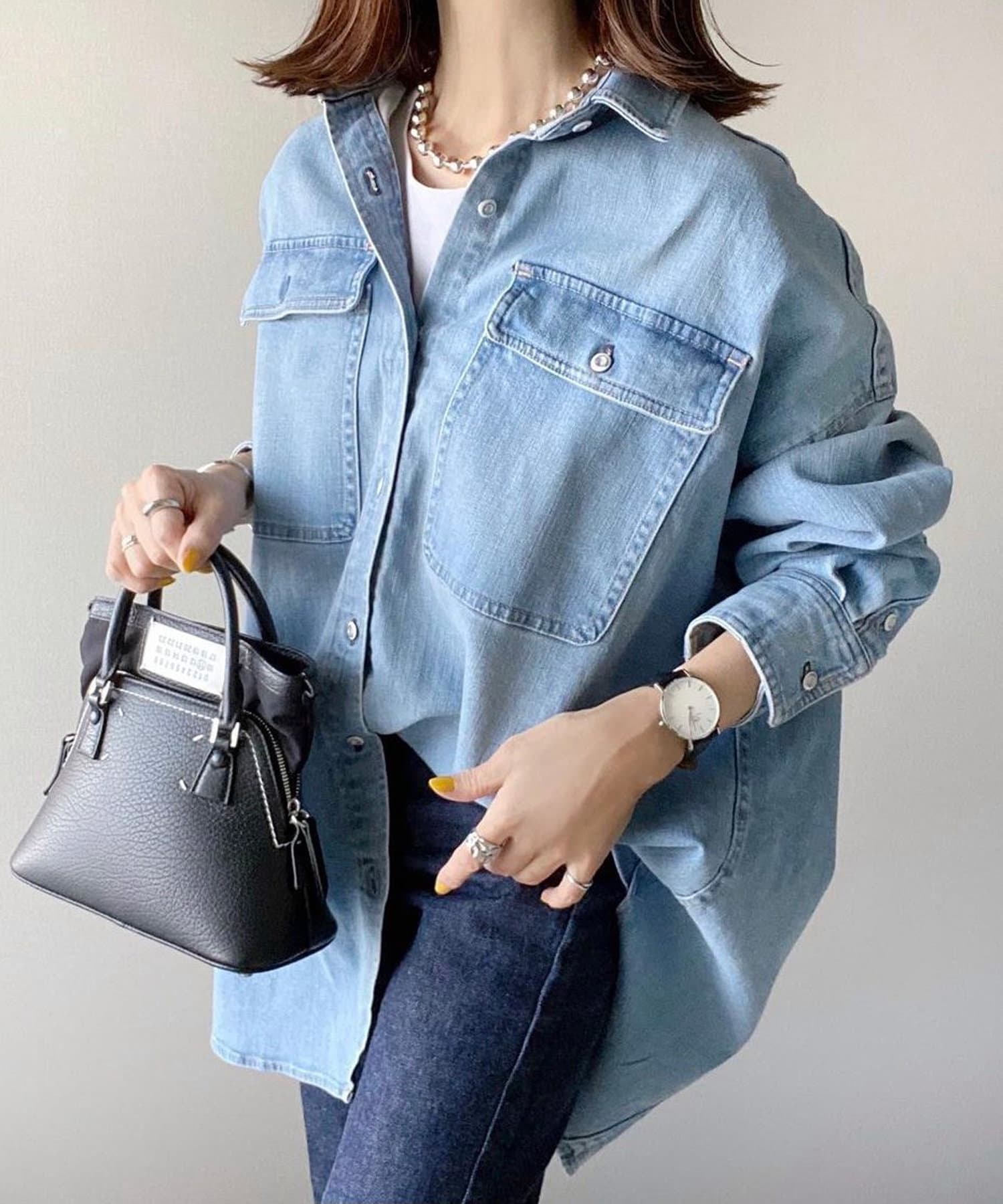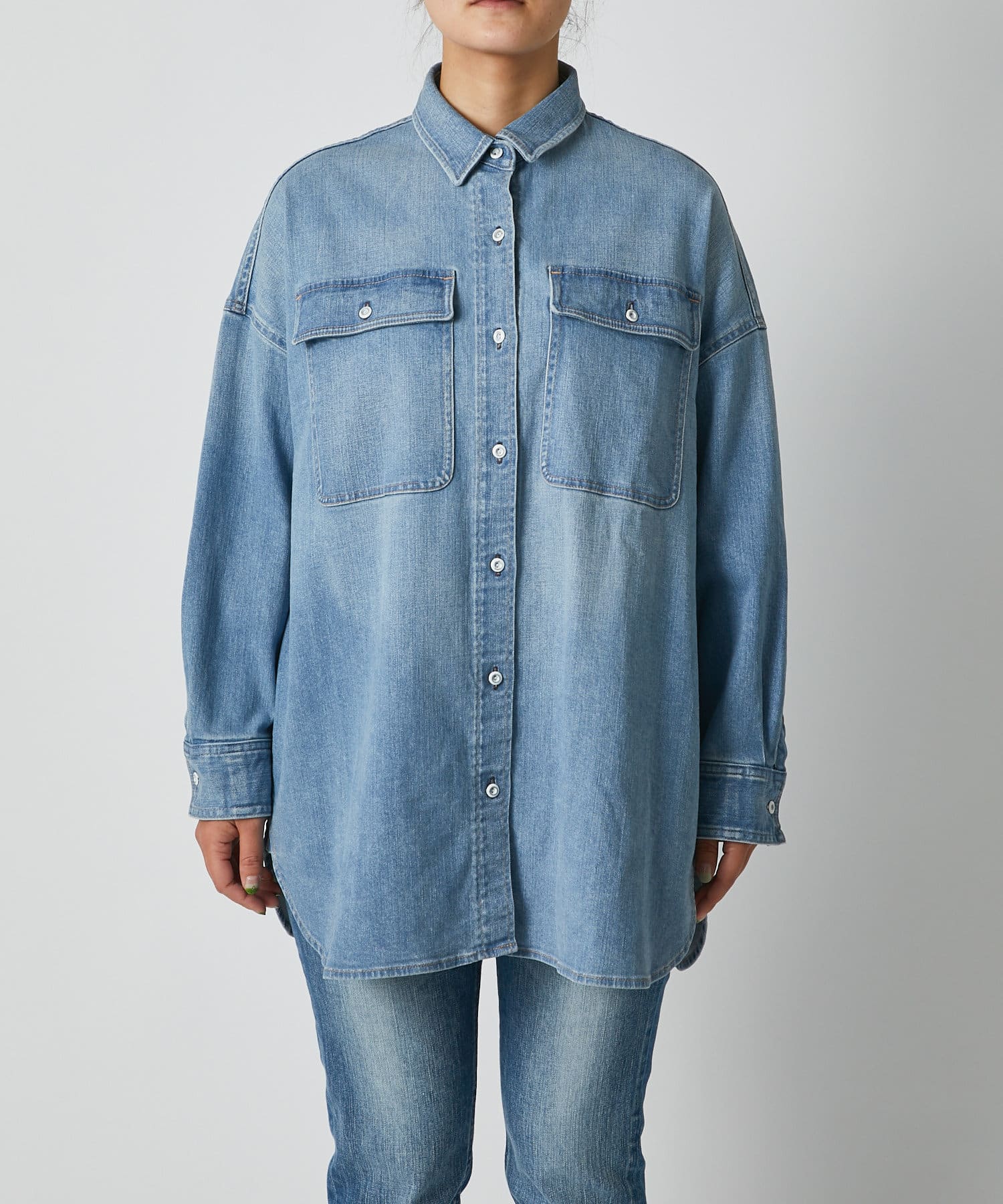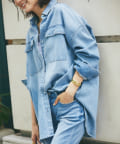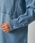 ヘルシーデニムのシャツはオーバーシルエットでゆったりと着用できます。