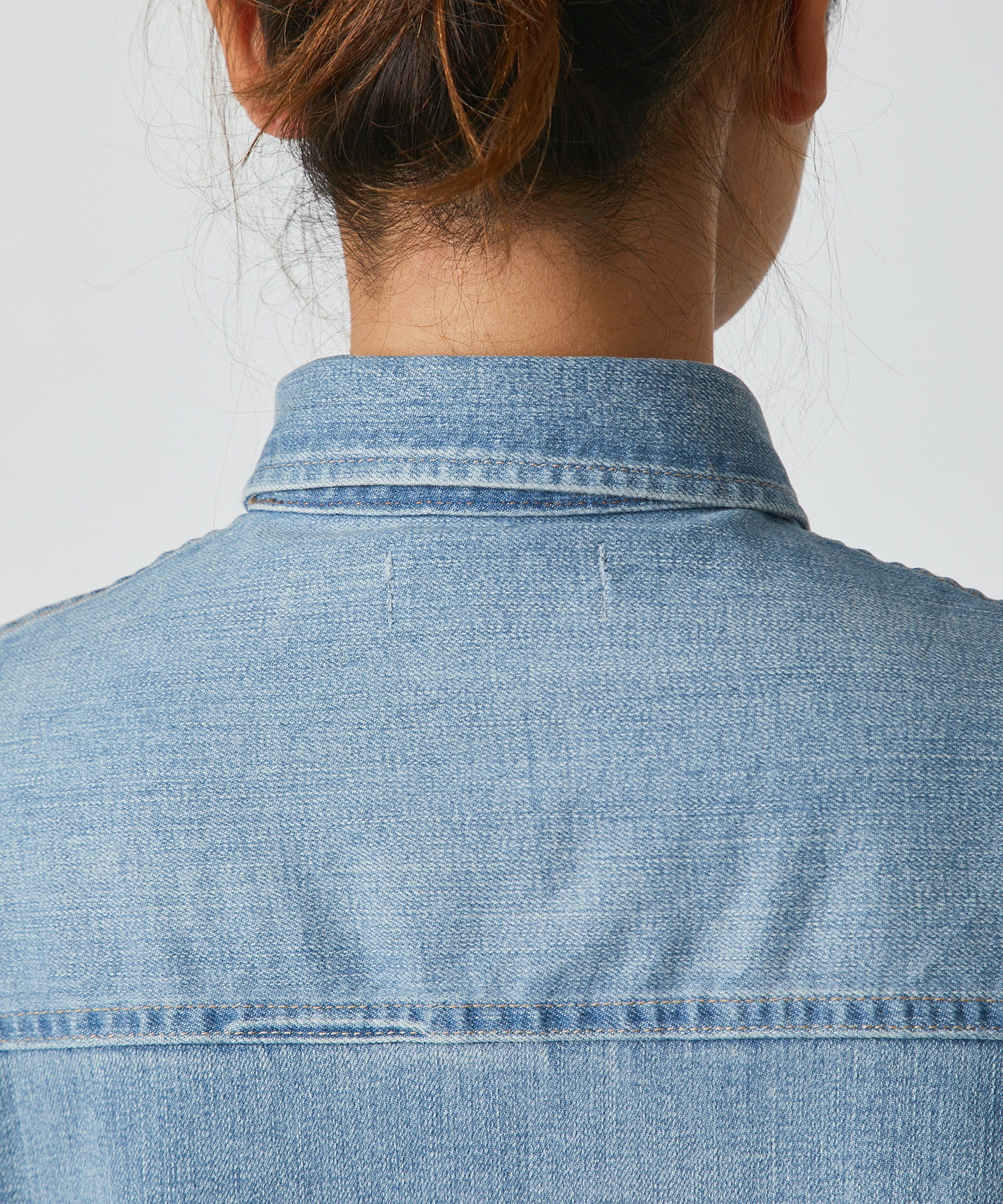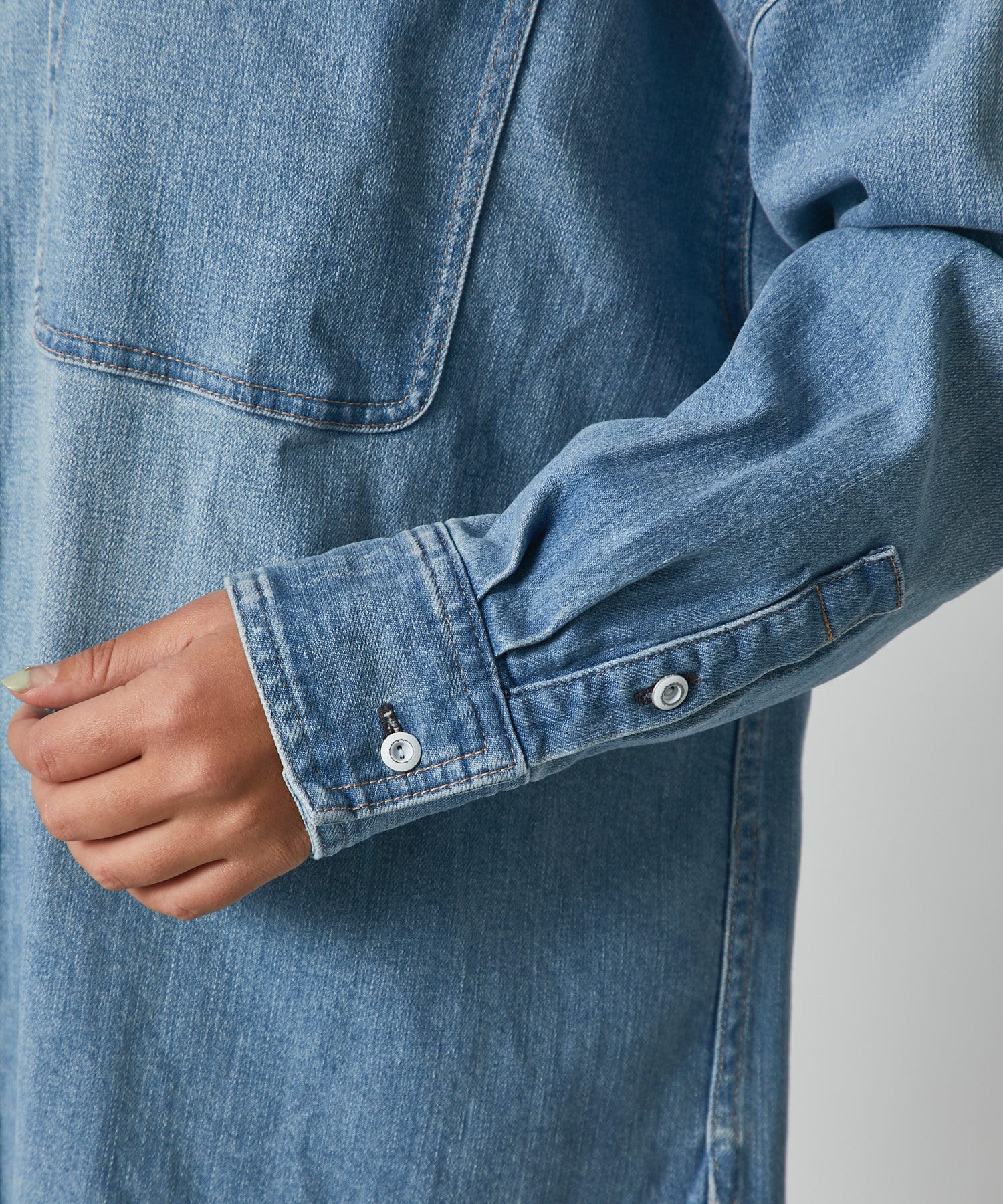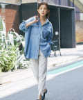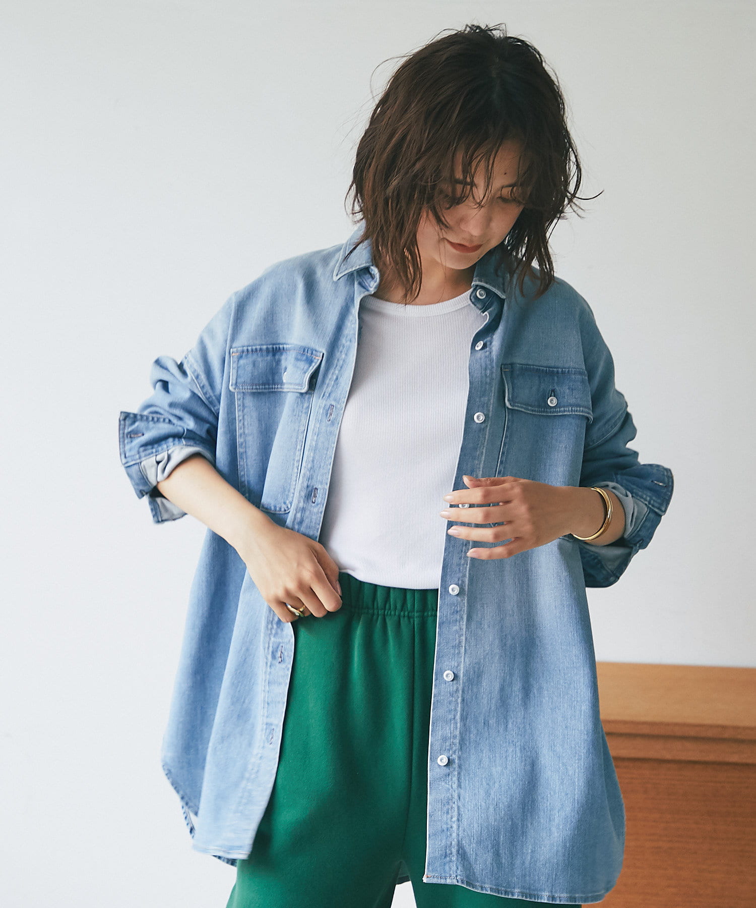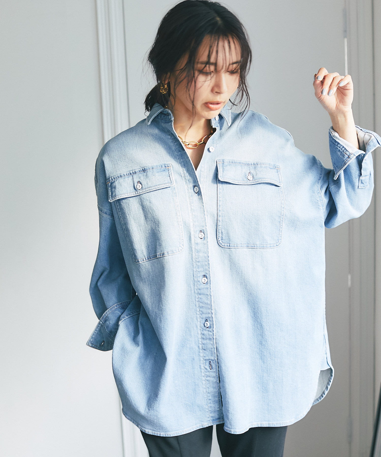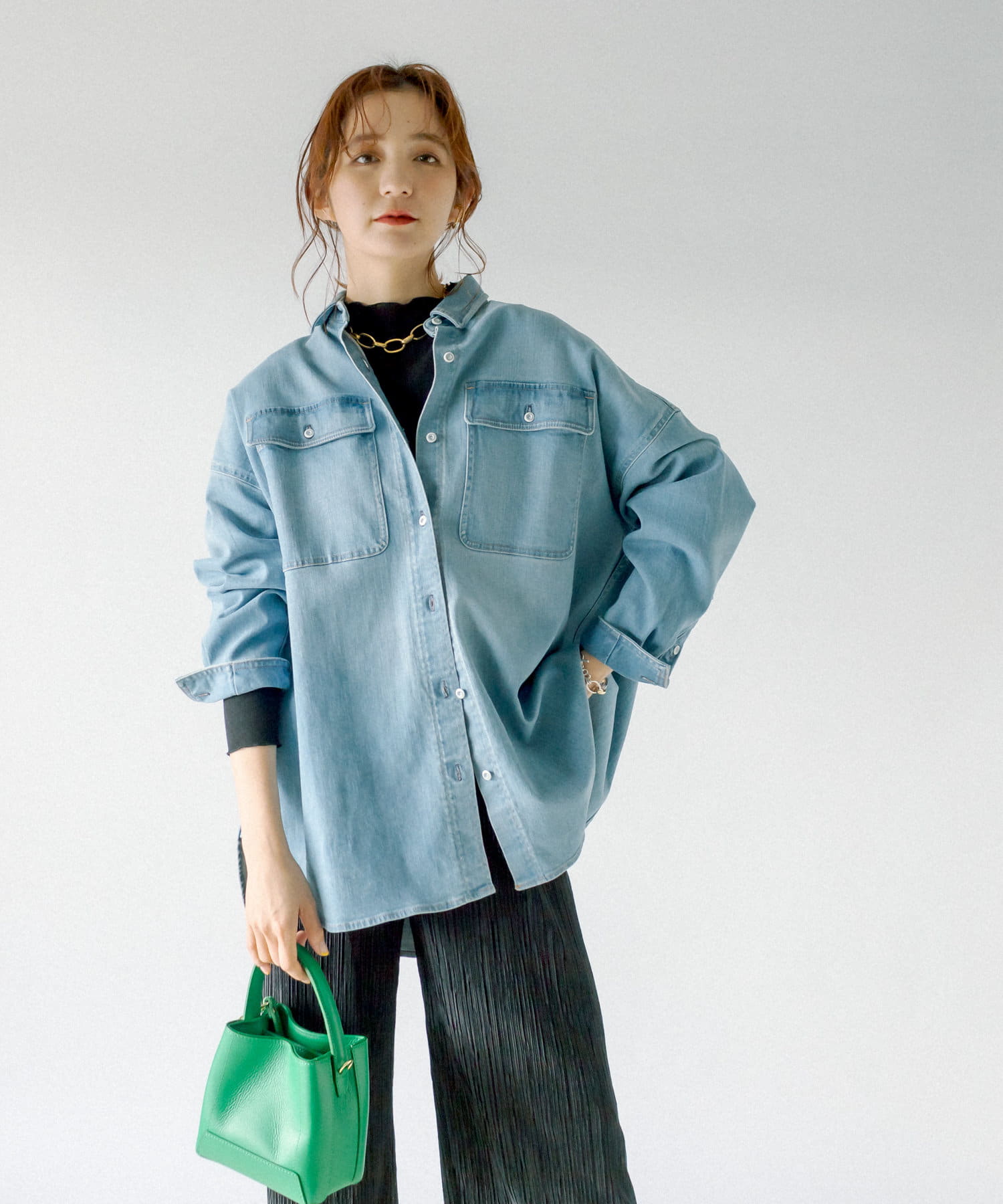 ヘルシーデニムのシャツはオーバーシルエットでゆったりと着用できます。