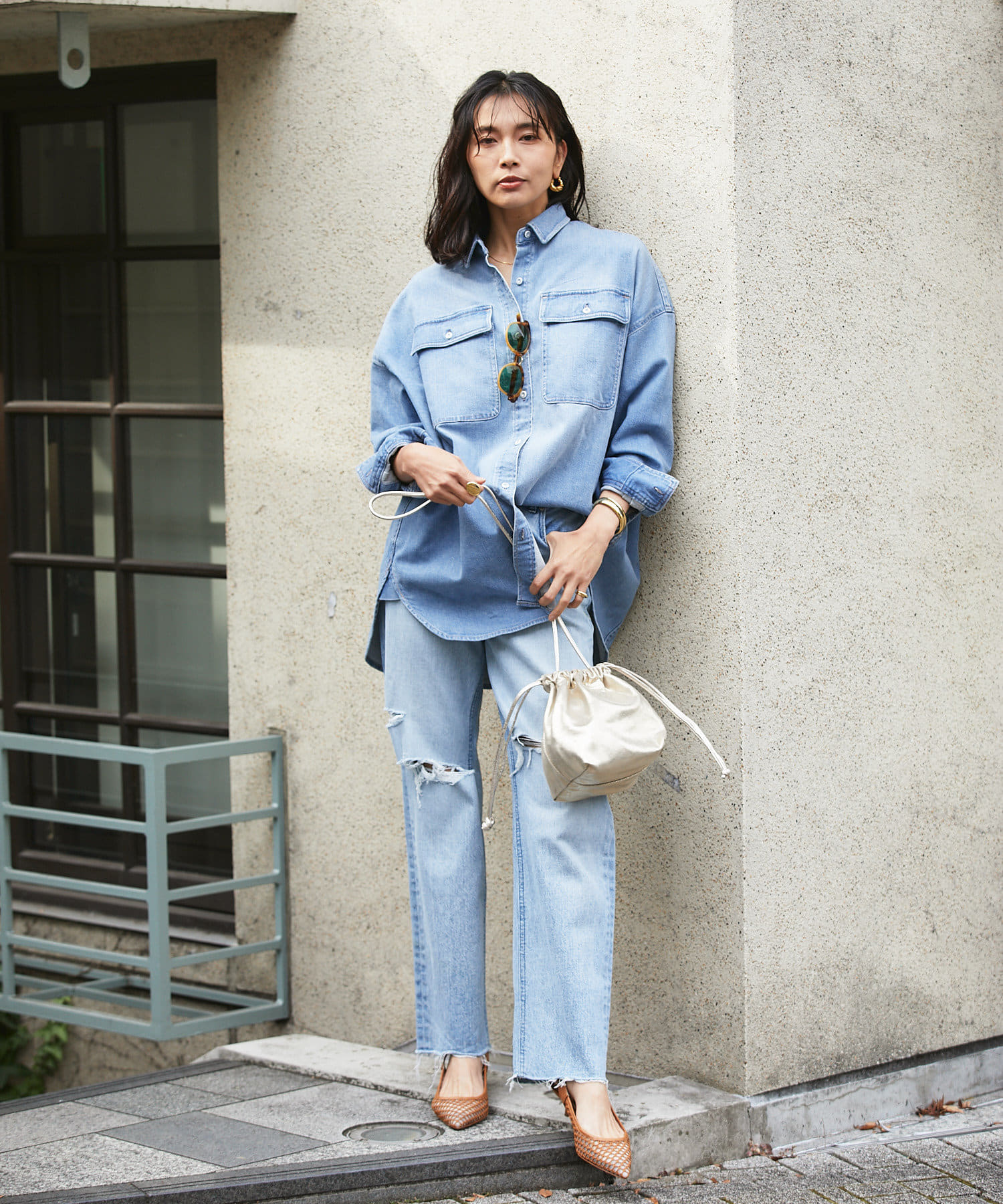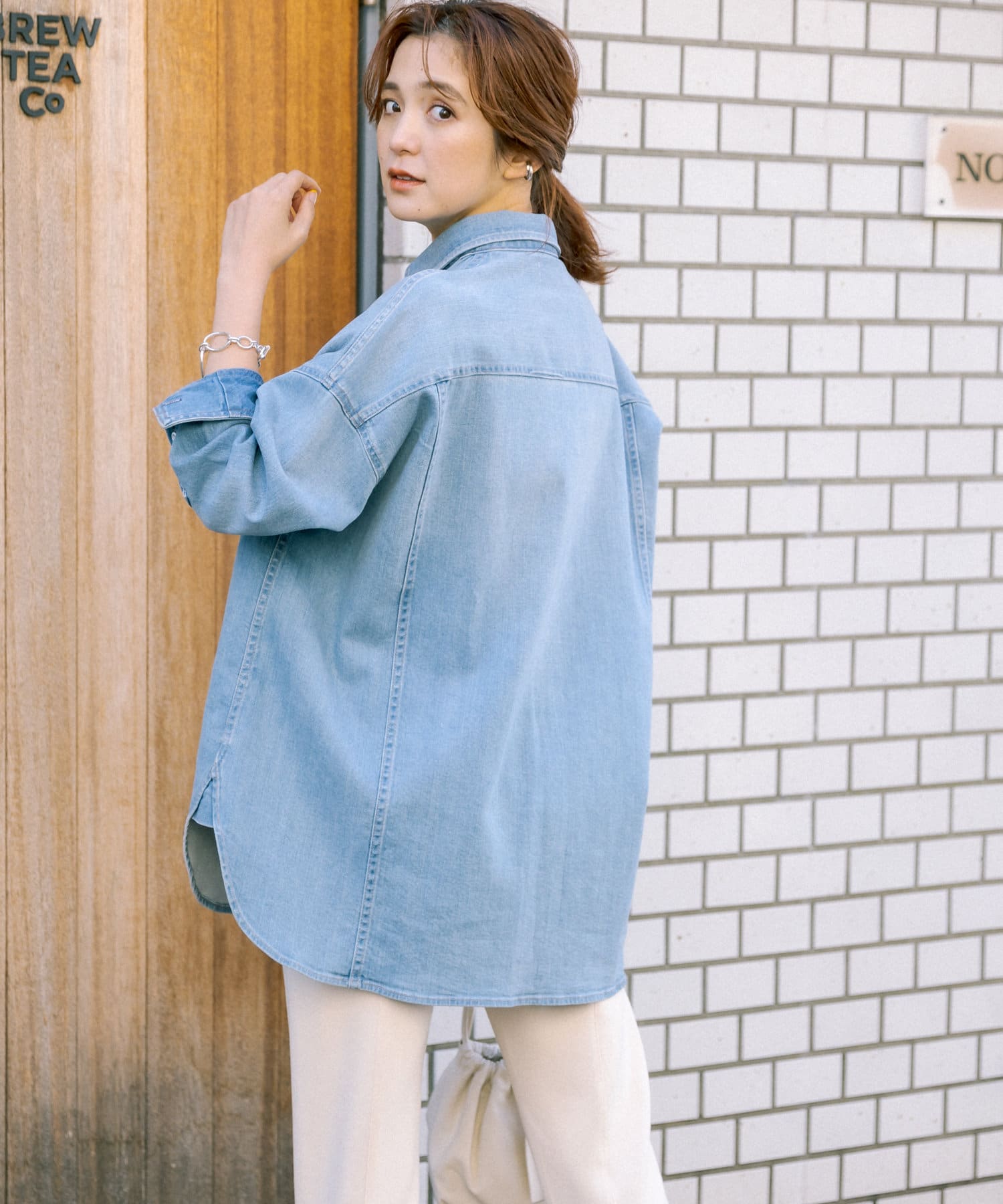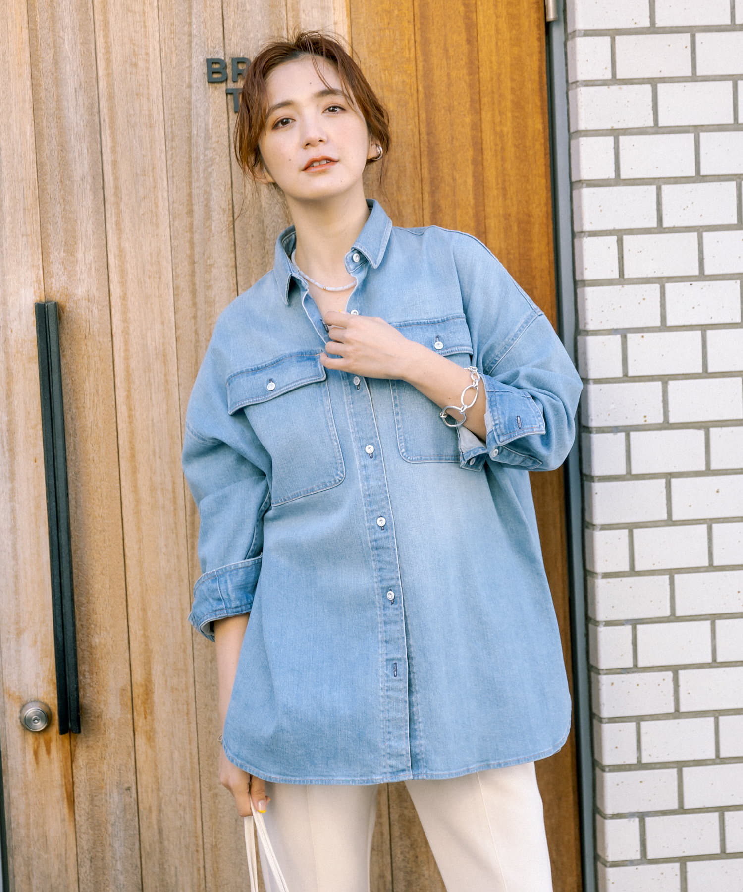 Healthy denimのシャツの中で体が泳ぐようなムードを演出するスーパービッグシャツ。