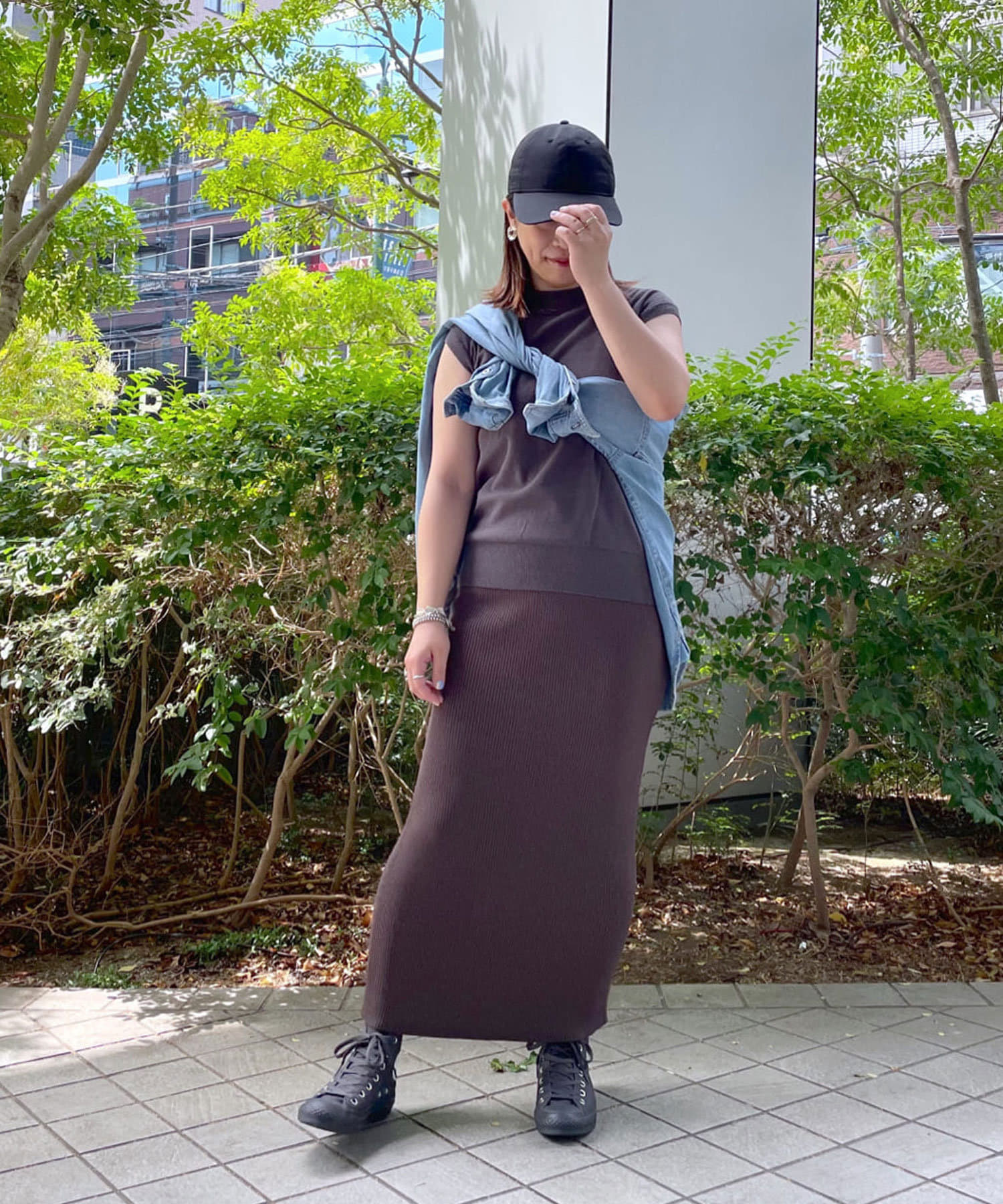 ヒップをすっぽり隠してくれる着丈です。柔らかいデニムなので着心地も抜群!