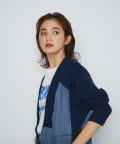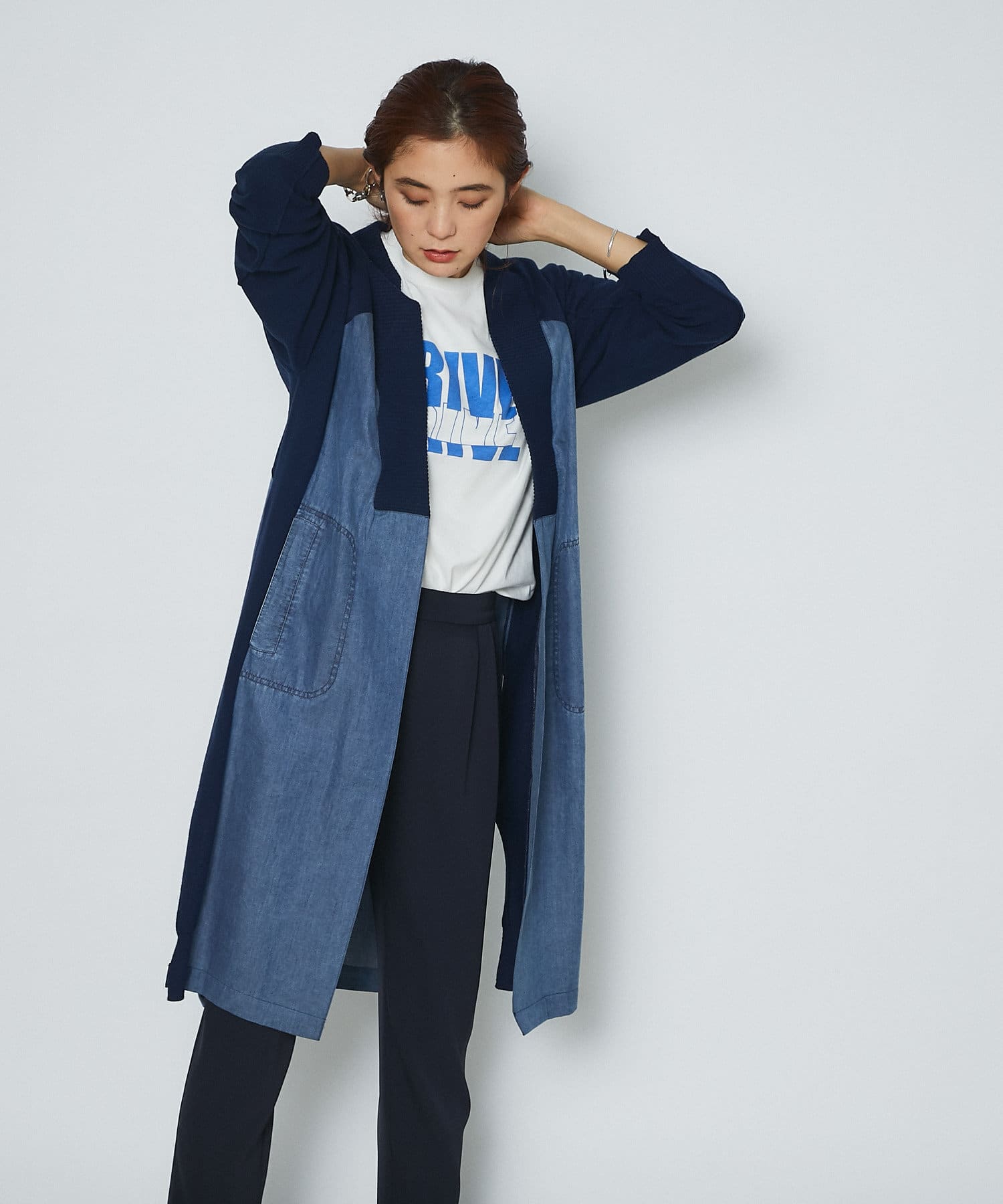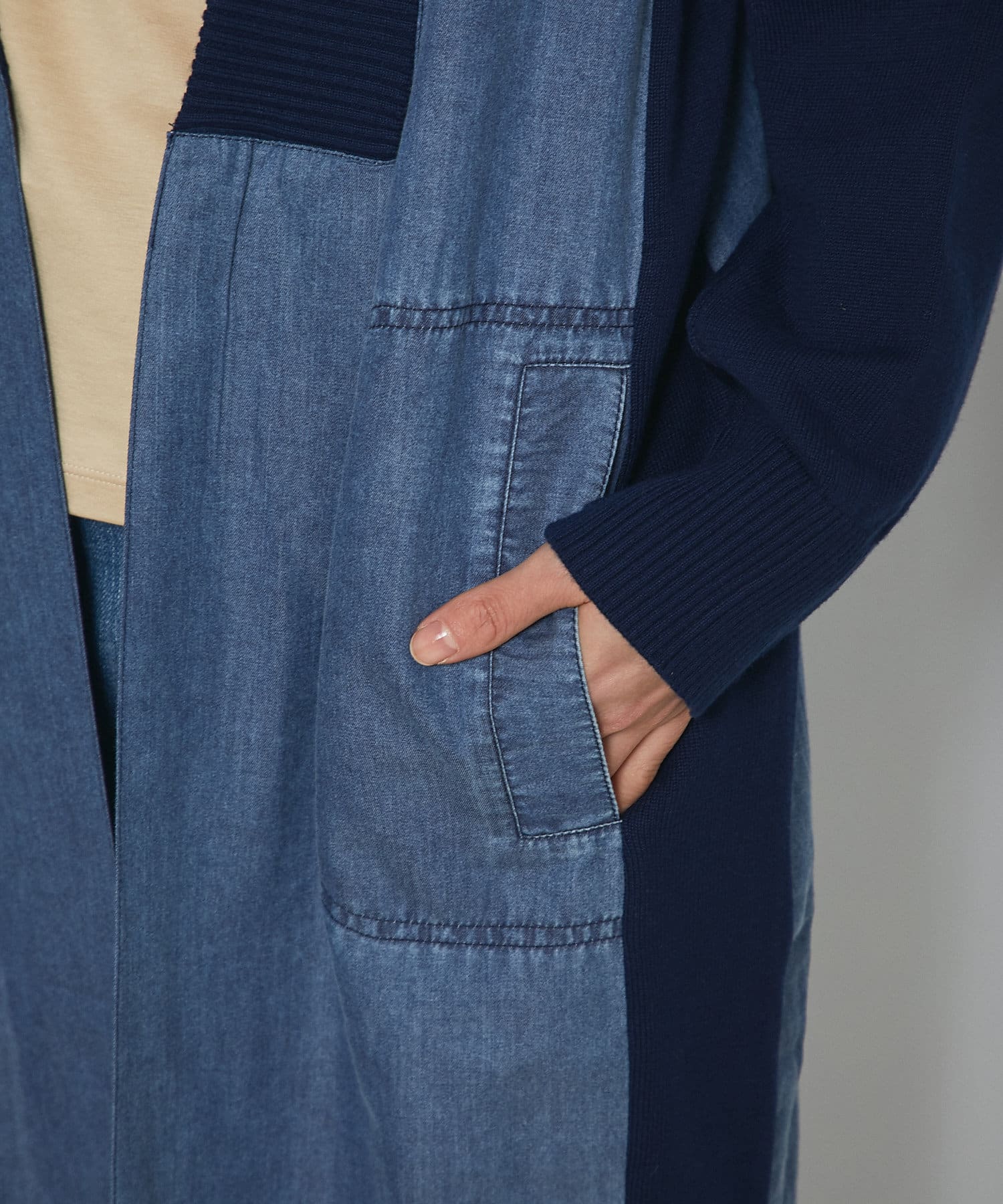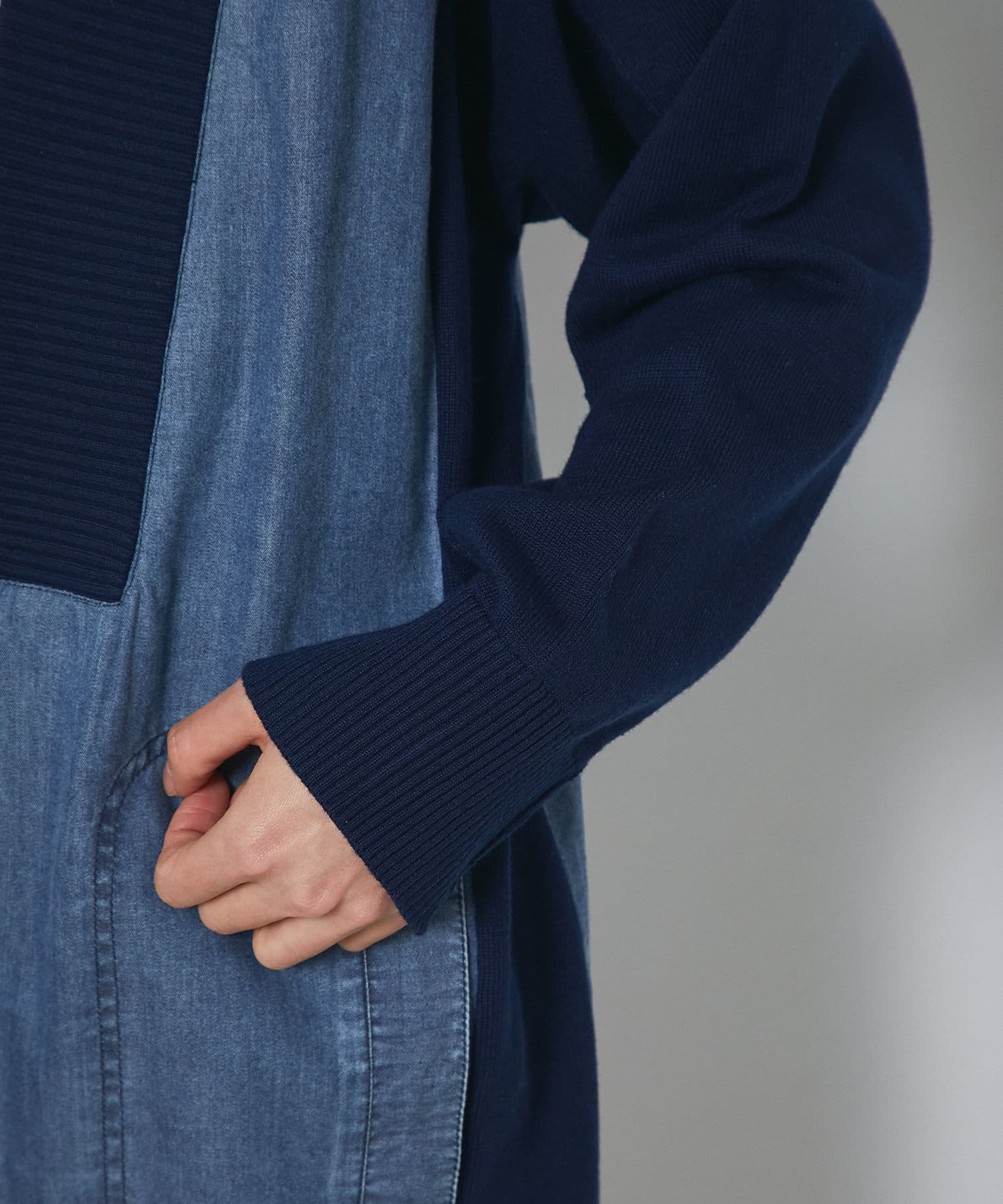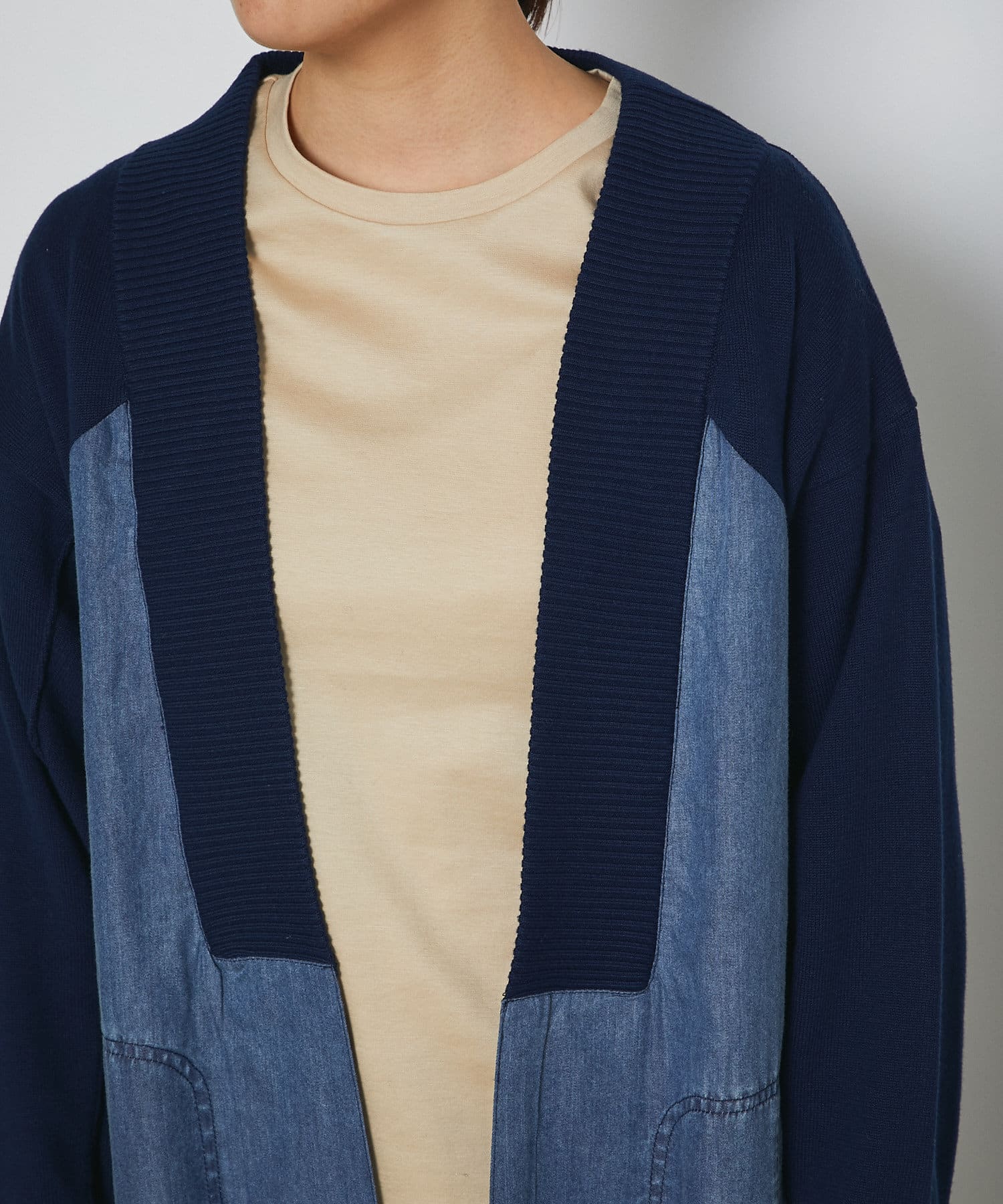 デニム×ニットのデザインカーディガン。素材切替ですが、一体感のある柔らかな着心地です。