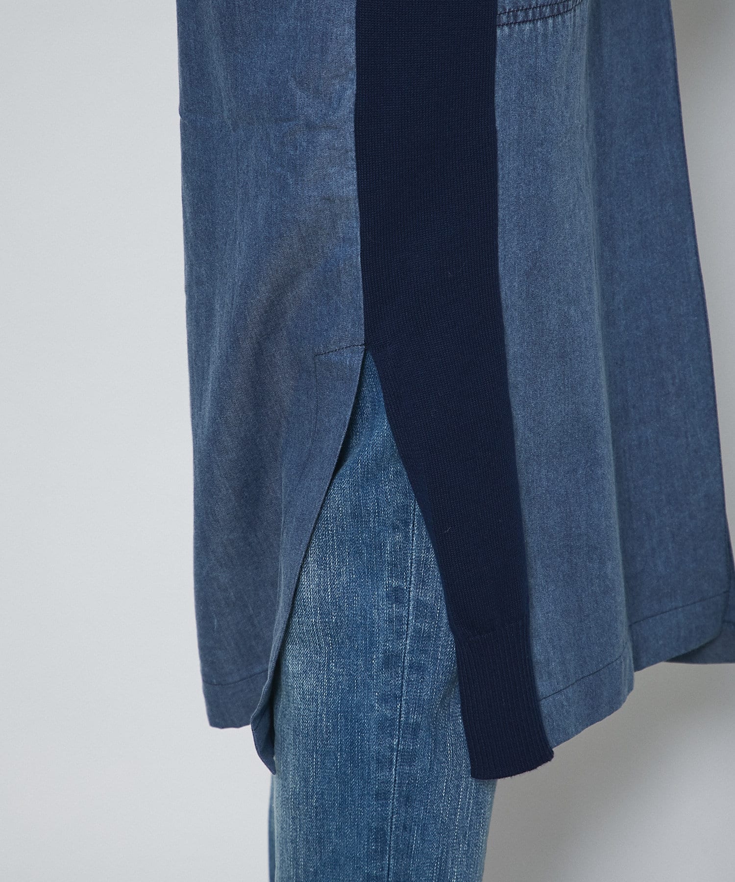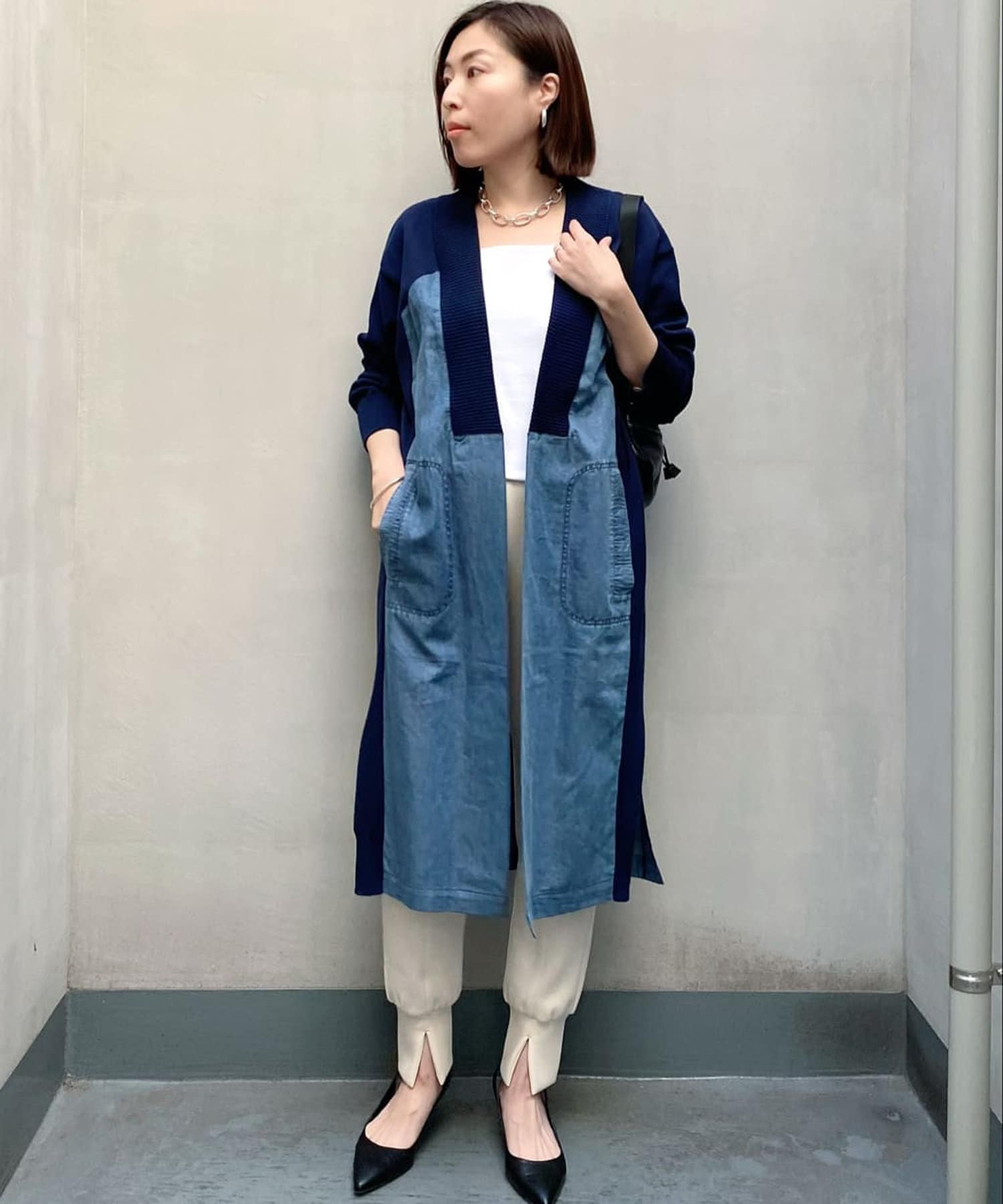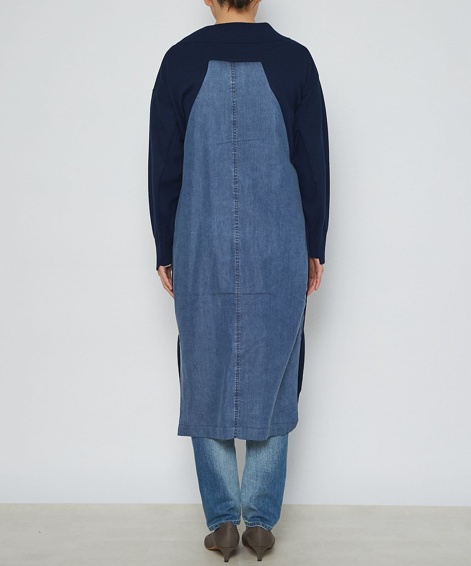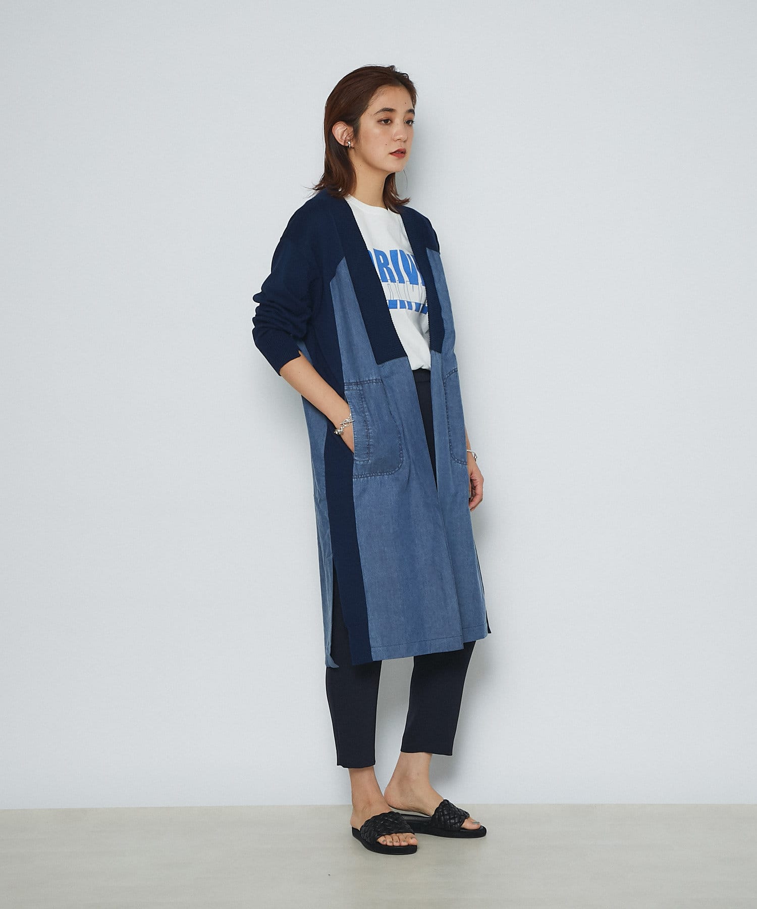 デニム×ニットのデザインカーディガン。素材切替ですが、一体感のある柔らかな着心地です。