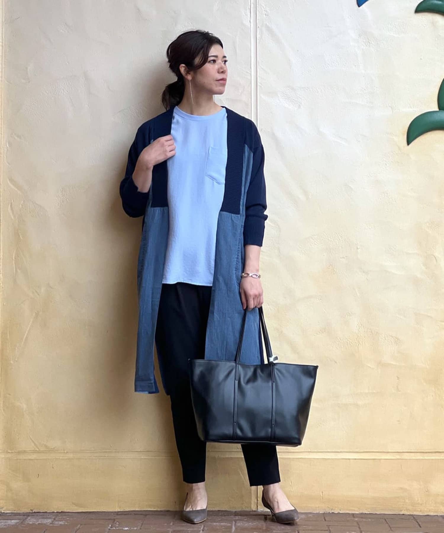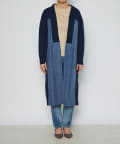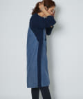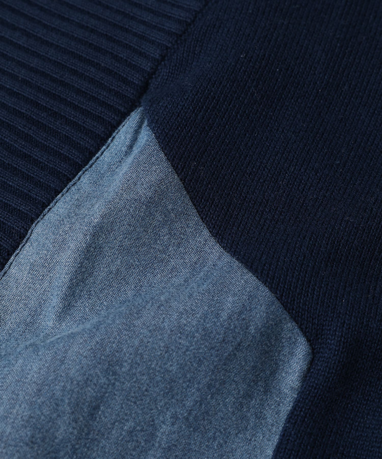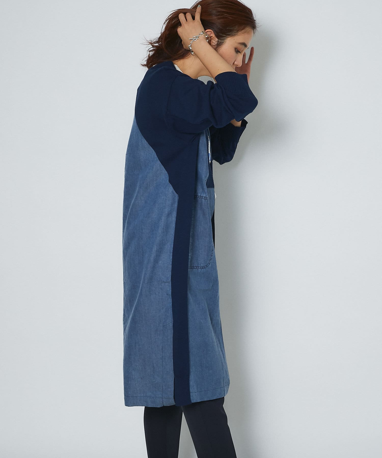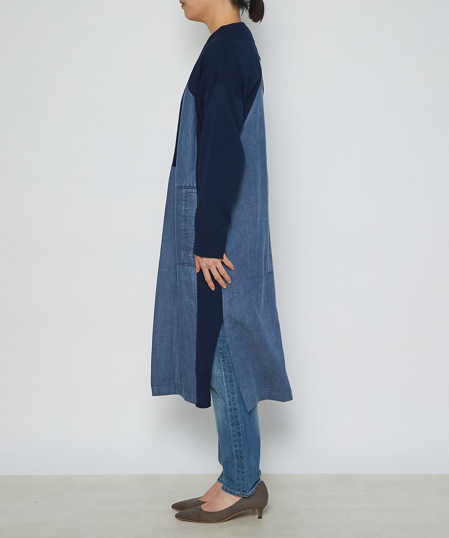 デニム×ニットのデザインカーディガン。素材切替ですが、一体感のある柔らかな着心地です。