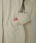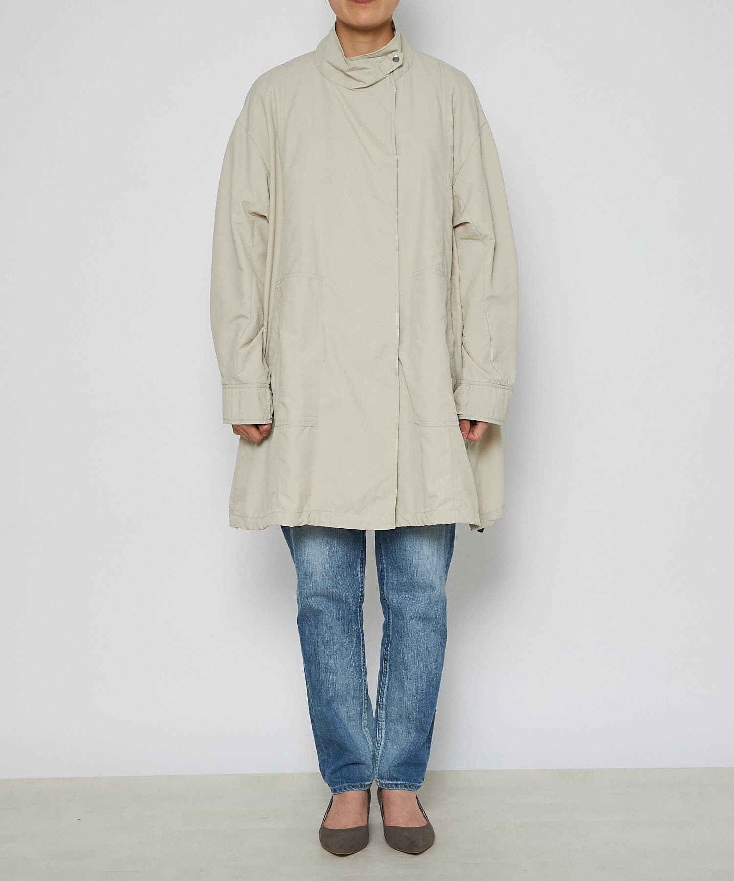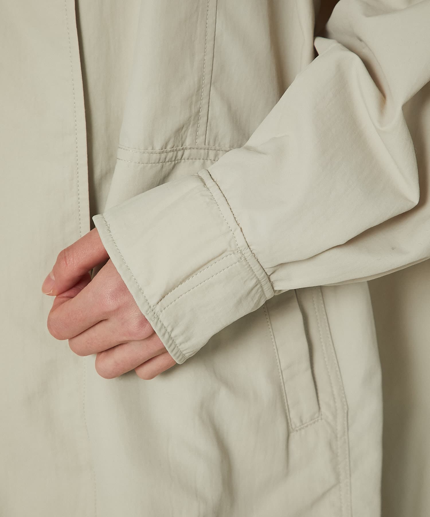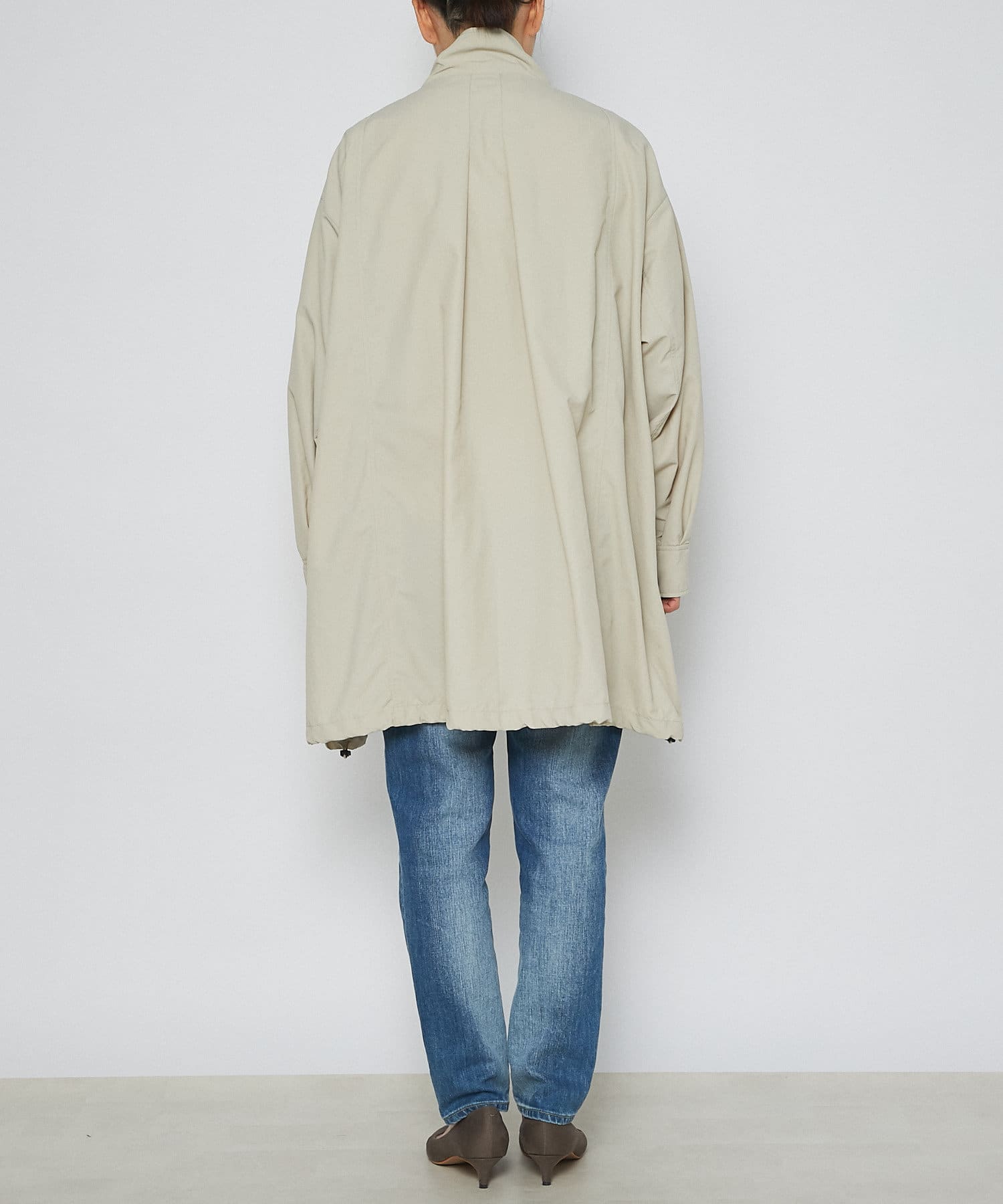 ニューノーマルと親和性のあるトレンドのミドルコート。撥水性があり、エコフレンドリーなタスランウェザー生地でお作りしました。ワッシャー加工を施した、マットでリラックス感のある風合いが特徴です。シャープなスタンドネックデザイン裾に向かってボリュームを出したテントラインシルエット裾はコードでボリュームを調整できるので、バルーンのようにも着て頂けます。袖口もゴムをかませたタブで調整できます。