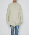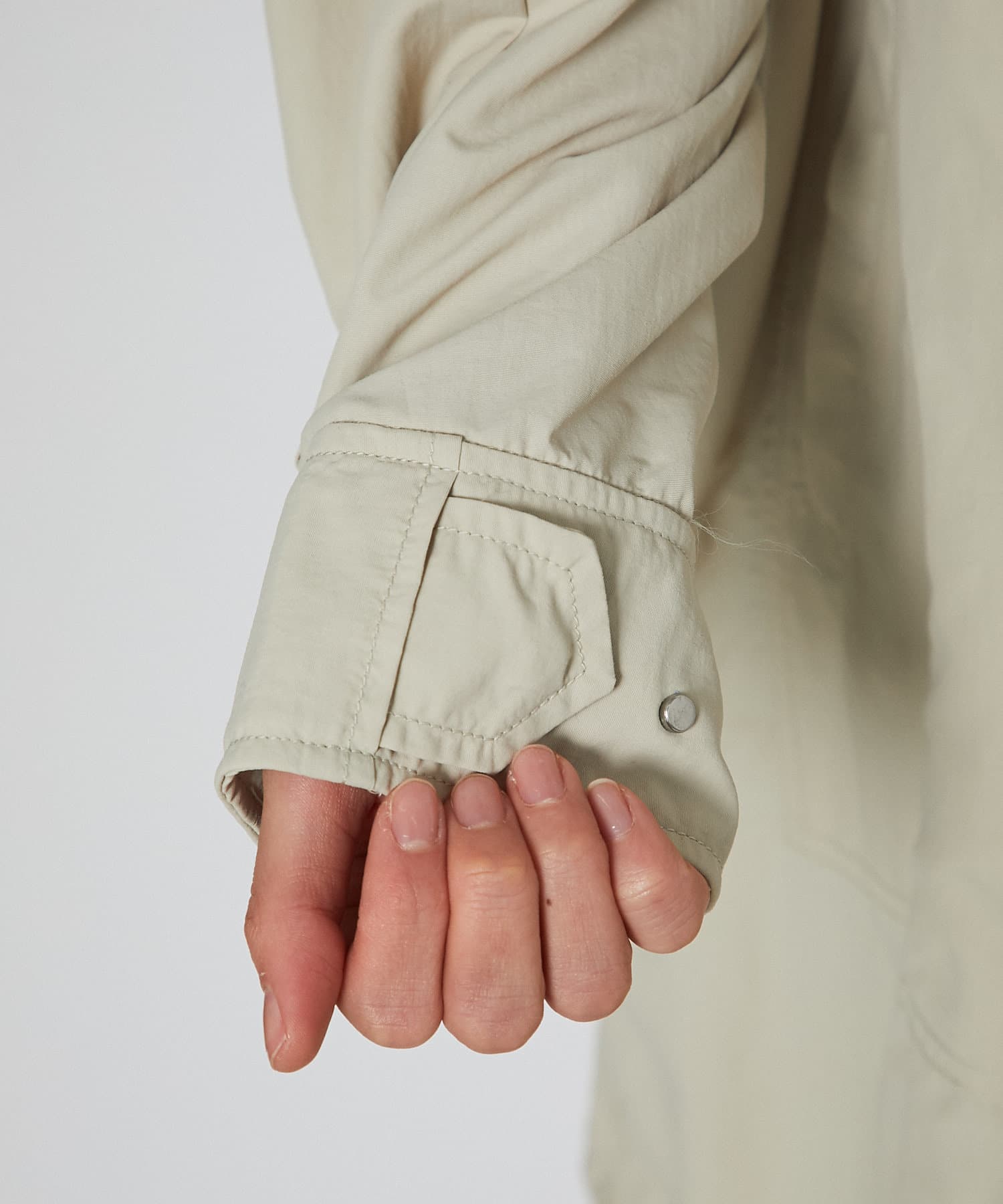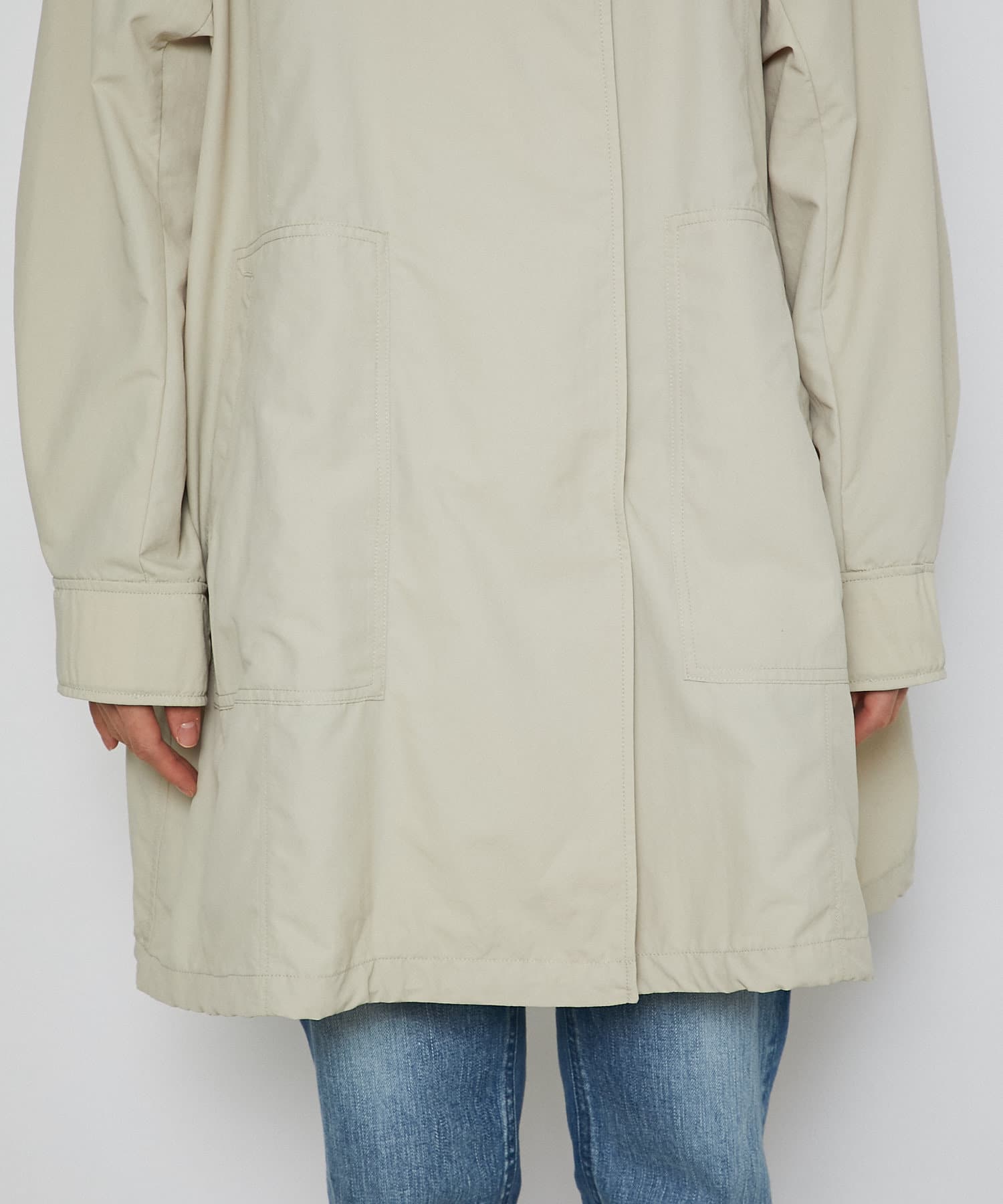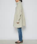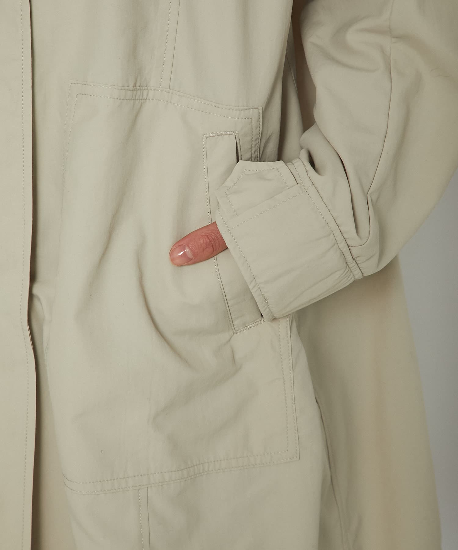 ニューノーマルと親和性のあるトレンドのミドルコート。撥水性があり、エコフレンドリーなタスランウェザー生地でお作りしました。ワッシャー加工を施した、マットでリラックス感のある風合いが特徴です。シャープなスタンドネックデザイン裾に向かってボリュームを出したテントラインシルエット裾はコードでボリュームを調整できるので、バルーンのようにも着て頂けます。袖口もゴムをかませたタブで調整できます。