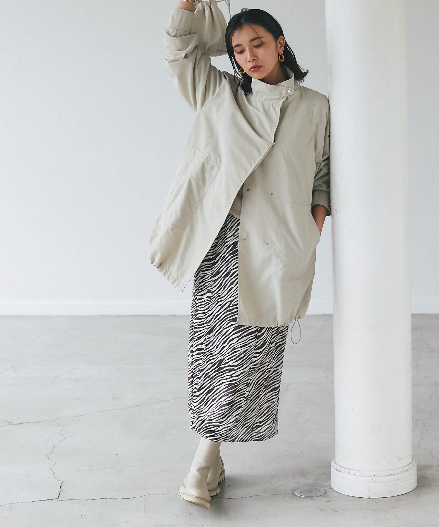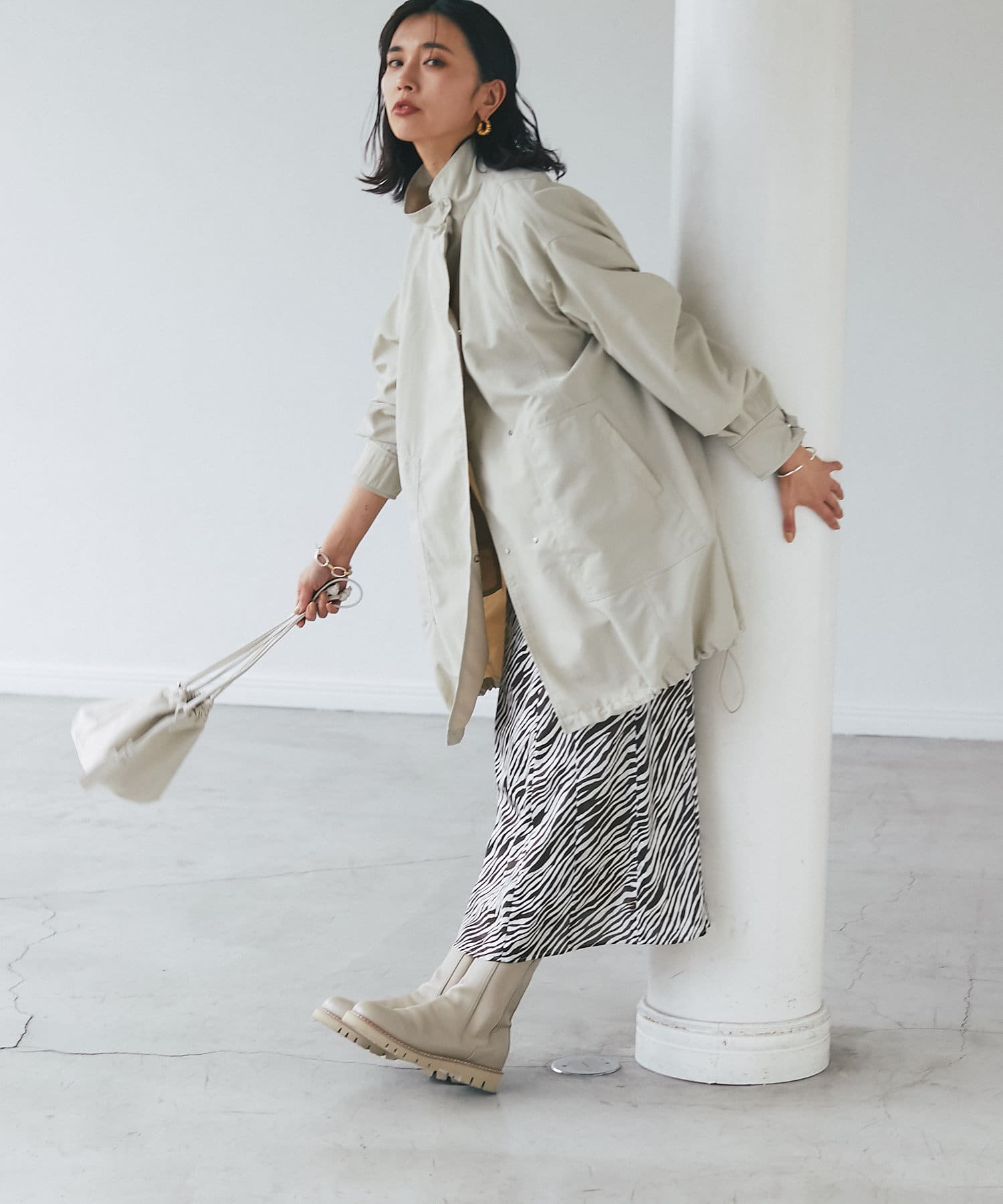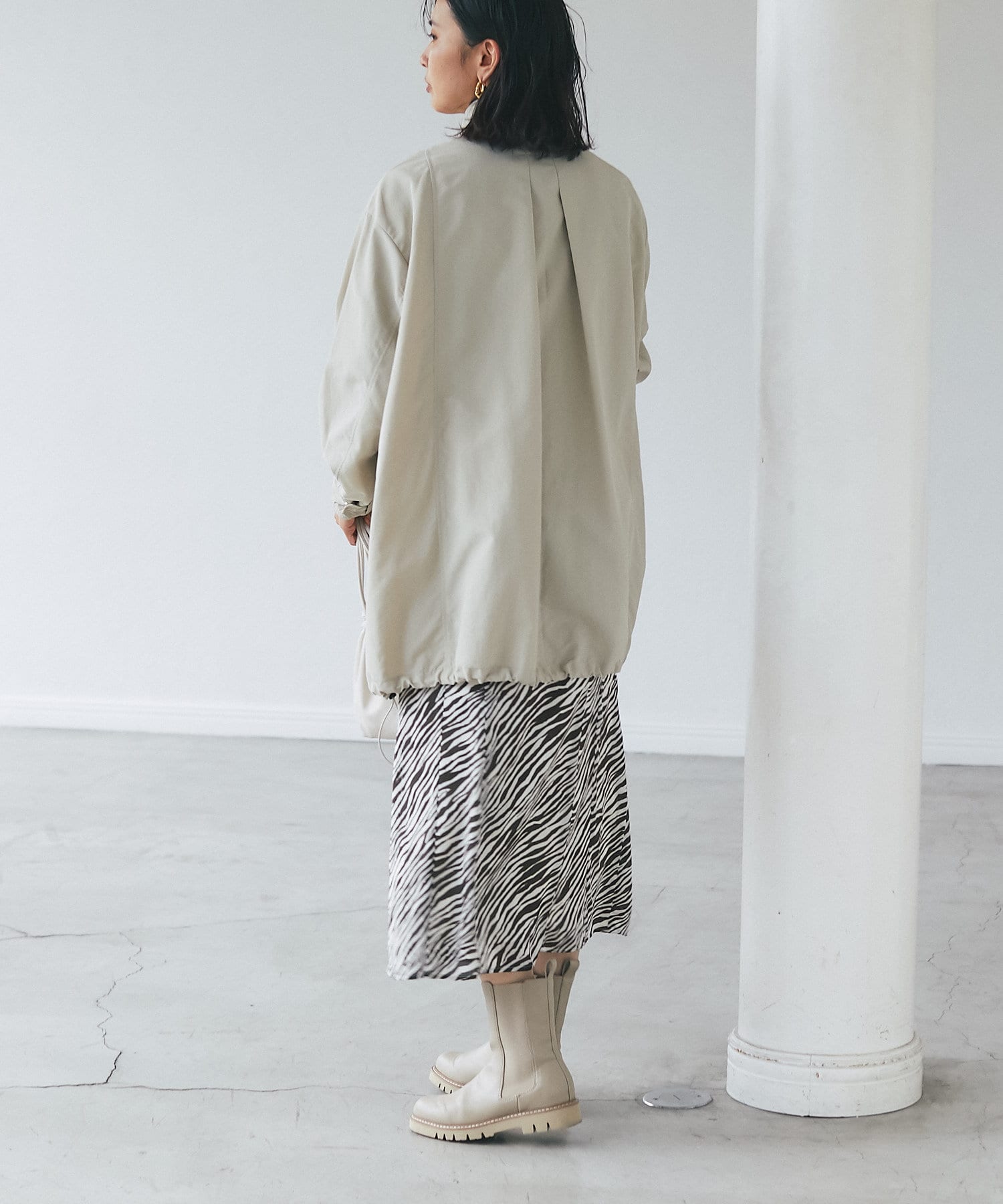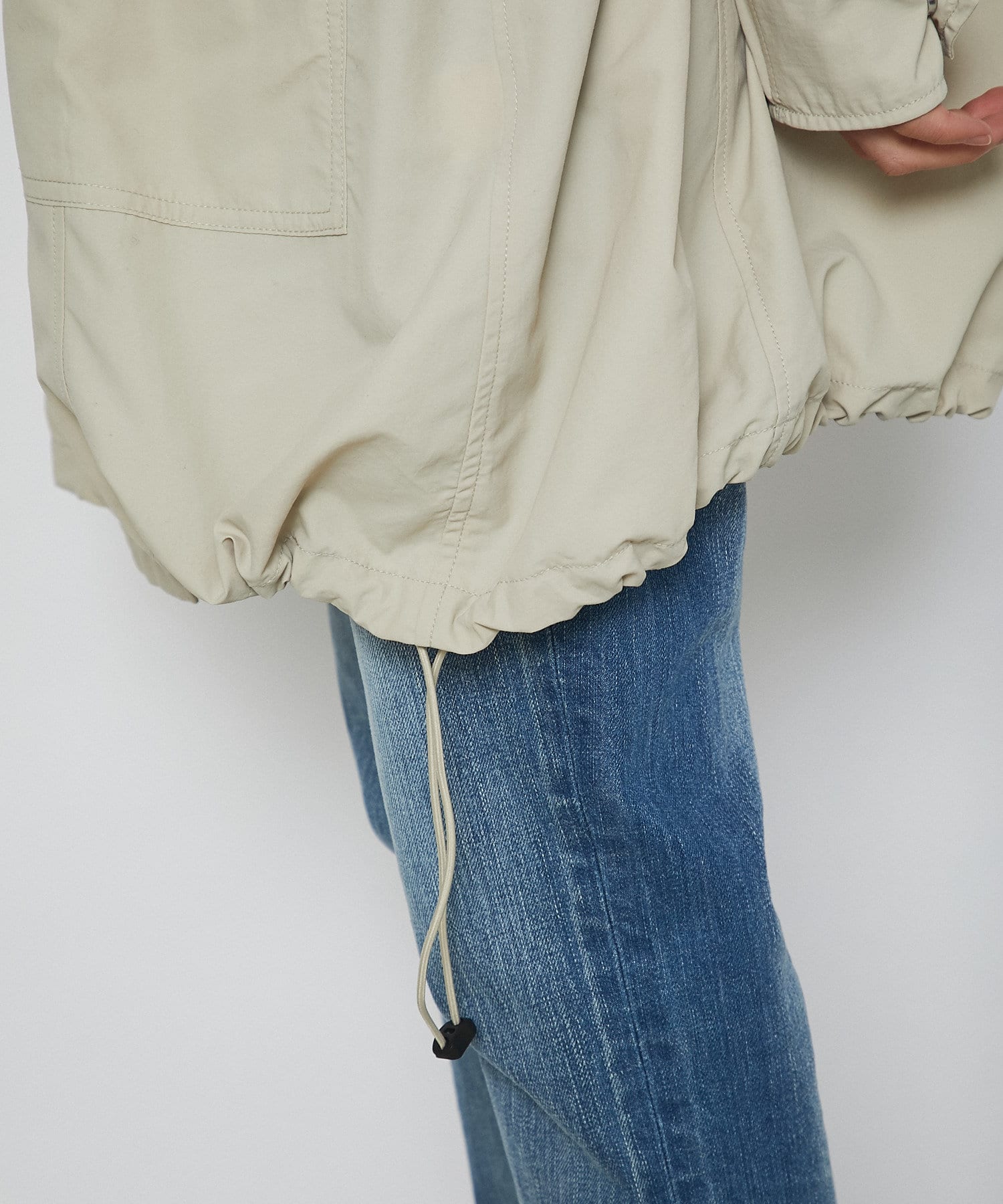 エアリーな着心地のカジュアルコート。裾のコードを絞り、丸みのあるフォルムにしても◎