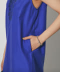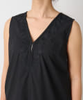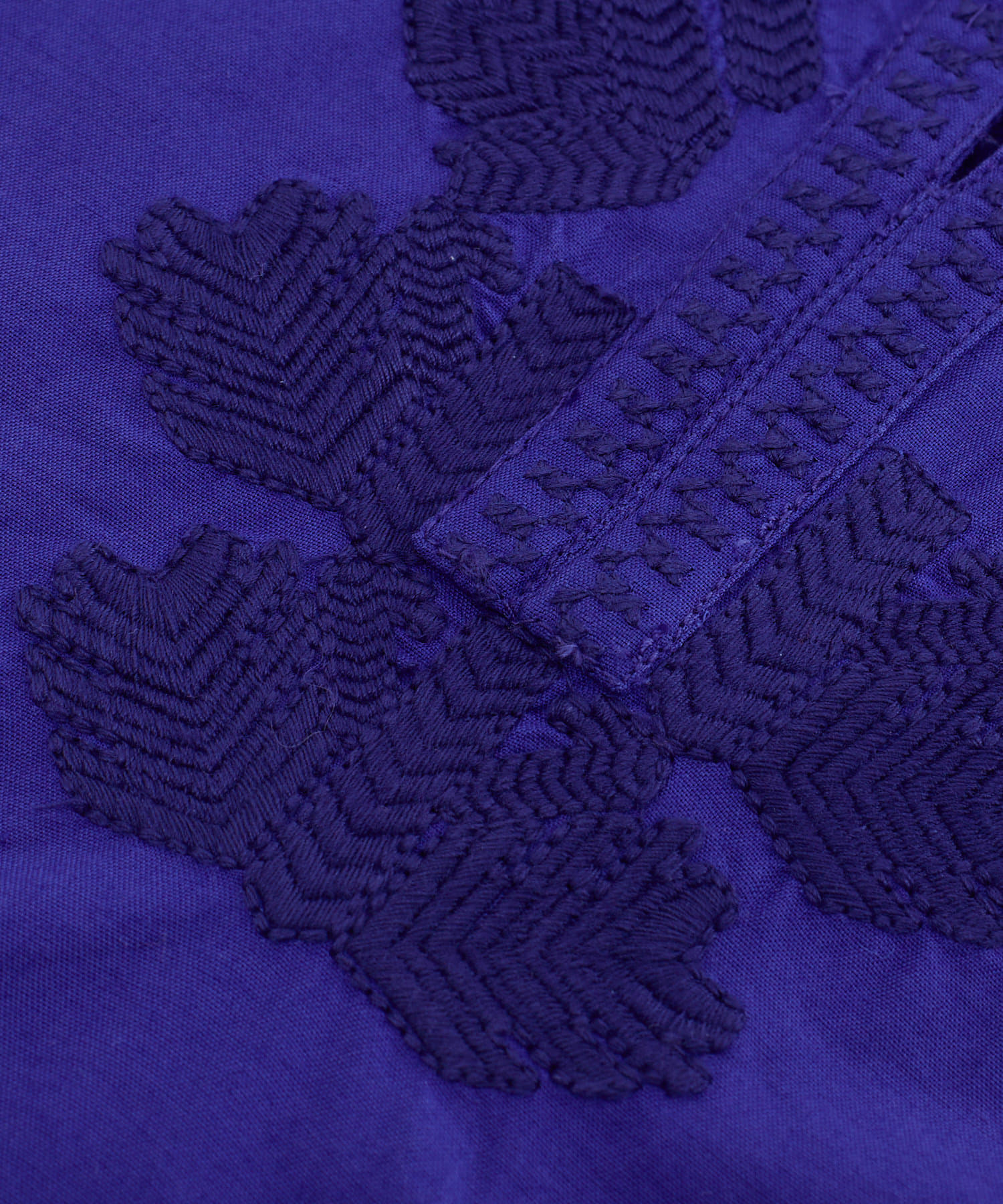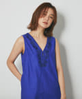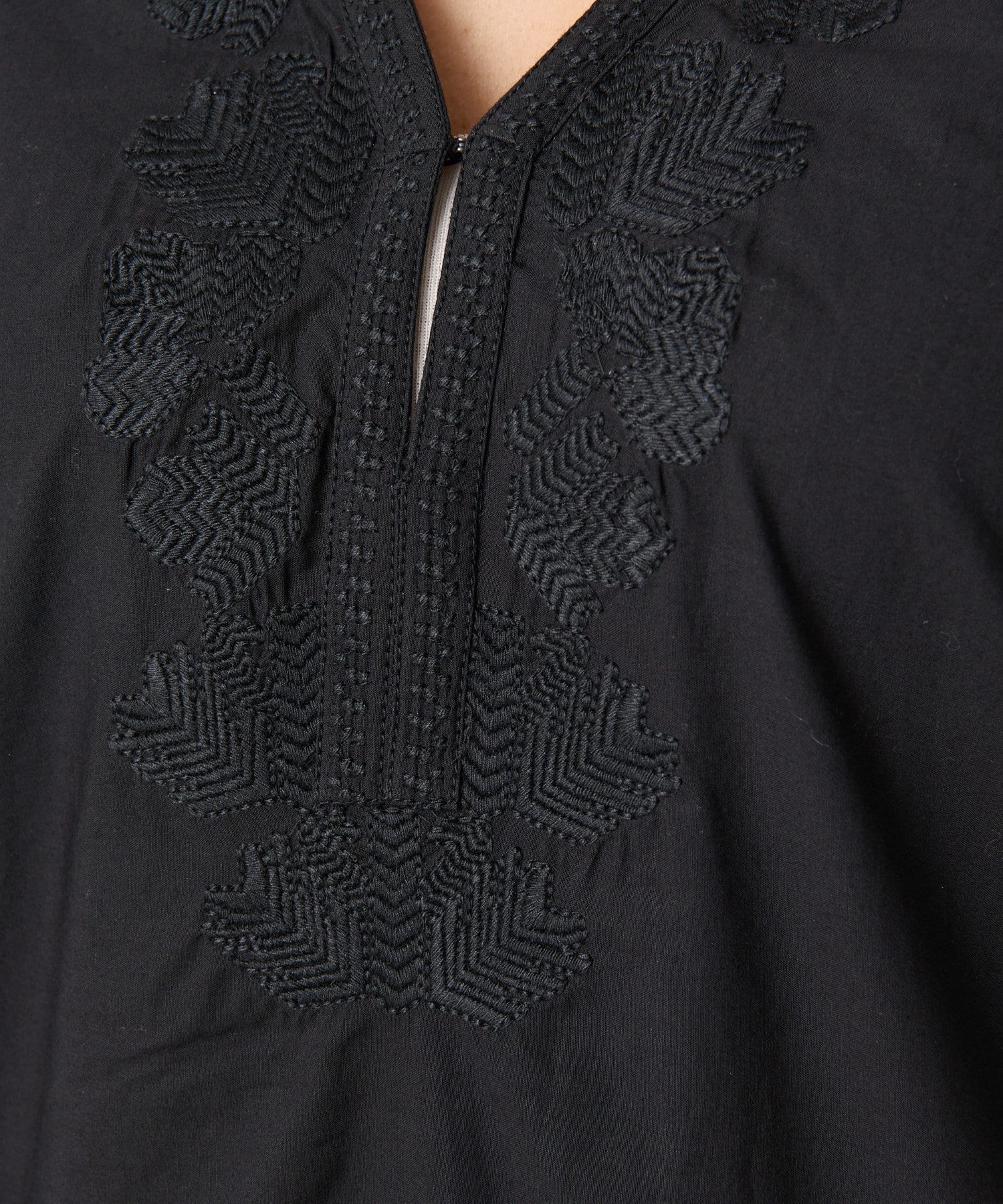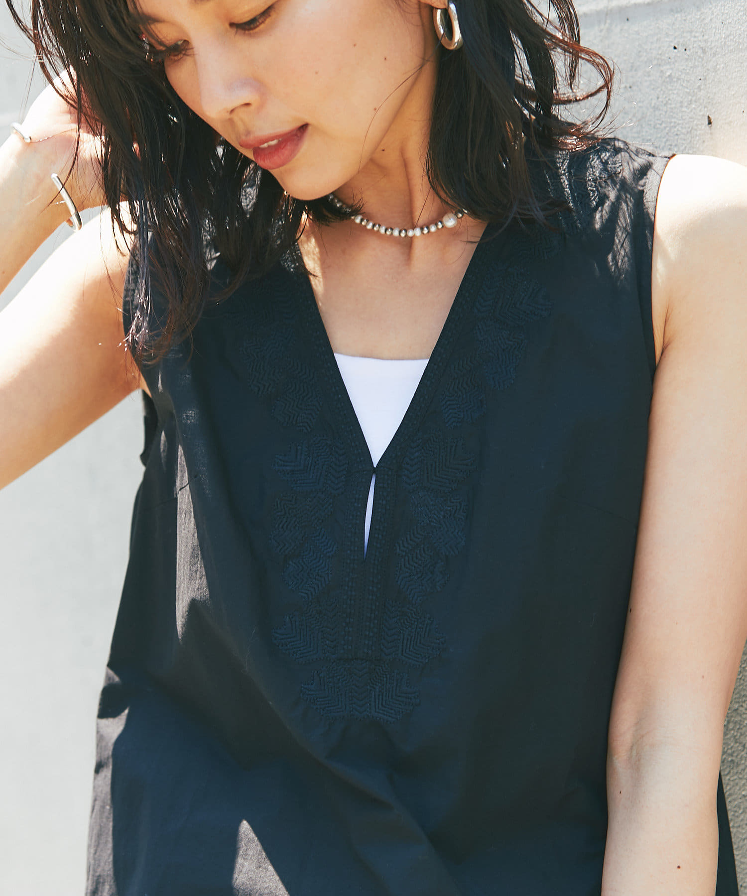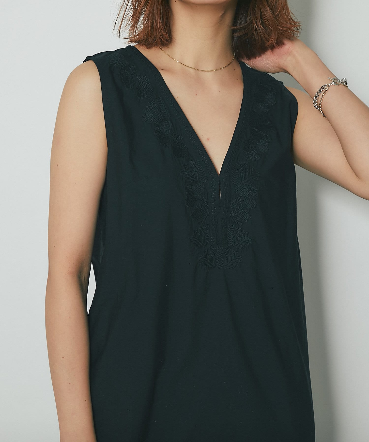 すっきりとしたVネックと首元に施されている刺繍デザインが