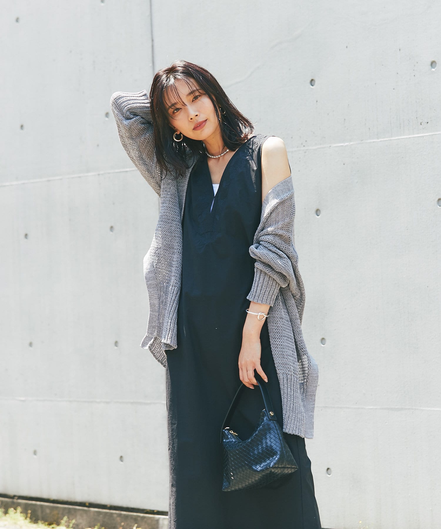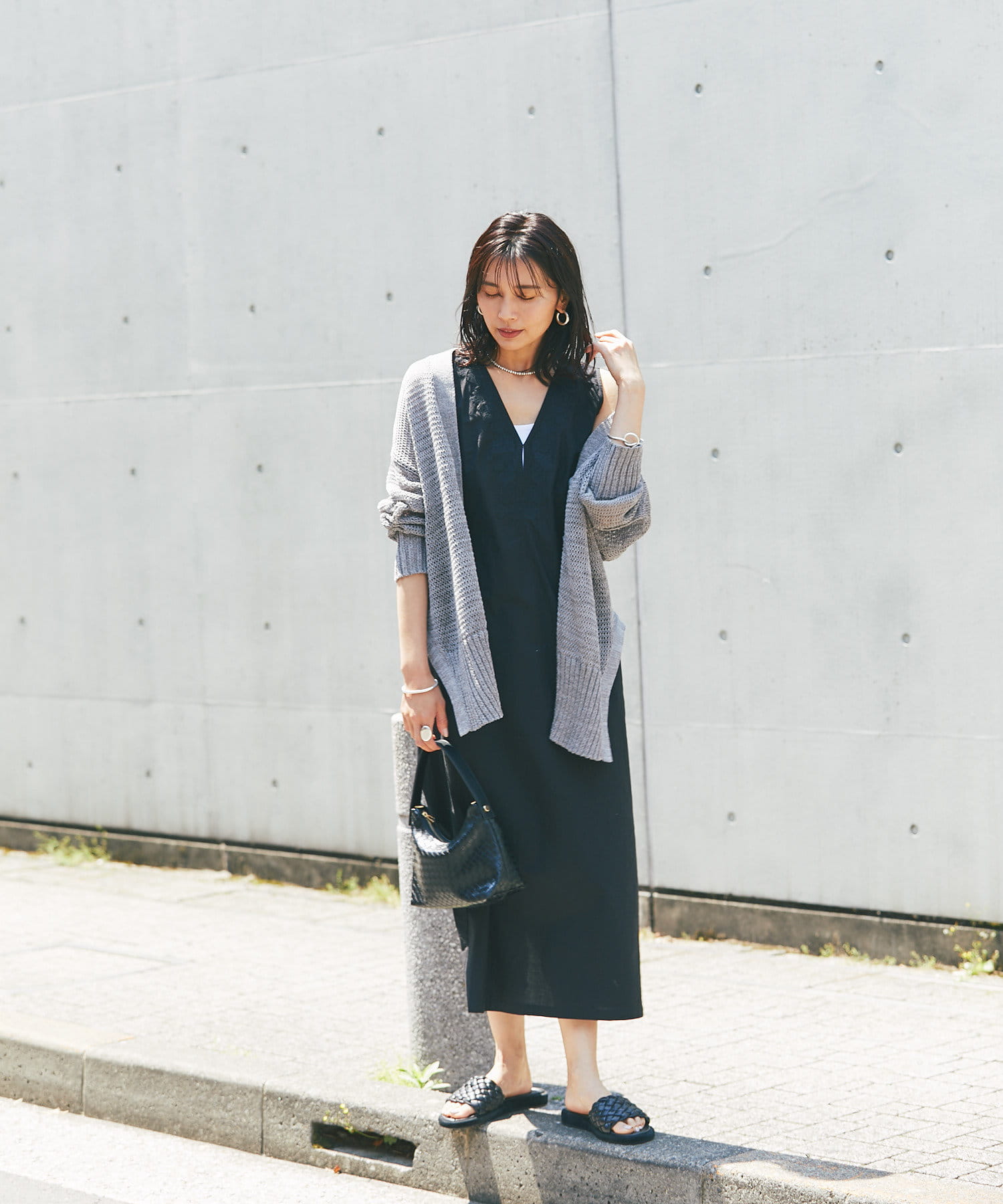ベルトマークやまた今季は、カーディガンを肩掛けしてアレンジコーデを楽しむのも◎