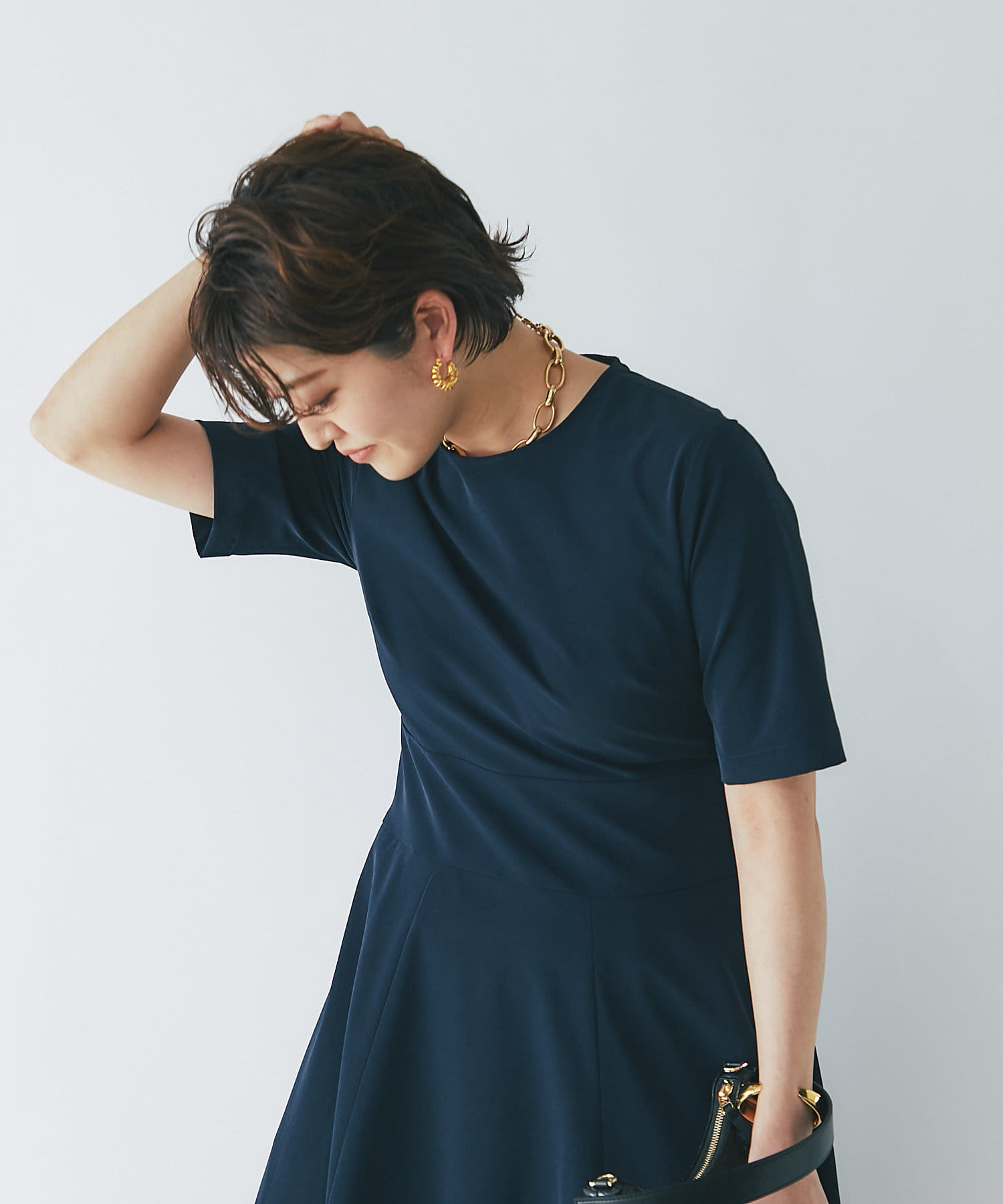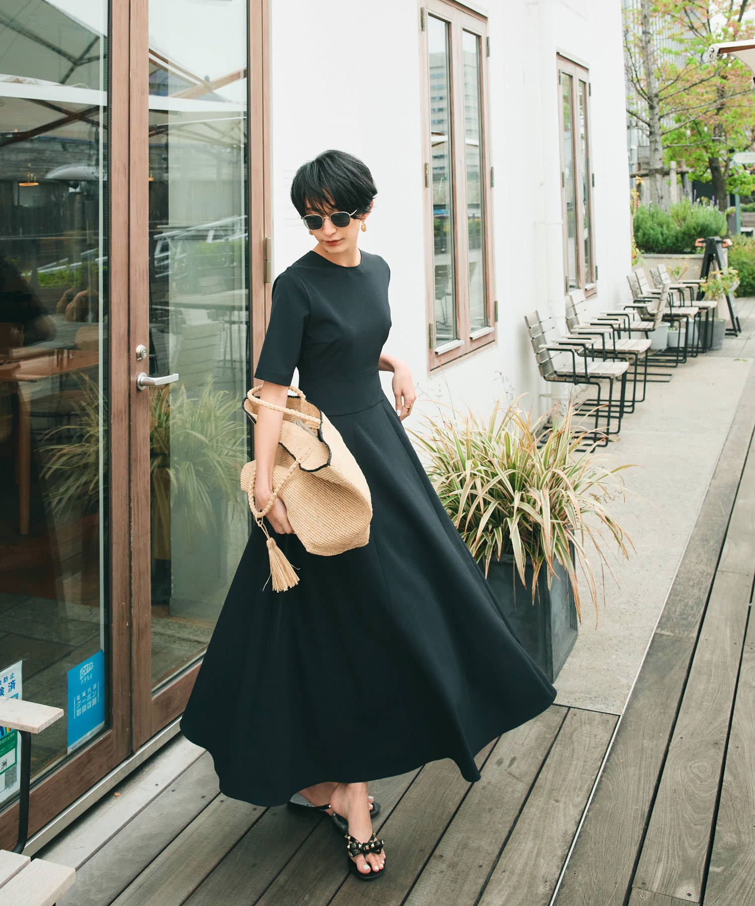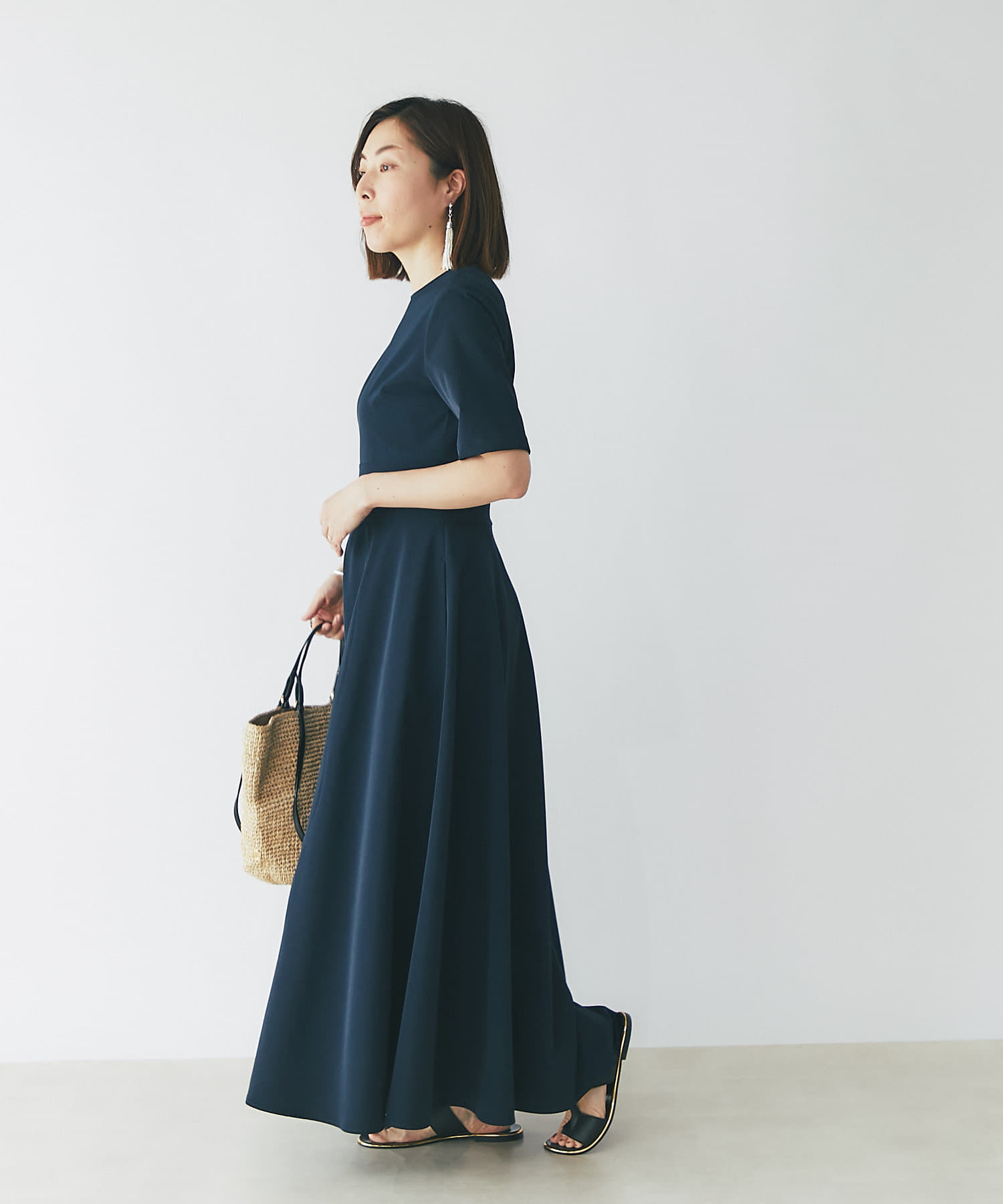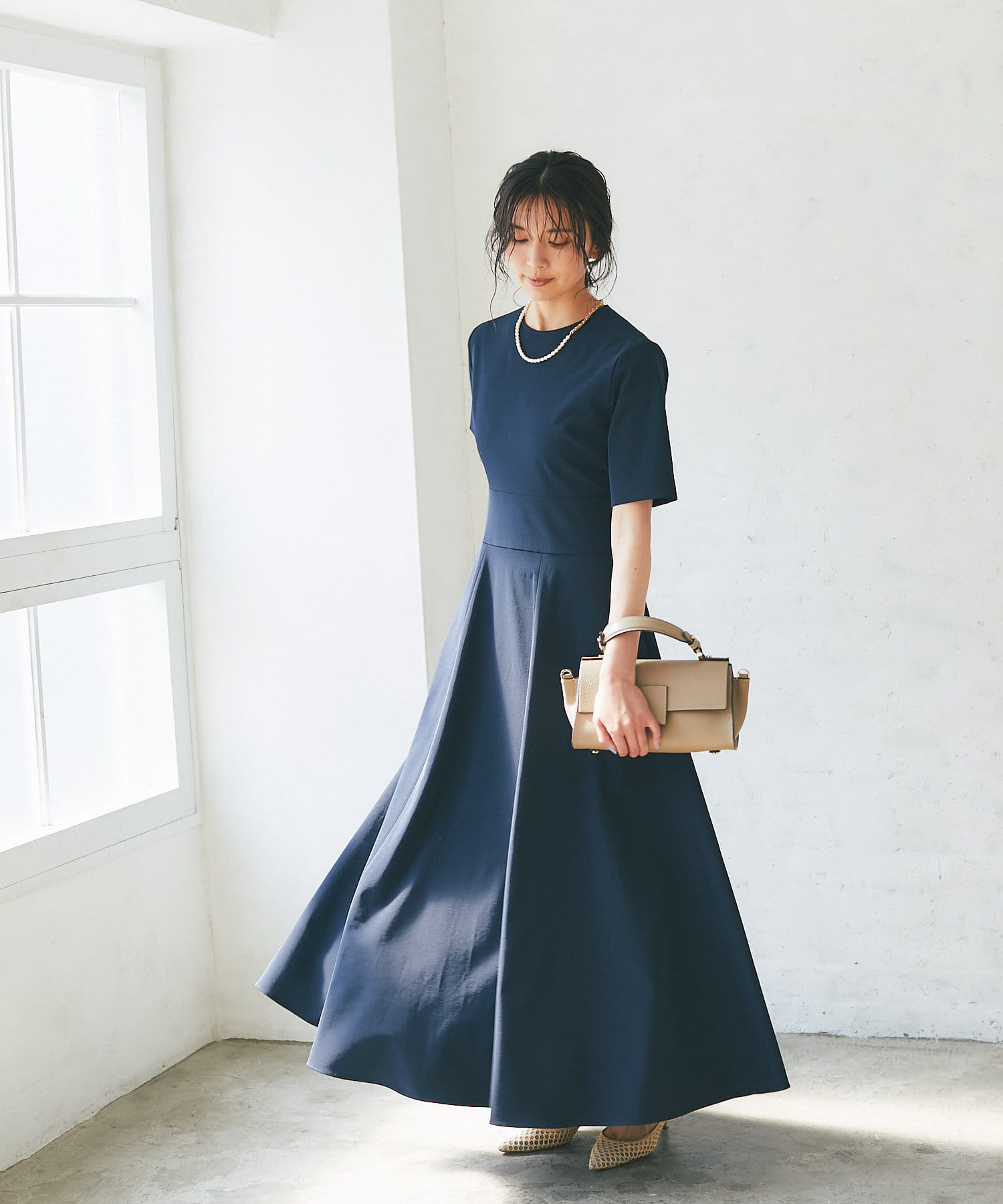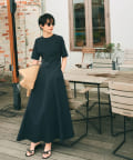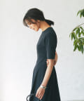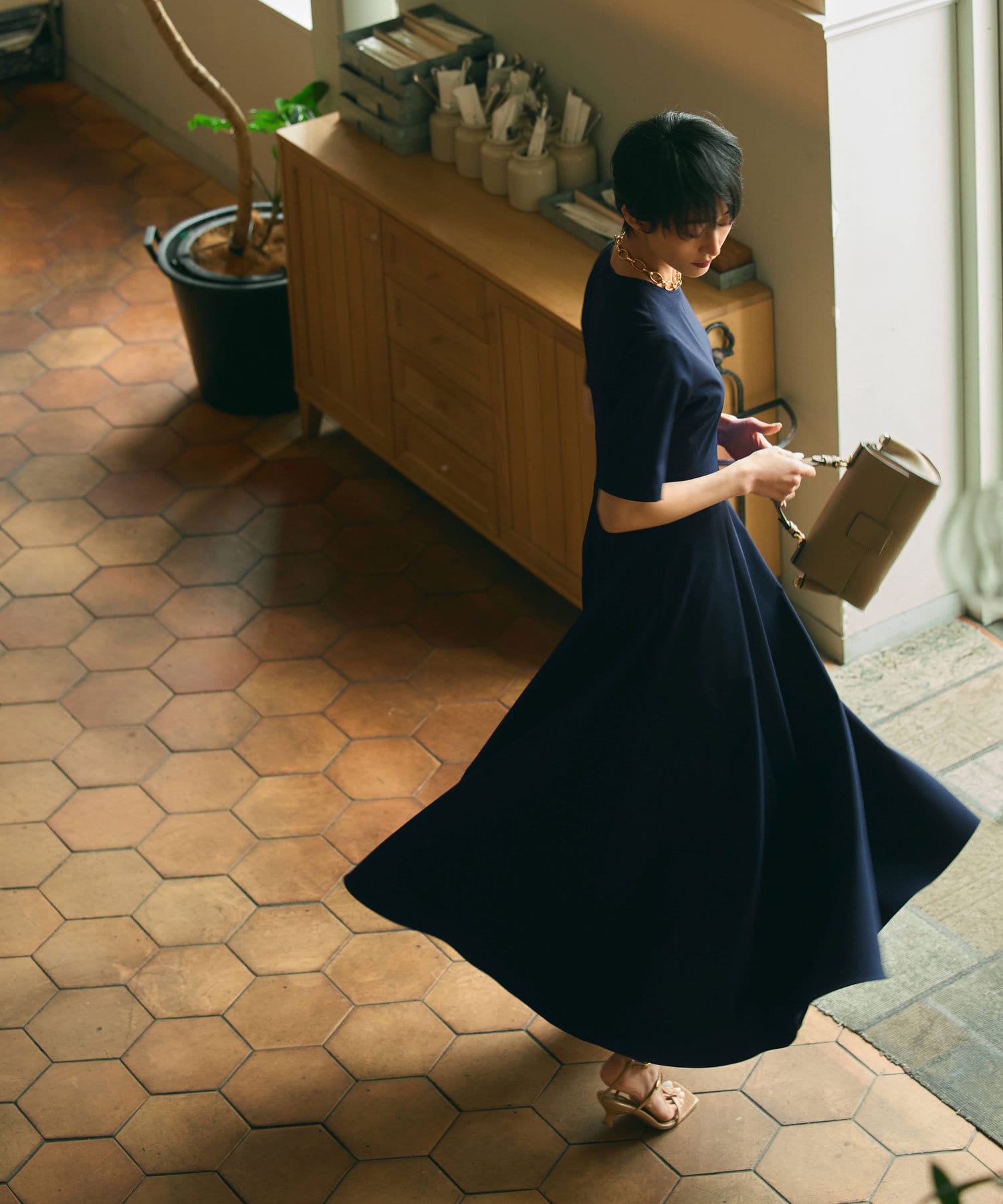 コンパクトで生地とフィット&フレアシルエットが最高にマッチしたワンピースは立体裁断のシルエットの美しさが際立つ1着。ウエストに切り替えをほどこし、上身頃の適度なフィット感から裾に向けて広がるシルエットはエレガントな印象で長めの袖丈も品の良さをを引き立てます。