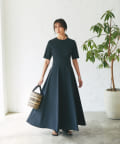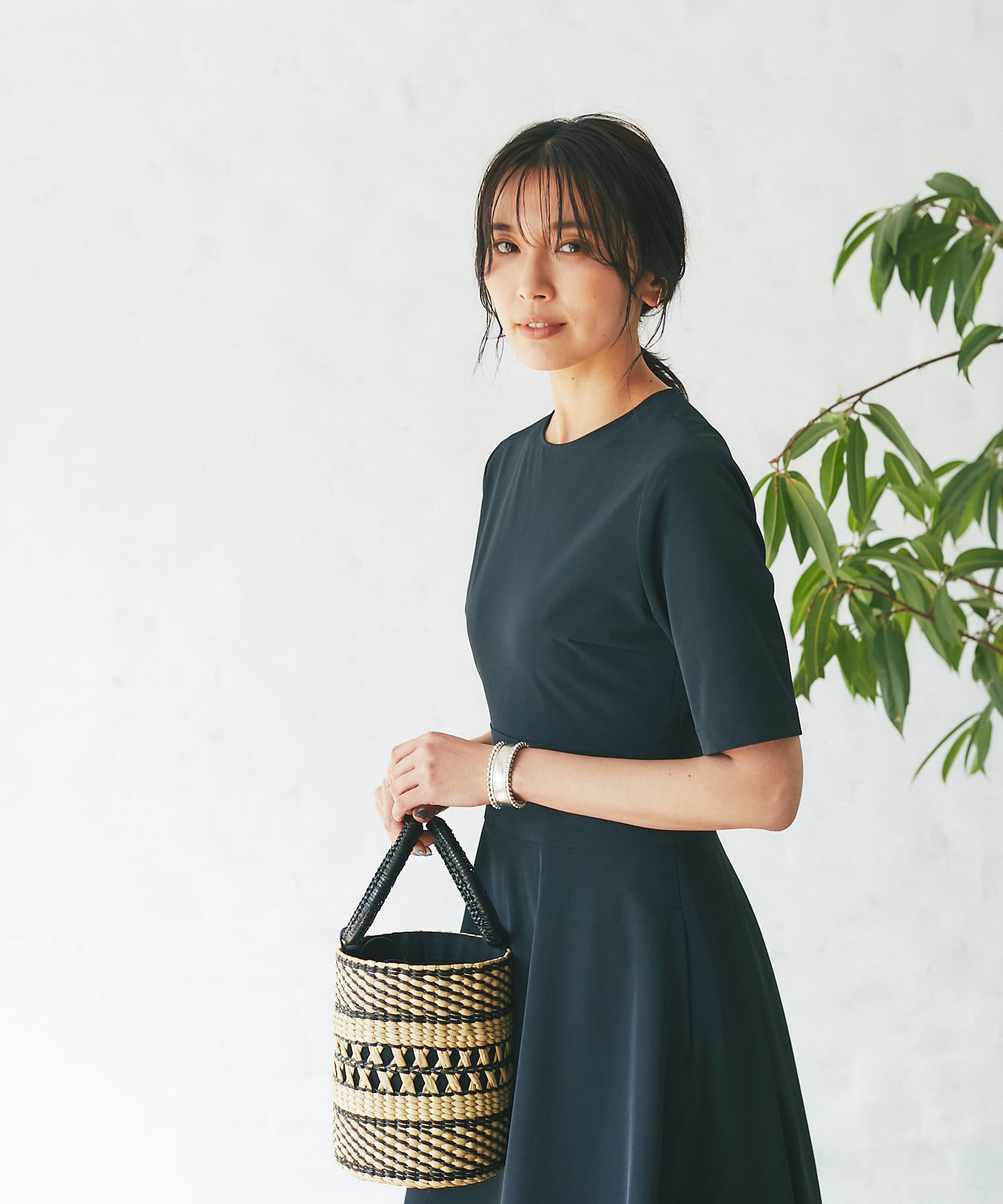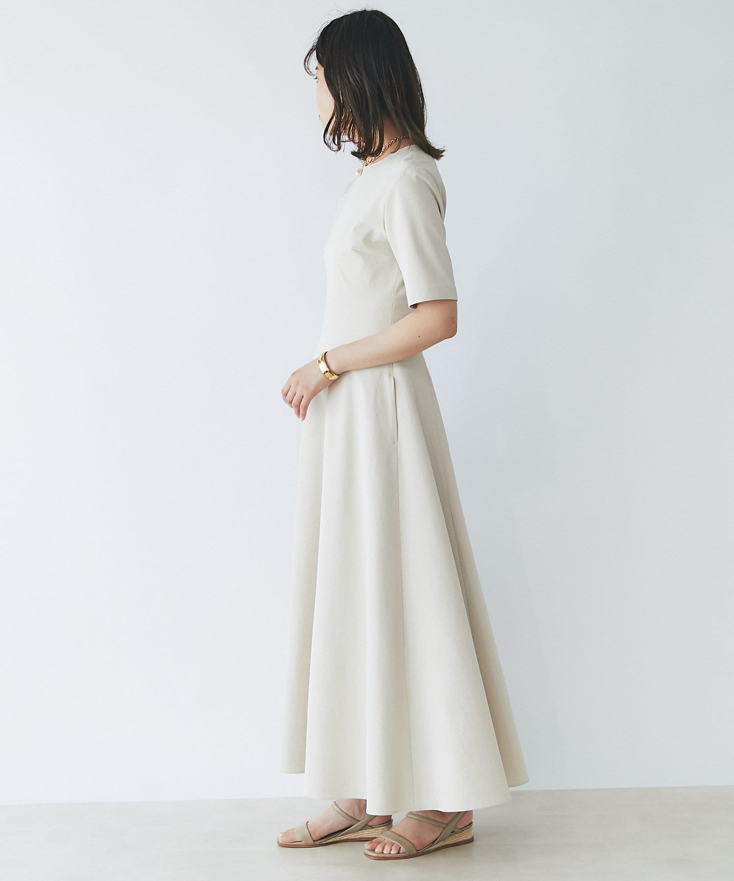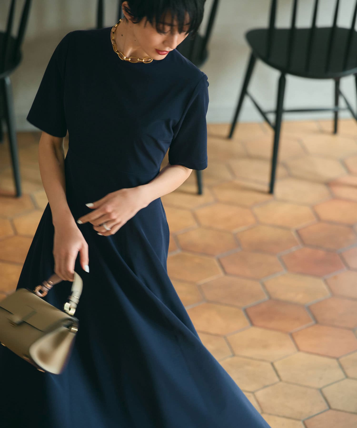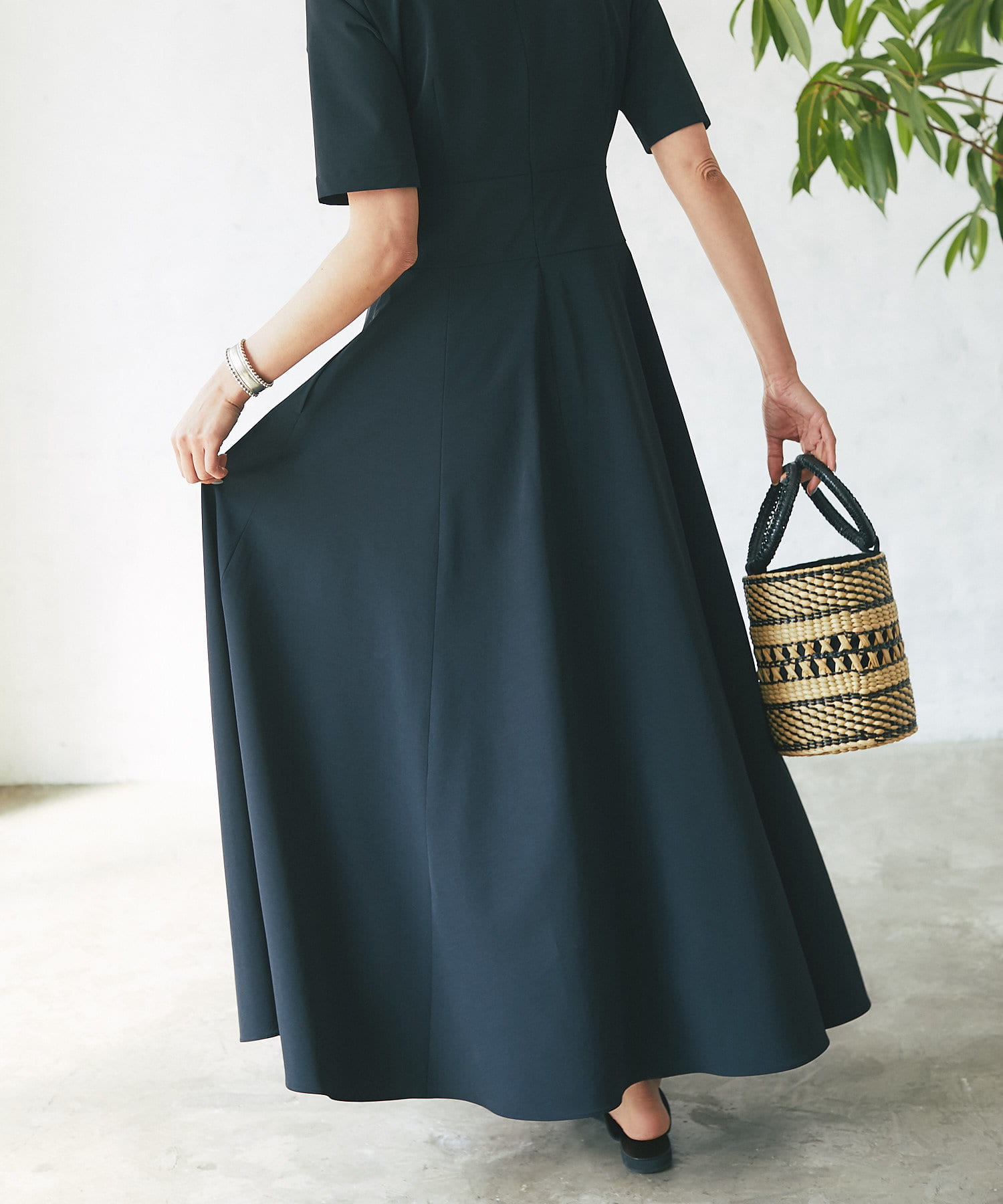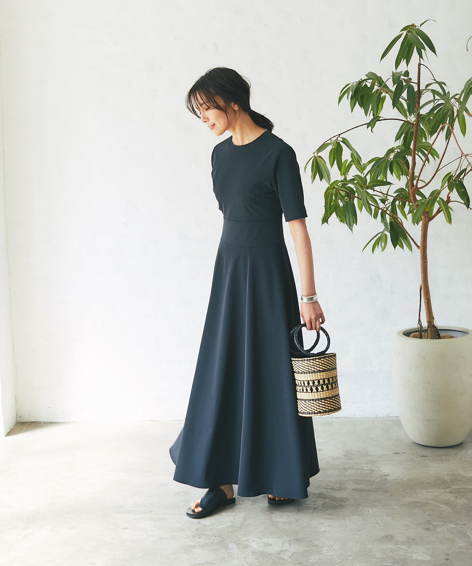 コンパクトで生地とフィット&フレアシルエットが最高にマッチしたワンピースは立体裁断のシルエットの美しさが際立つ1着。ウエストに切り替えをほどこし、上身頃の適度なフィット感から裾に向けて広がるシルエットはエレガントな印象で長めの袖丈も品の良さをを引き立てます。