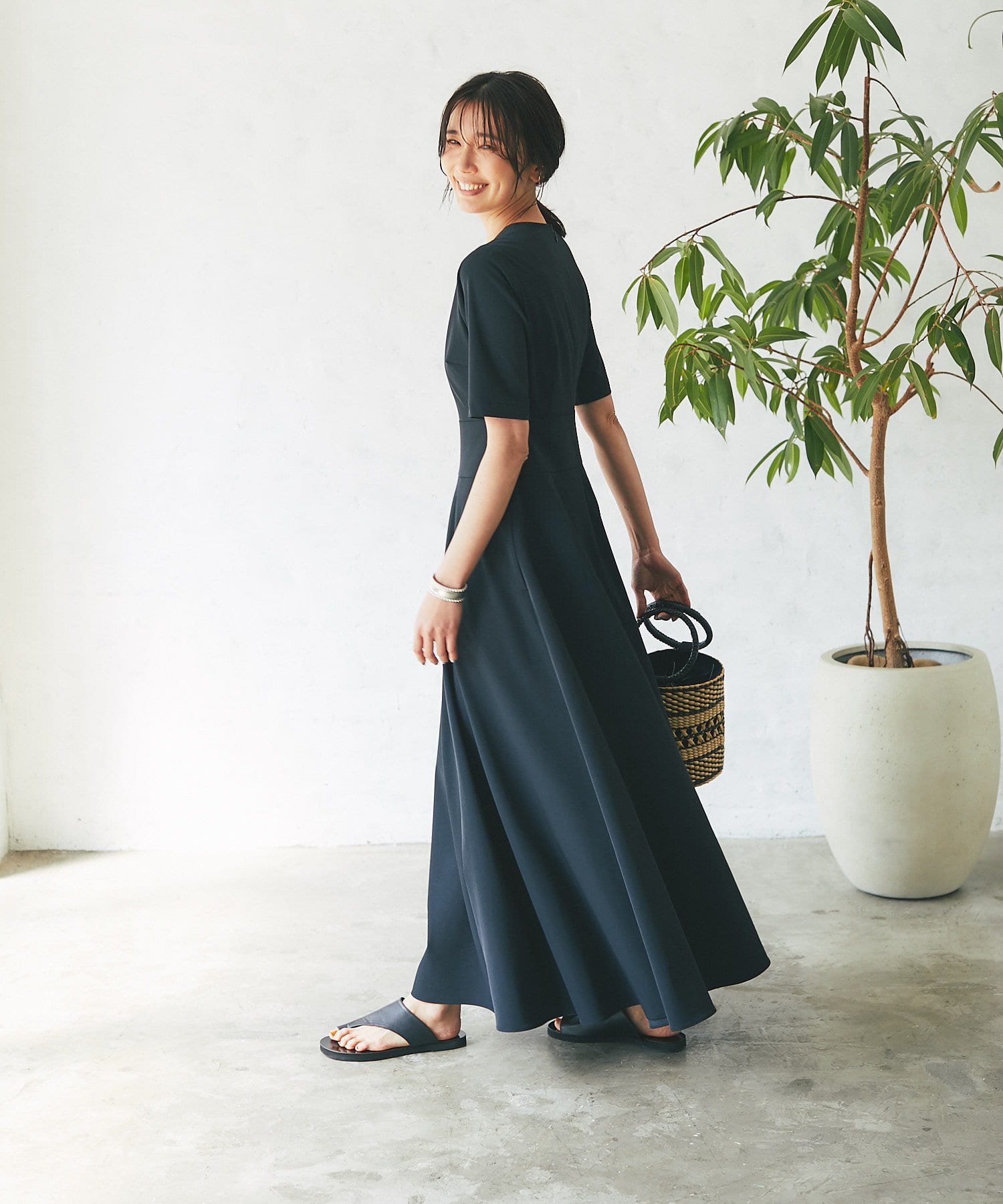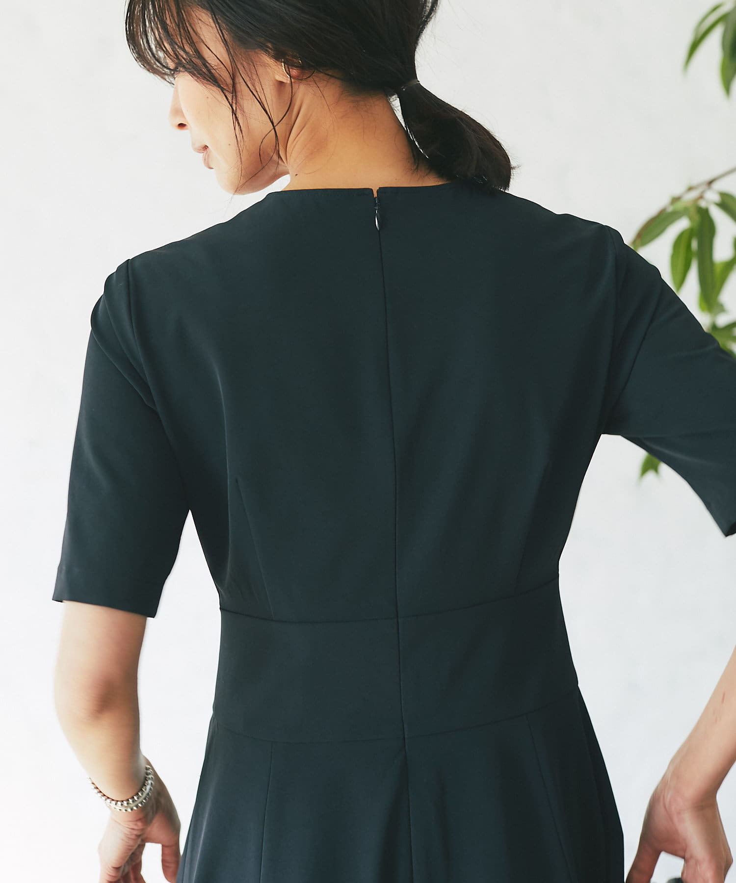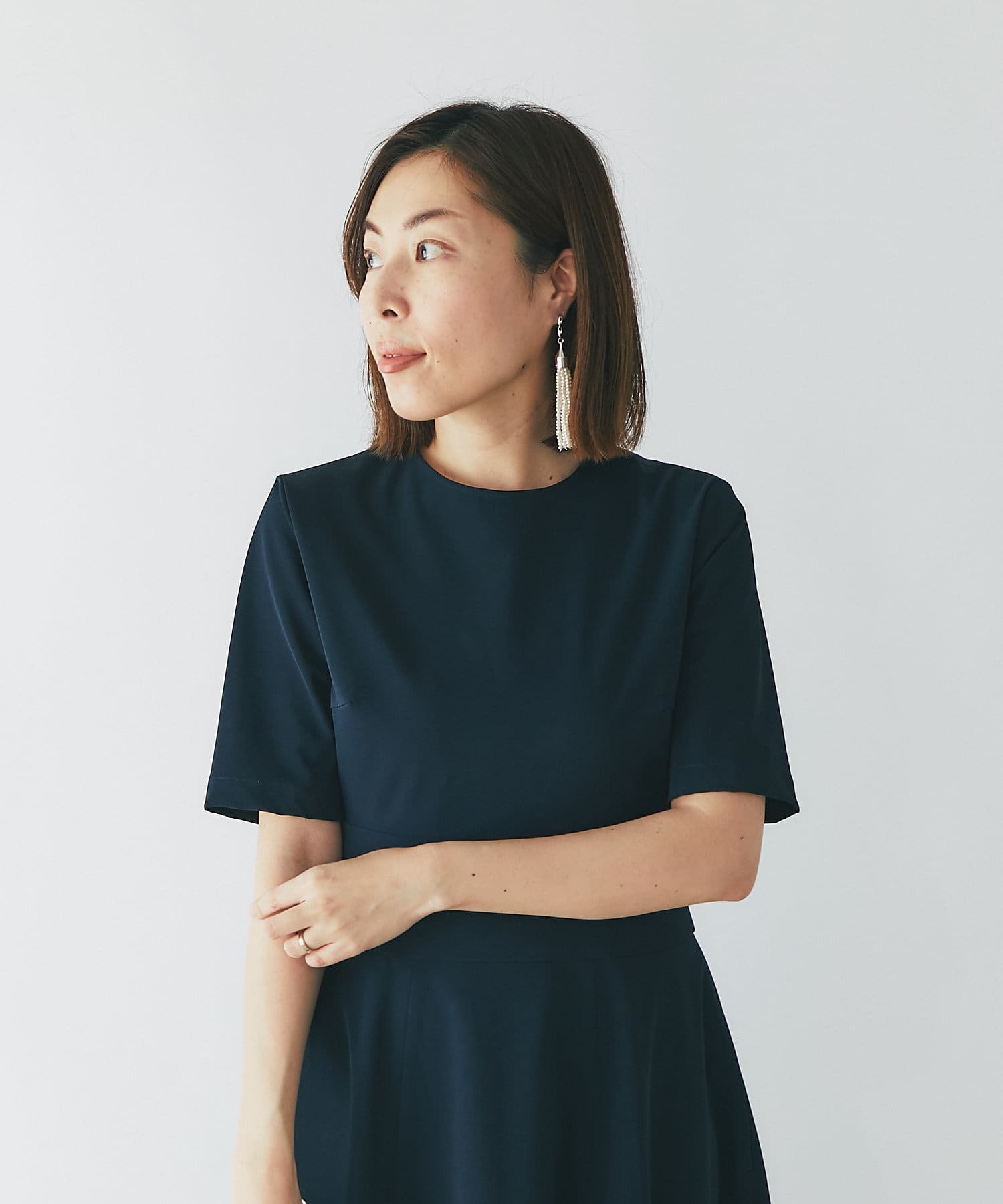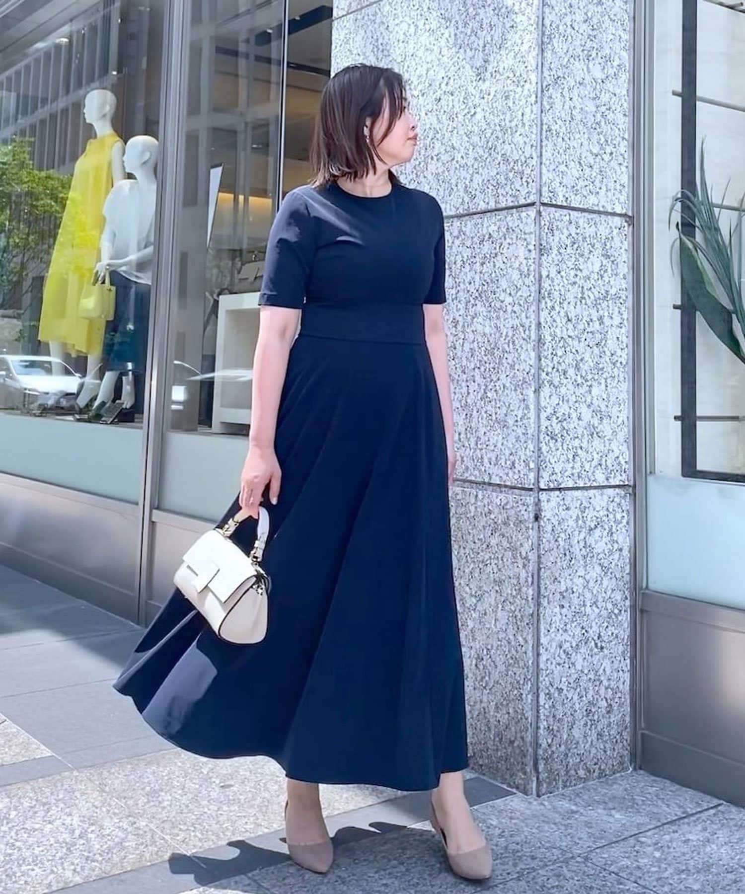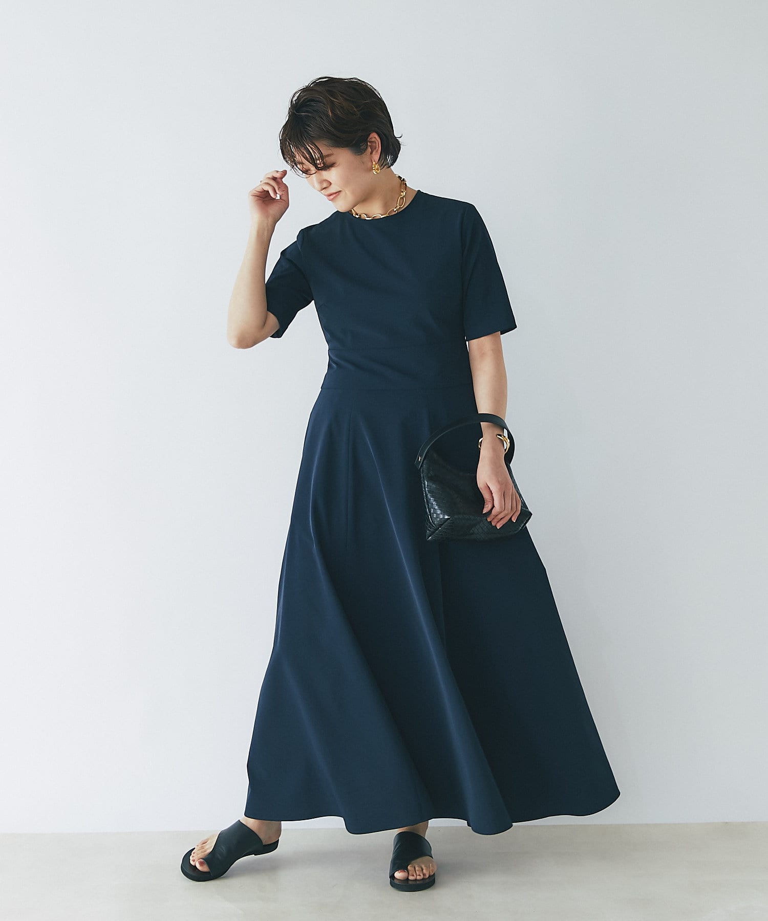コンパクトで生地とフィット&フレアシルエットが最高にマッチしたワンピースは立体裁断のシルエットの美しさが際立つ1着。ウエストに切り替えをほどこし、上身頃の適度なフィット感から裾に向けて広がるシルエットはエレガントな印象で長めの袖丈も品の良さをを引き立てます。