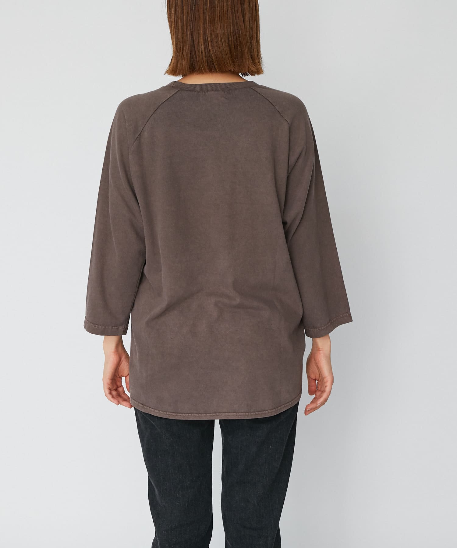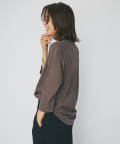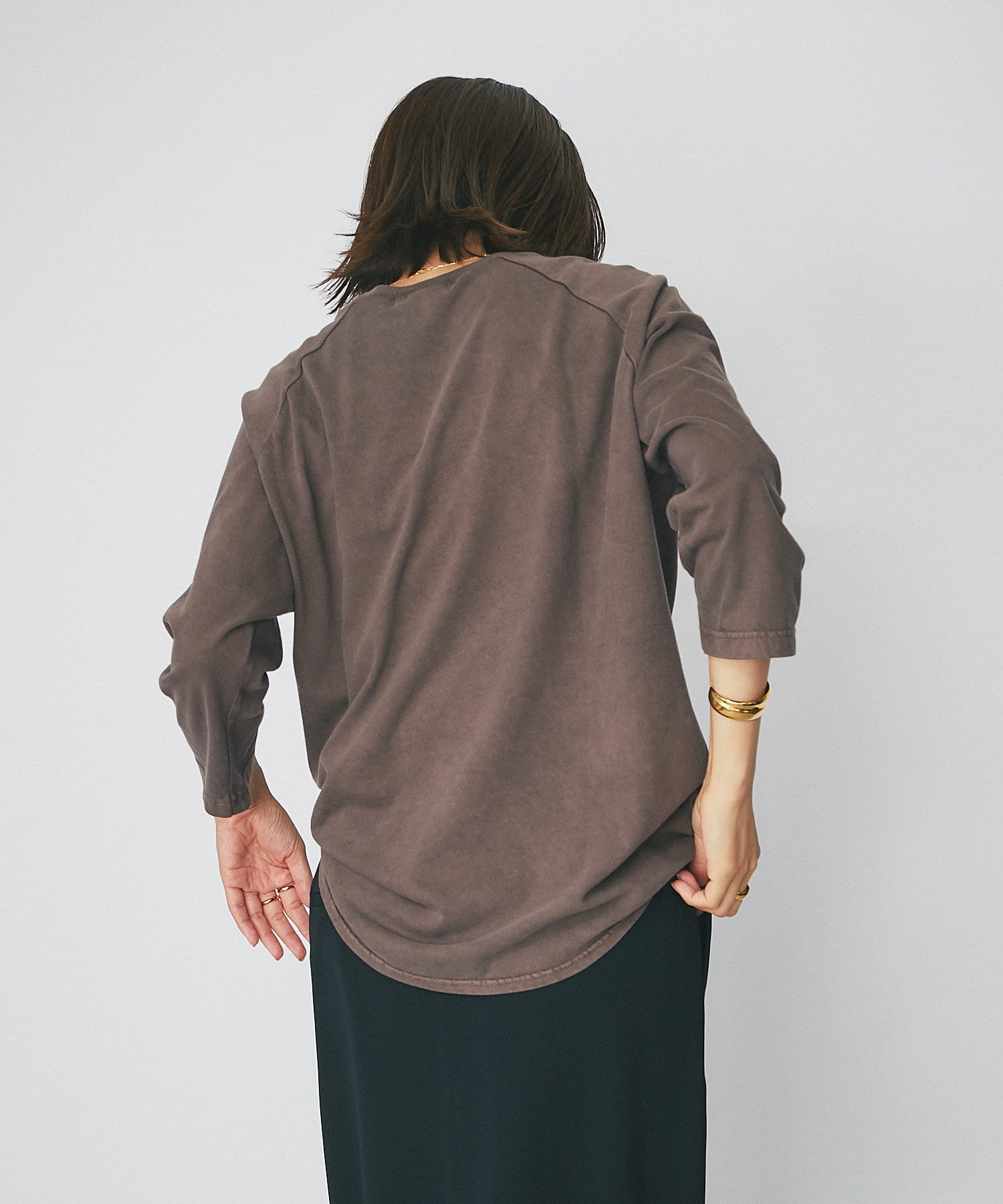 ⇒特徴的な違いは大きく分けて襟元・袖口・丈感にあります。こちらのアイテムはクルーネックで襟ぐりはそこまで広くなく、お袖は7分丈のリブなしデザインです。バックスタイルも長すぎず、フロント側の丈との差が少なめとなっております。