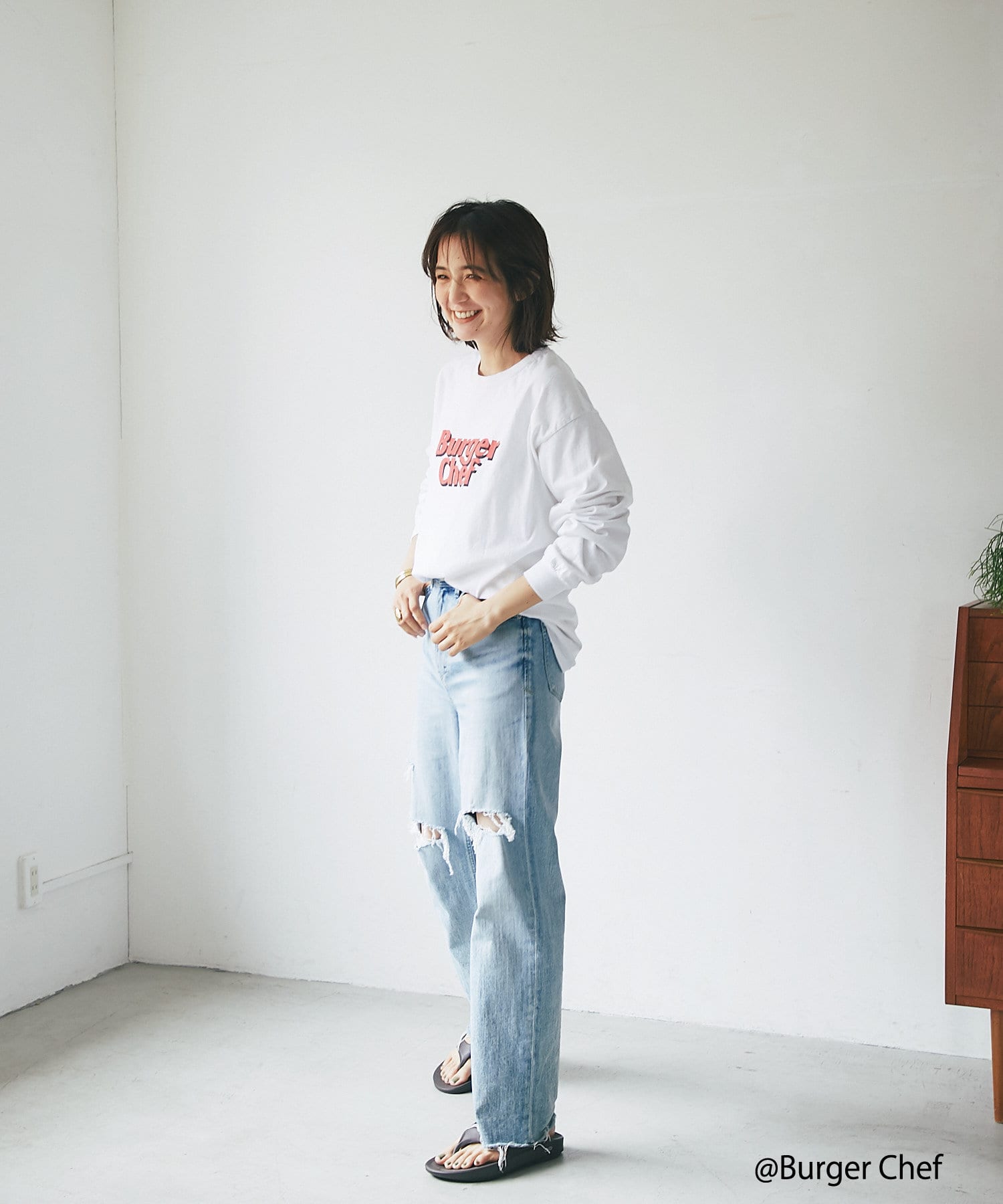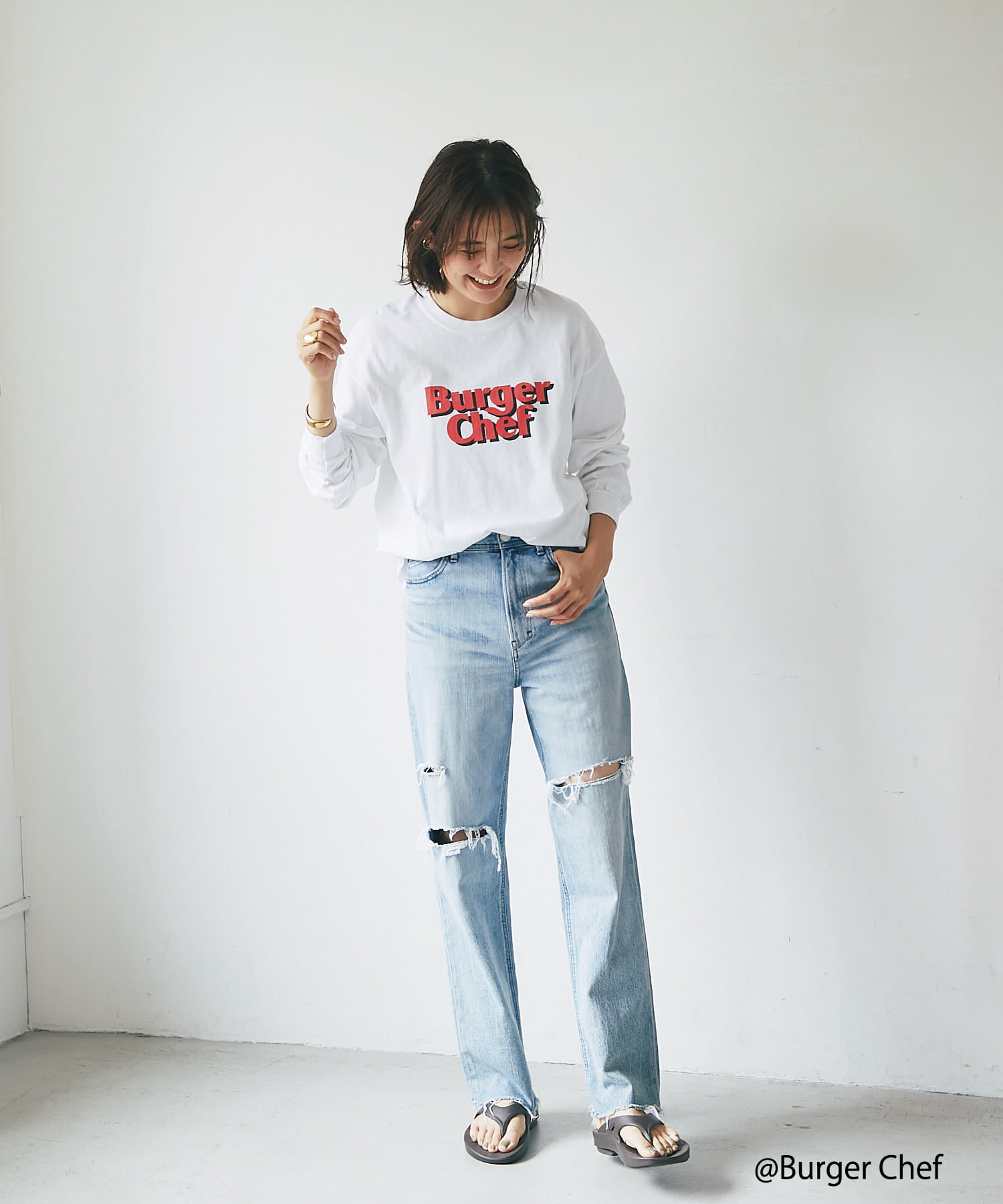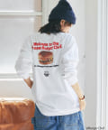 キャッチーなフロントロゴとハンバーガーのバックプリントデザインがアメリカンムードたっぷりのカジュアルなTシャツ。 洗い加工を施した独自の風合いは着心地も抜群。