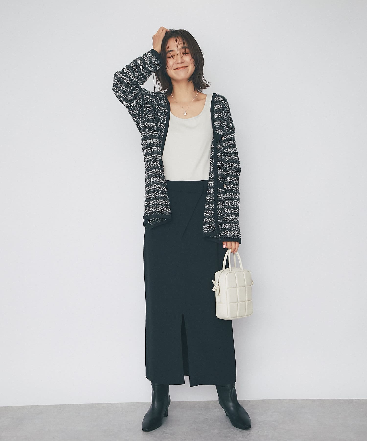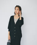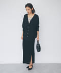 スクエア風の衿元でデコルテの丸い部分を少なくすることで、カーディガンやシャツを素敵に着れます。