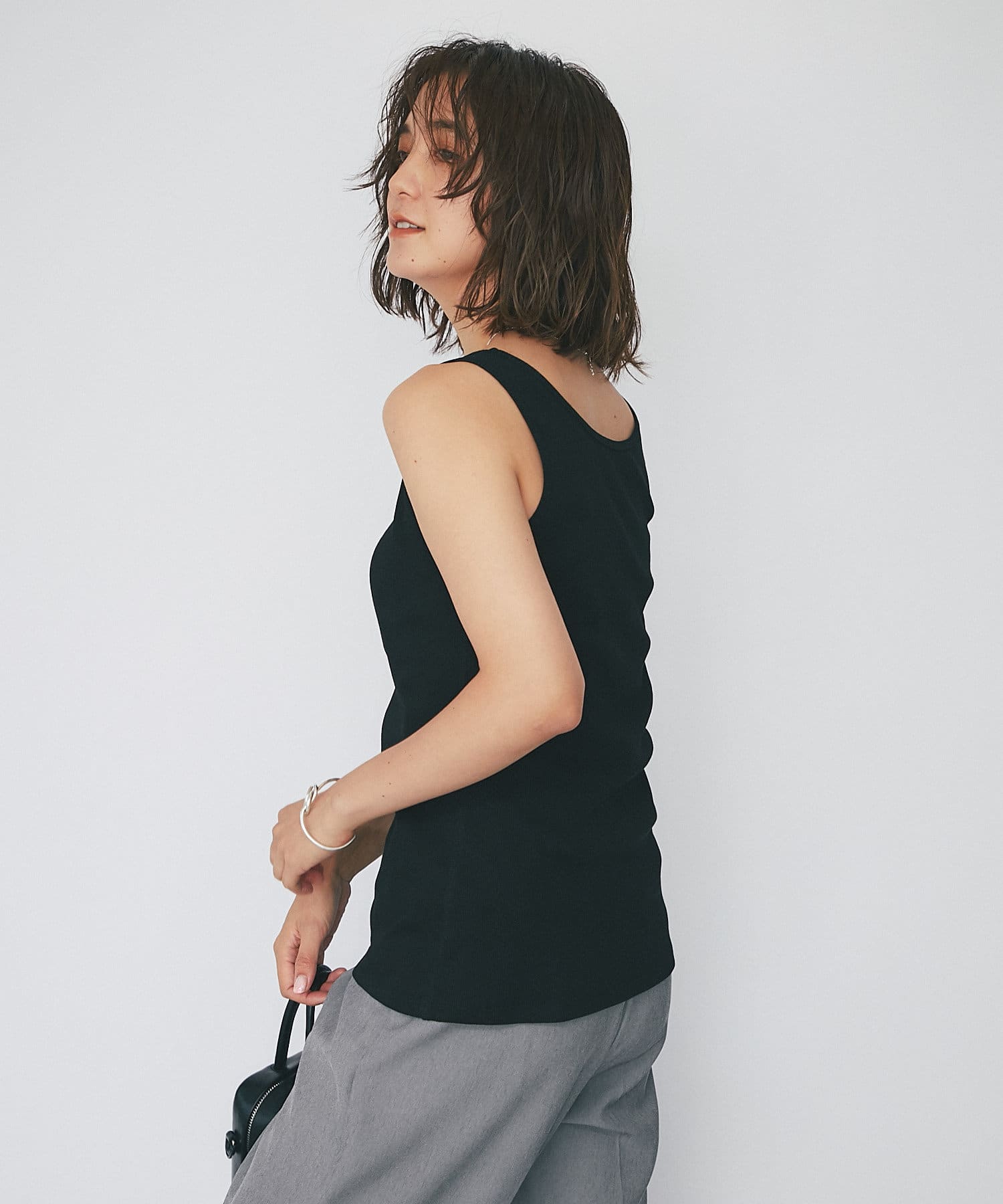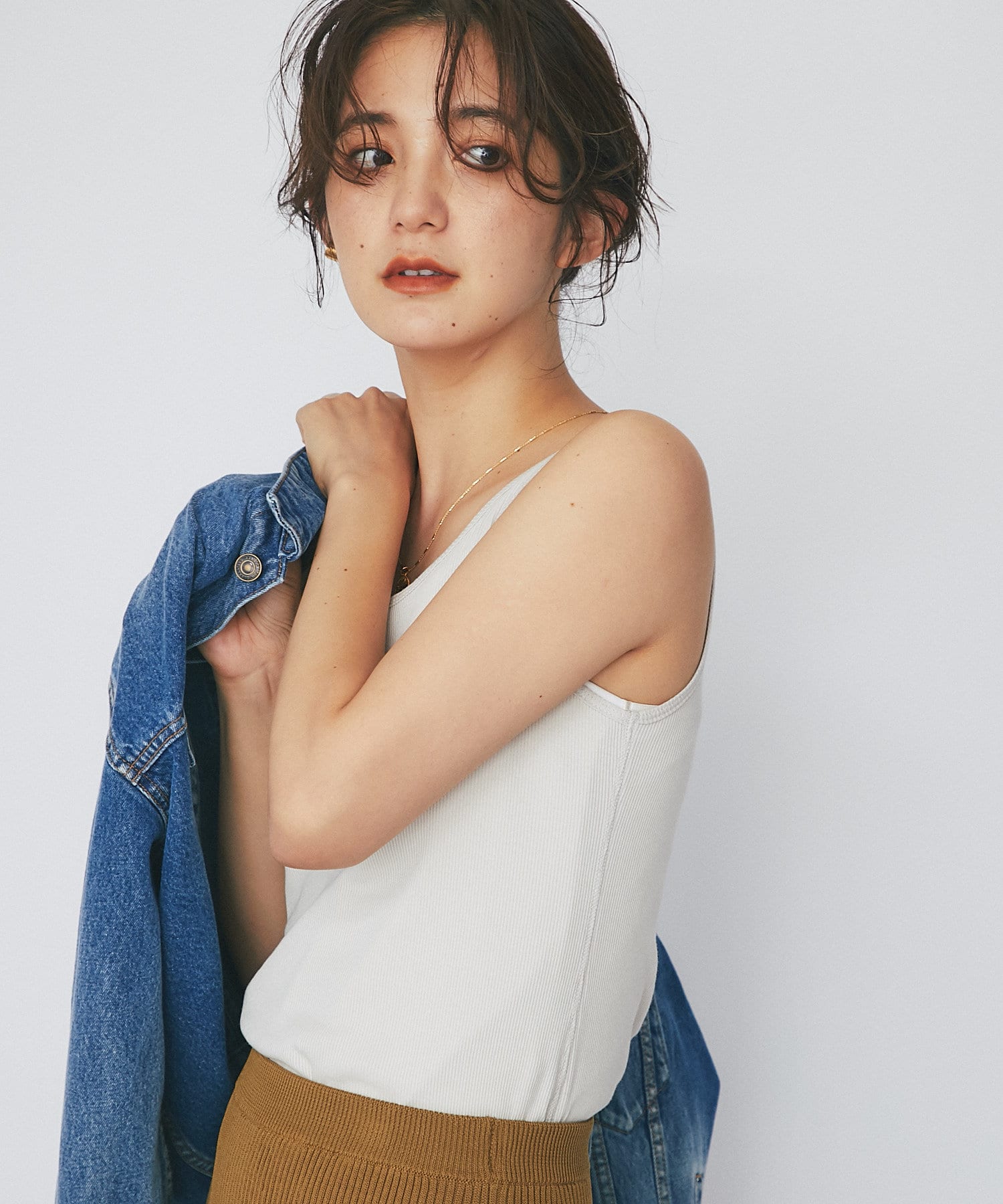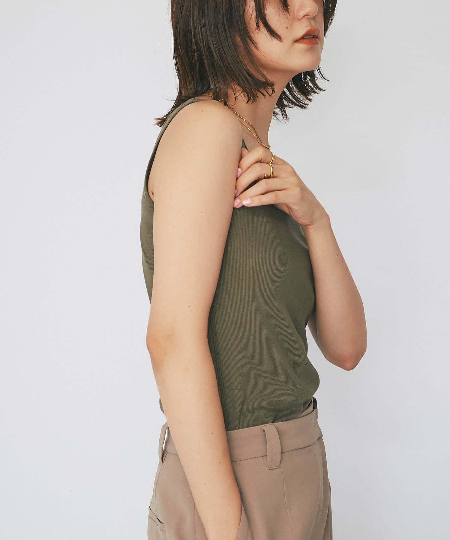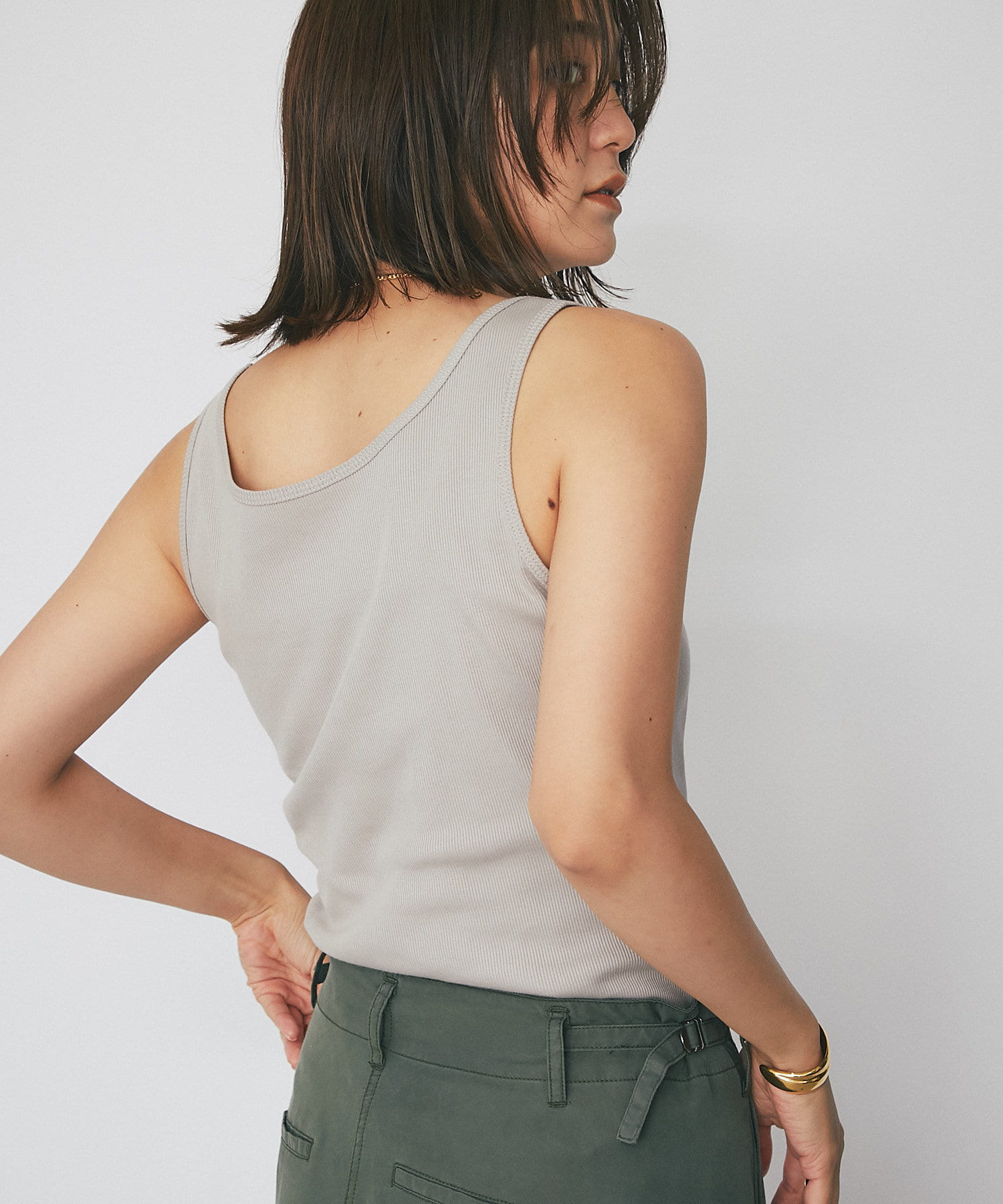 シャツやカーディガンと合わせて程よい肌見せと抜け感をプラスできるタンクトップ。ヘルシーな着こなしに相性抜群です。