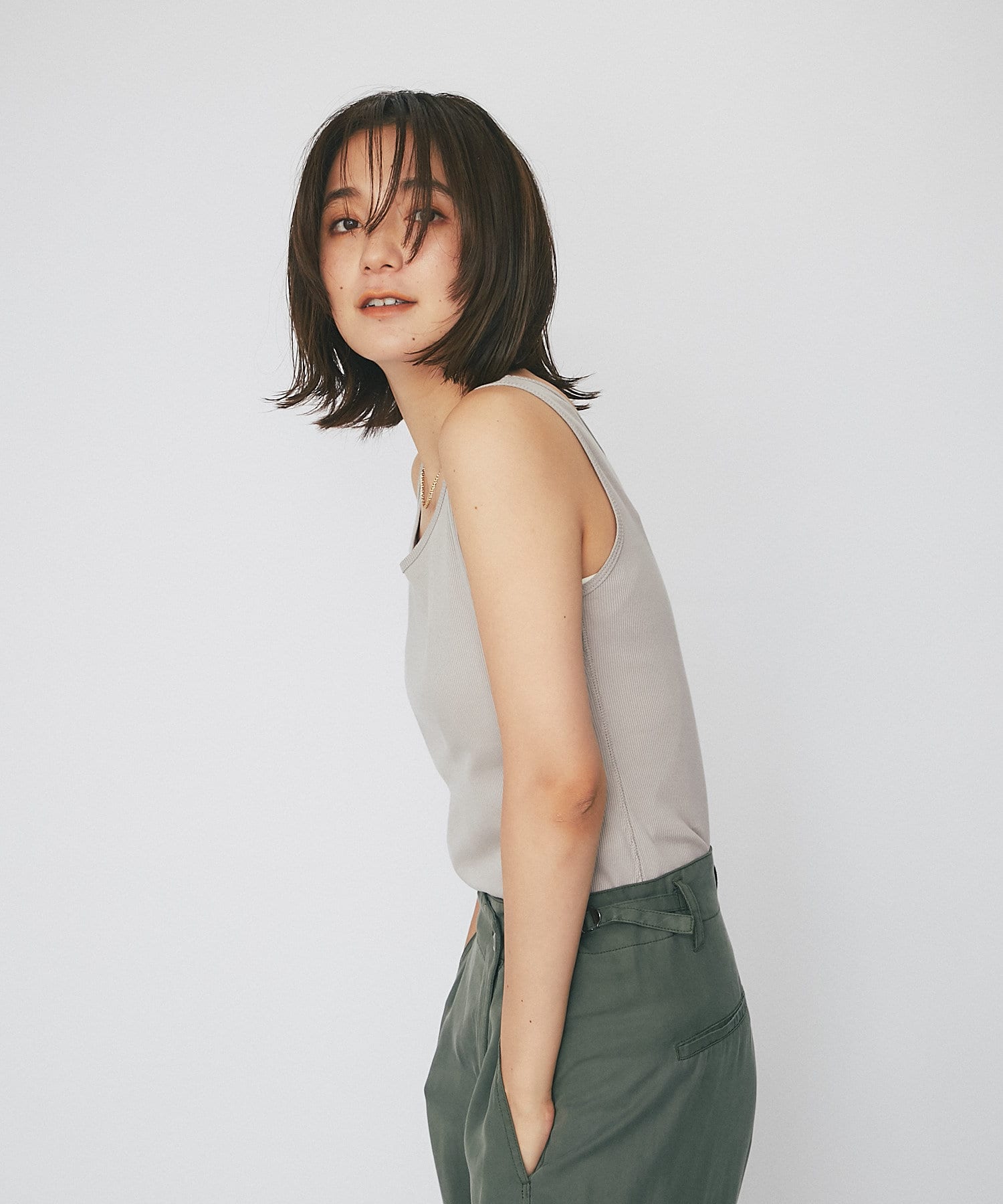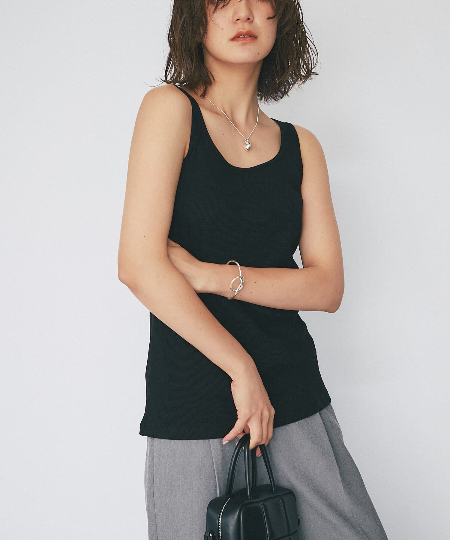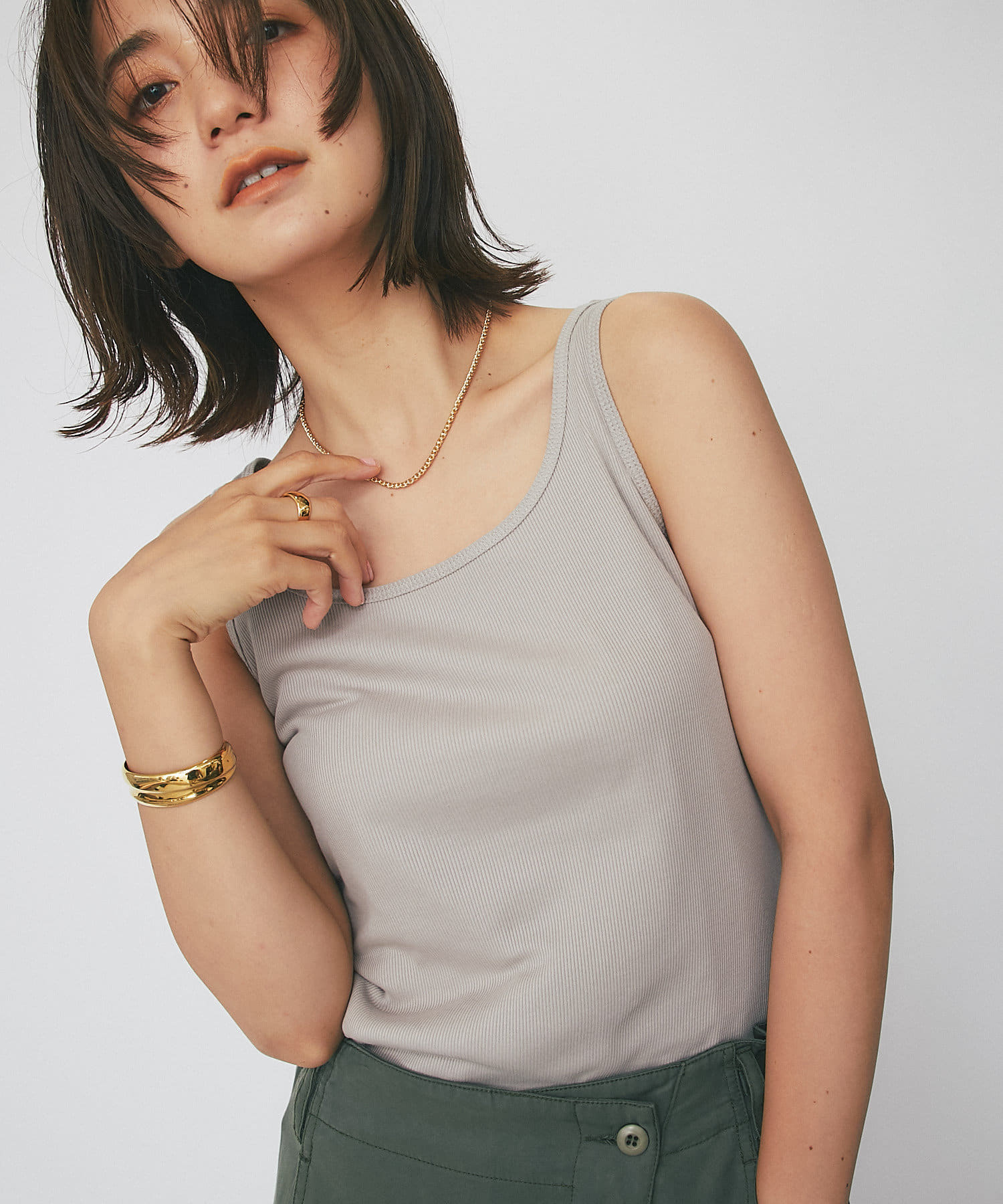 シャツやカーディガンと合わせて程よい肌見せと抜け感をプラスできるタンクトップ。ヘルシーな着こなしに相性抜群です。