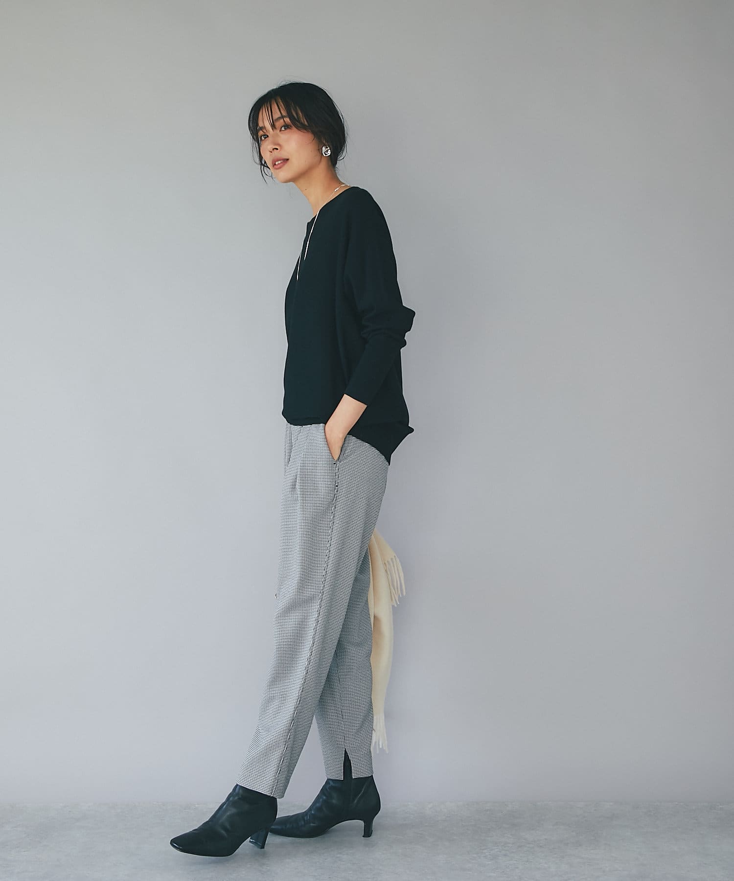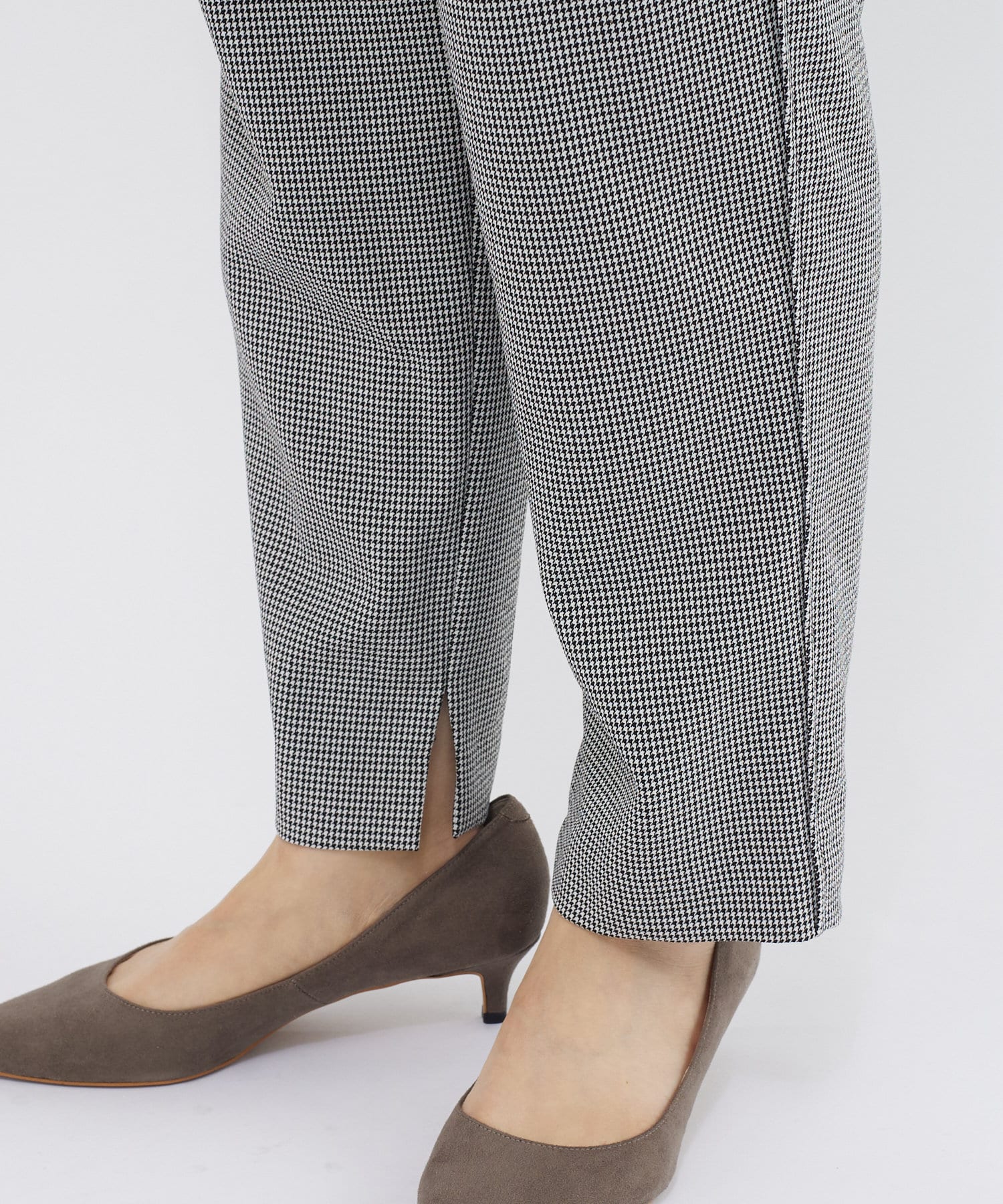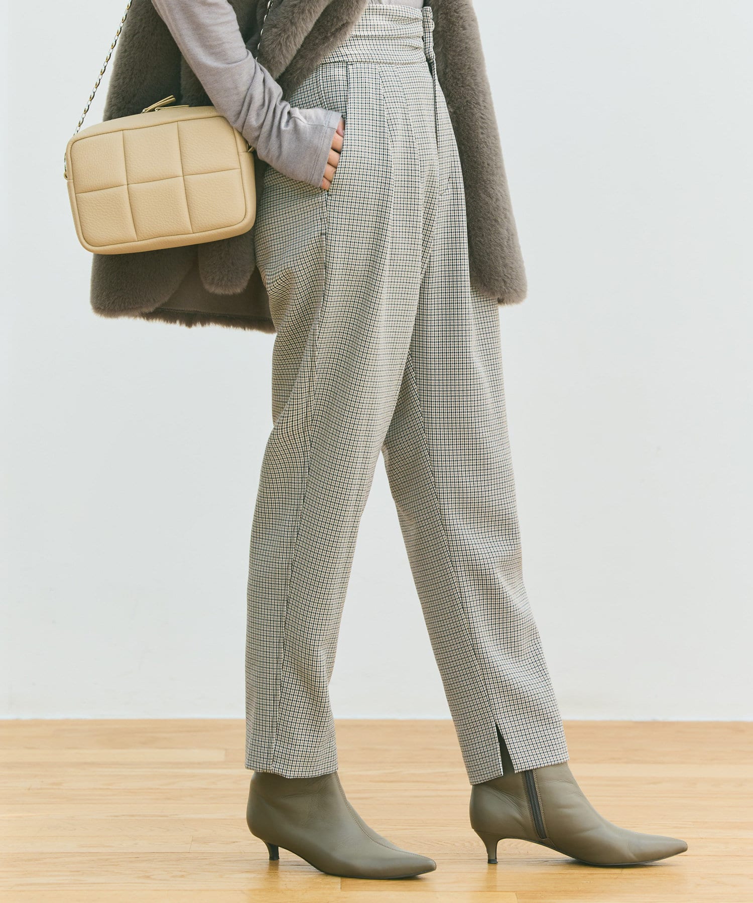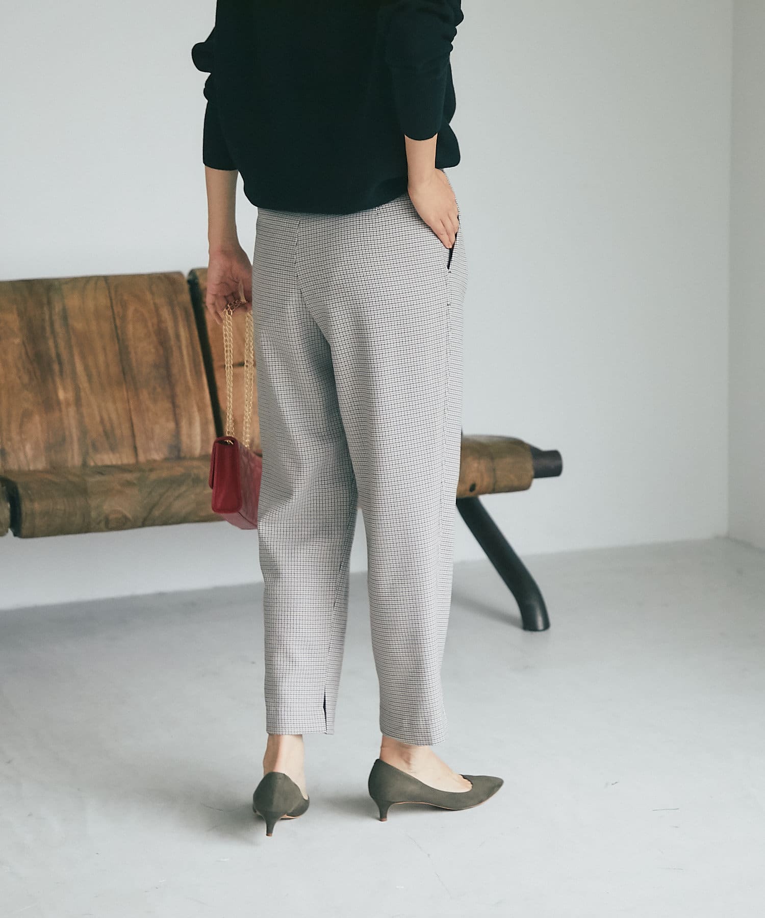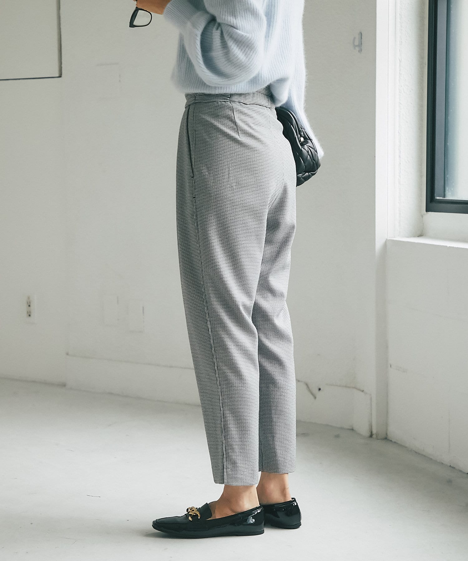 ⇒細やかなチドリチェックは柄が細かい分、全体的に見るとグレーやダークブラウンのパンツを着ているような感覚でコーディネートしていただけます。柄アイテムを着慣れていない方もトライしやすいおすすめアイテムです。