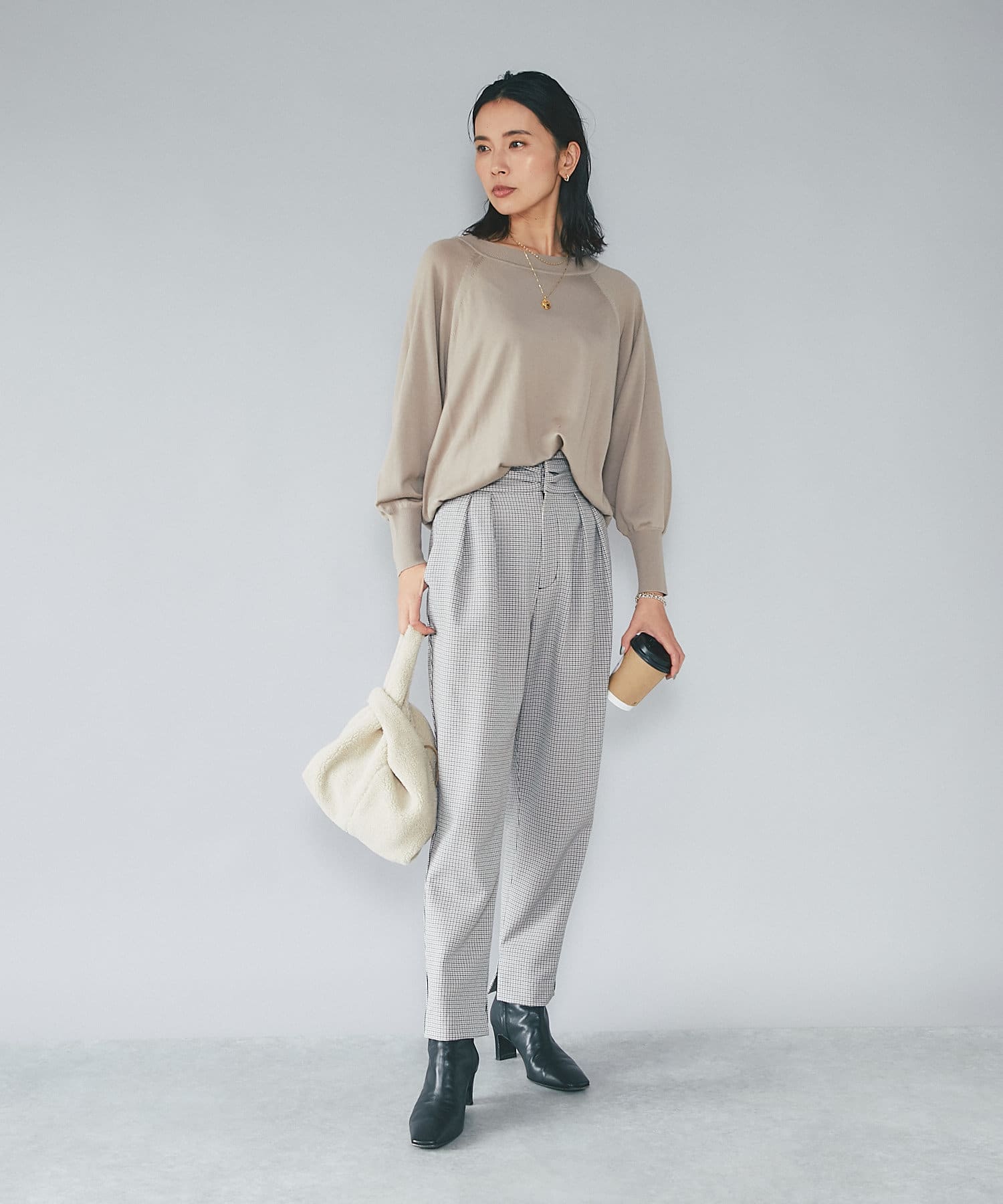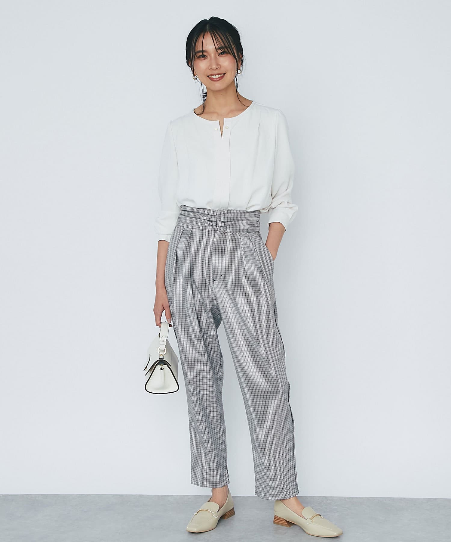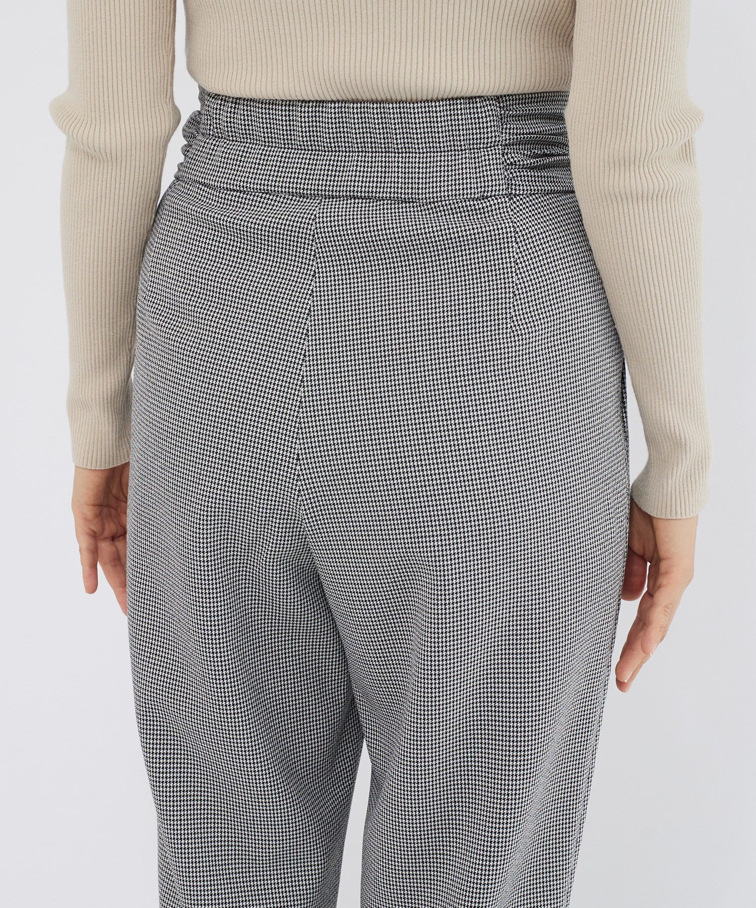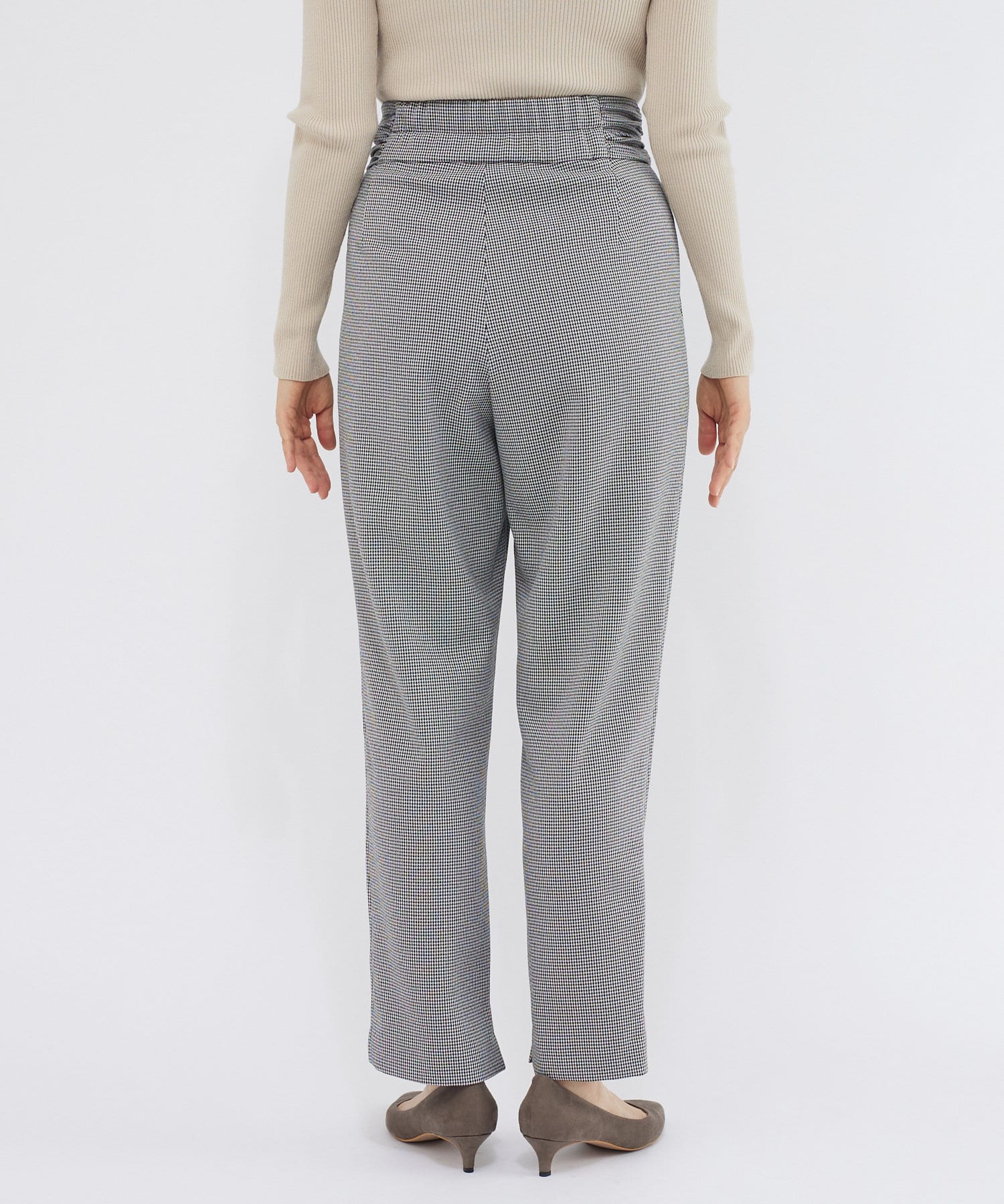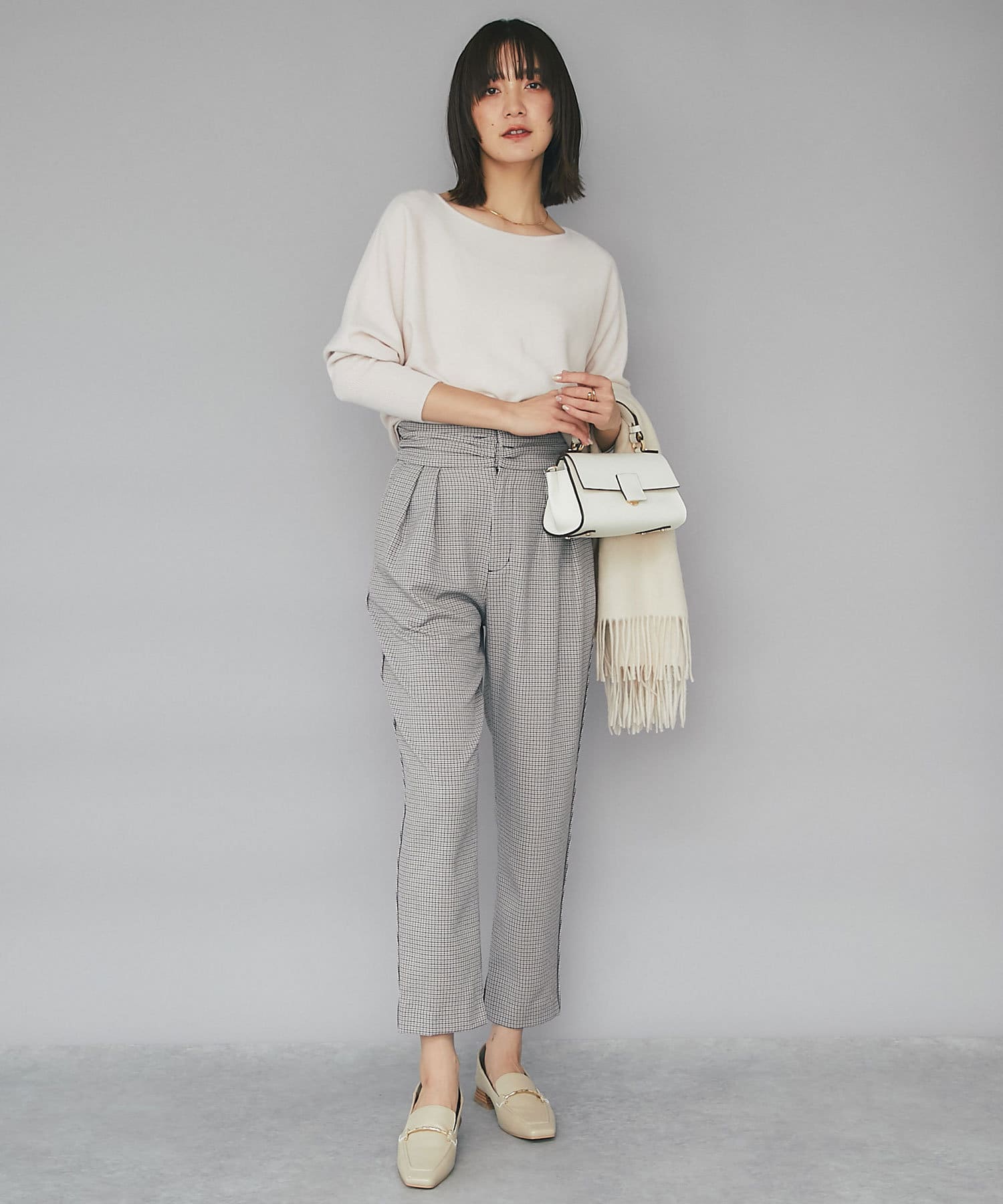 ⇒細やかなチドリチェックは柄が細かい分、全体的に見るとグレーやダークブラウンのパンツを着ているような感覚でコーディネートしていただけます。柄アイテムを着慣れていない方もトライしやすいおすすめアイテムです。